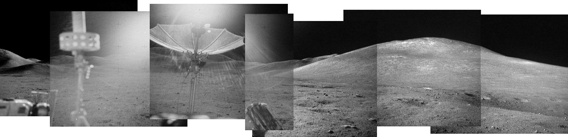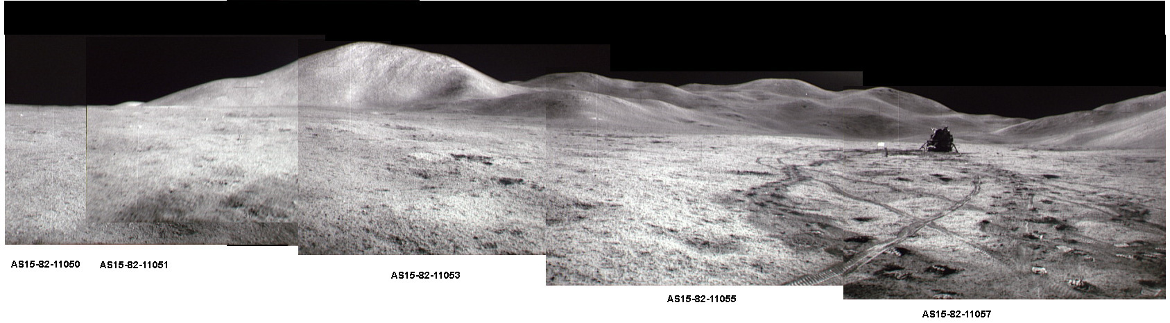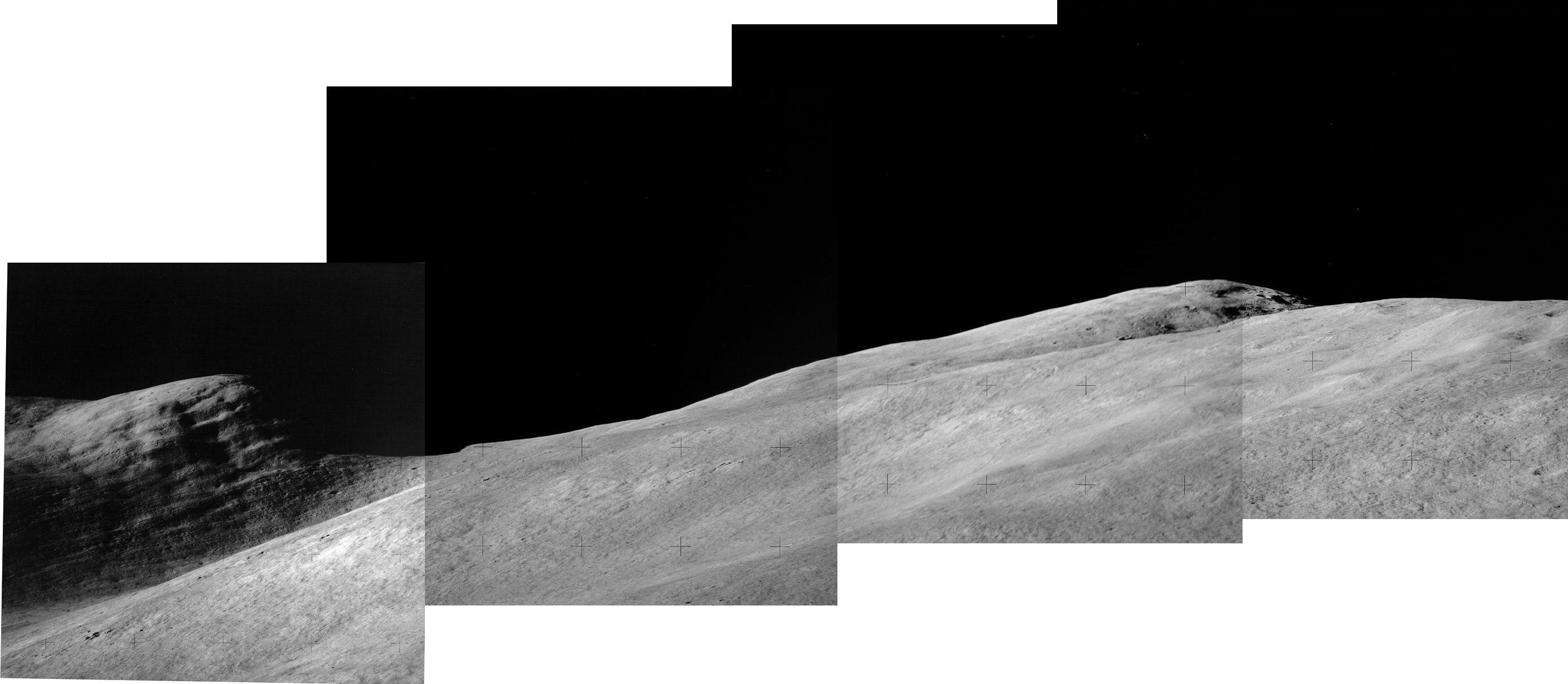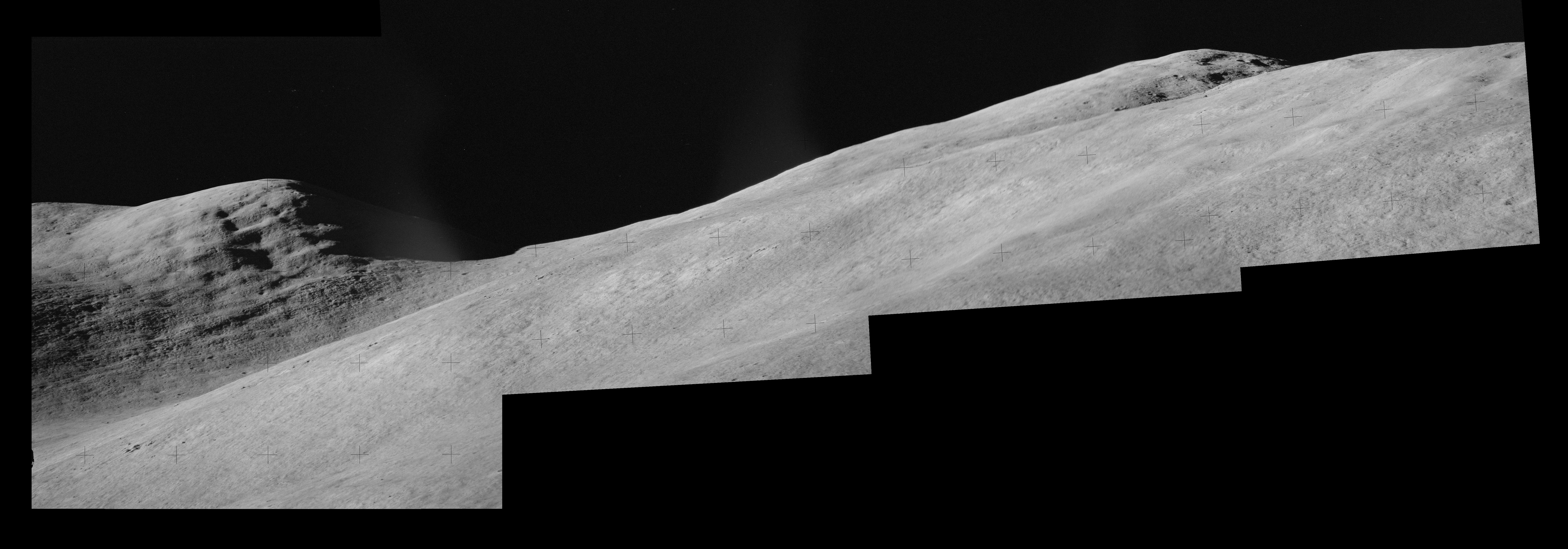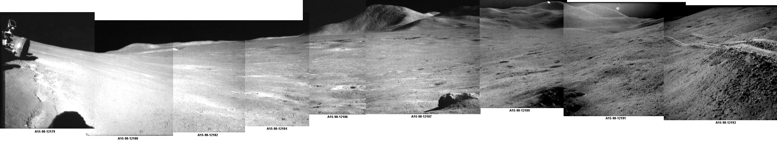 The frames are AS15-85- 11353 to 11382. Assembled by Dave Byrne.106:56:54 SEVA 500-mm Pan of Hill 305 ( 52k )Full resolution assemblies of the northern portion ( 1.5 Mb ), eastern portion ( 3.1 Mb ), and southern portion ( 2.5 Mb ) by Eric Jones.