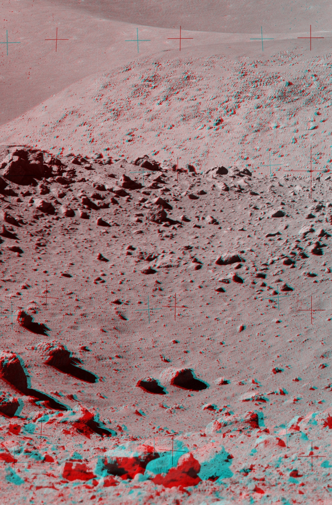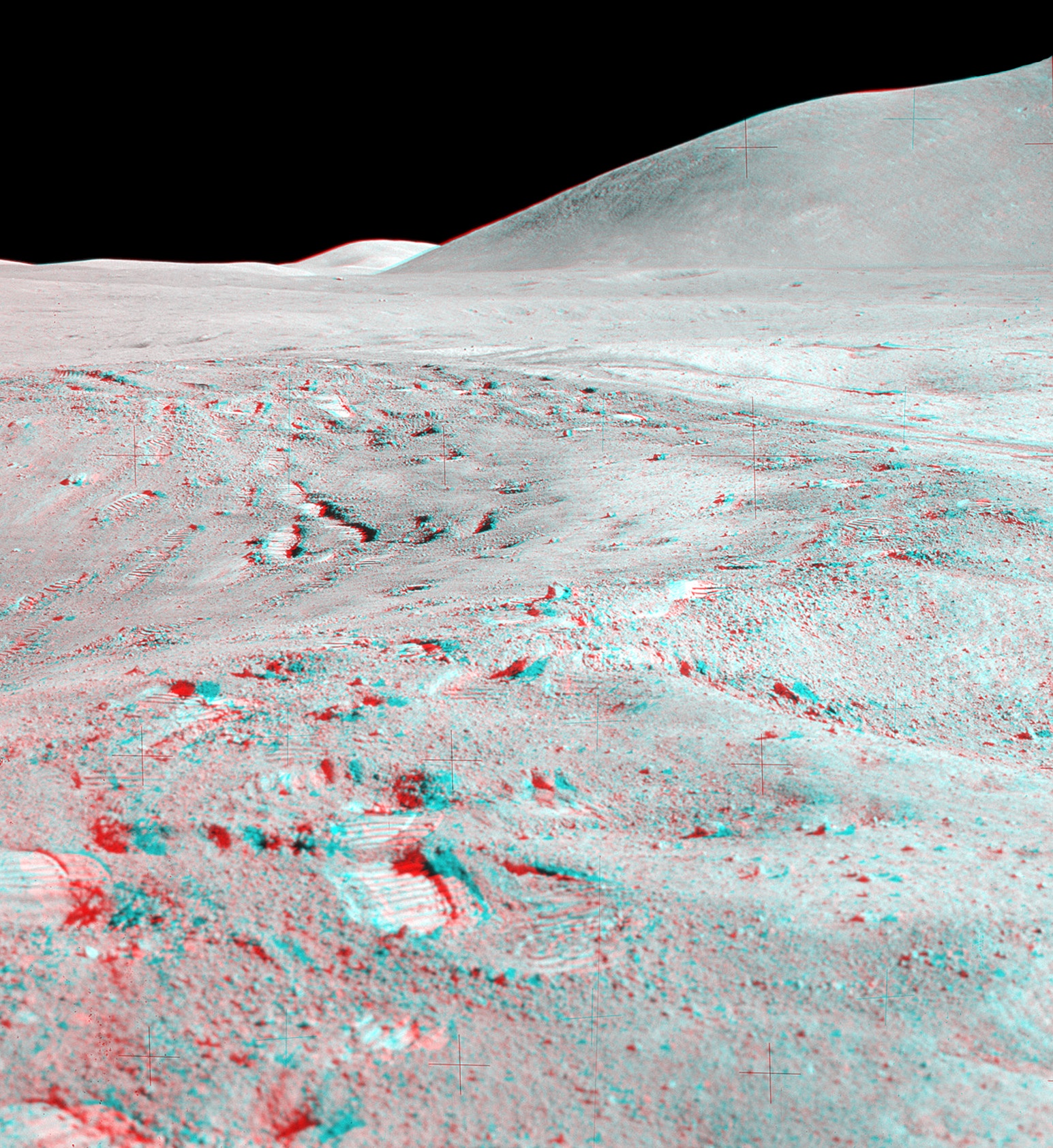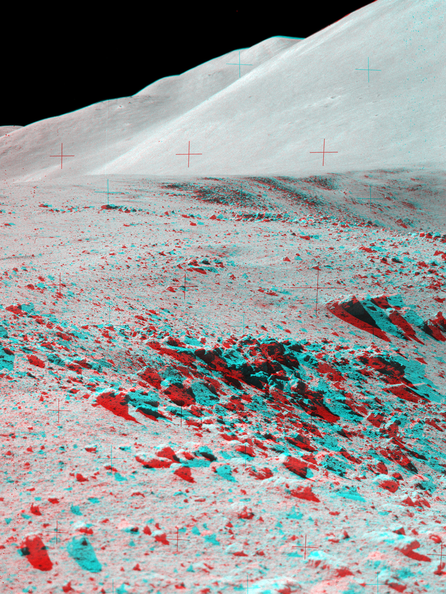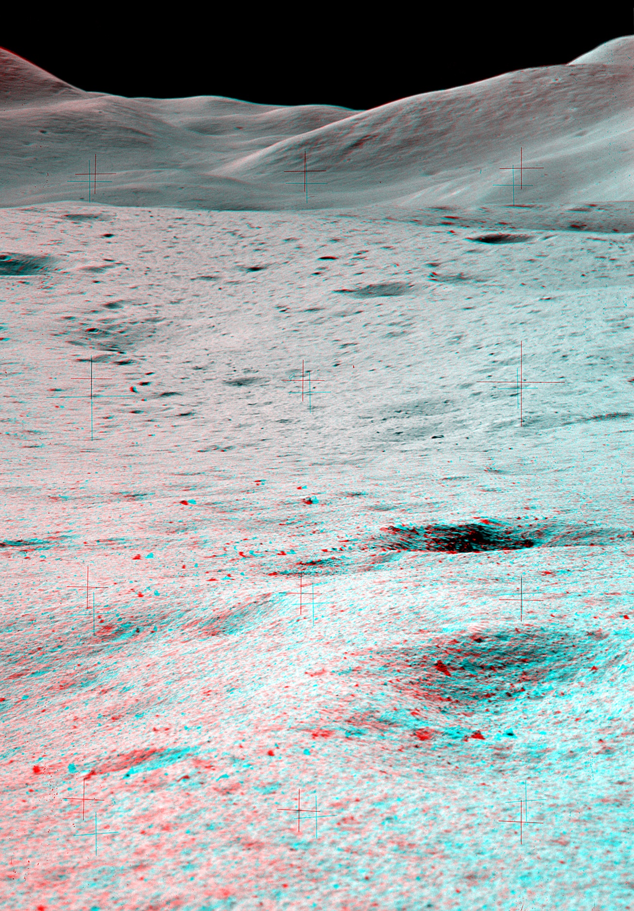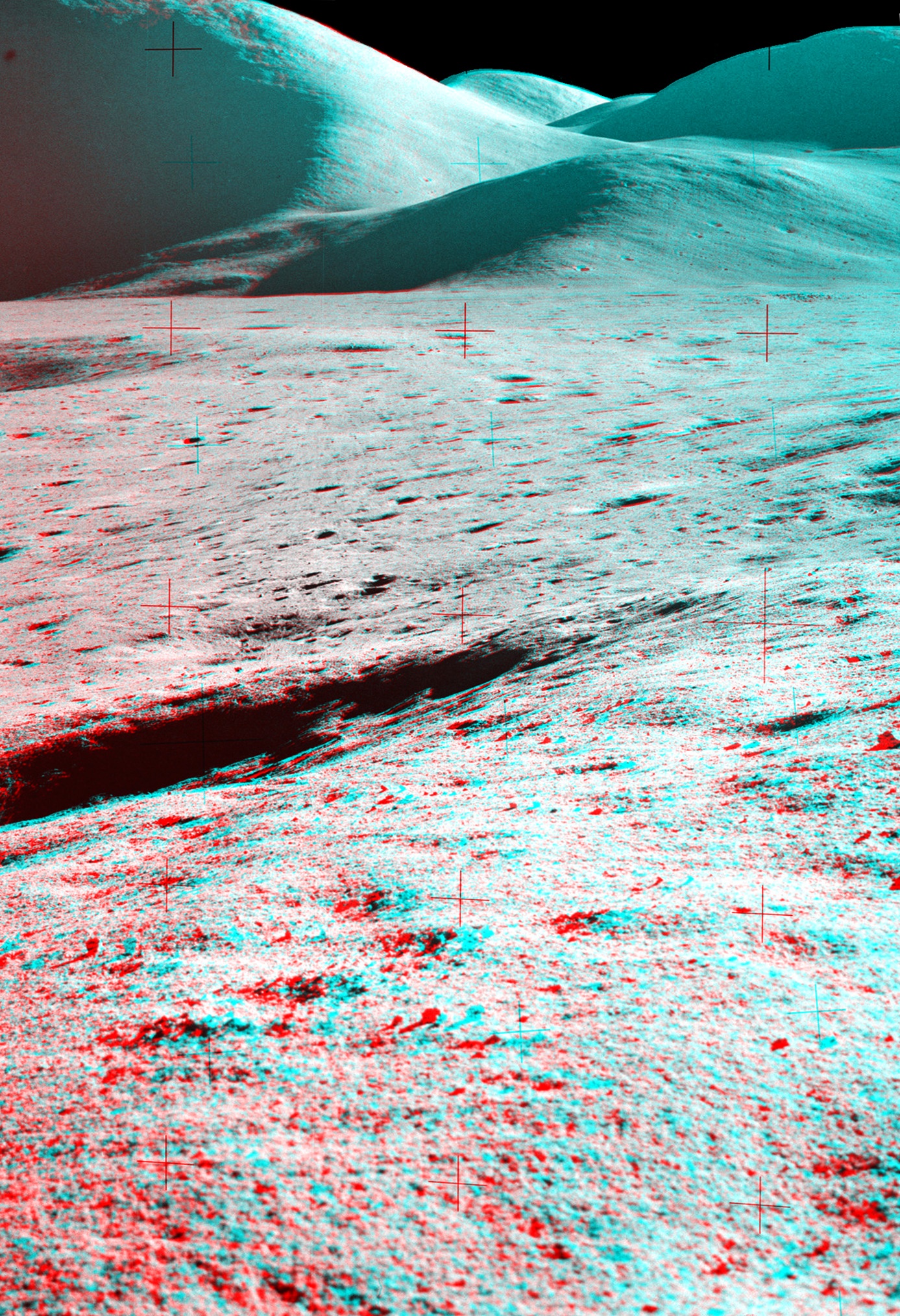 This frame shows a vertical view of the landing site. Higher resolution versions of M-0585 available from the ASU Apollo Image Archive. Frames 0584, 0586, and 0587 also include the landing site. Scan from the original film courtesy NASA/JSC/Arizona State University.Red-Blue Anaglyph, Apollo 15 Mapping (Metric) Camera Frames 0585-0586 ( 6.7 Mb or 0.5 Mb )