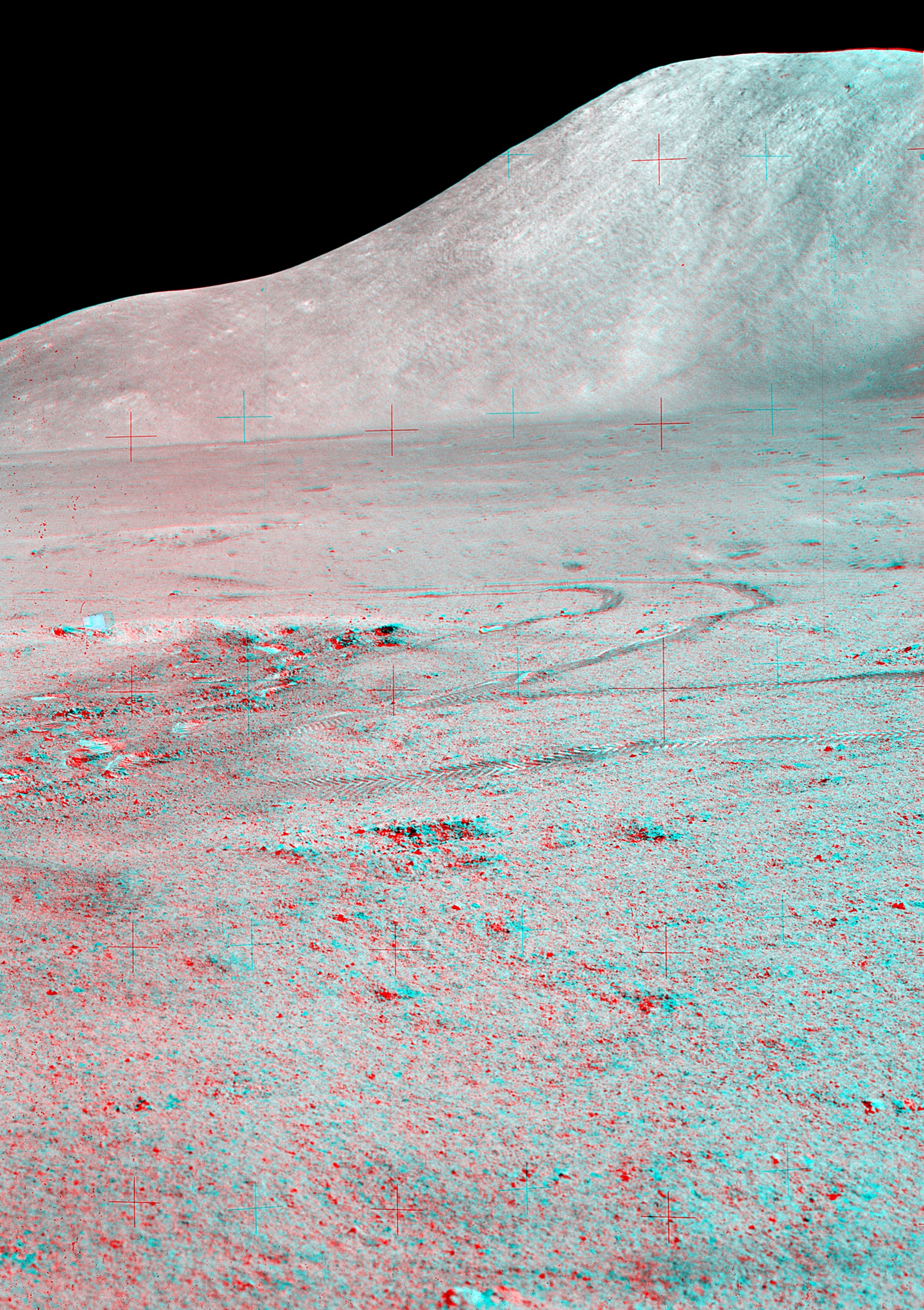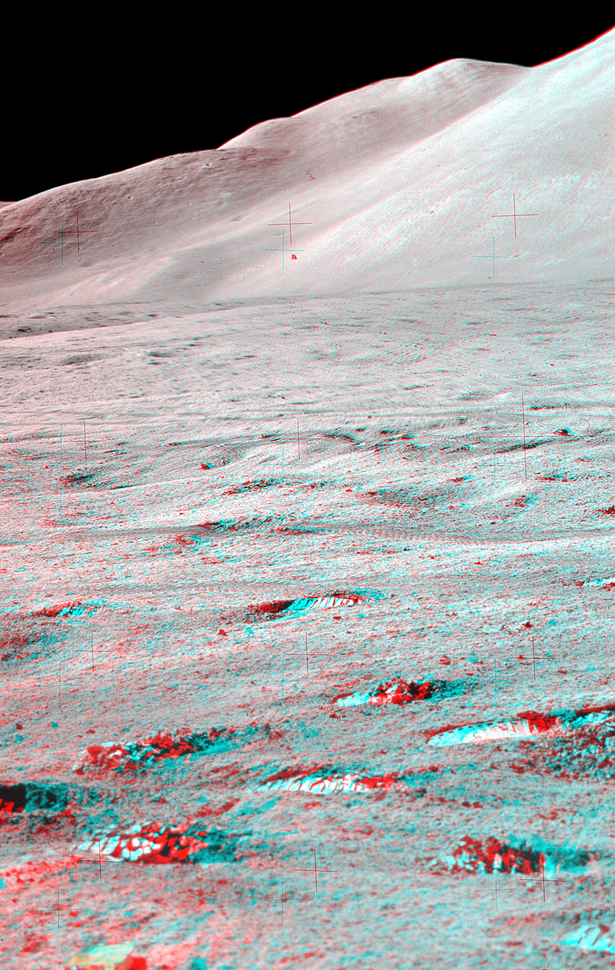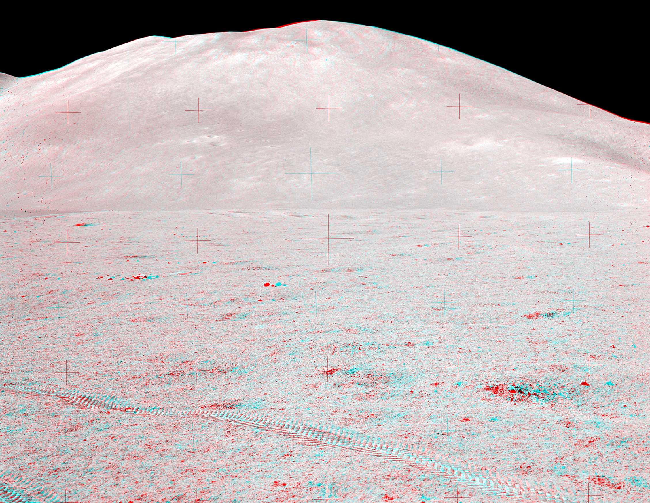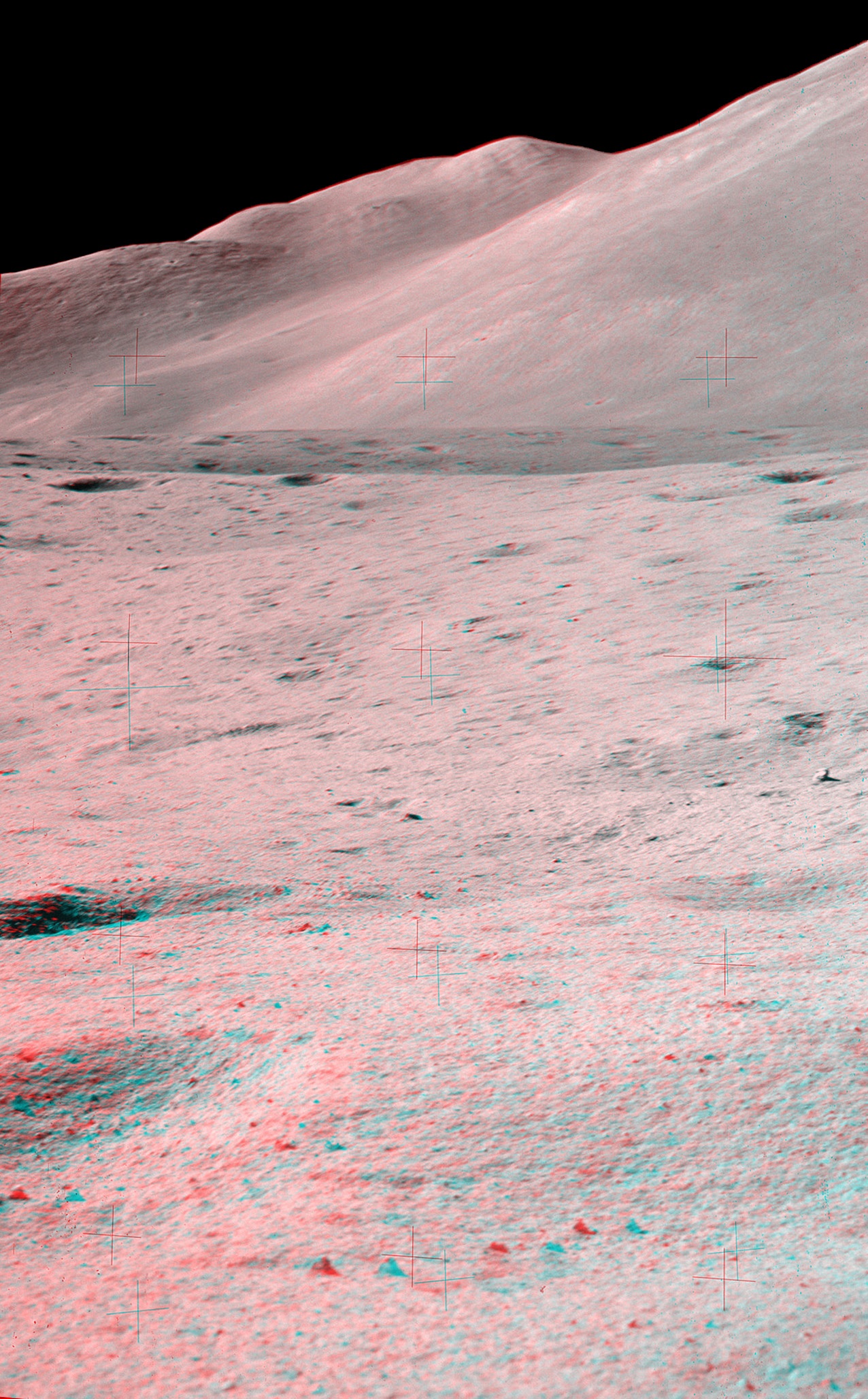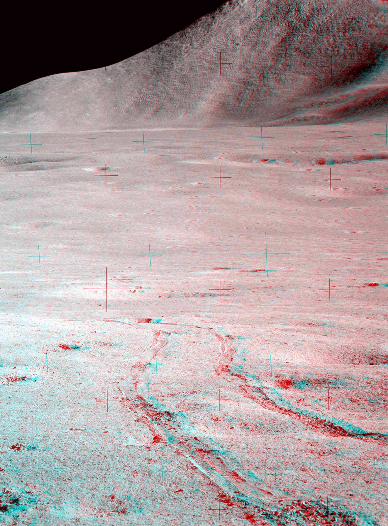 This frame shows a vertical view of the landing site. Higher resolution versions of M-0585 available from the ASU Apollo Image Archive. Frames 0584, 0586, and 0587 also include the landing site. Scan from the original film courtesy NASA/JSC/Arizona State University.Red-Blue Anaglyph, Apollo 15 Mapping (Metric) Camera Frames 0585-0586 ( 6.7 Mb or 0.5 Mb )