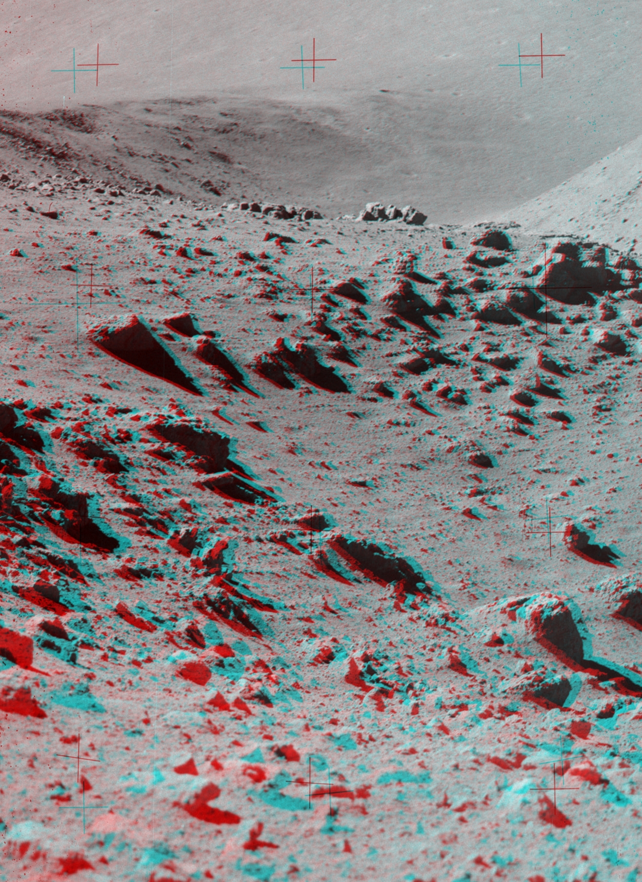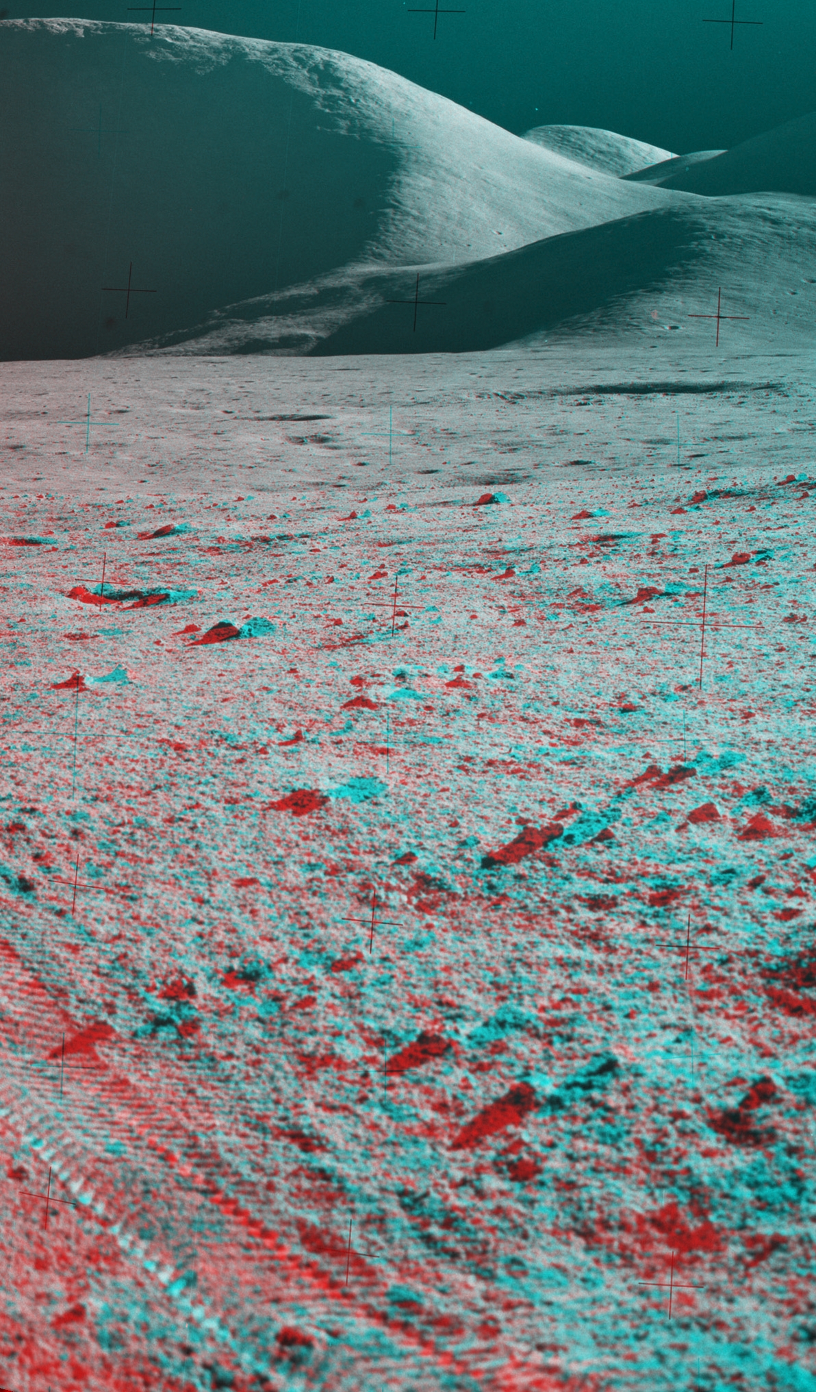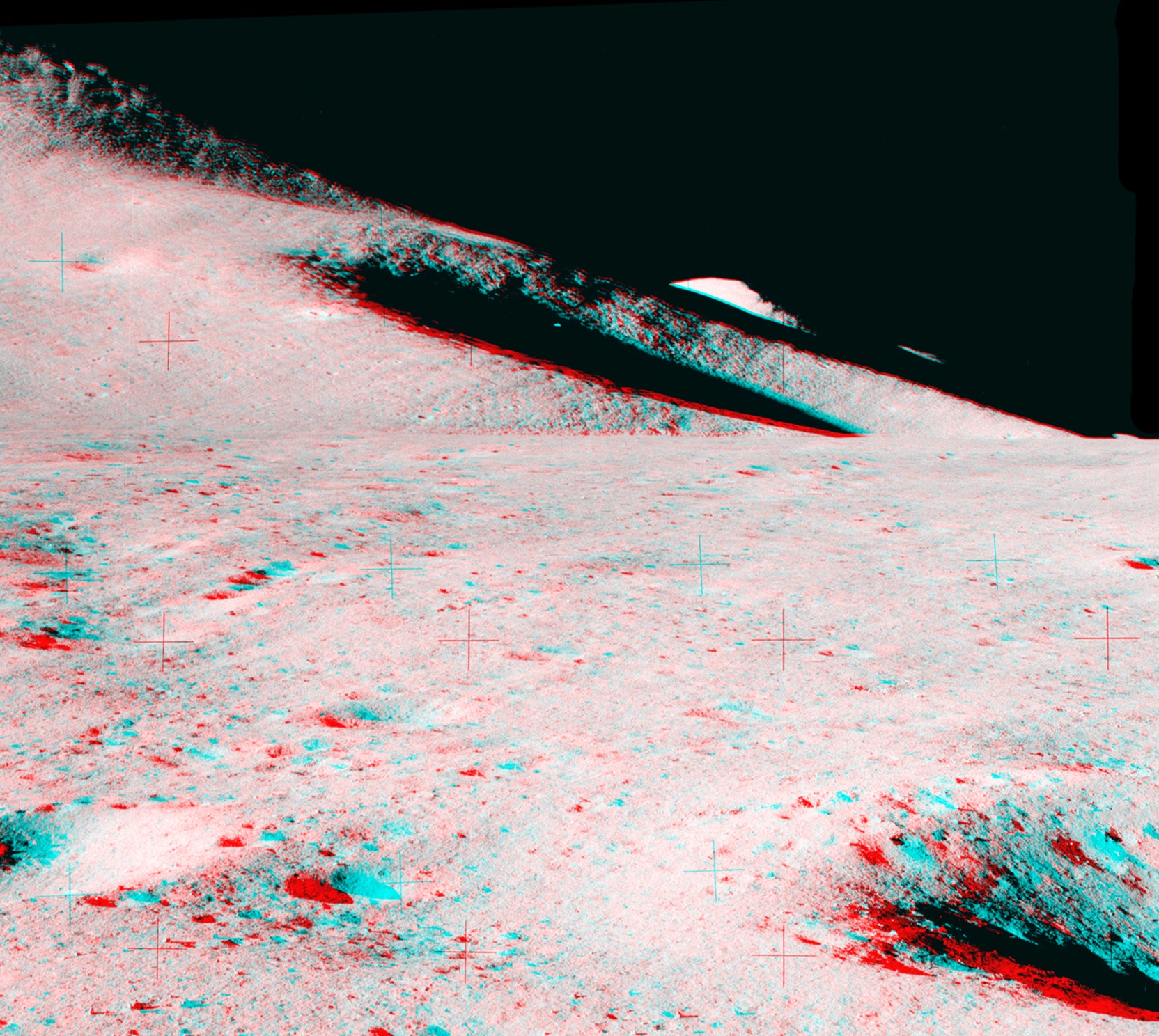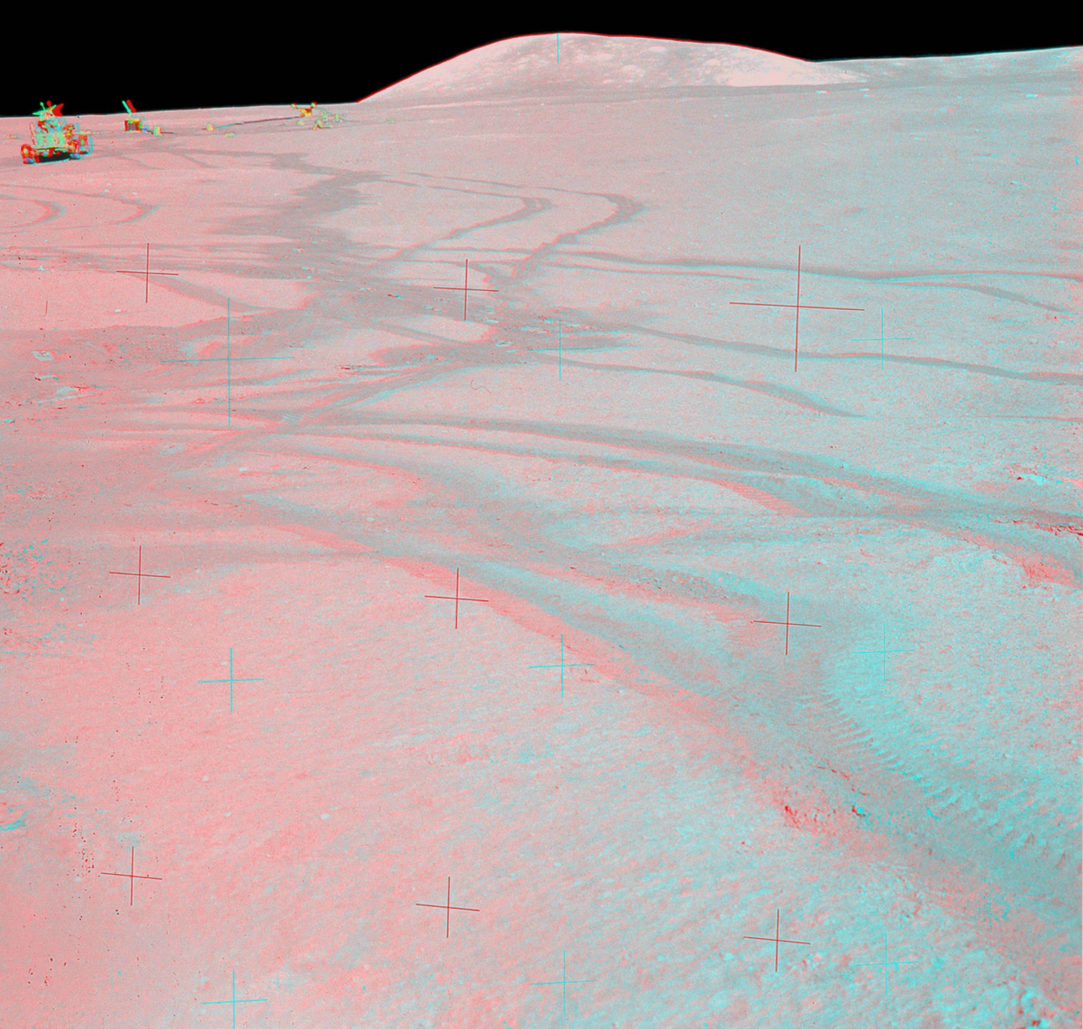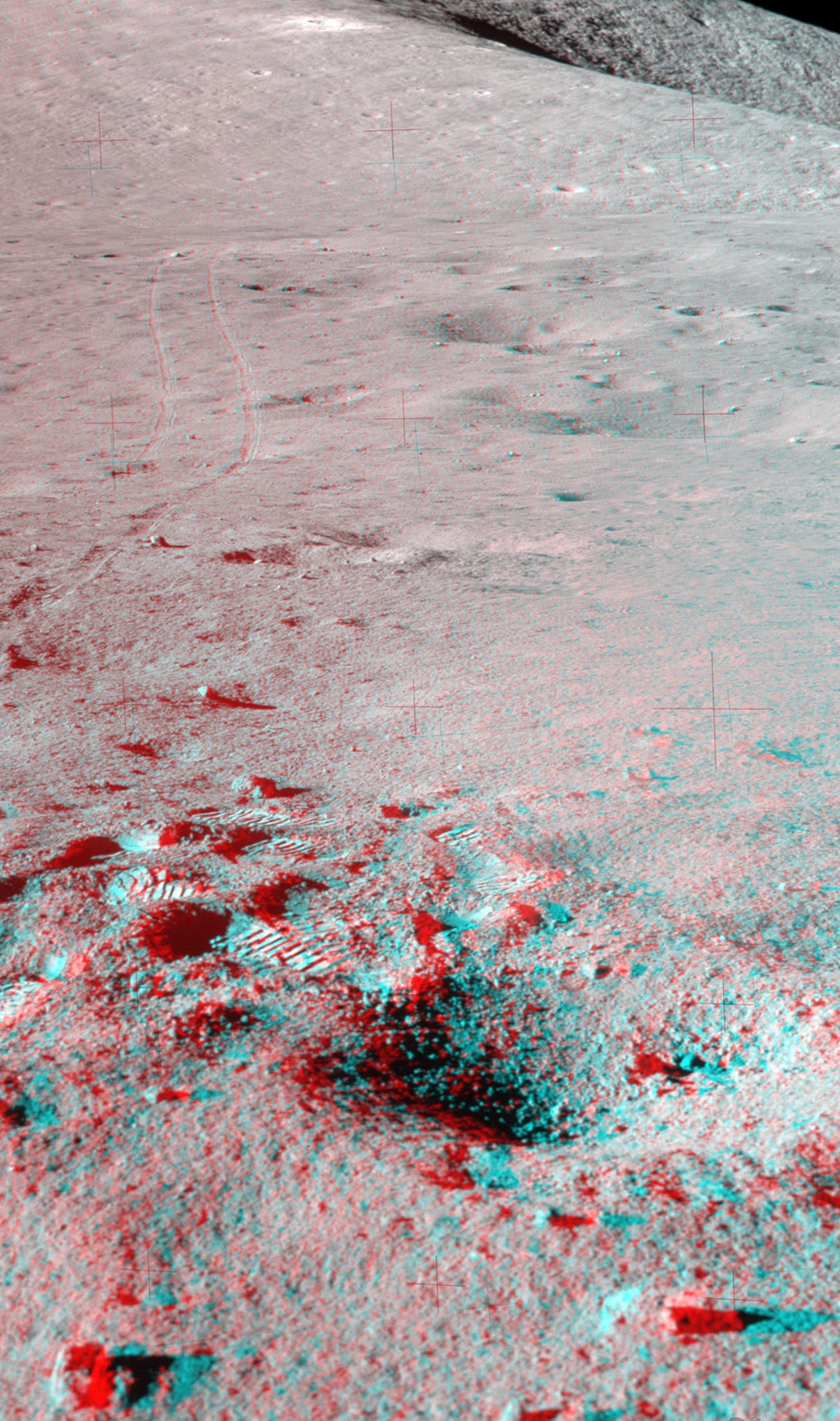 This frame shows a vertical view of the landing site. Higher resolution versions of M-0585 available from the ASU Apollo Image Archive. Frames 0584, 0586, and 0587 also include the landing site. Scan from the original film courtesy NASA/JSC/Arizona State University.Red-Blue Anaglyph, Apollo 15 Mapping (Metric) Camera Frames 0585-0586 ( 6.7 Mb or 0.5 Mb )