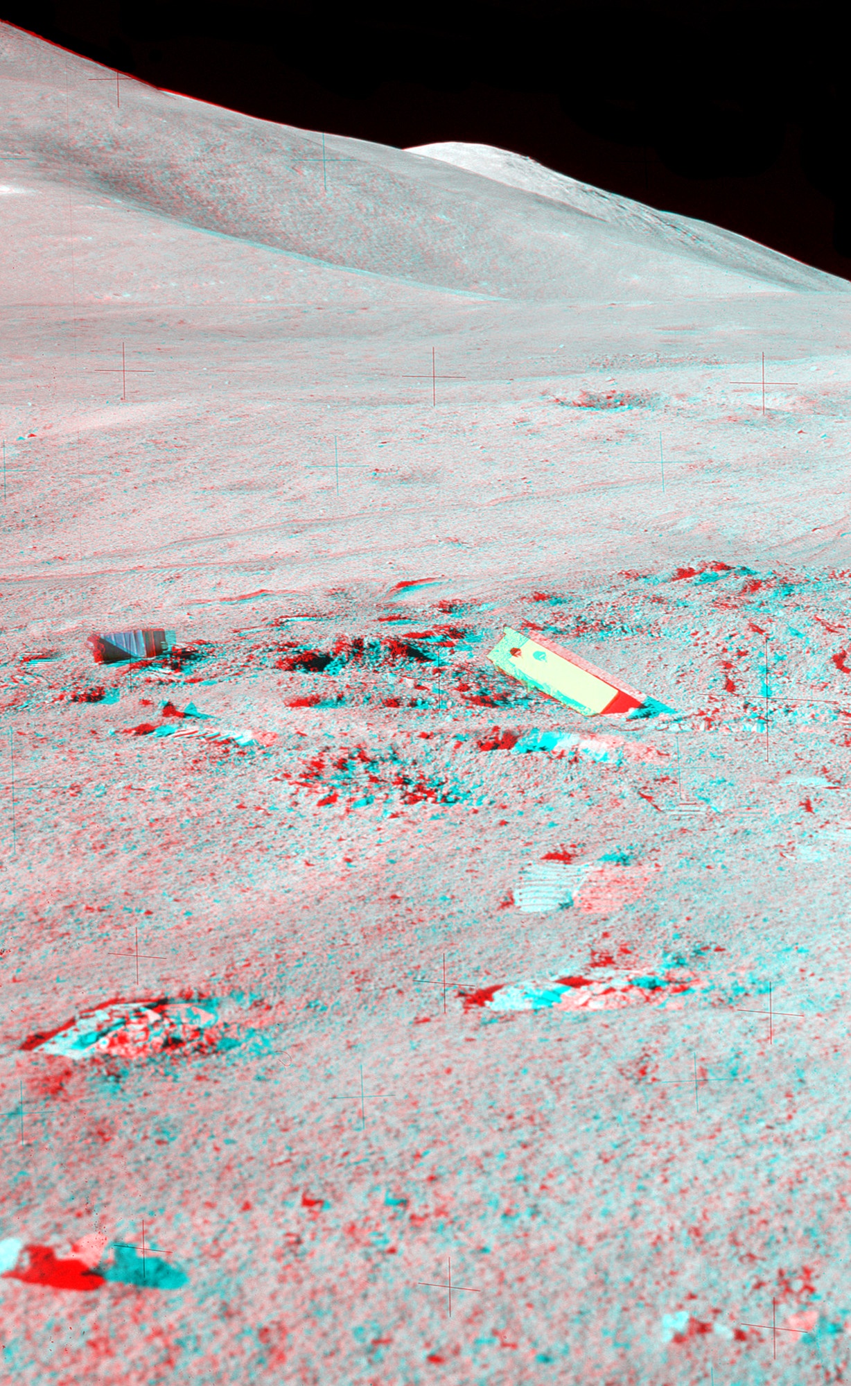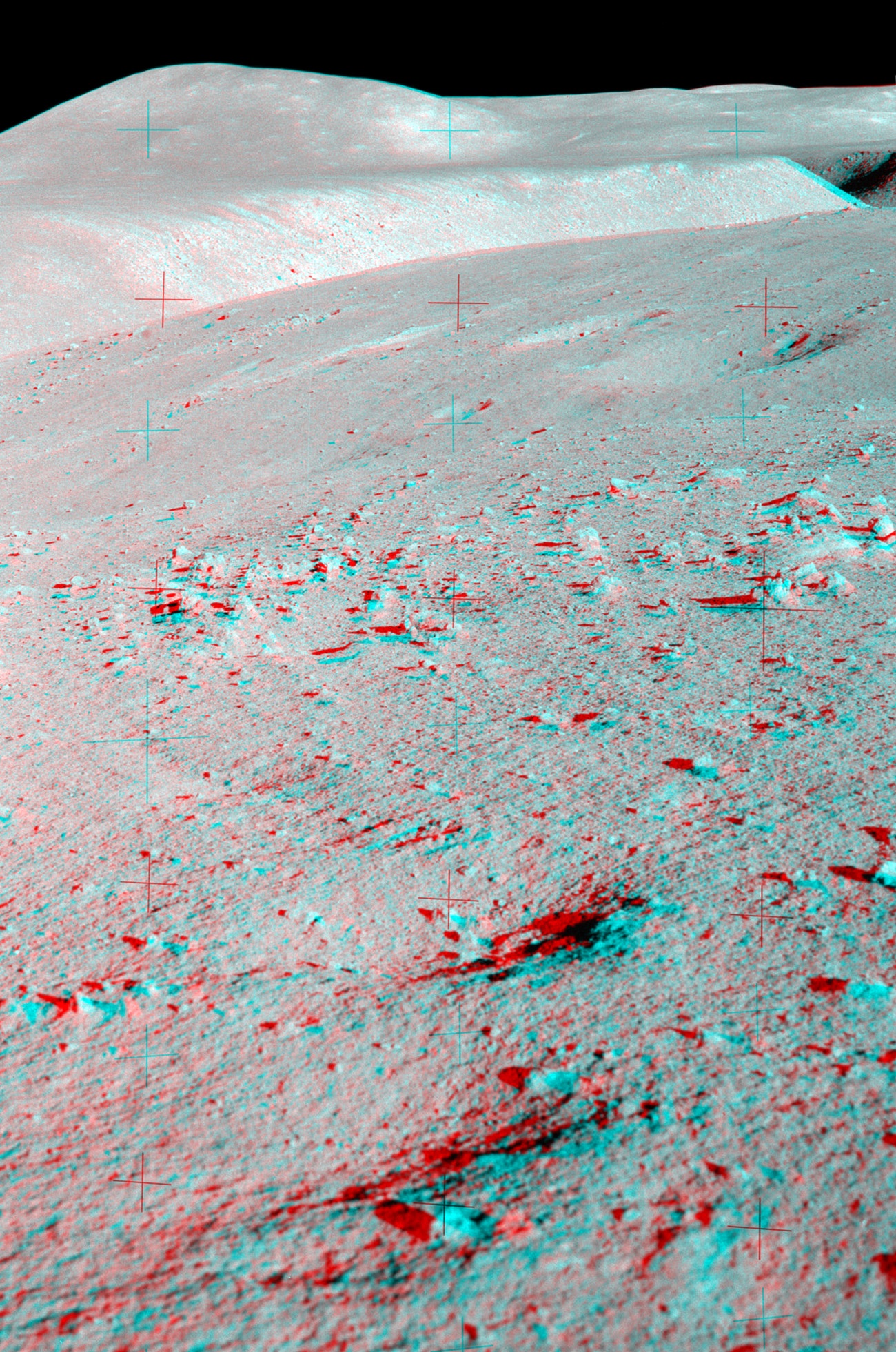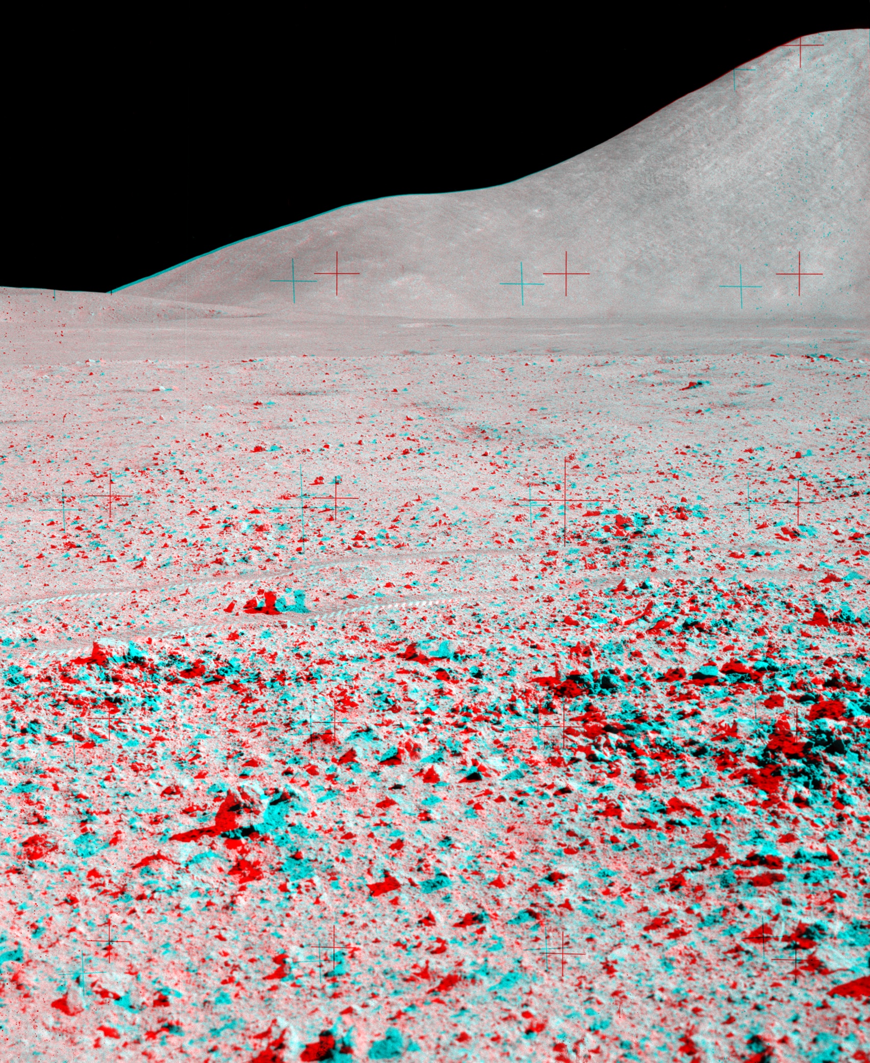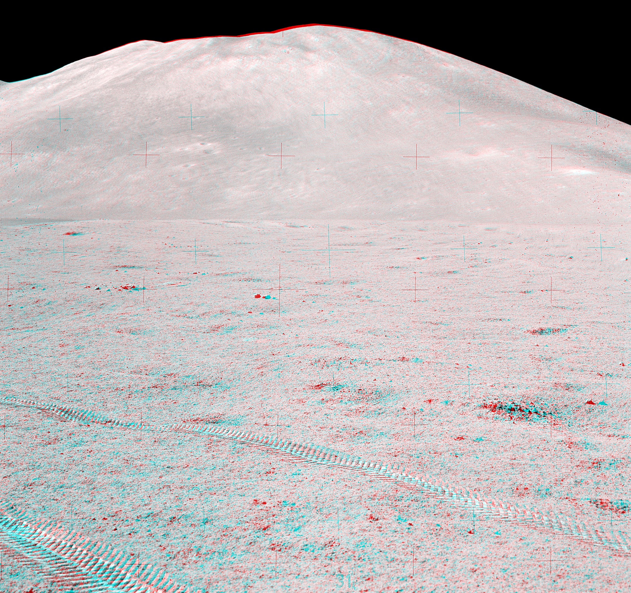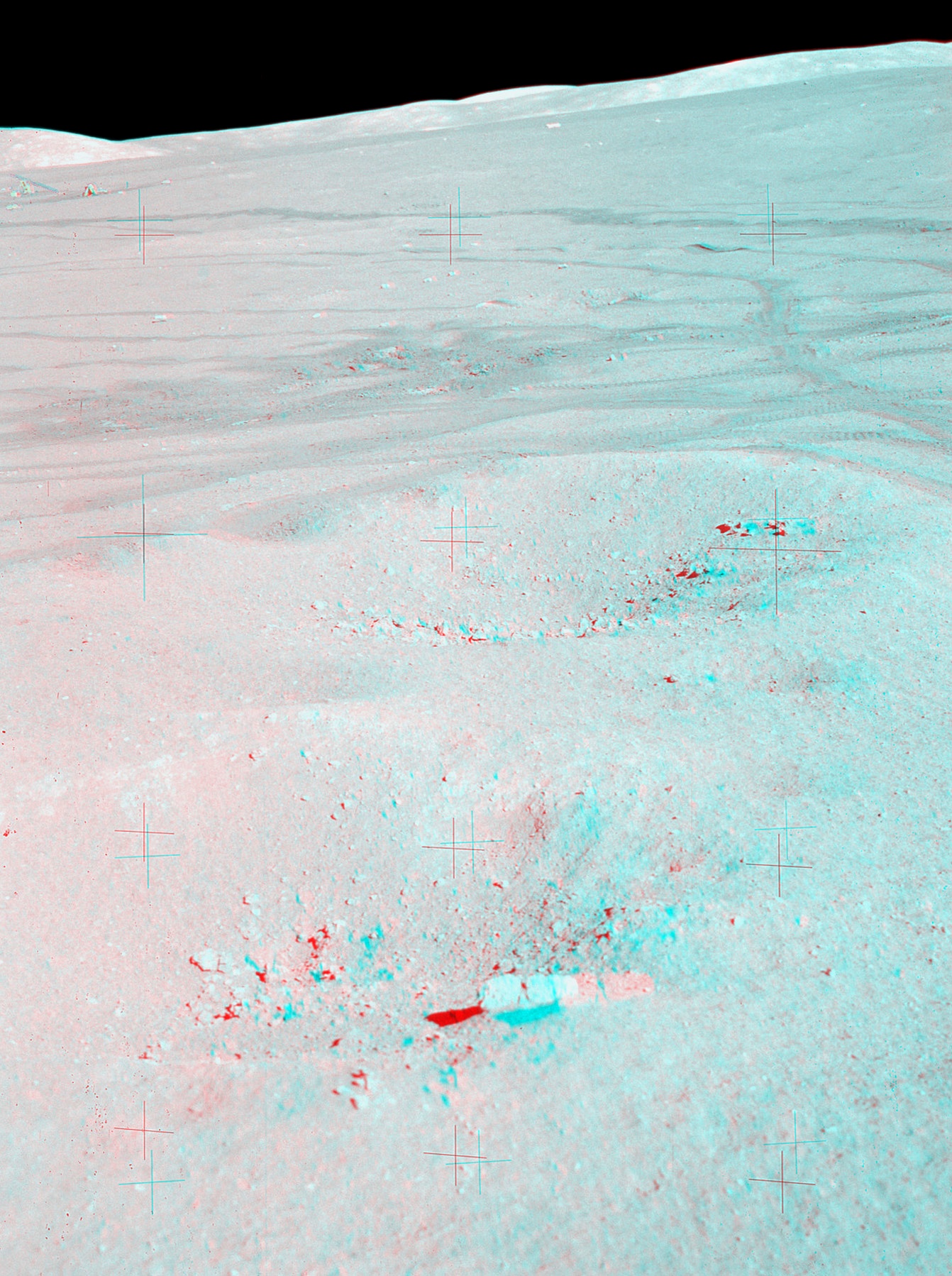 This frame shows a vertical view of the landing site. Higher resolution versions of M-0585 available from the ASU Apollo Image Archive. Frames 0584, 0586, and 0587 also include the landing site. Scan from the original film courtesy NASA/JSC/Arizona State University.Red-Blue Anaglyph, Apollo 15 Mapping (Metric) Camera Frames 0585-0586 ( 6.7 Mb or 0.5 Mb )