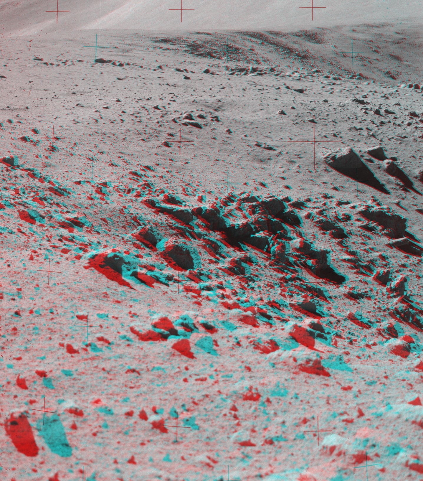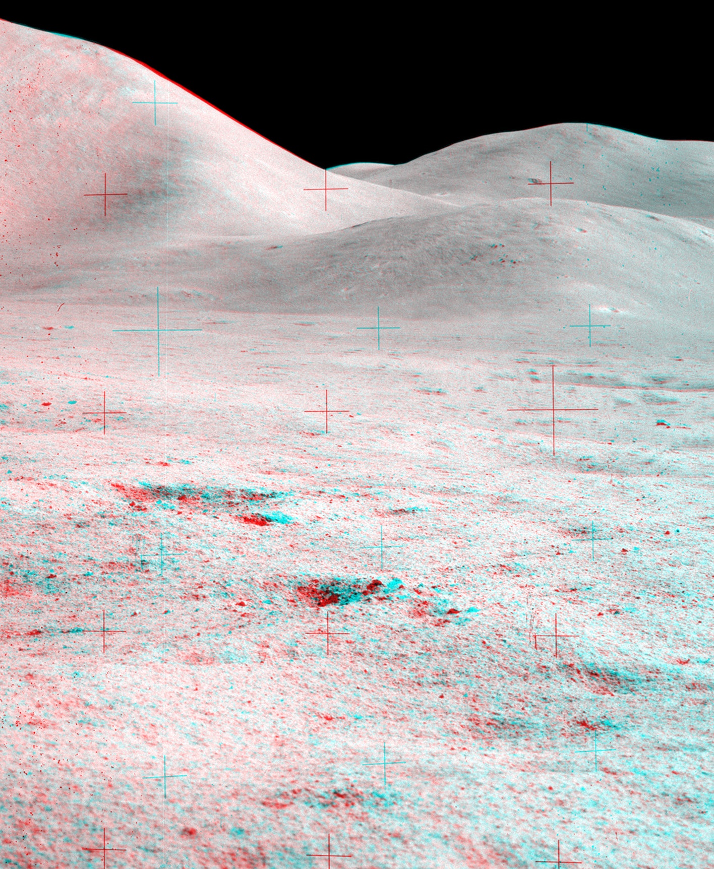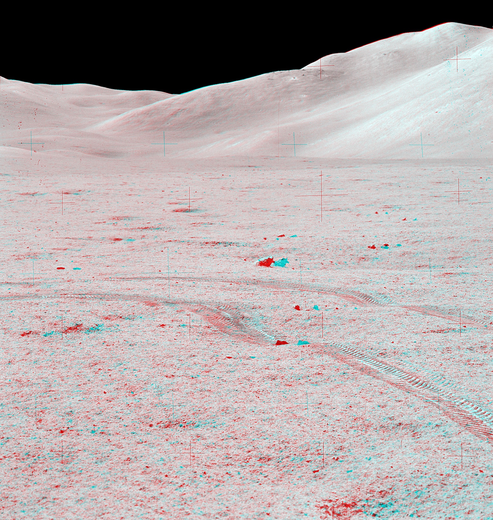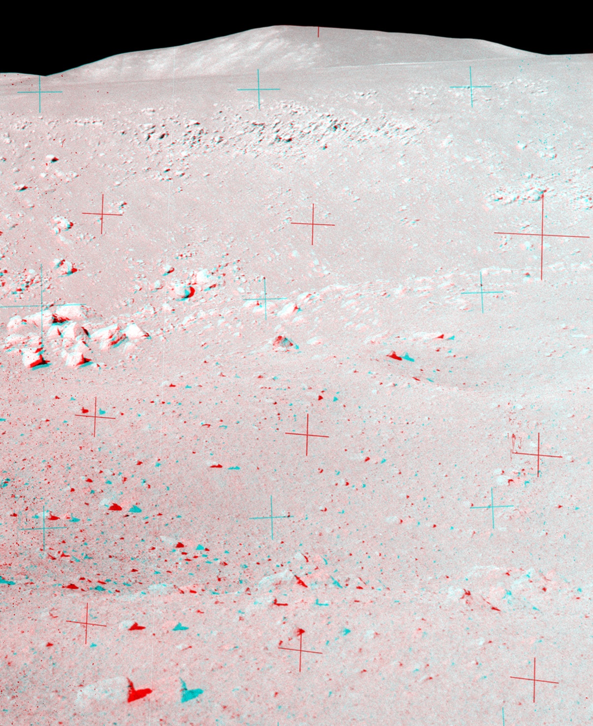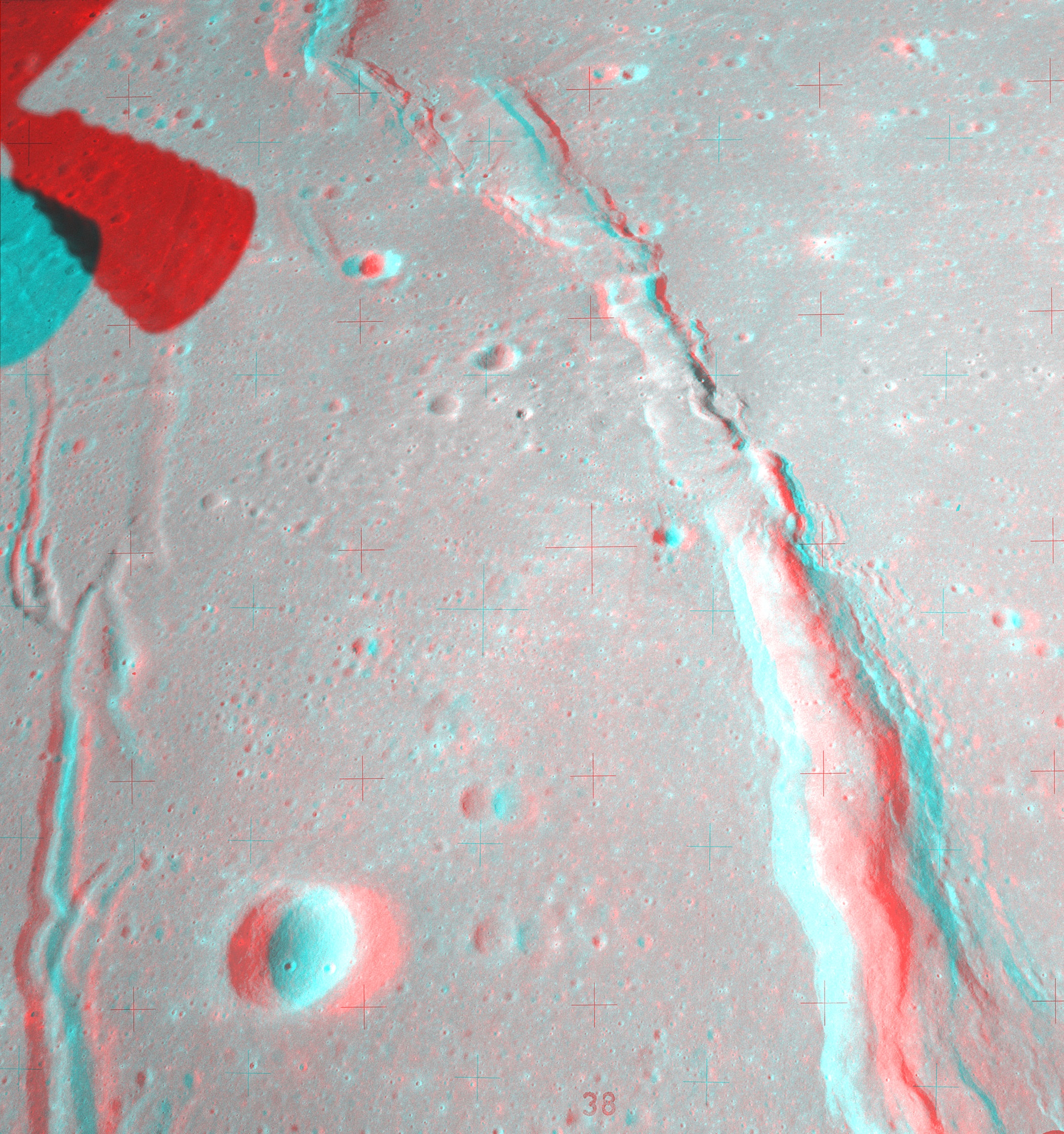 This frame shows a vertical view of the landing site. Higher resolution versions of M-0585 available from the ASU Apollo Image Archive. Frames 0584, 0586, and 0587 also include the landing site. Scan from the original film courtesy NASA/JSC/Arizona State University.Red-Blue Anaglyph, Apollo 15 Mapping (Metric) Camera Frames 0585-0586 ( 6.7 Mb or 0.5 Mb )