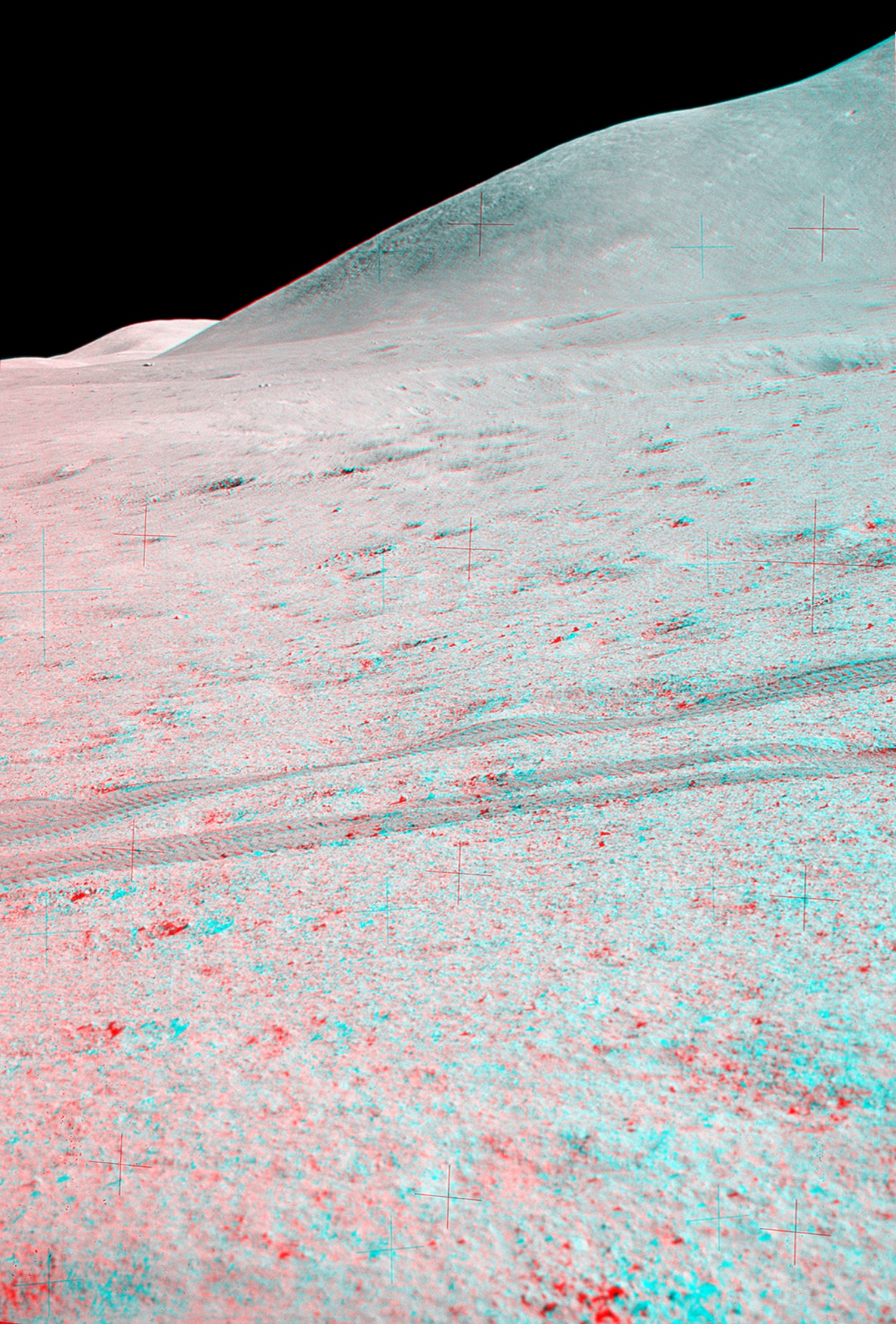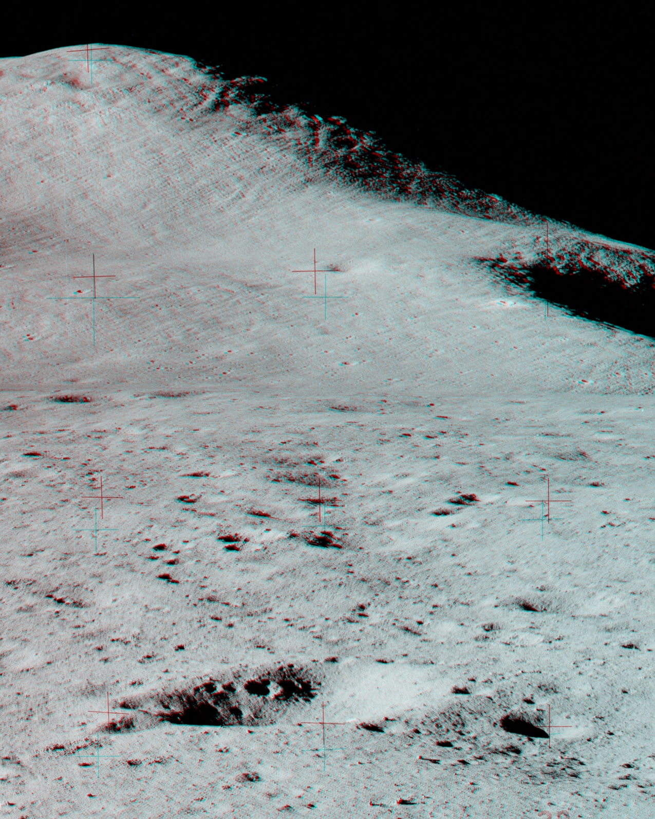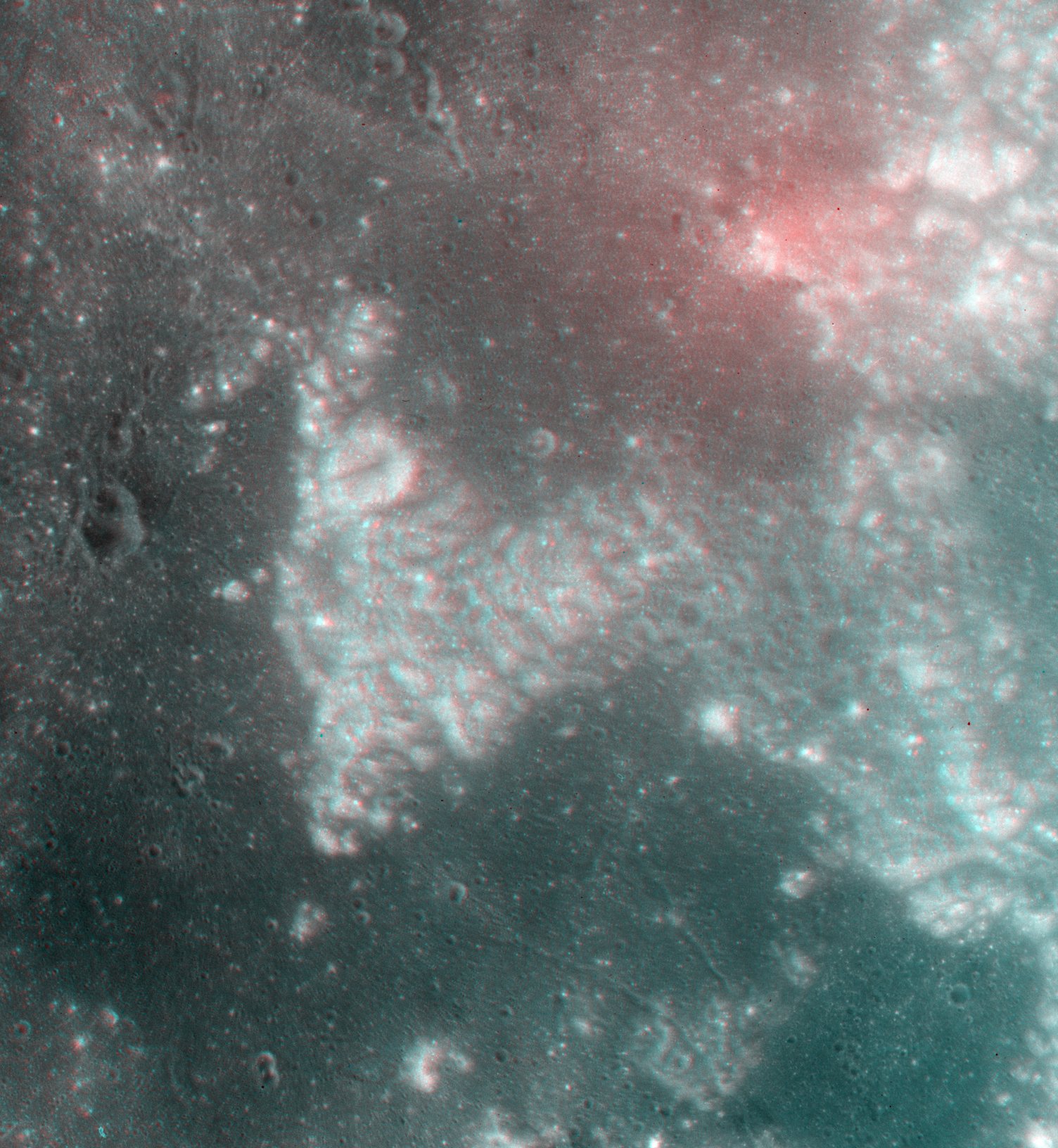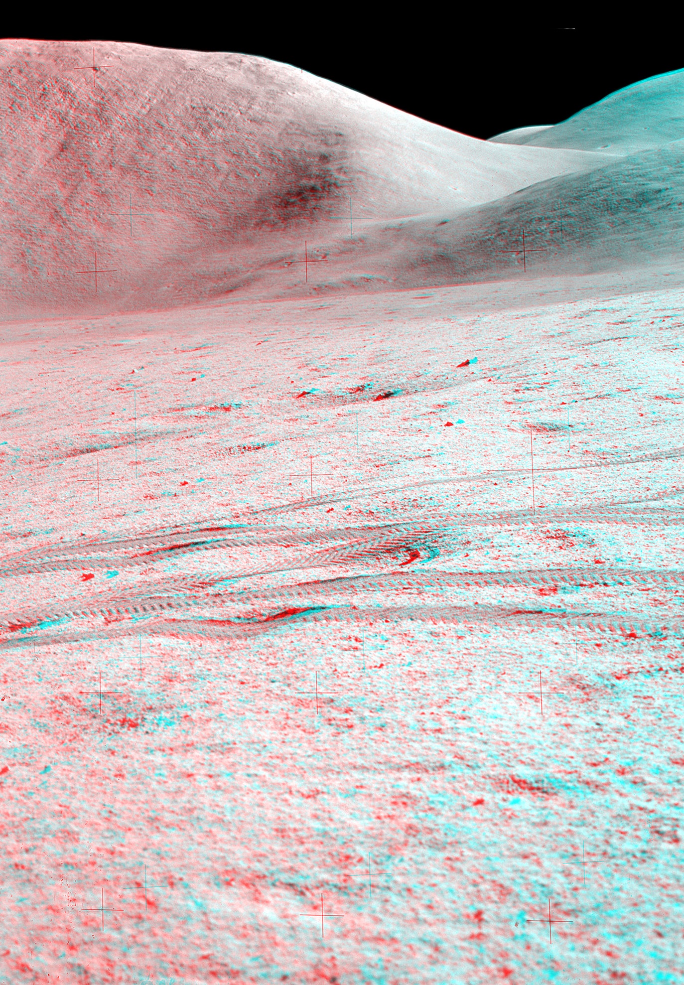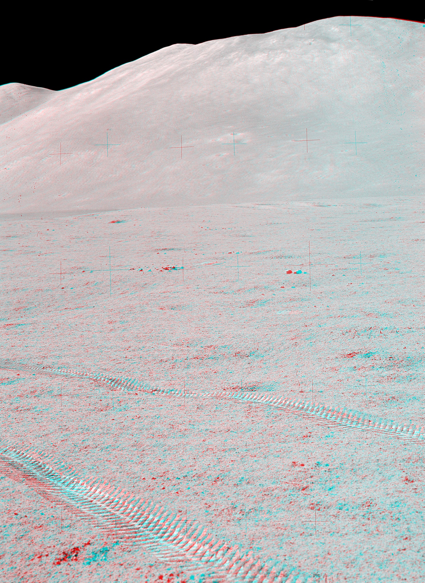 This frame shows a vertical view of the landing site. Higher resolution versions of M-0585 available from the ASU Apollo Image Archive. Frames 0584, 0586, and 0587 also include the landing site. Scan from the original film courtesy NASA/JSC/Arizona State University.Red-Blue Anaglyph, Apollo 15 Mapping (Metric) Camera Frames 0585-0586 ( 6.7 Mb or 0.5 Mb )