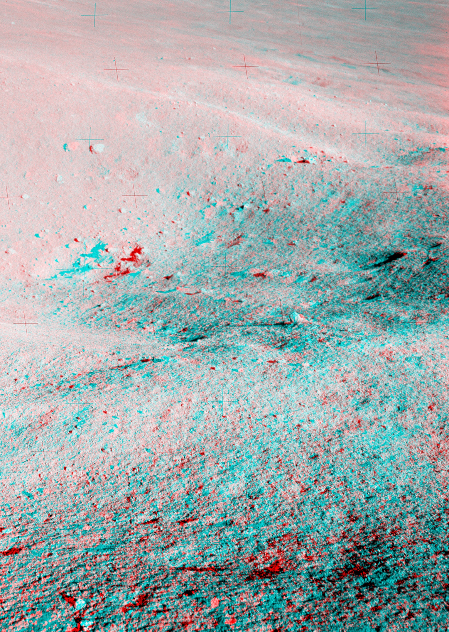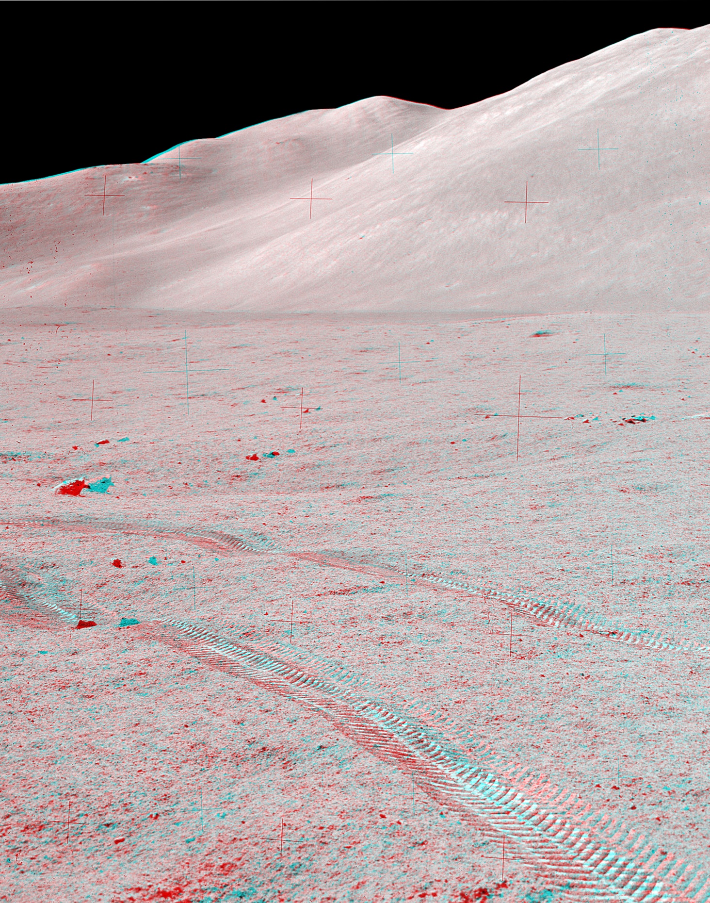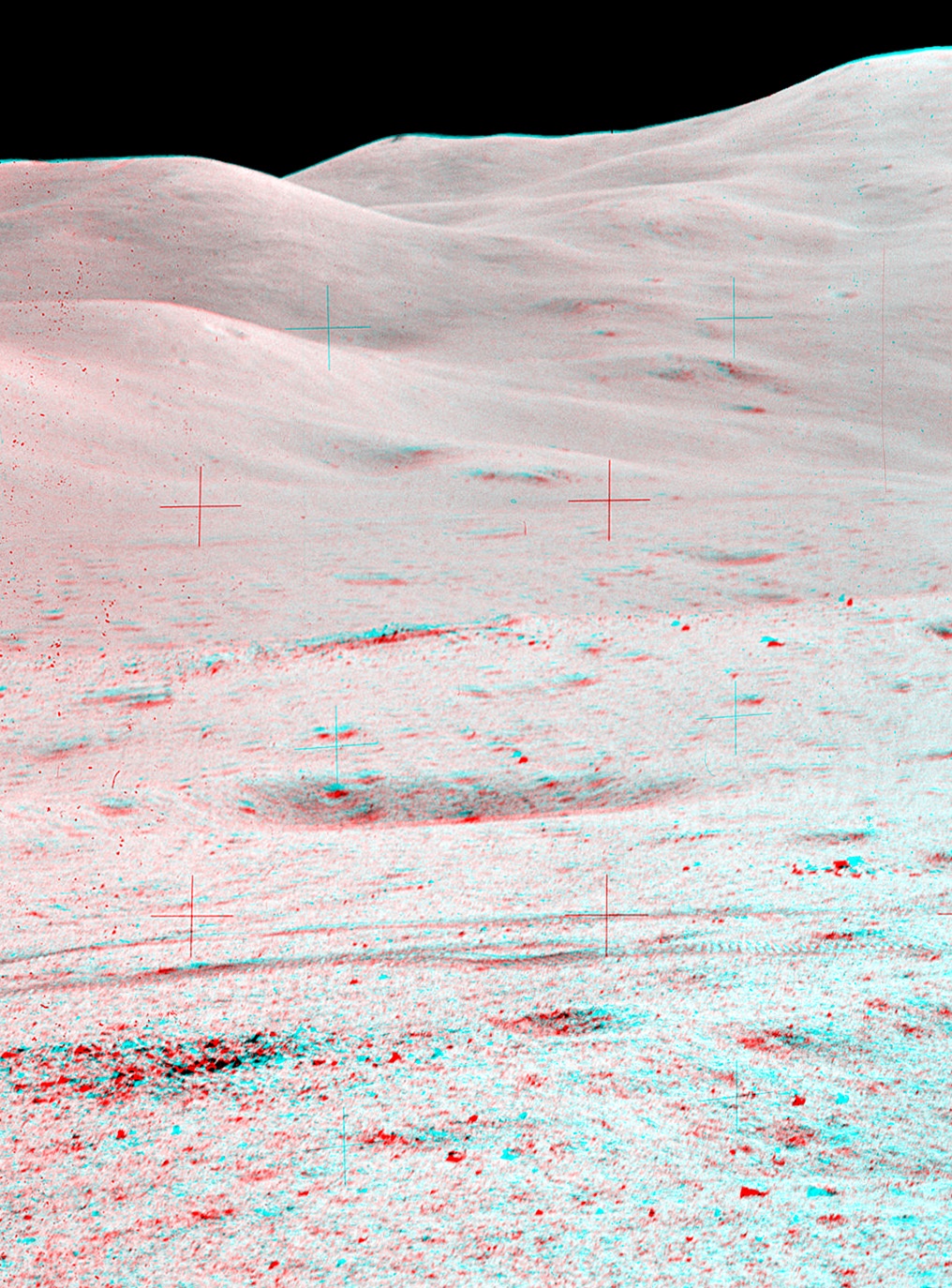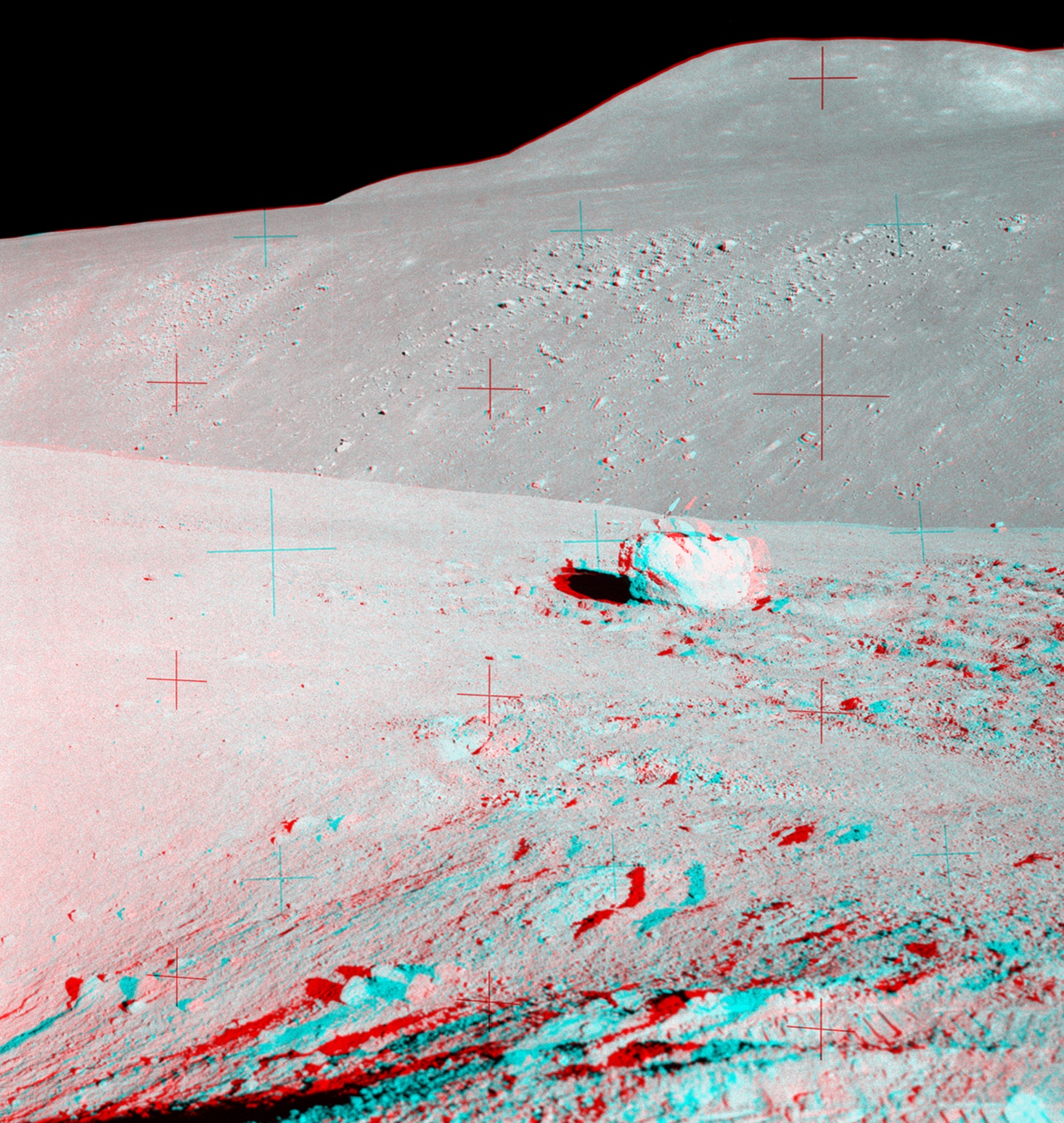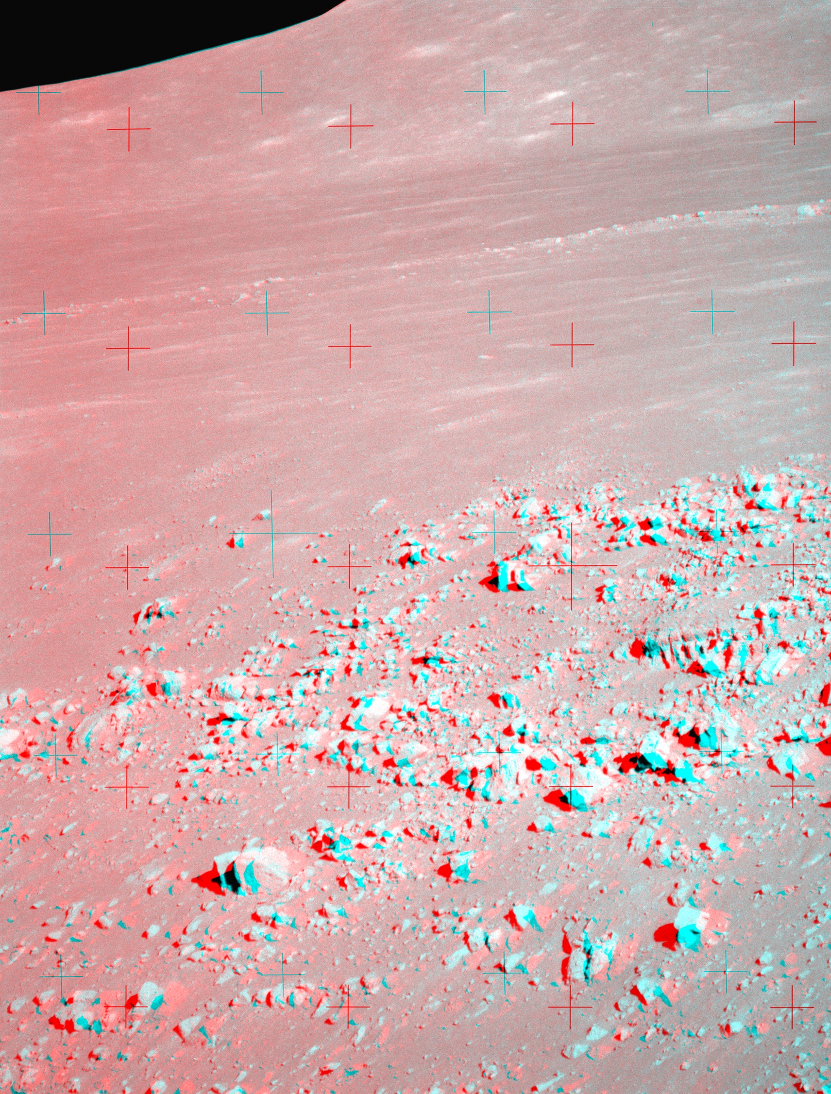 This frame shows a vertical view of the landing site. Higher resolution versions of M-0585 available from the ASU Apollo Image Archive. Frames 0584, 0586, and 0587 also include the landing site. Scan from the original film courtesy NASA/JSC/Arizona State University.Red-Blue Anaglyph, Apollo 15 Mapping (Metric) Camera Frames 0585-0586 ( 6.7 Mb or 0.5 Mb )