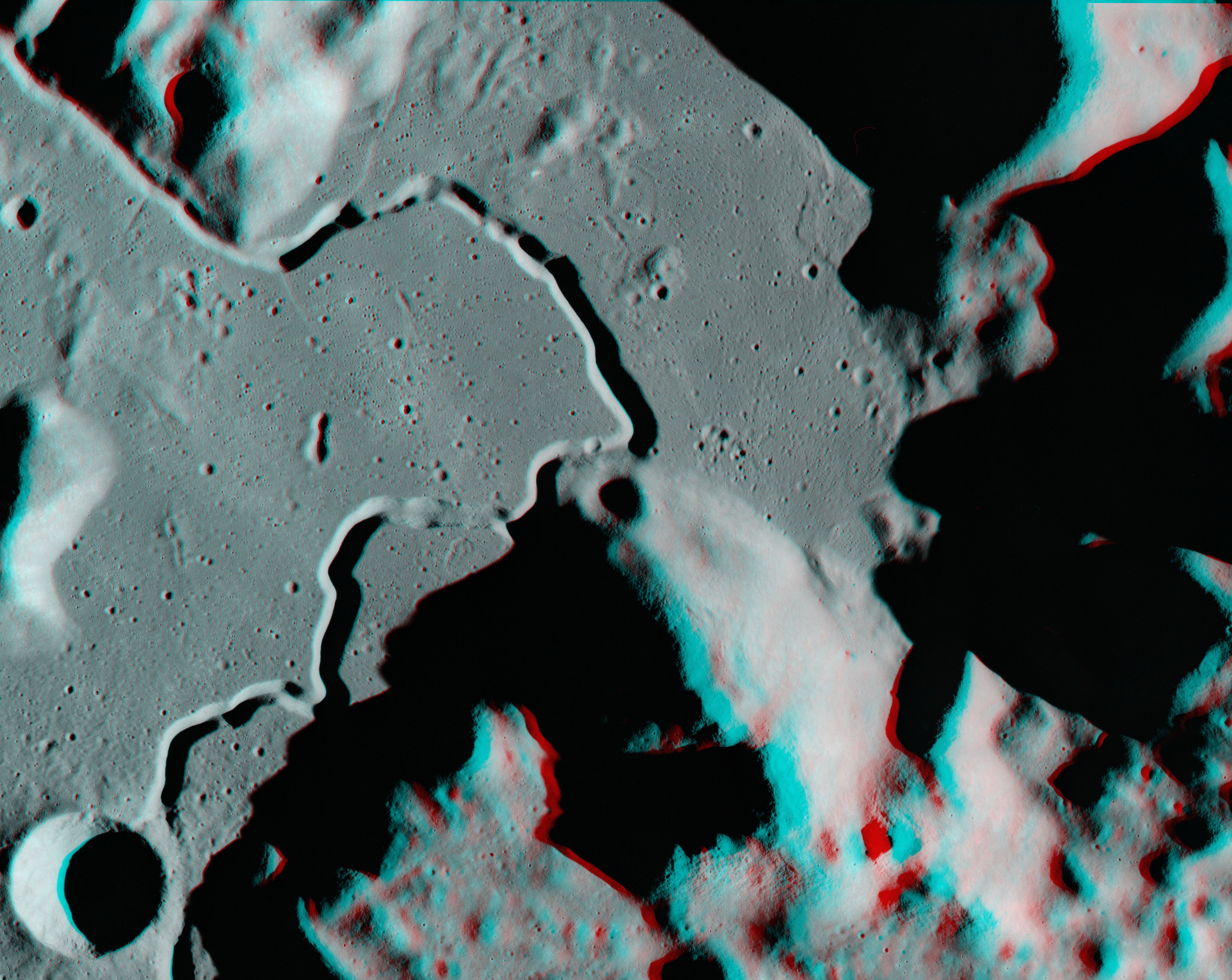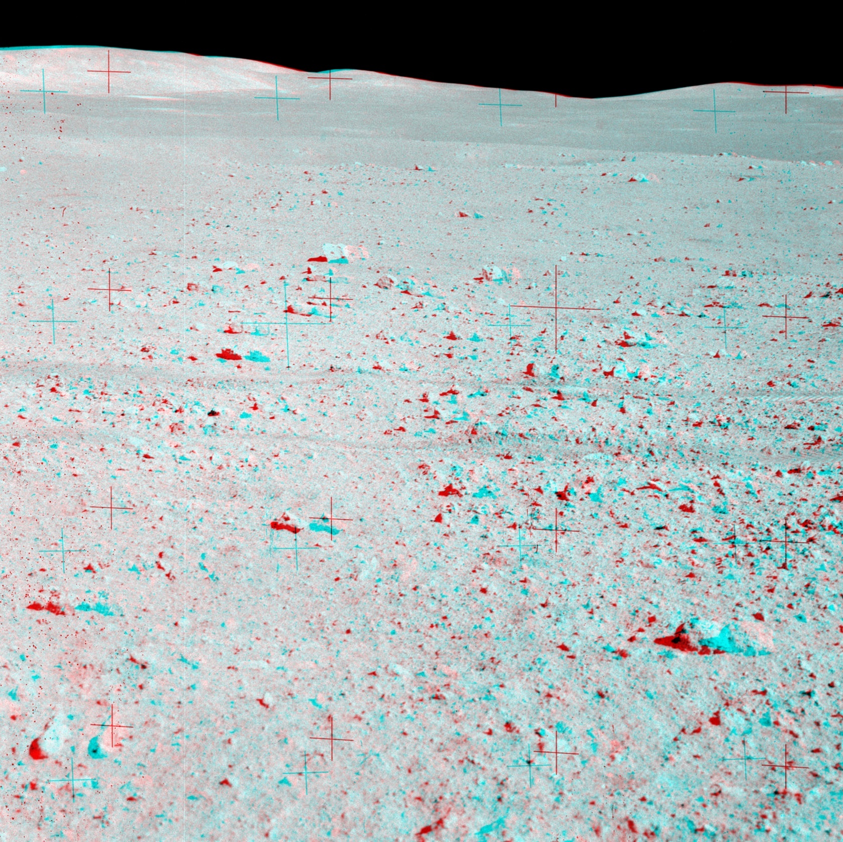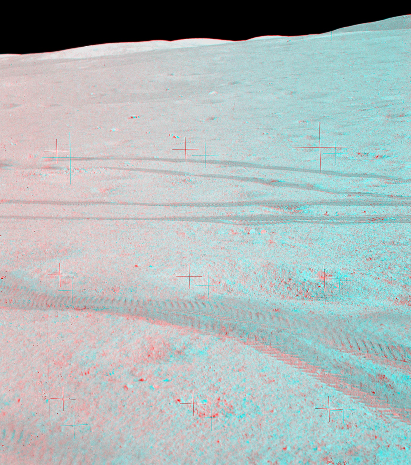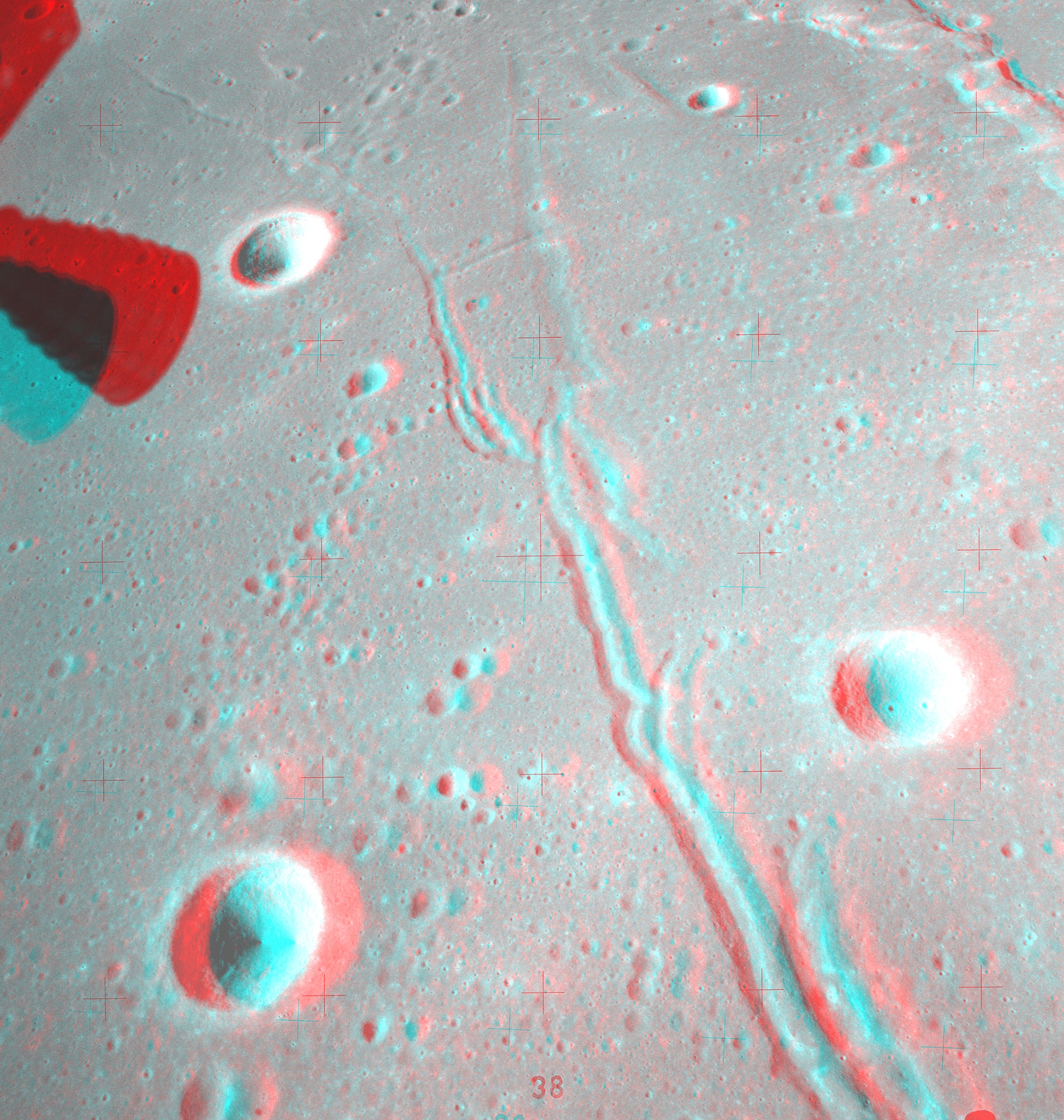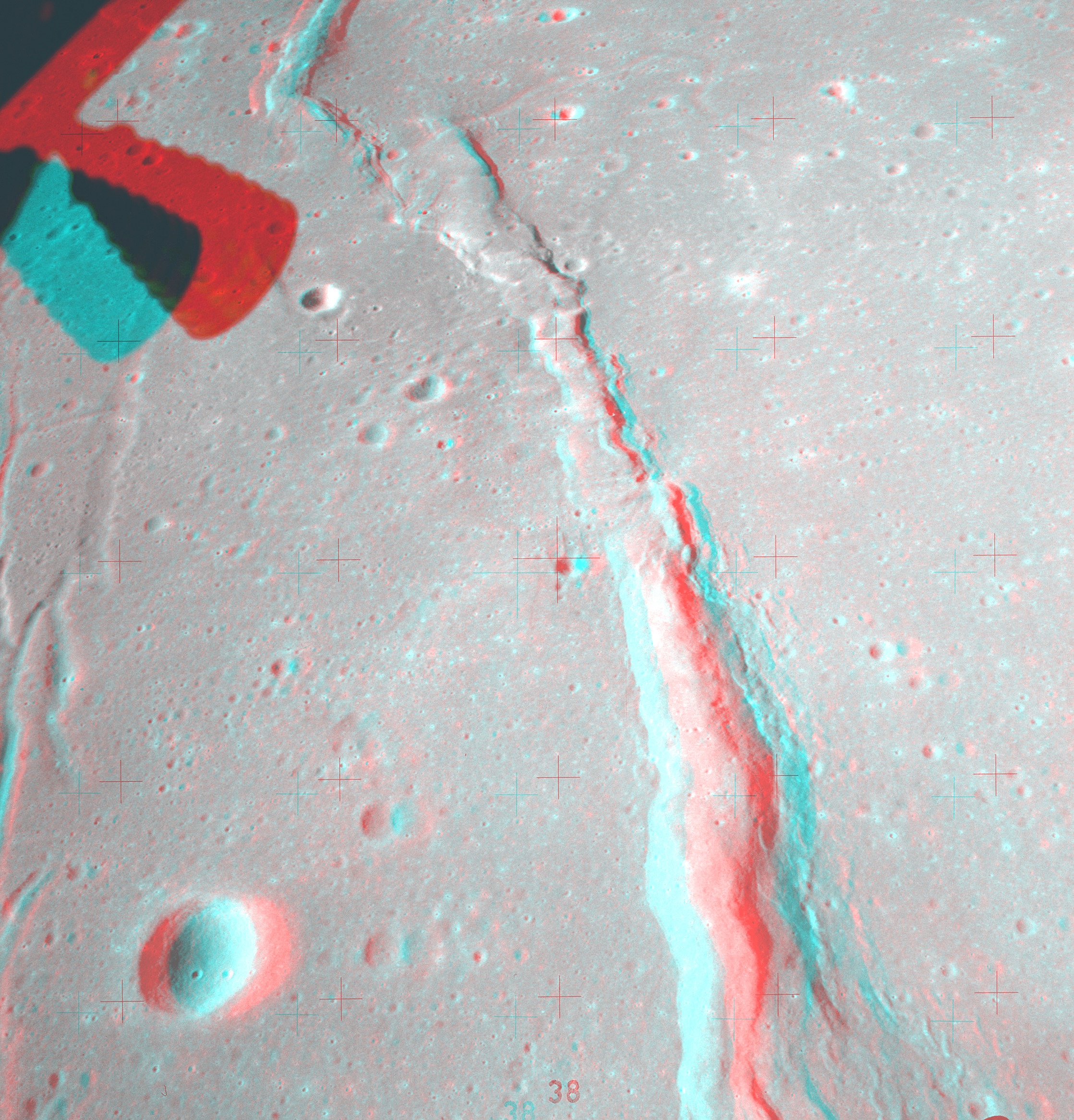 This frame shows a vertical view of the landing site. Higher resolution versions of M-0585 available from the ASU Apollo Image Archive. Frames 0584, 0586, and 0587 also include the landing site. Scan from the original film courtesy NASA/JSC/Arizona State University.Red-Blue Anaglyph, Apollo 15 Mapping (Metric) Camera Frames 0585-0586 ( 6.7 Mb or 0.5 Mb )