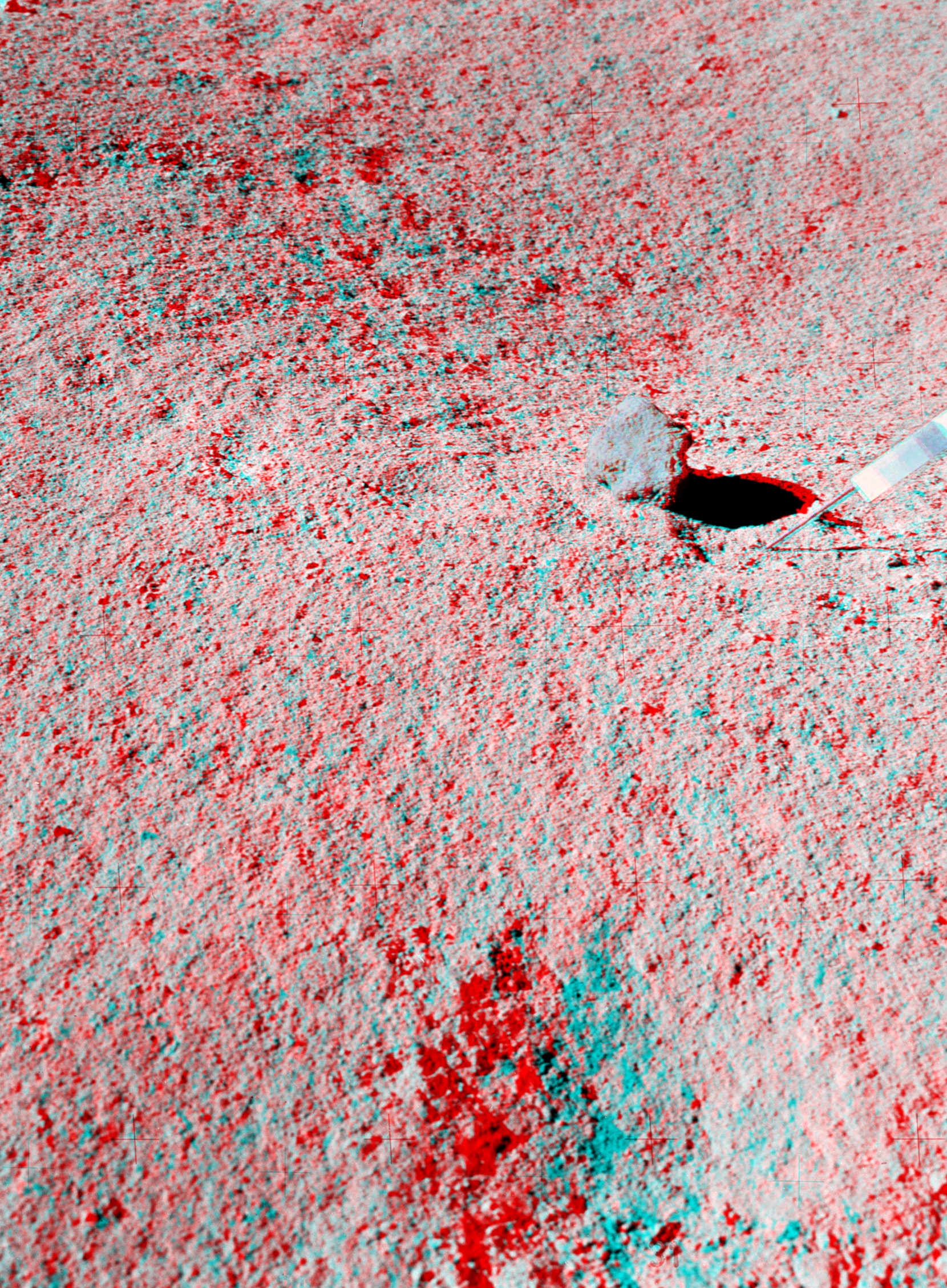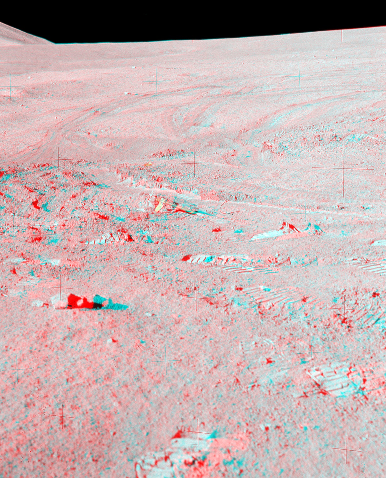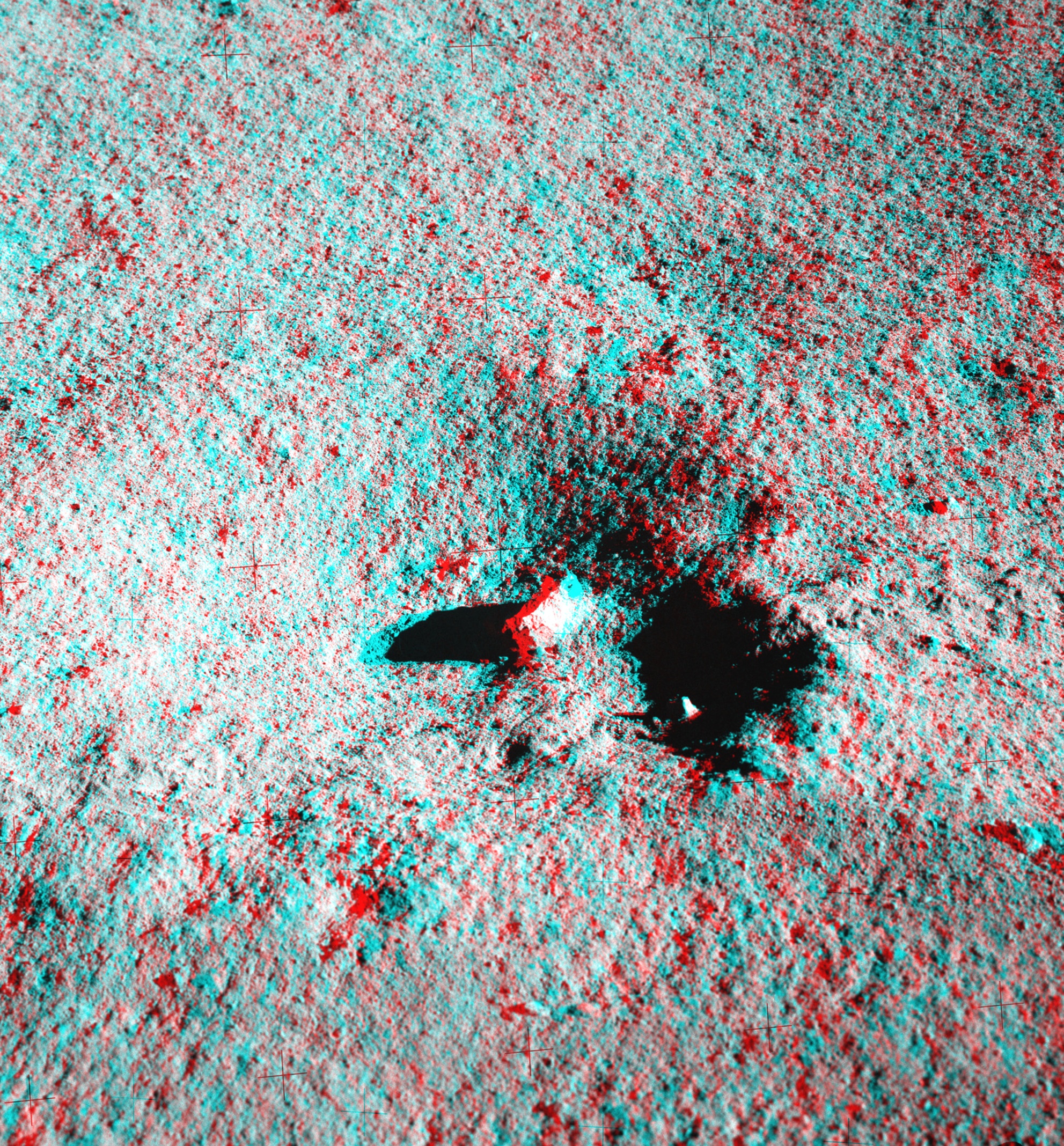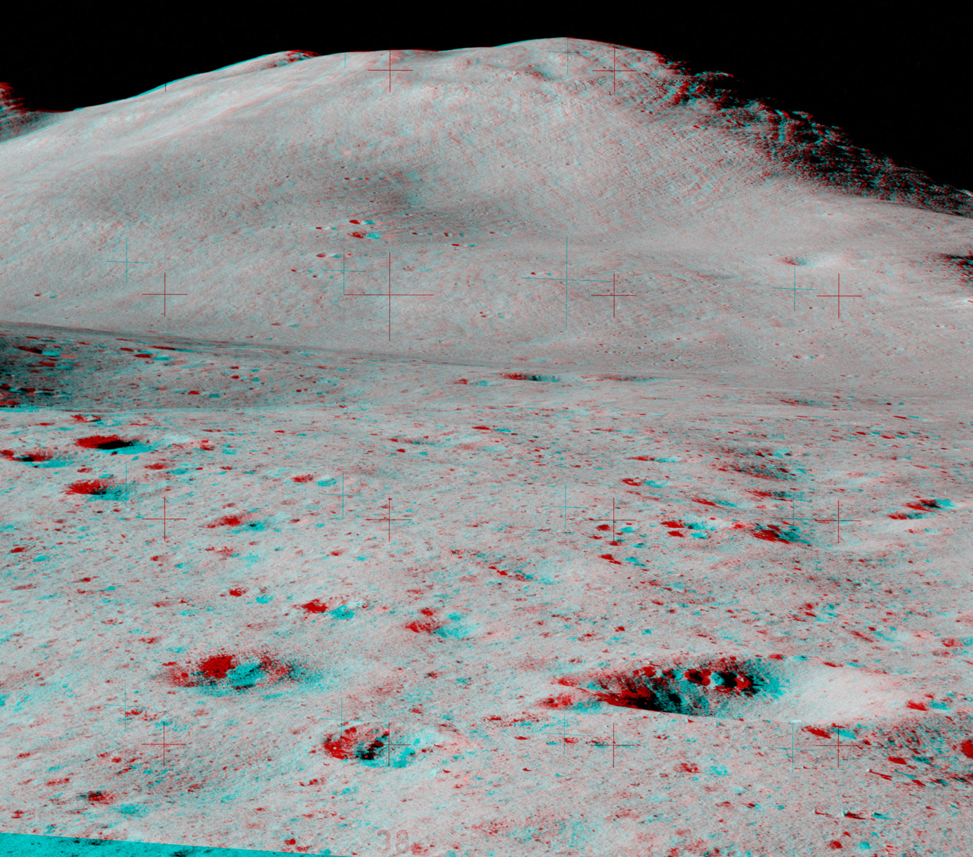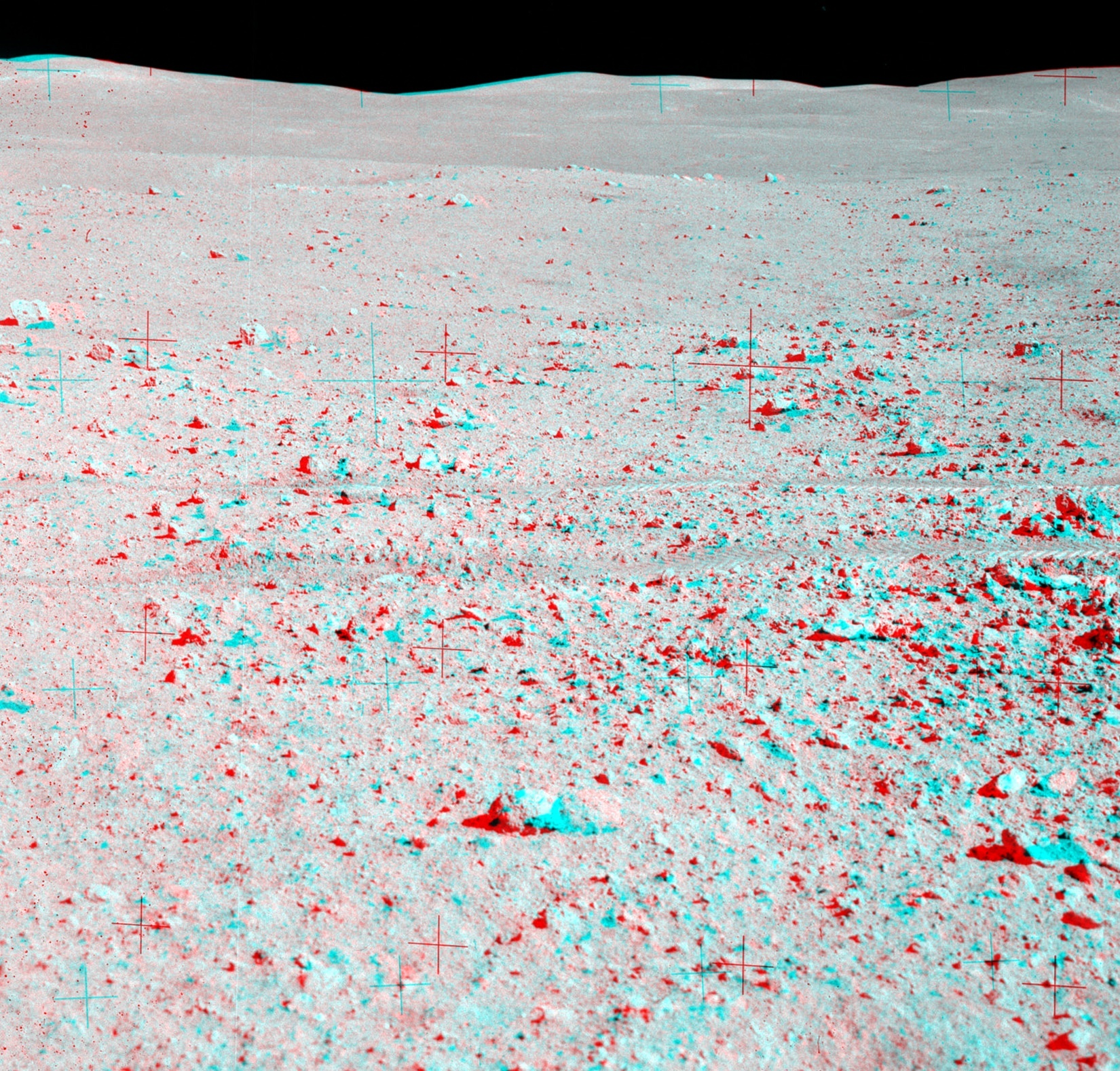 This frame shows a vertical view of the landing site. Higher resolution versions of M-0585 available from the ASU Apollo Image Archive. Frames 0584, 0586, and 0587 also include the landing site. Scan from the original film courtesy NASA/JSC/Arizona State University.Red-Blue Anaglyph, Apollo 15 Mapping (Metric) Camera Frames 0585-0586 ( 6.7 Mb or 0.5 Mb )
