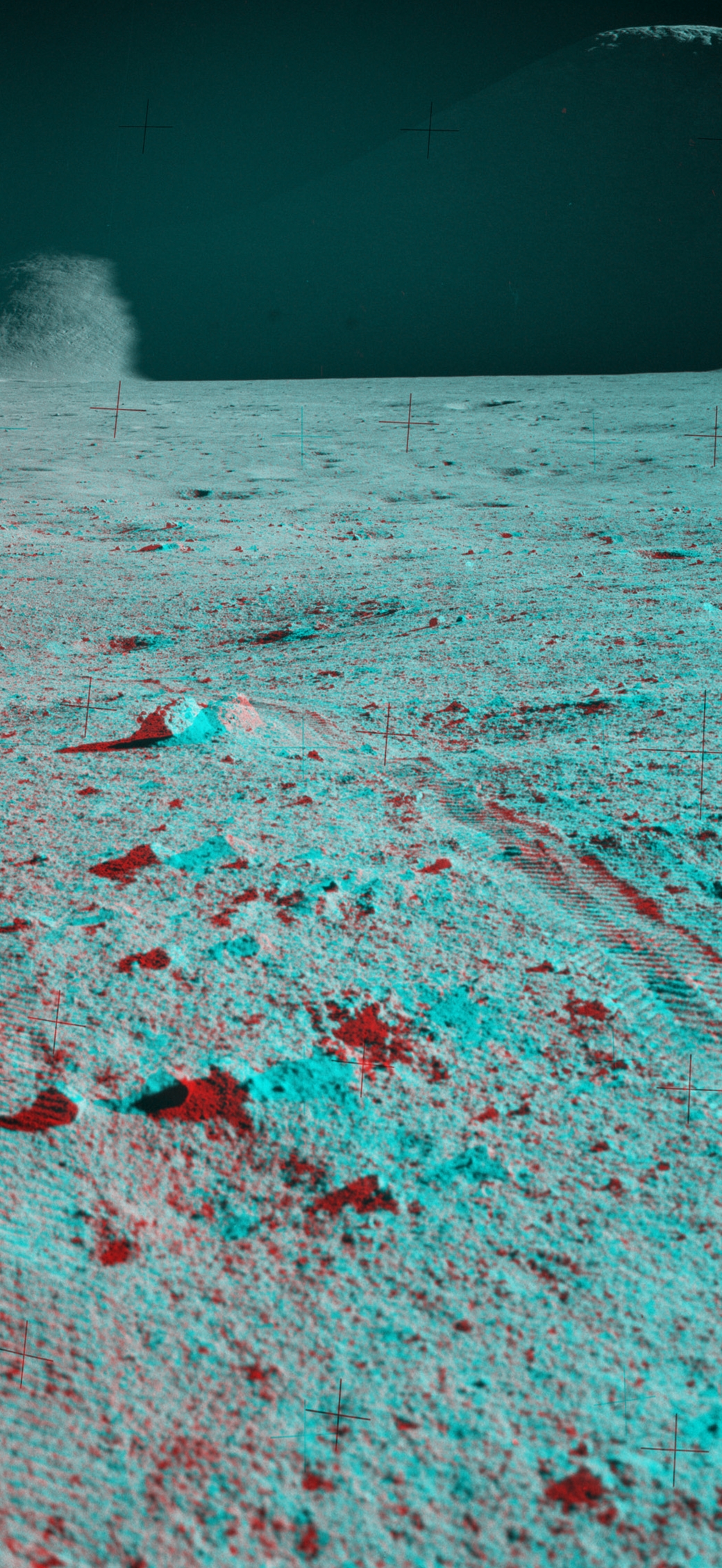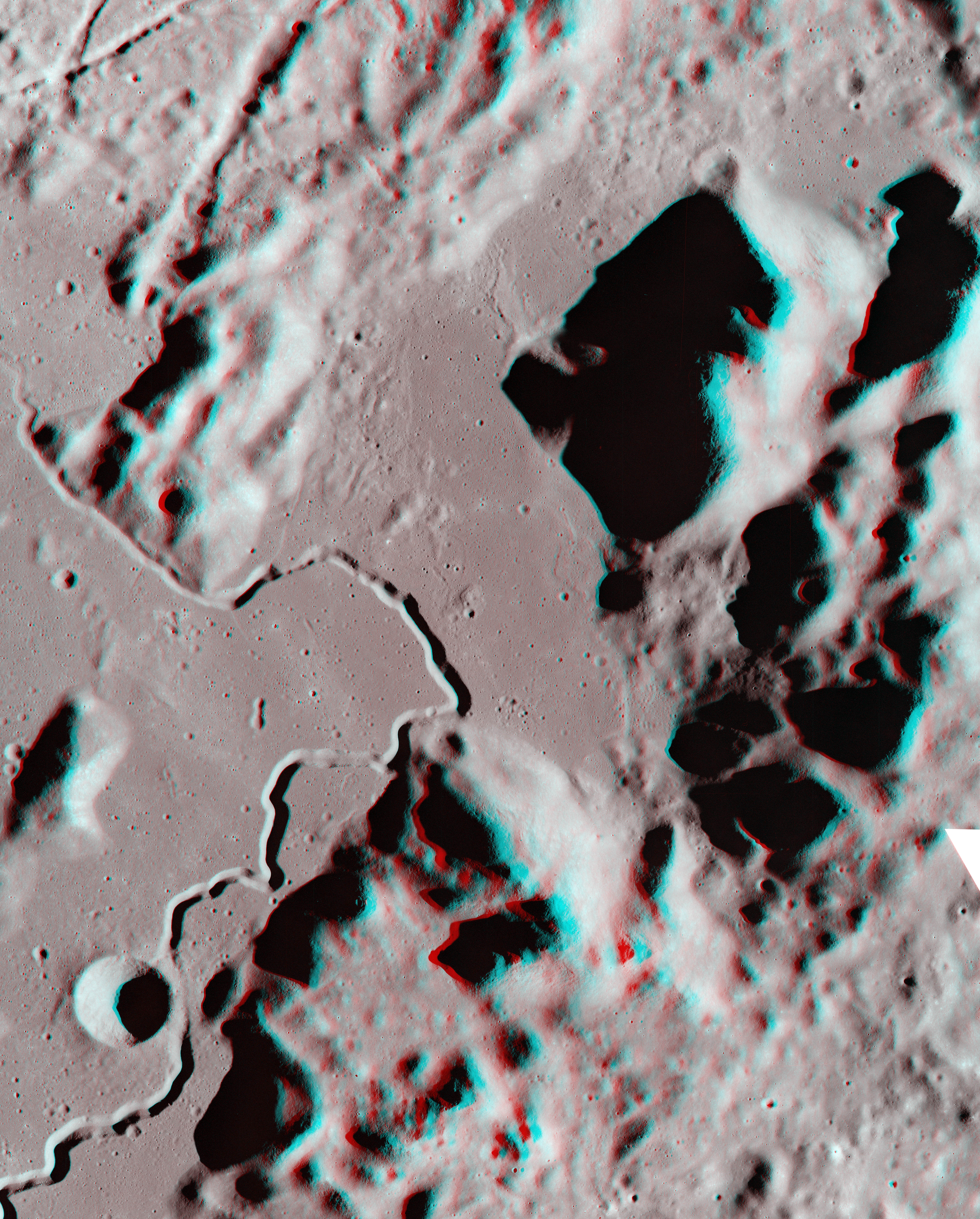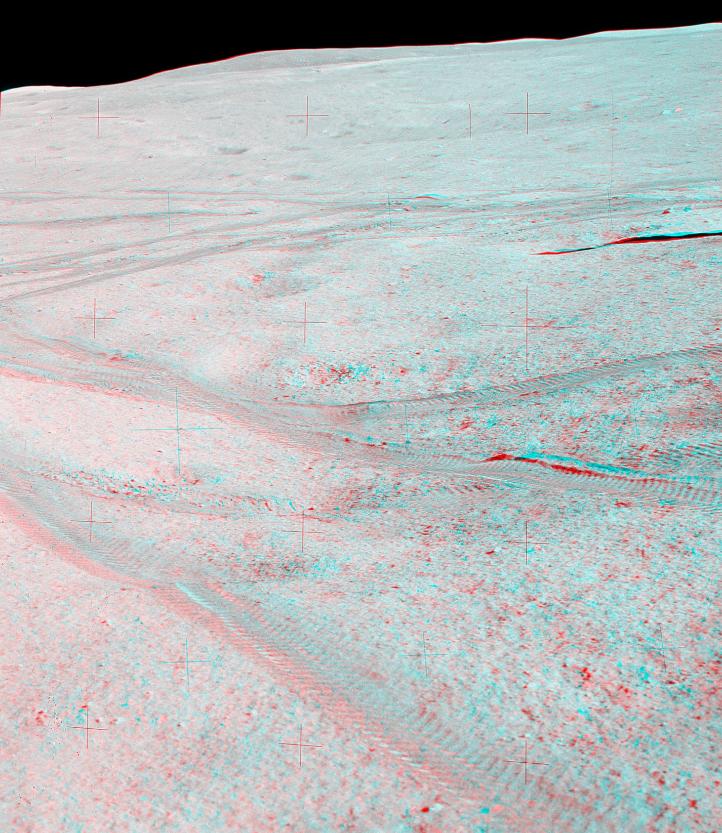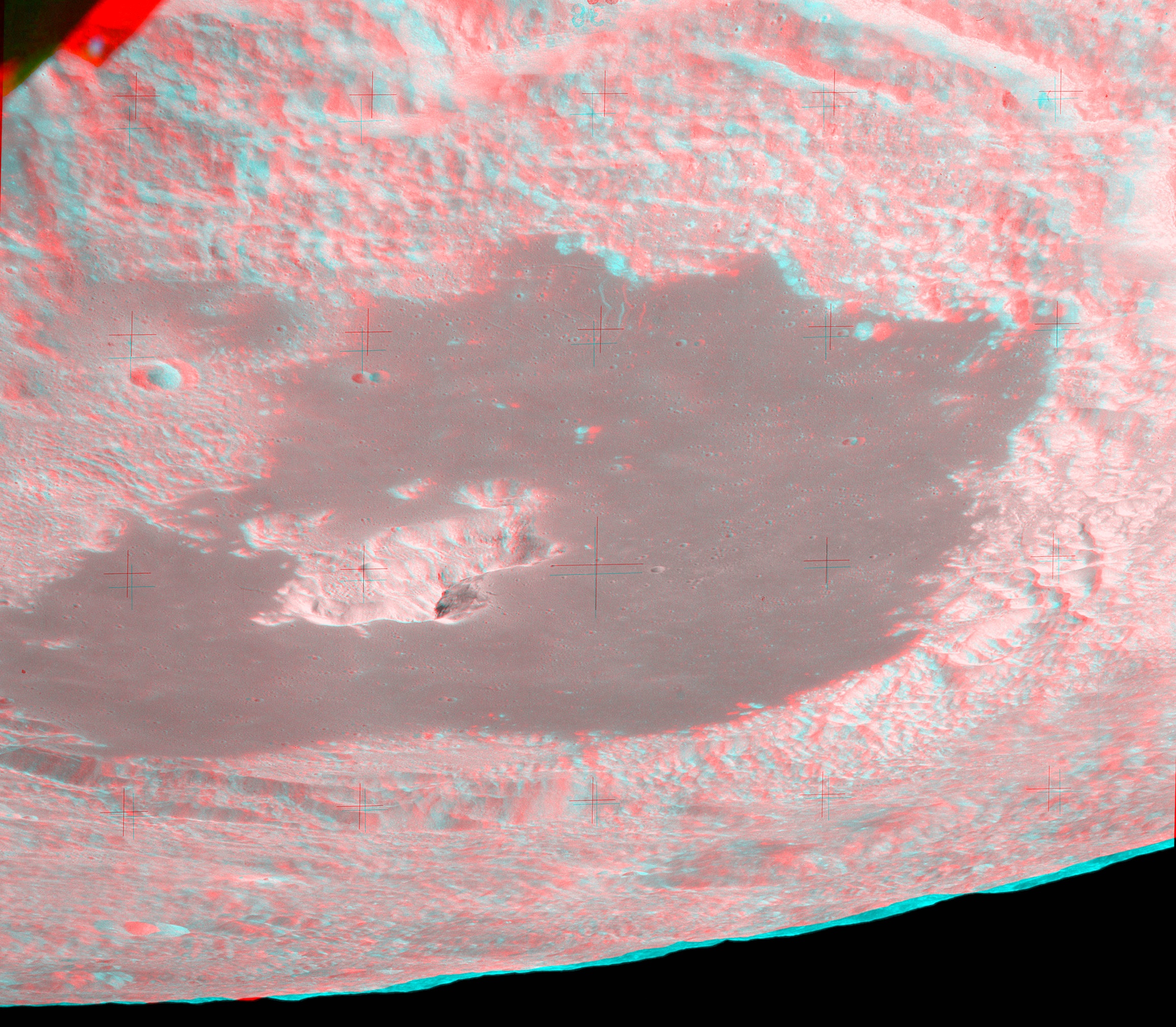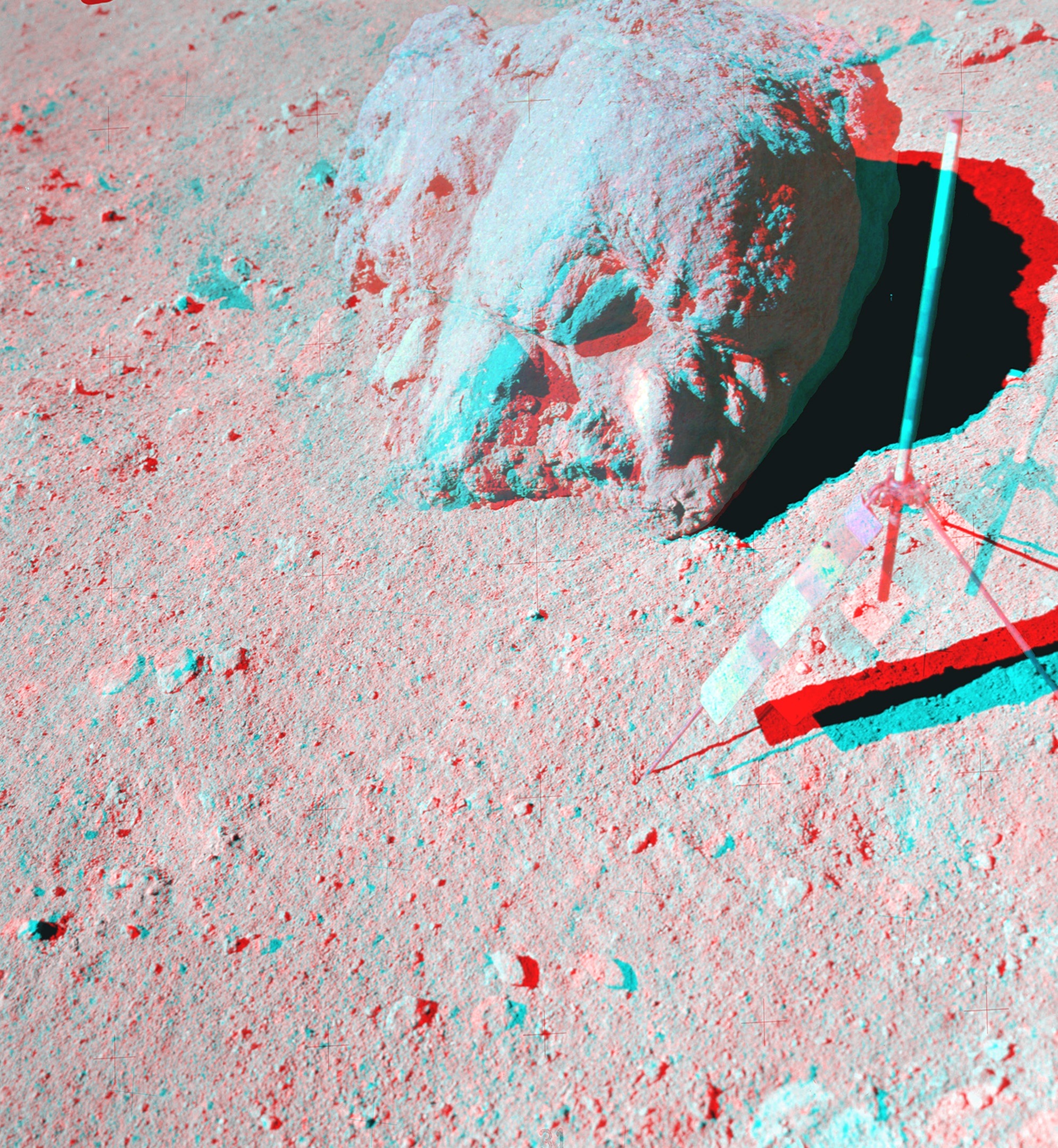 This frame shows a vertical view of the landing site. Higher resolution versions of M-0585 available from the ASU Apollo Image Archive. Frames 0584, 0586, and 0587 also include the landing site. Scan from the original film courtesy NASA/JSC/Arizona State University.Red-Blue Anaglyph, Apollo 15 Mapping (Metric) Camera Frames 0585-0586 ( 6.7 Mb or 0.5 Mb )