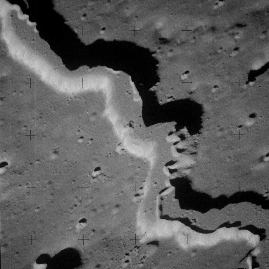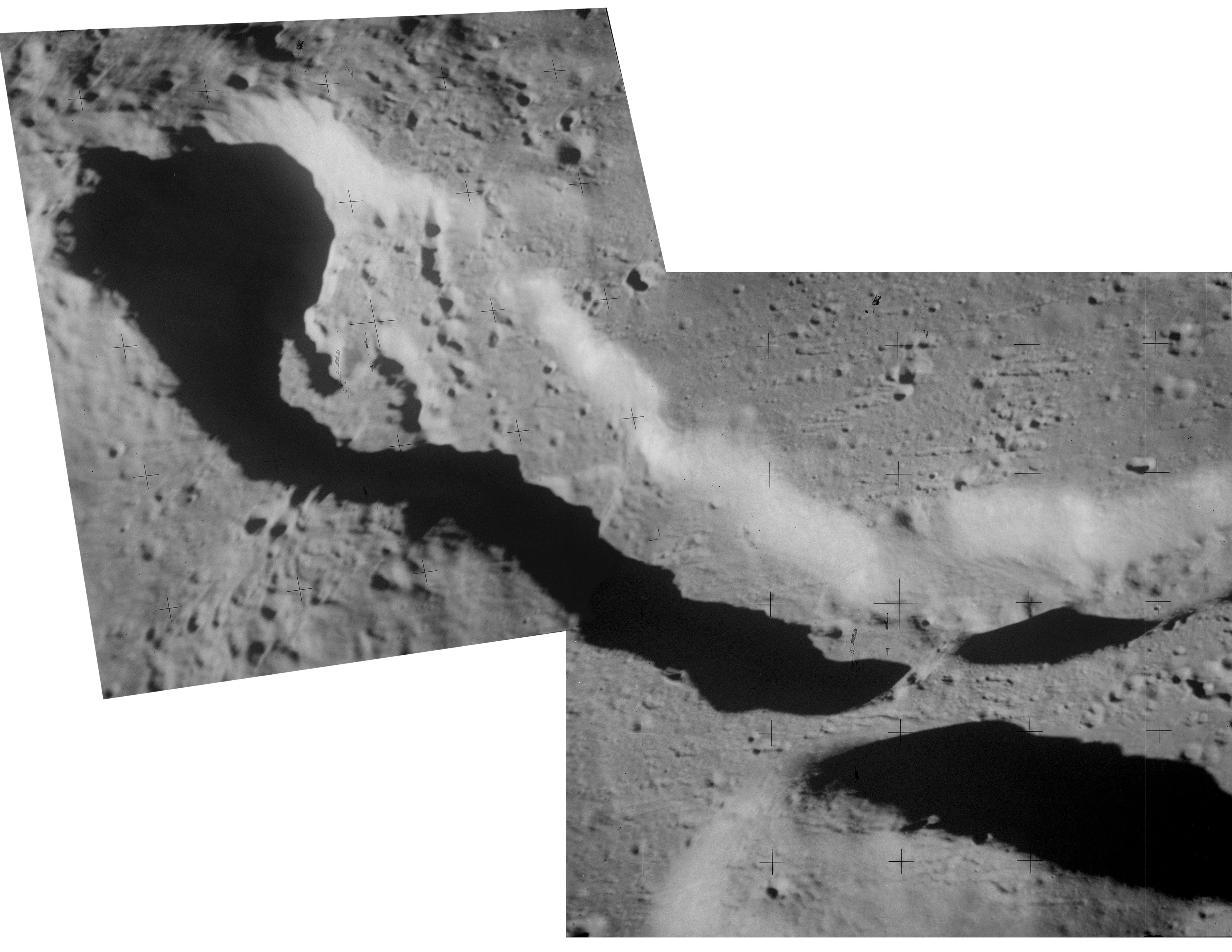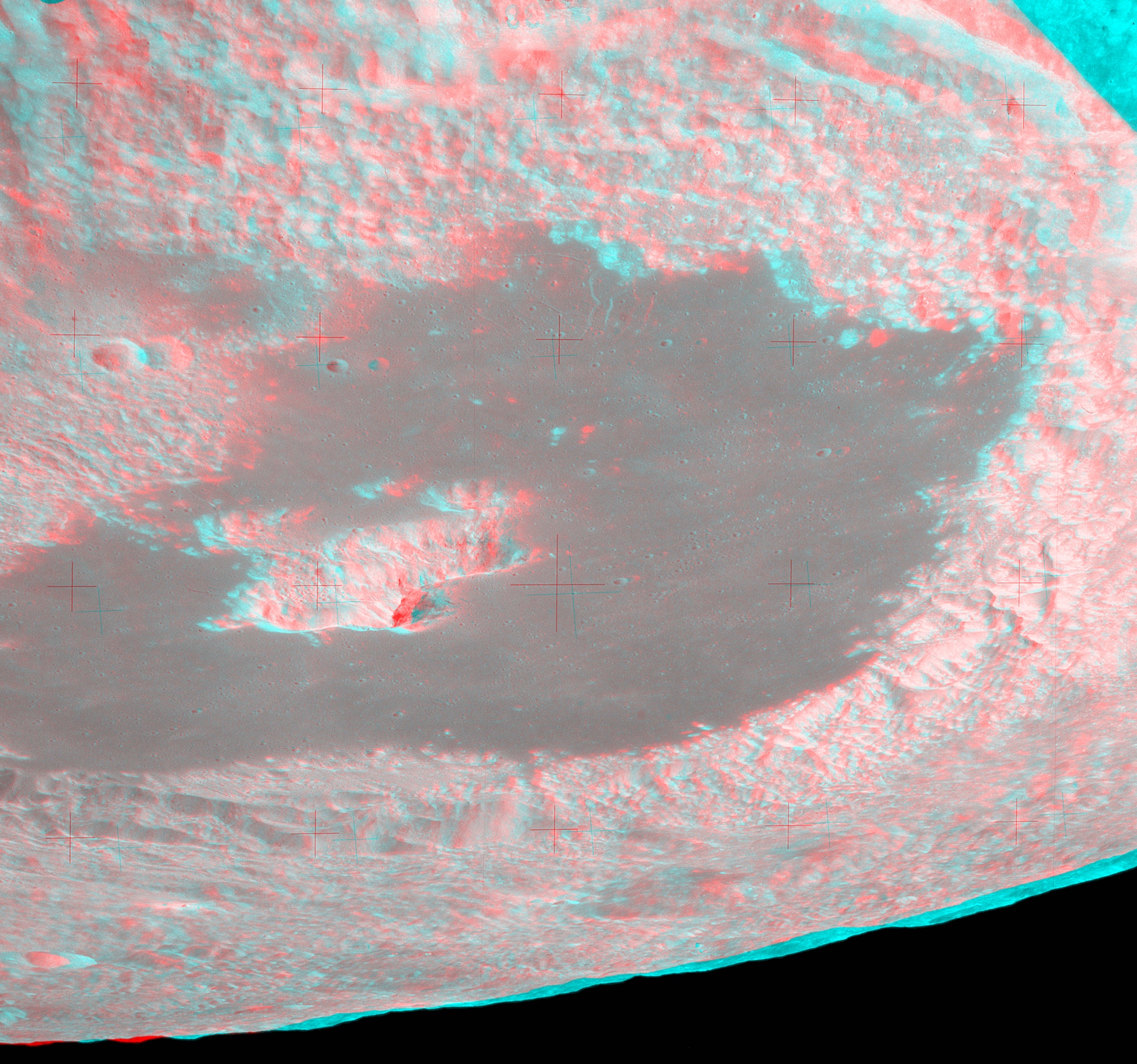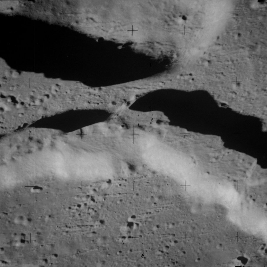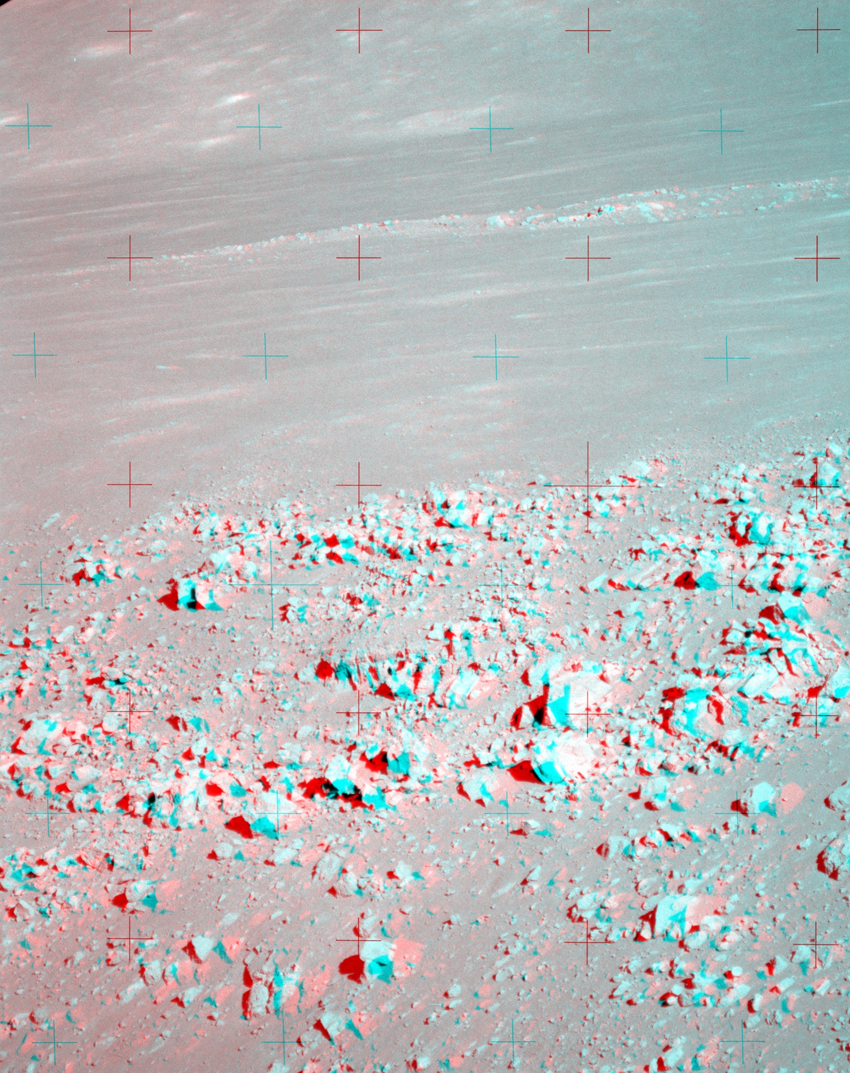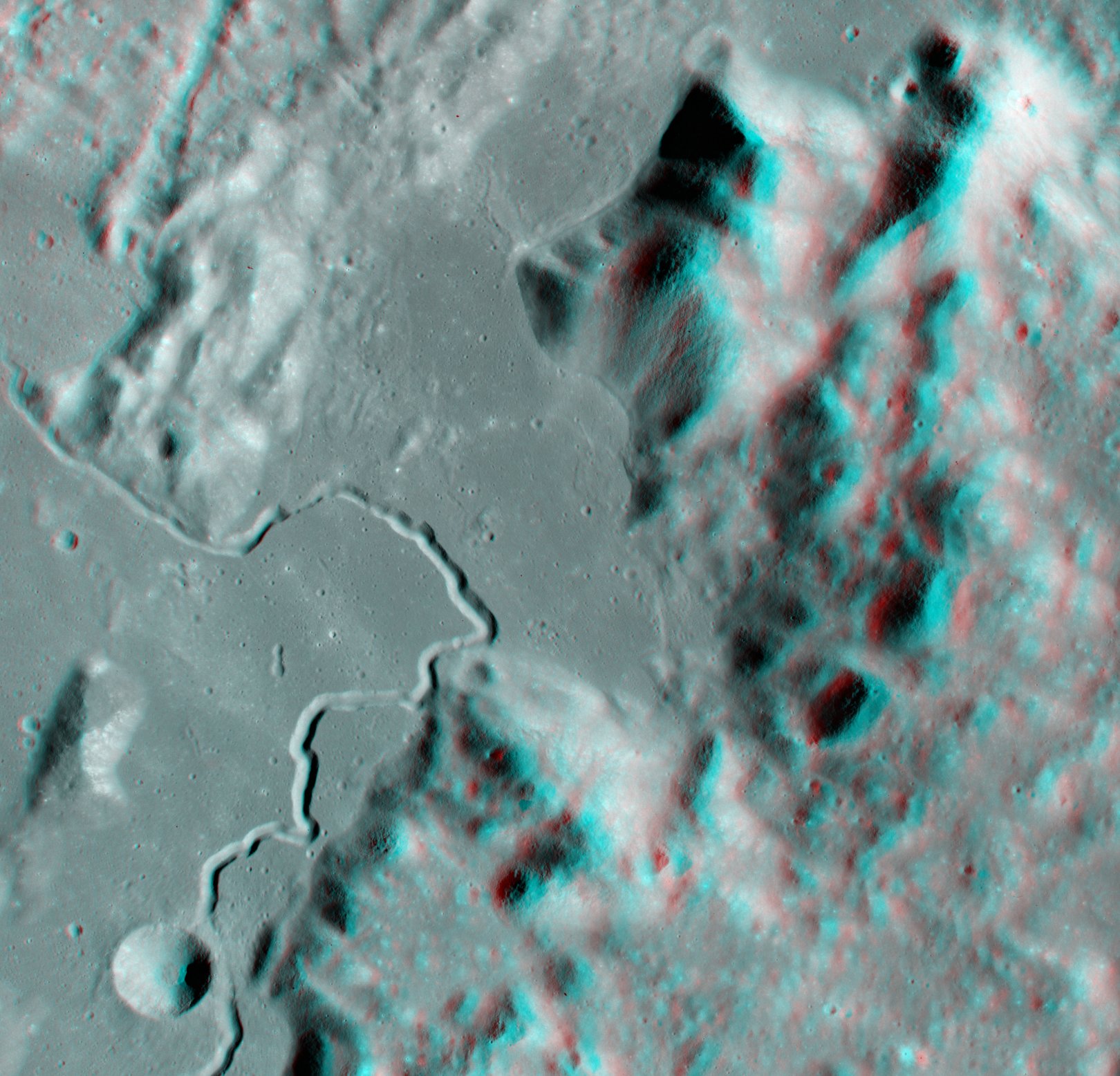 This frame shows a vertical view of the landing site. Higher resolution versions of M-0585 available from the ASU Apollo Image Archive. Frames 0584, 0586, and 0587 also include the landing site. Scan from the original film courtesy NASA/JSC/Arizona State University.Red-Blue Anaglyph, Apollo 15 Mapping (Metric) Camera Frames 0585-0586 ( 6.7 Mb or 0.5 Mb )