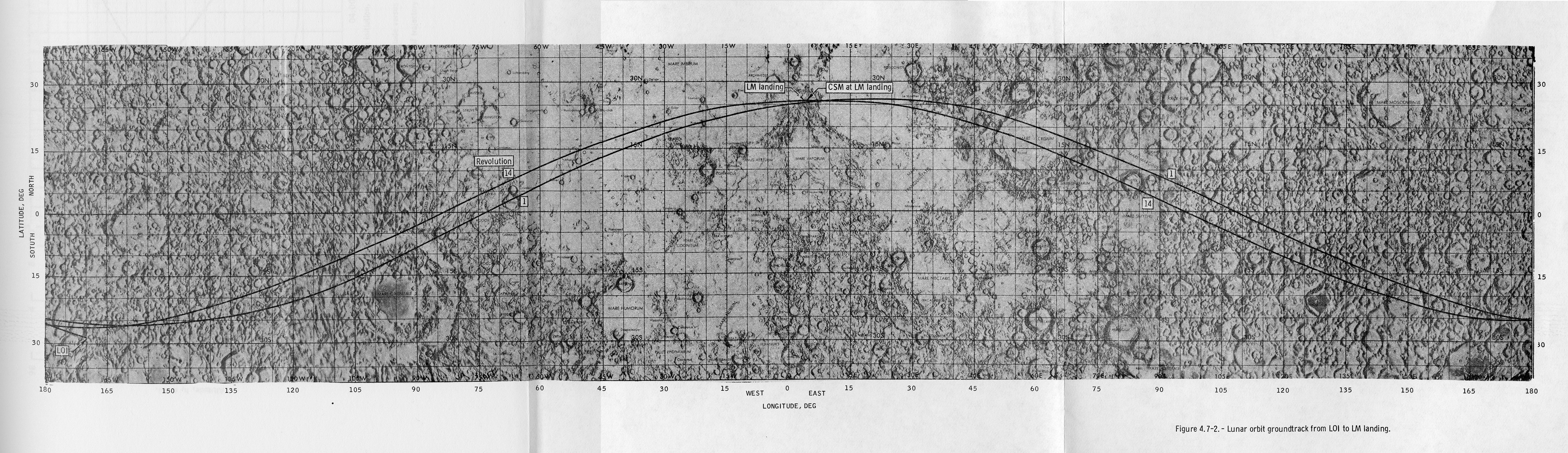 Ground Tracks for Revs 1 and 14. Figure 4.7-2 from 'Spacecraft Operational Trajectory for Apollo 15 (Mission J-1) Launched July 26, 1971 Volume I - Mission Profile' aka 'MSC Internal Note No. 71-FM-130 - April 16, 1971'. Scan courtesy Stephen Tellier.Apollo 15 Planned LM Descent Ground Track ( 2.9 Mb or 640k )