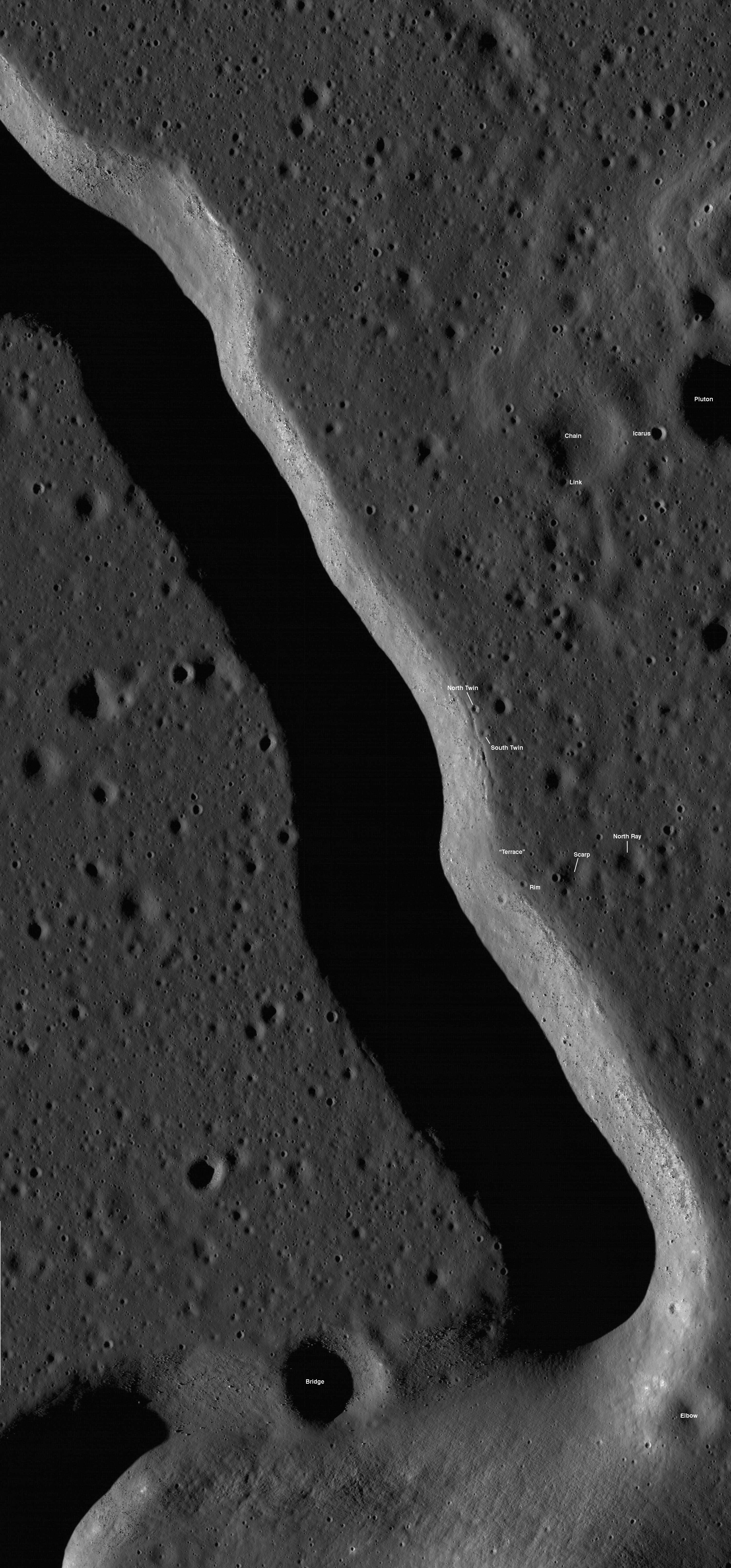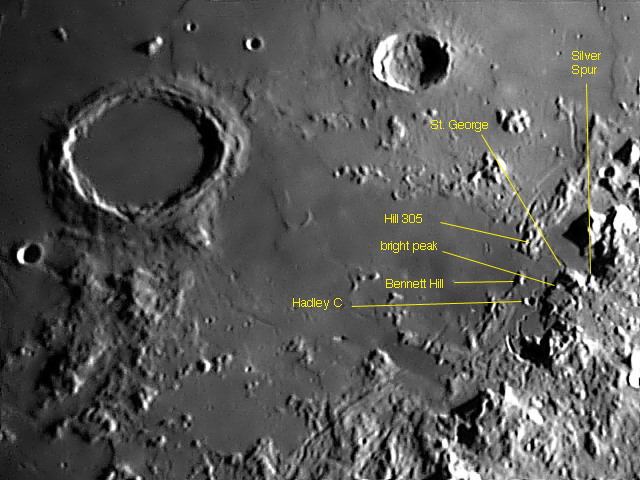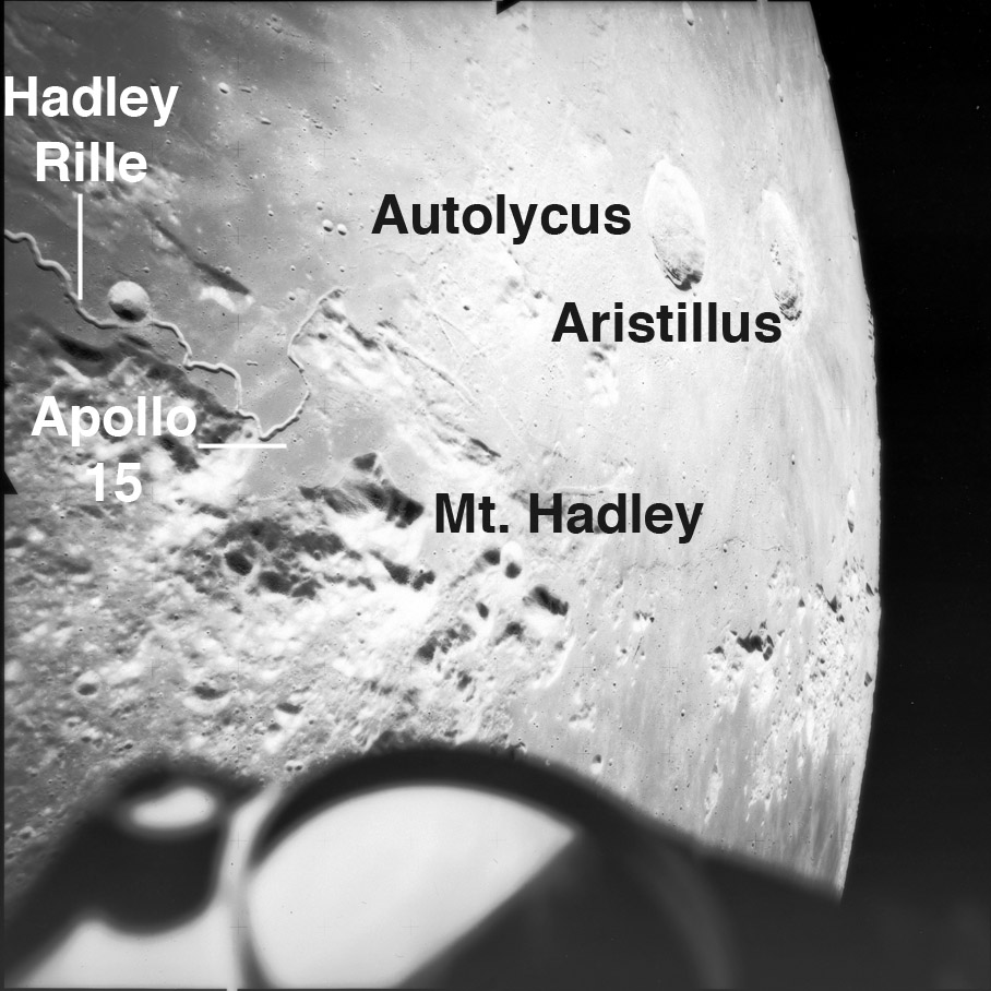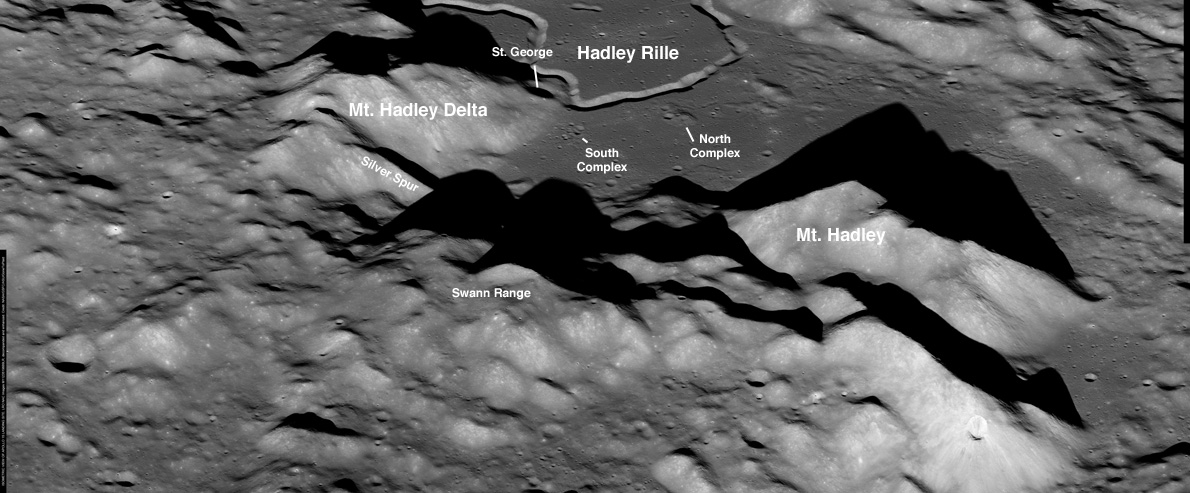 This combined, enhanced image from the Extended Science Mission was created by GoneToPlaid. A smaller version (0.3 Mb) has the major features labeled; and a labeled detail (2 Mb) concentrates on the area relevant to Apollo 15