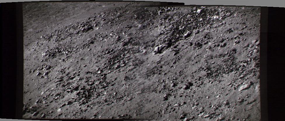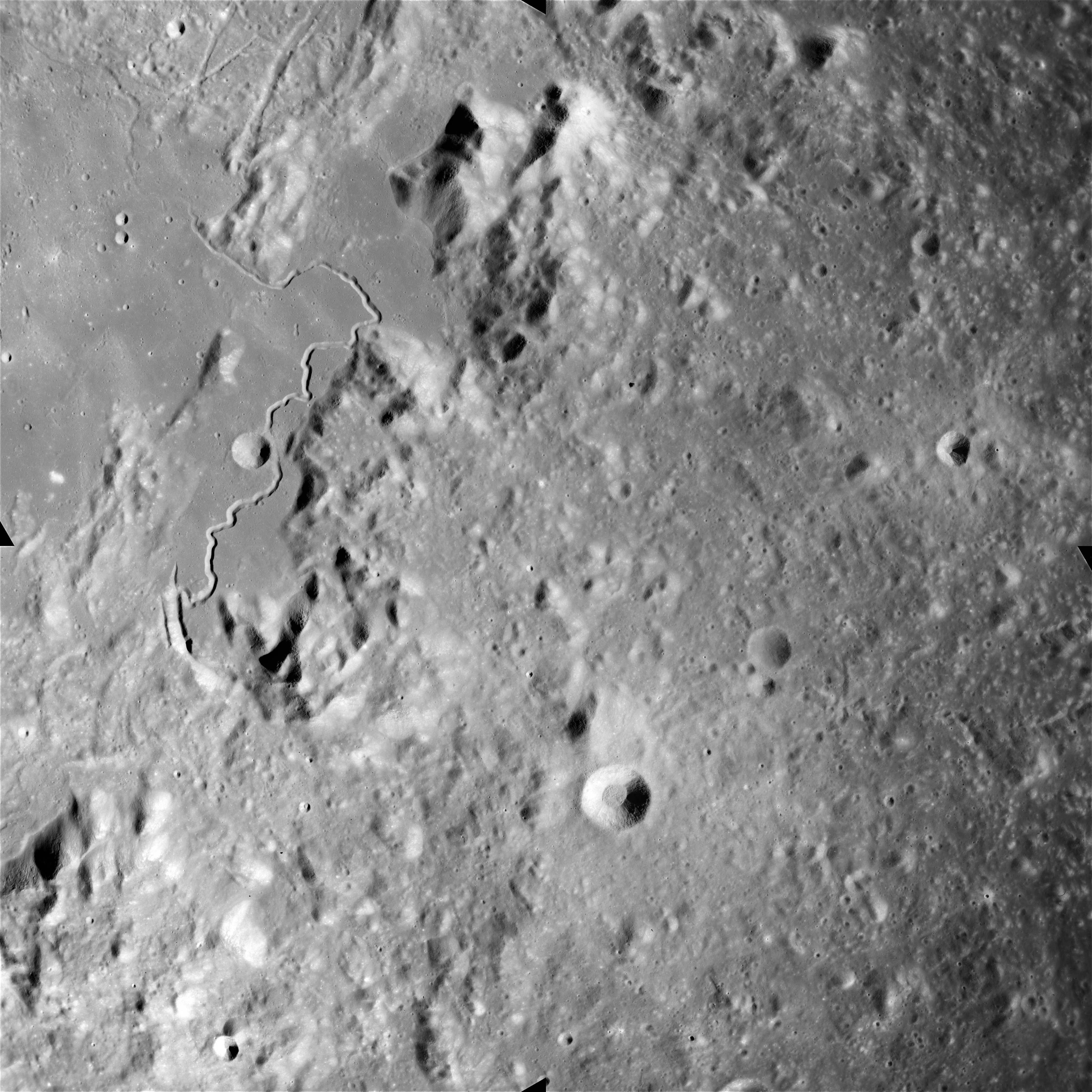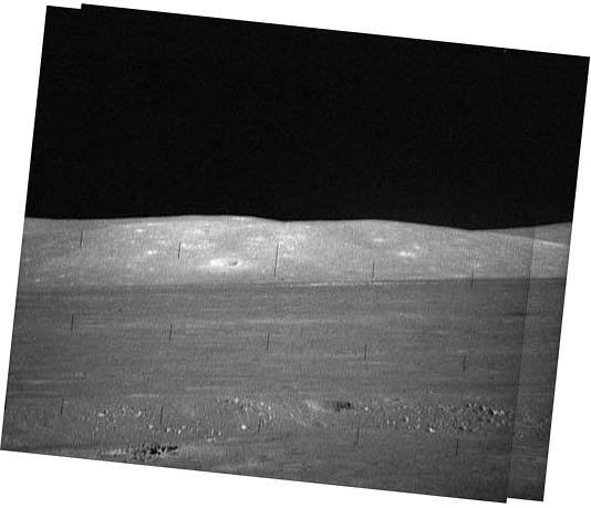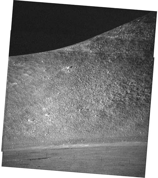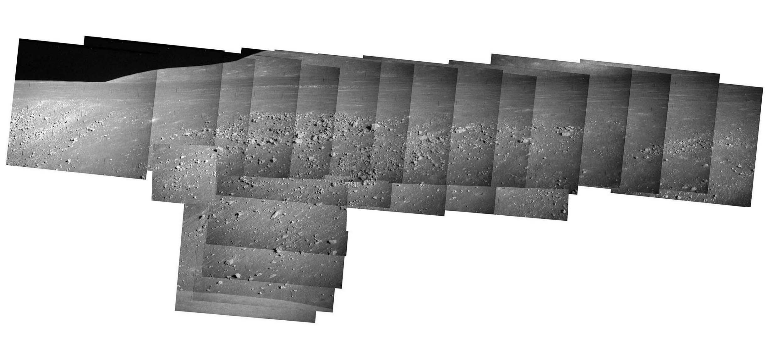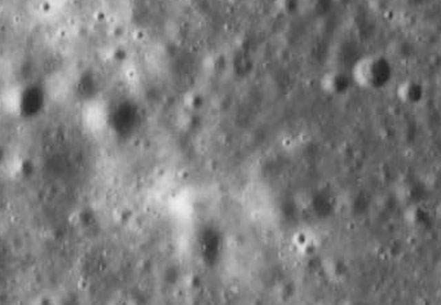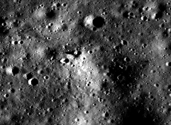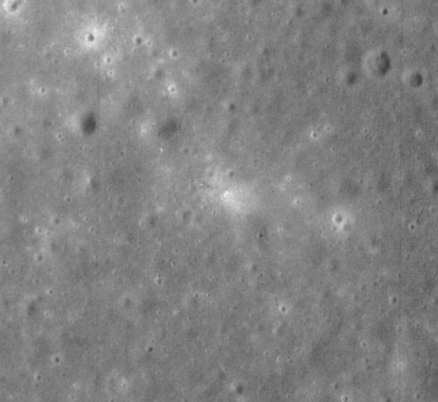 , Taken one orbit (2 hours) later than the previous image. The version linked here is a place holder, made from screen grabs at about one-third full resolution.18 May 2013 October 2009 12:37:02 UTC; image M1123519889LCandRC( combined); Solar El/Az 13.0/96.8; Full-image center Lat/Long 26.07/3.68; sub-LRO Lat/Long 26.12/4.73; LRO altitude 130 km, resolution 4.16/1/4 m/pixel ( 36 Mb )