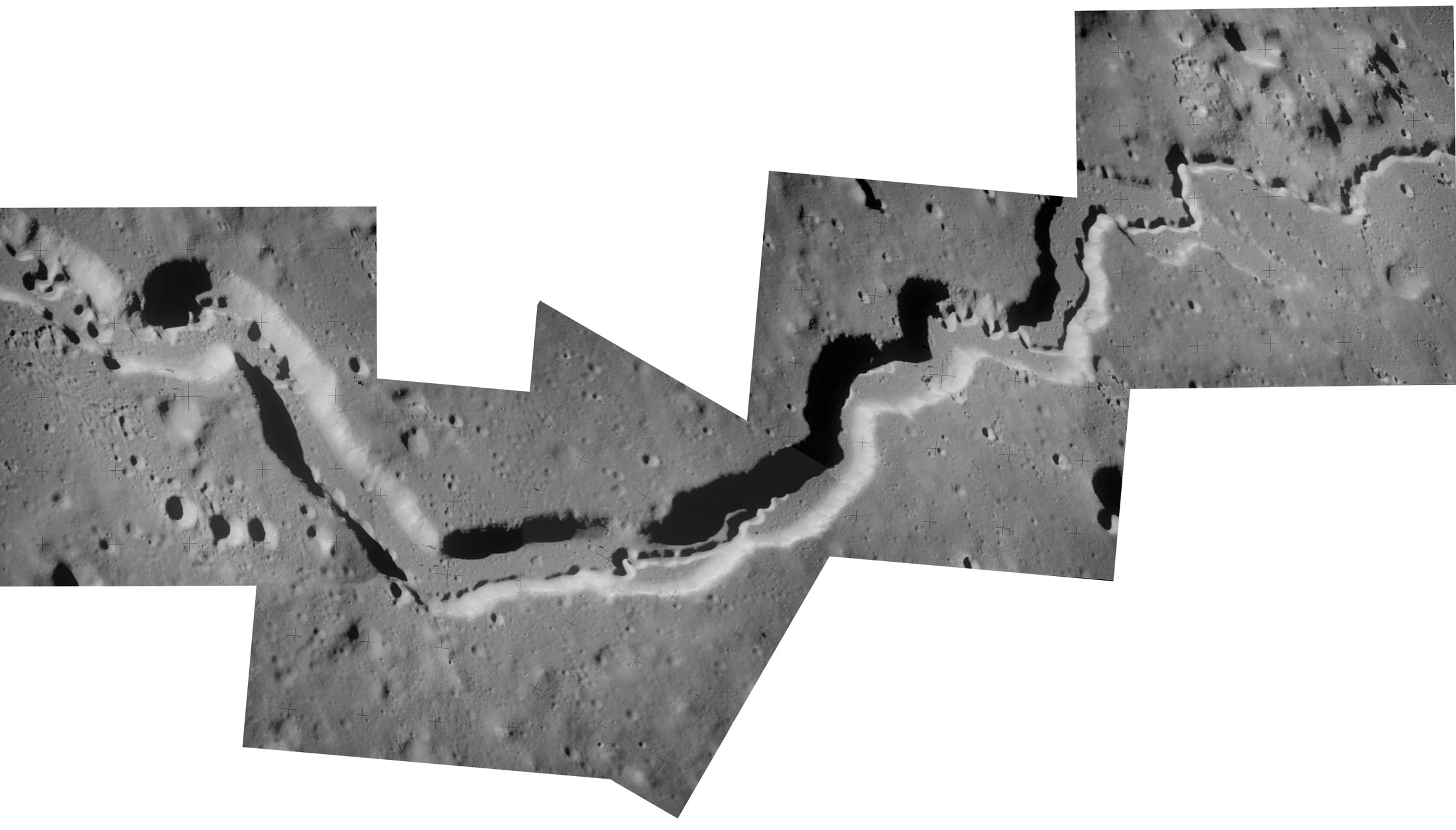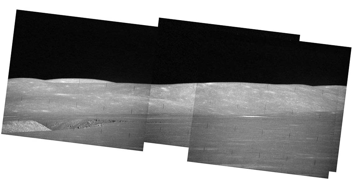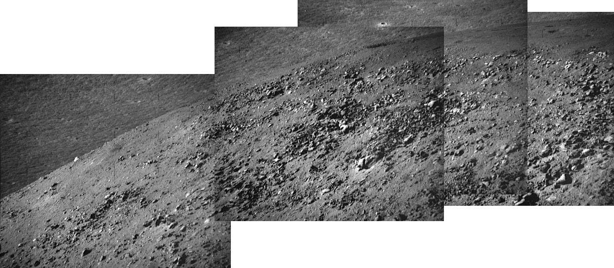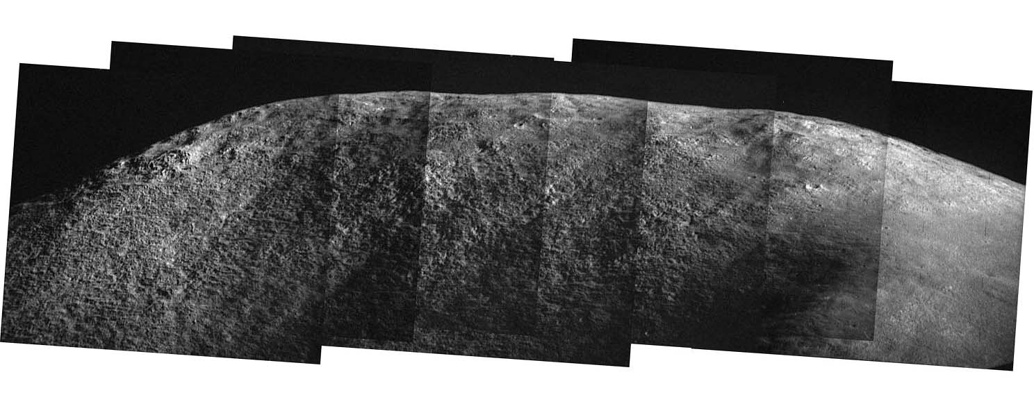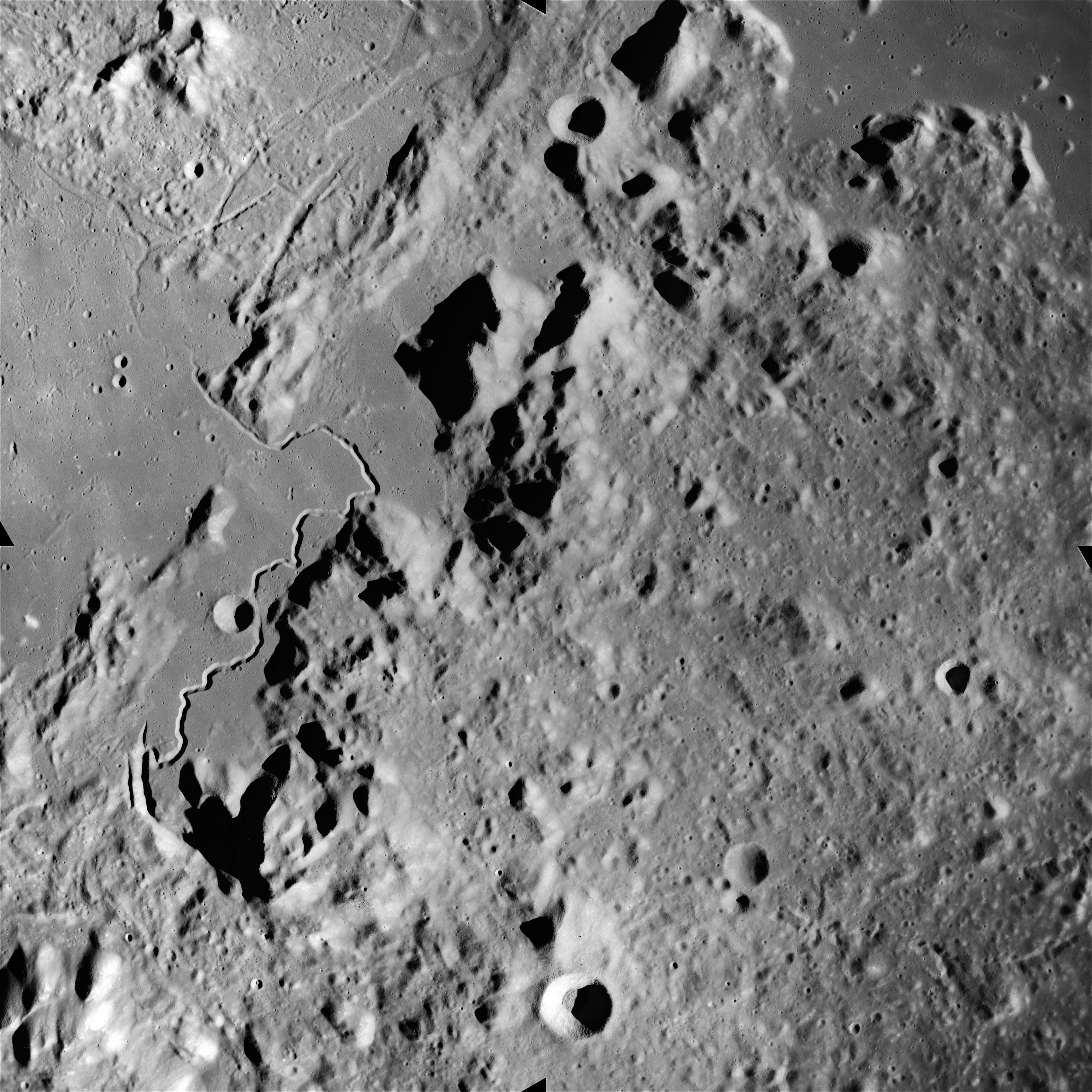 , Taken one orbit (2 hours) later than the previous image. The version linked here is a place holder, made from screen grabs at about one-third full resolution.18 May 2013 October 2009 12:37:02 UTC; image M1123519889LCandRC( combined); Solar El/Az 13.0/96.8; Full-image center Lat/Long 26.07/3.68; sub-LRO Lat/Long 26.12/4.73; LRO altitude 130 km, resolution 4.16/1/4 m/pixel ( 36 Mb )