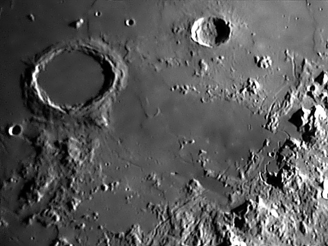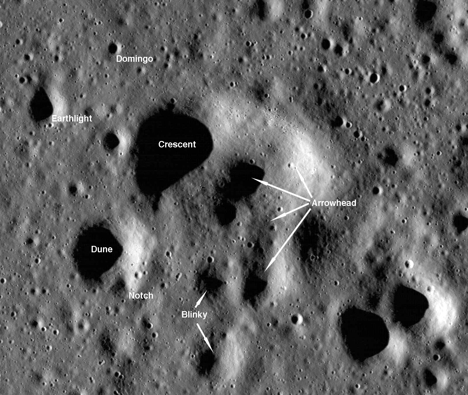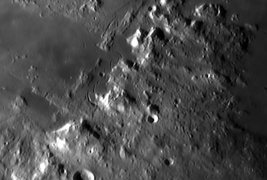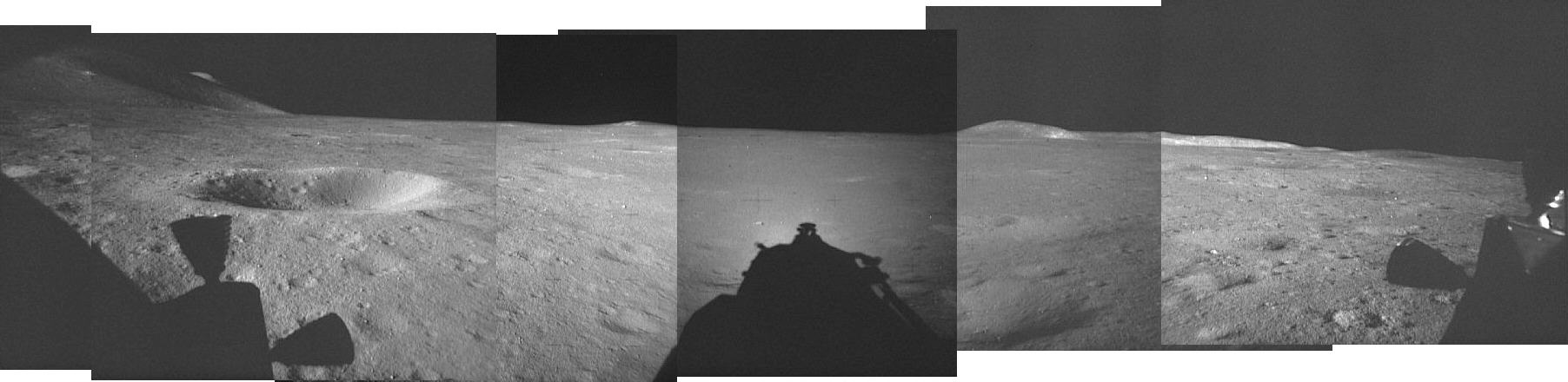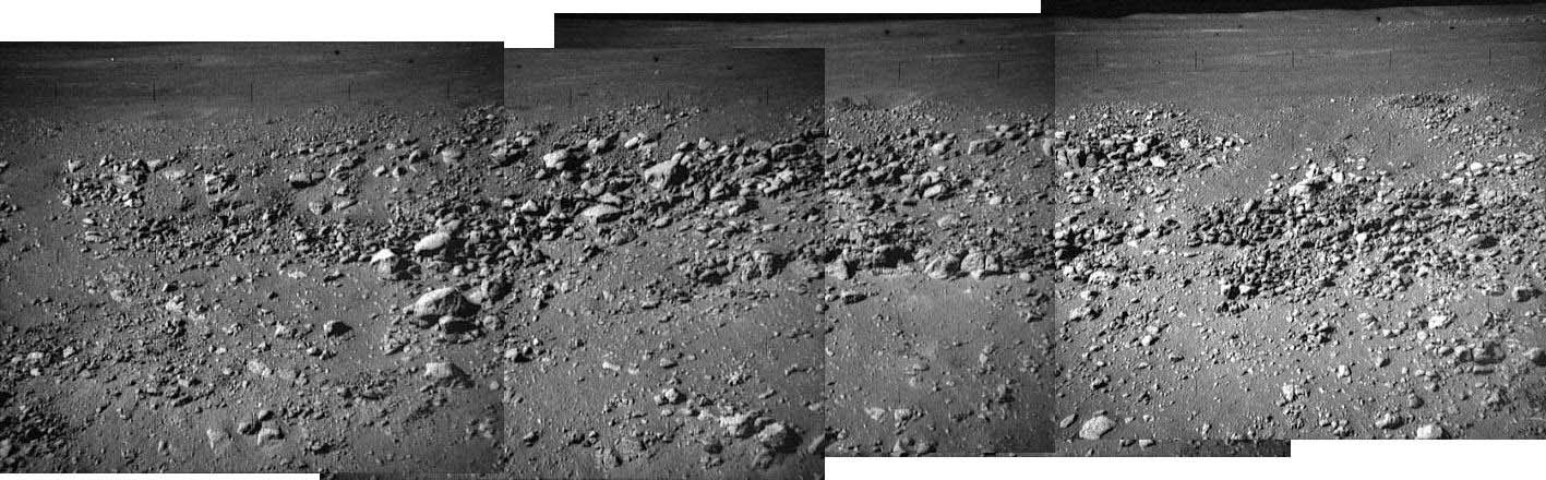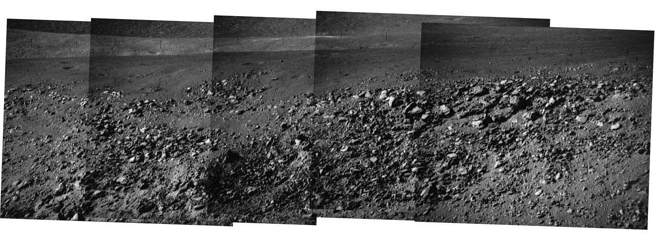 , Taken one orbit (2 hours) later than the previous image. The version linked here is a place holder, made from screen grabs at about one-third full resolution.18 May 2013 October 2009 12:37:02 UTC; image M1123519889LCandRC( combined); Solar El/Az 13.0/96.8; Full-image center Lat/Long 26.07/3.68; sub-LRO Lat/Long 26.12/4.73; LRO altitude 130 km, resolution 4.16/1/4 m/pixel ( 36 Mb )