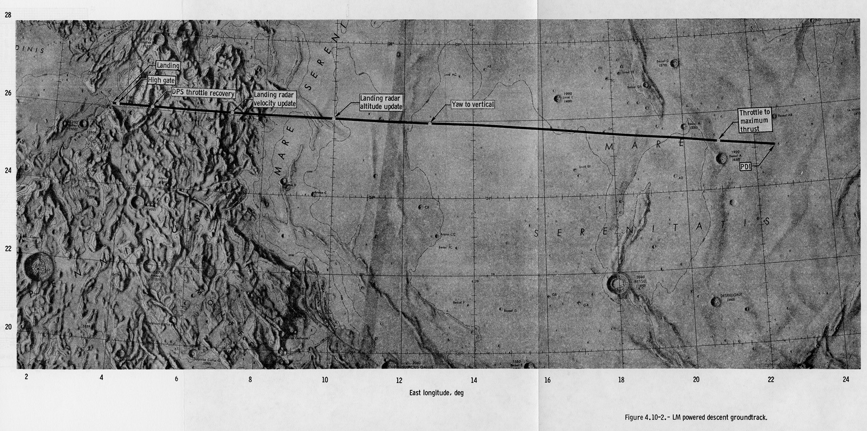 Ground Track from PDI to Landing. Figure 4.10-2 from 'Spacecraft Operational Trajectory for Apollo 15 (Mission J-1) Launched July 26, 1971 Volume I - Mission Profile' aka 'MSC Internal Note No. 71-FM-130 - April 16, 1971'. Scan courtesy Stephen Tellier.Apollo 15 Named Features ( 605k )