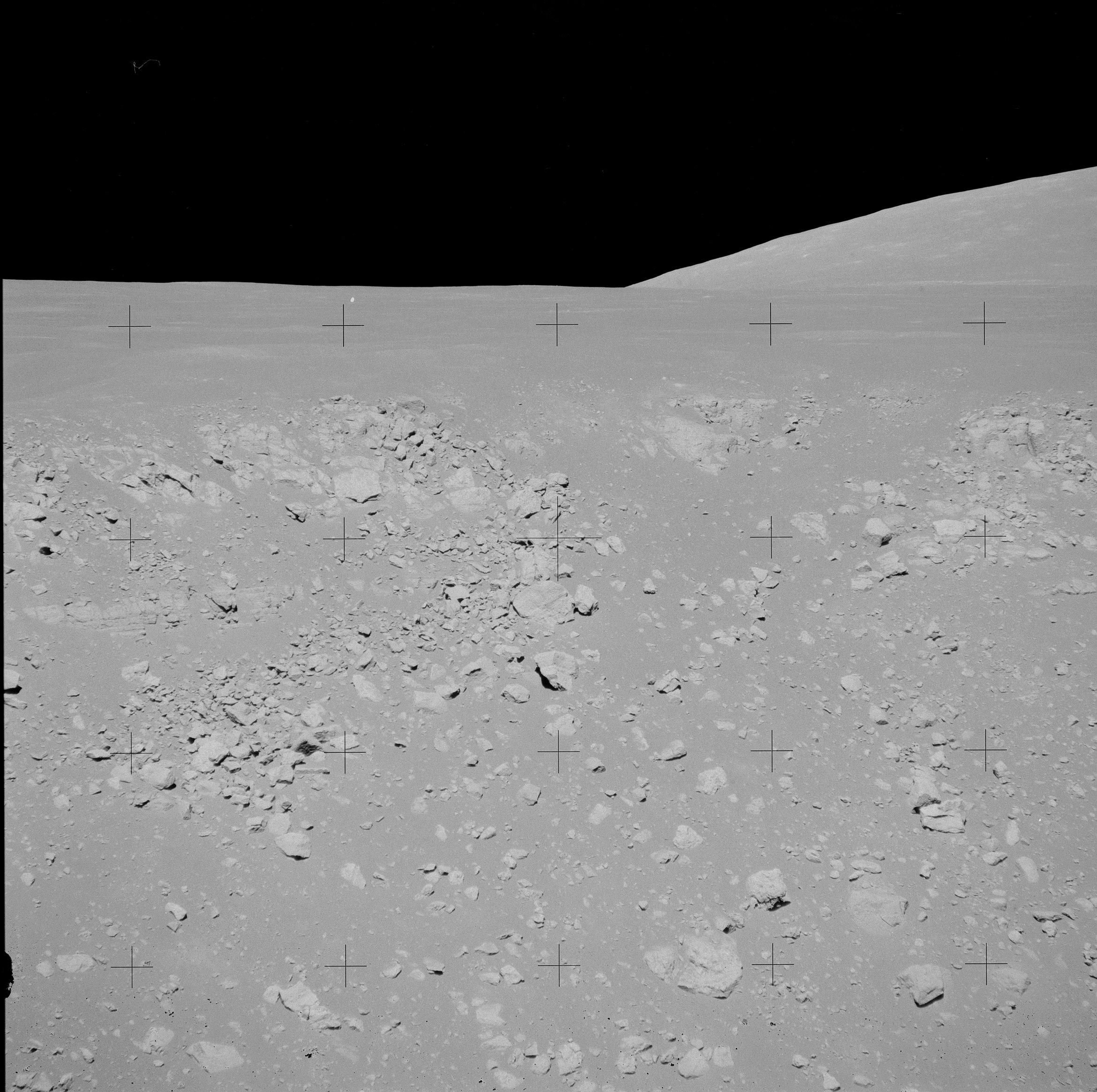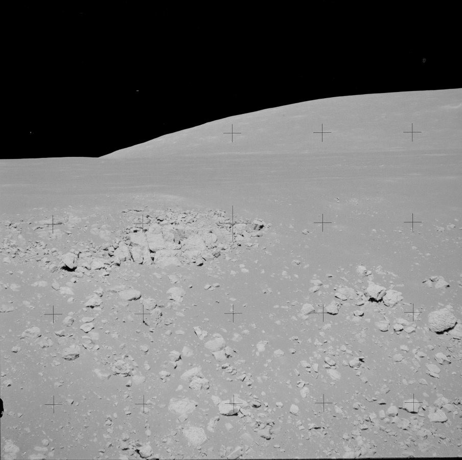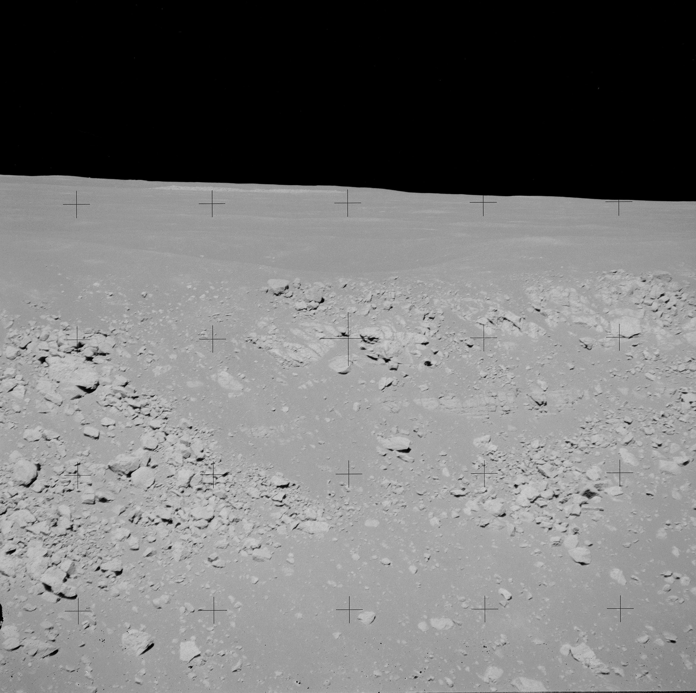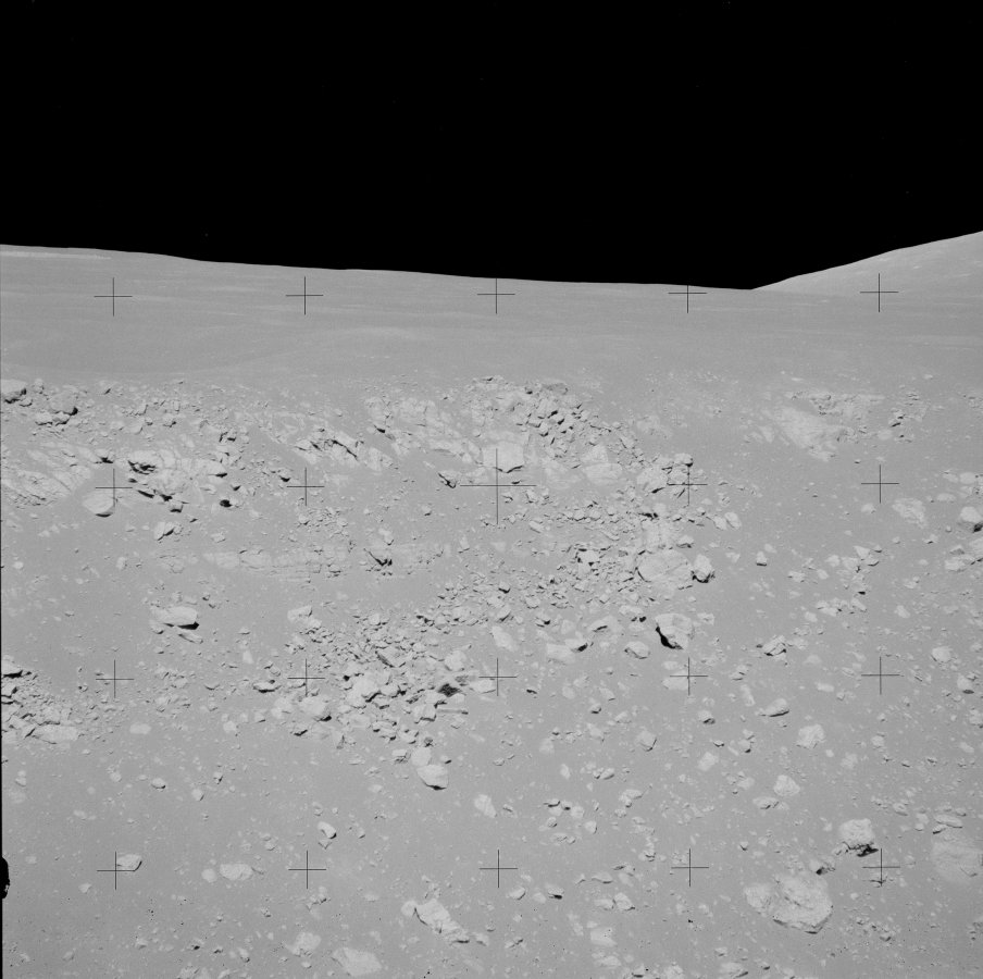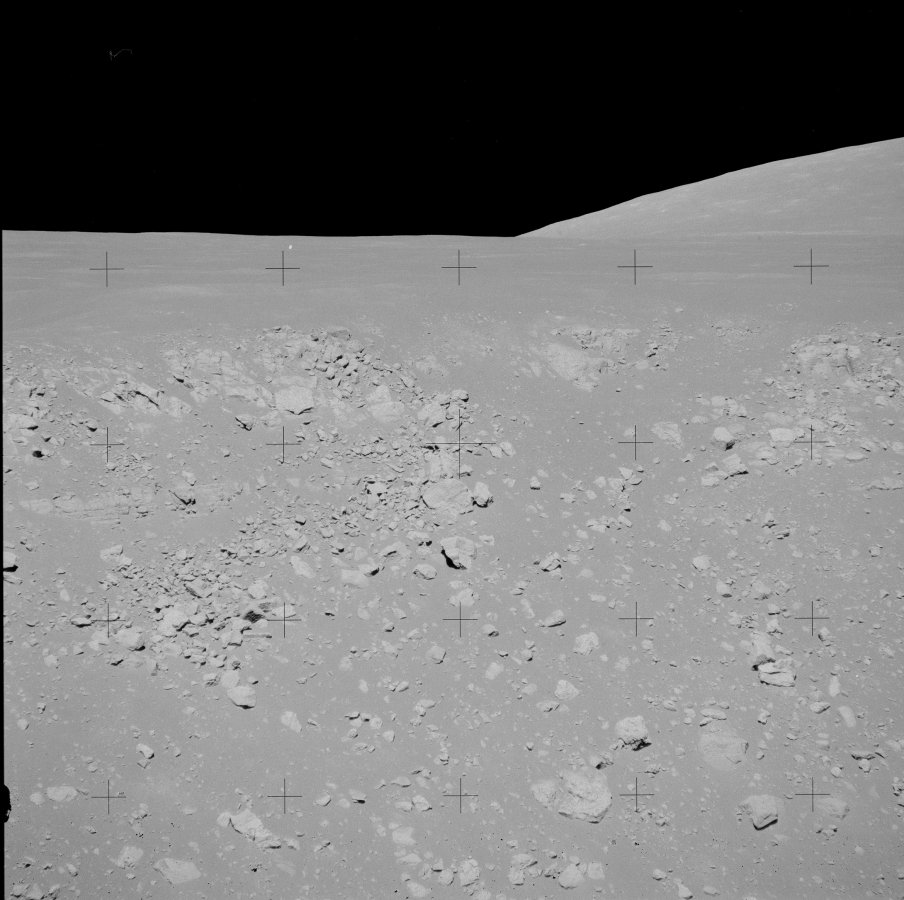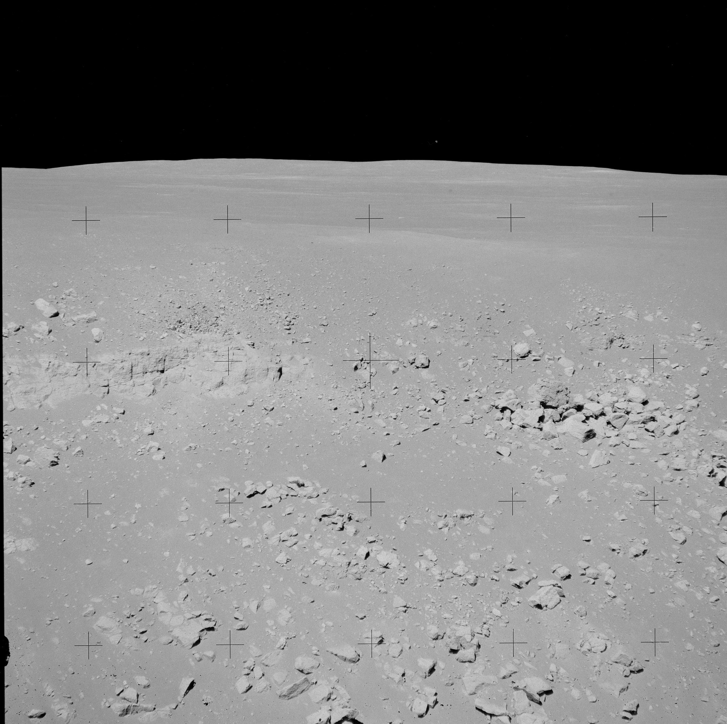 This picture was taken from the LM during CSM Rev 13 on the last pass over the landing site prior to the descent. A labeled version shows some of the prominent landmarks.Rev 16 Mapping (Metric) Camera Frame 0414 ( 13 Mb )