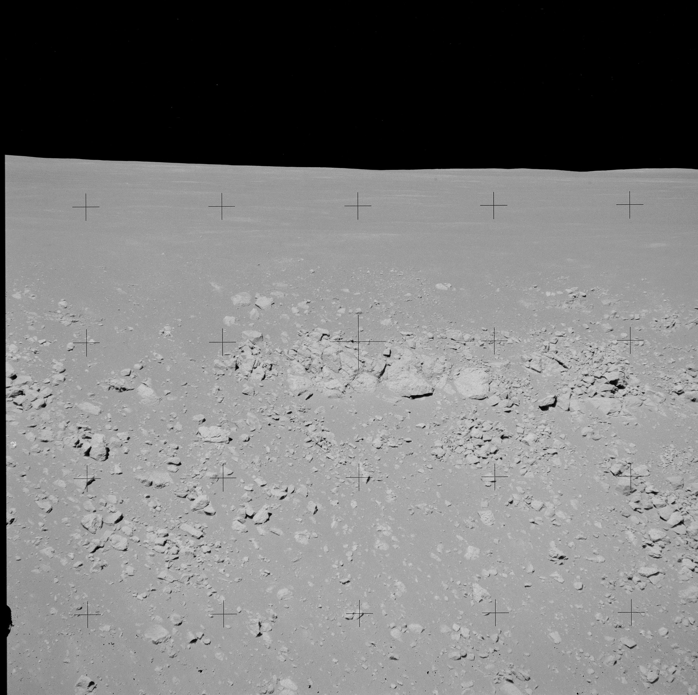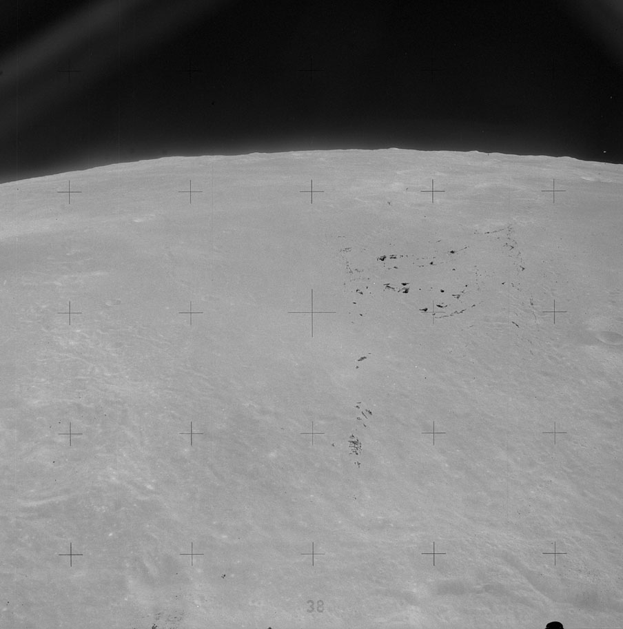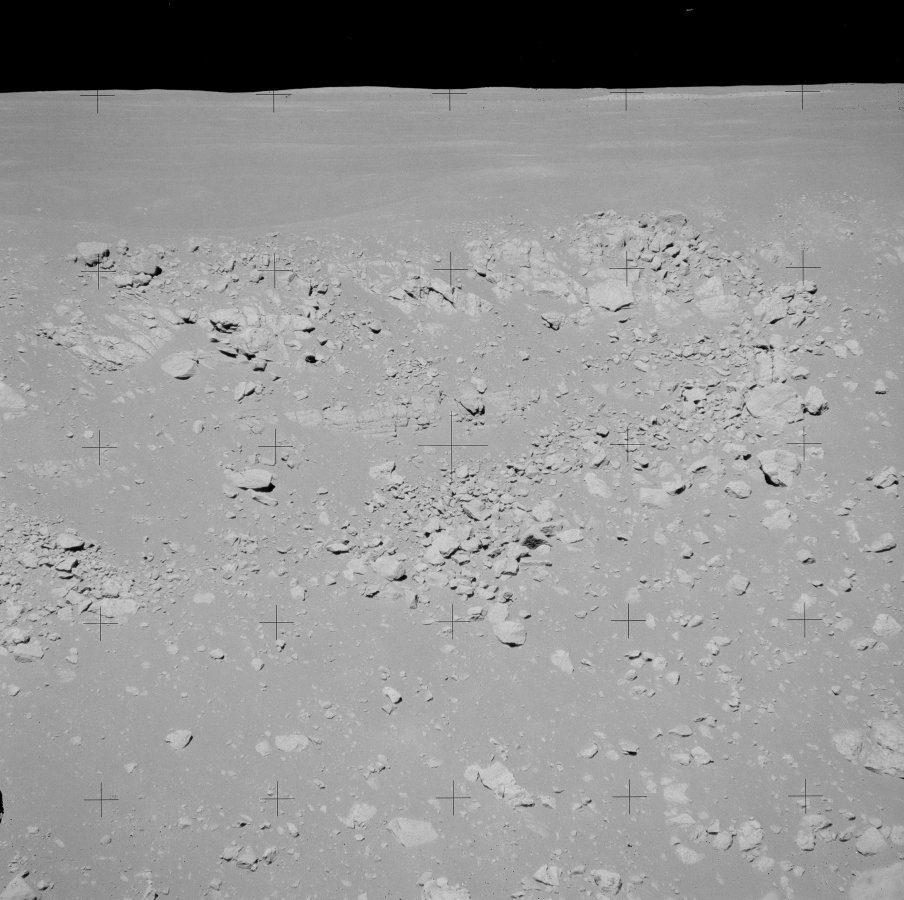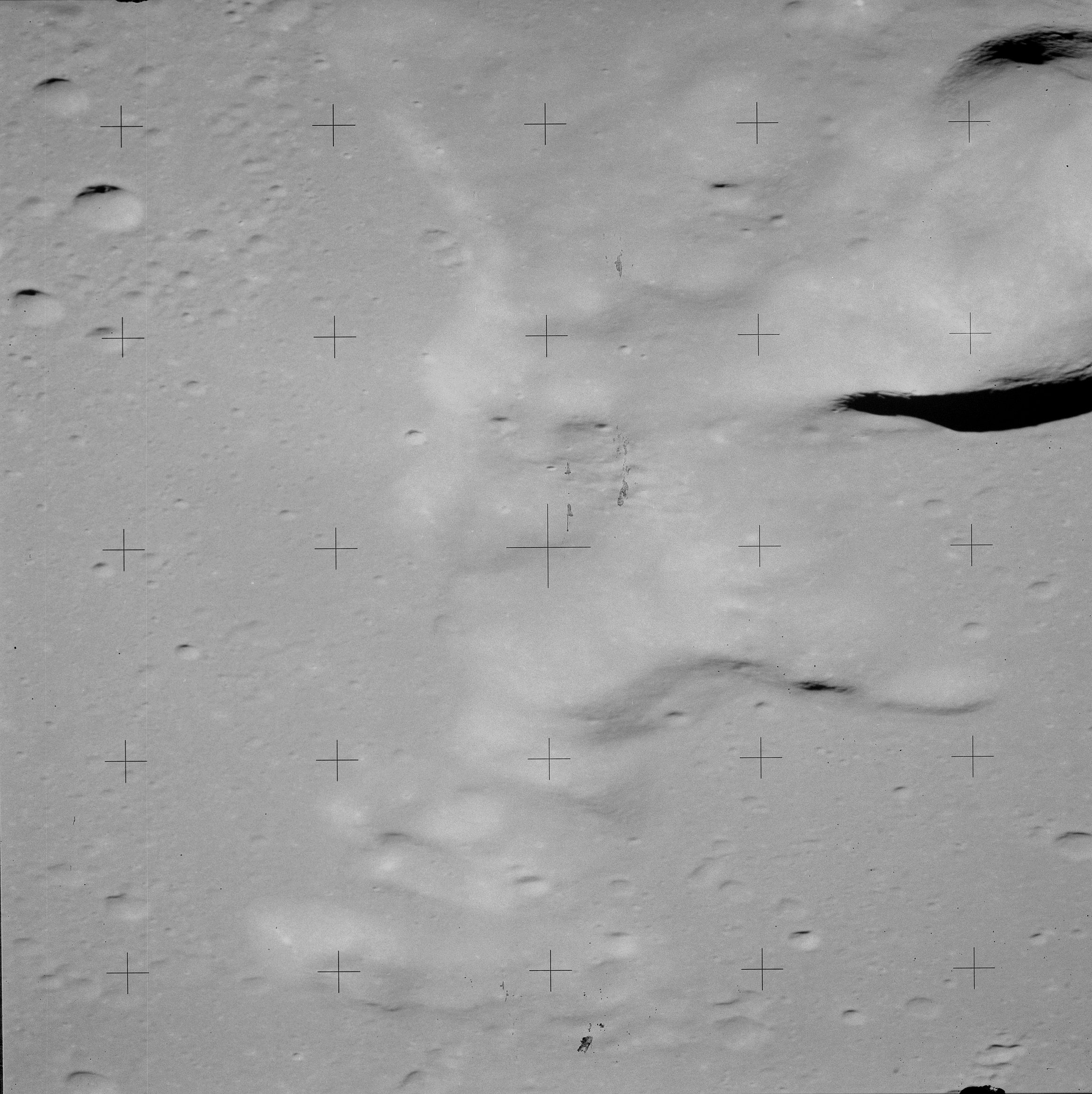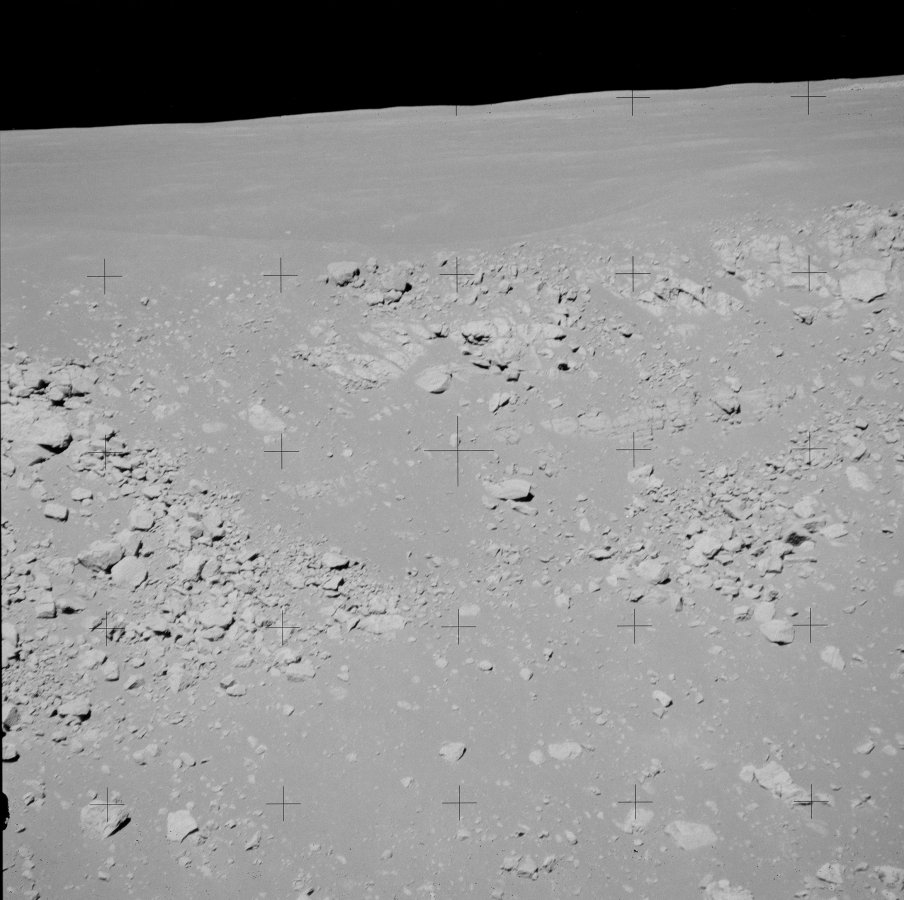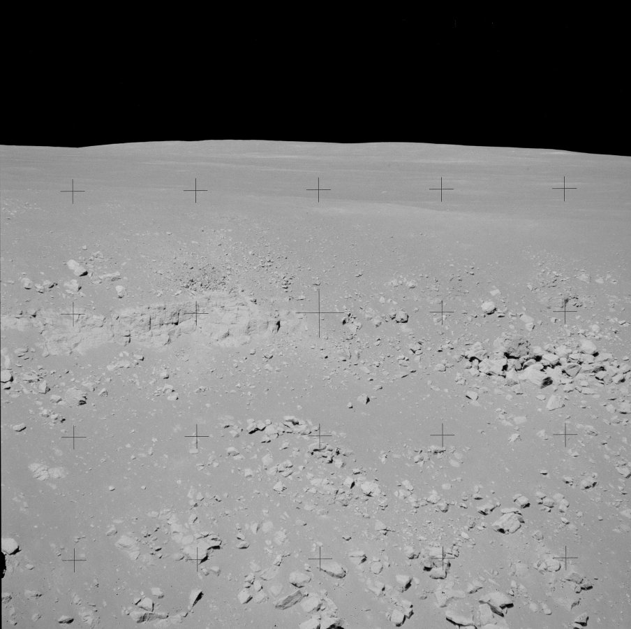This picture was taken from the LM during CSM Rev 13 on the last pass over the landing site prior to the descent. A labeled version shows some of the prominent landmarks.Rev 16 Mapping (Metric) Camera Frame 0414 ( 13 Mb )