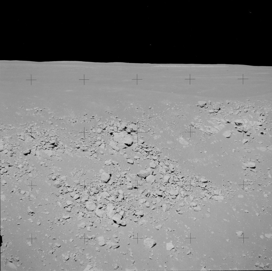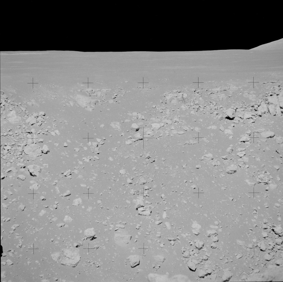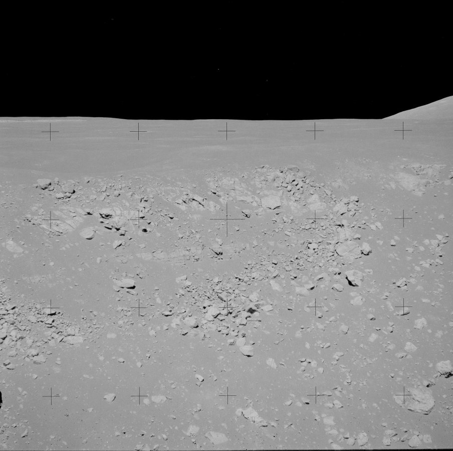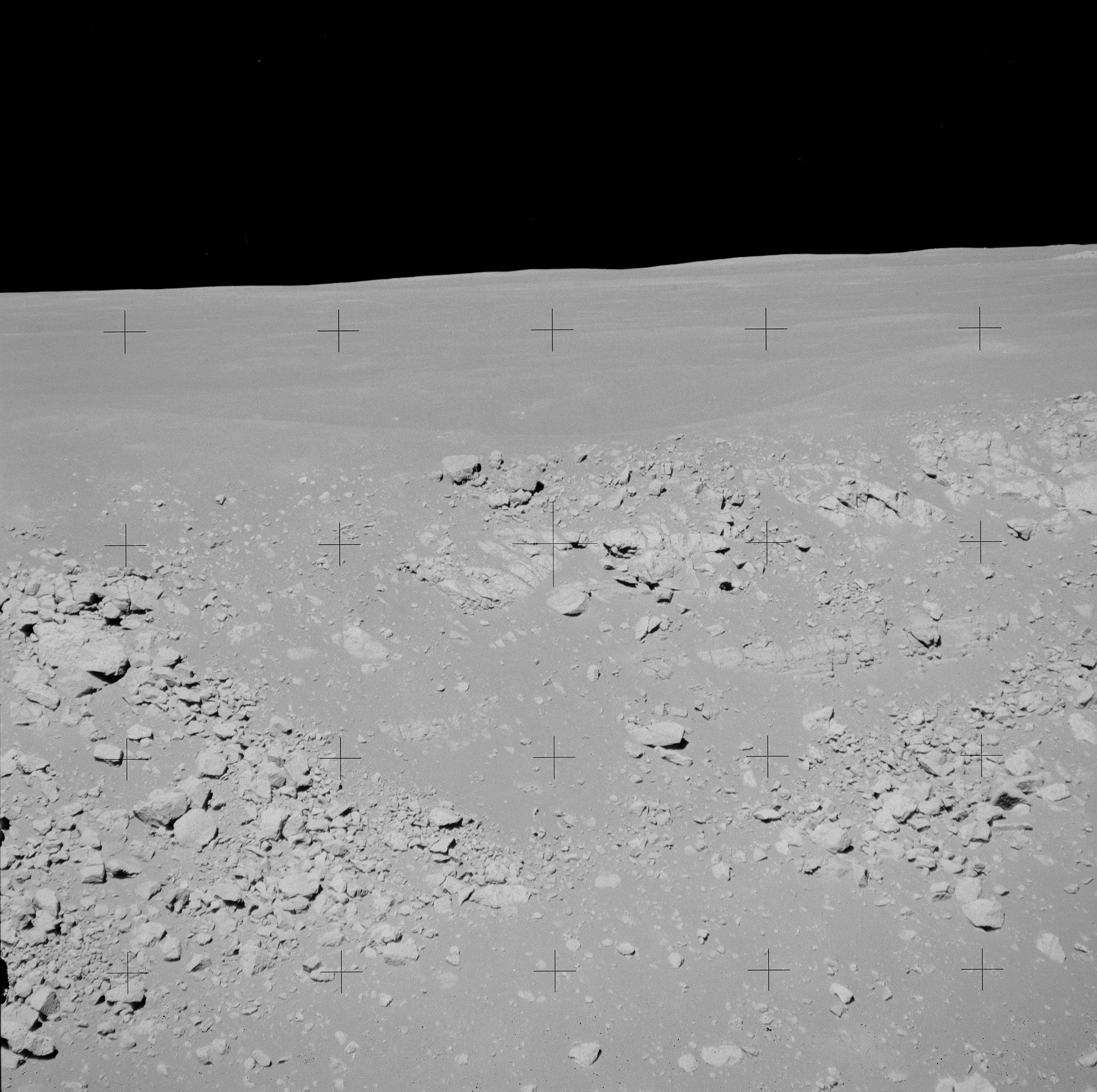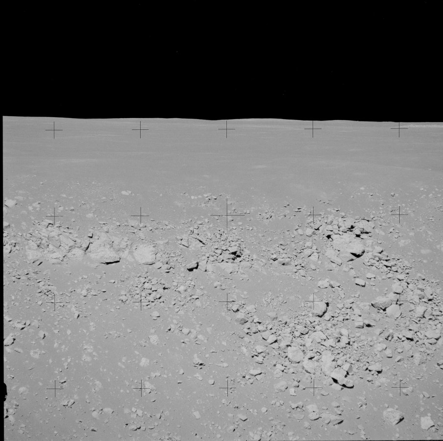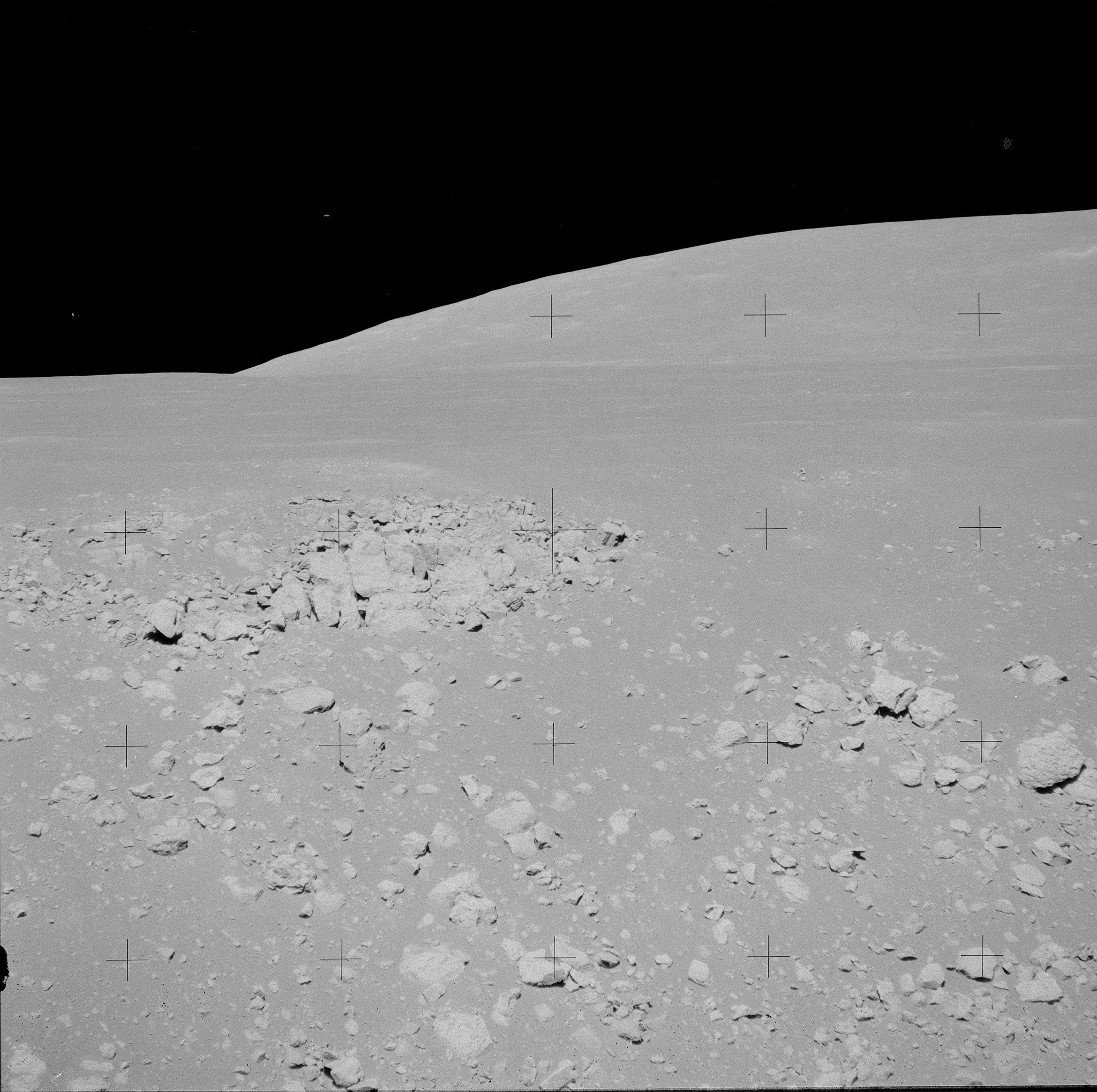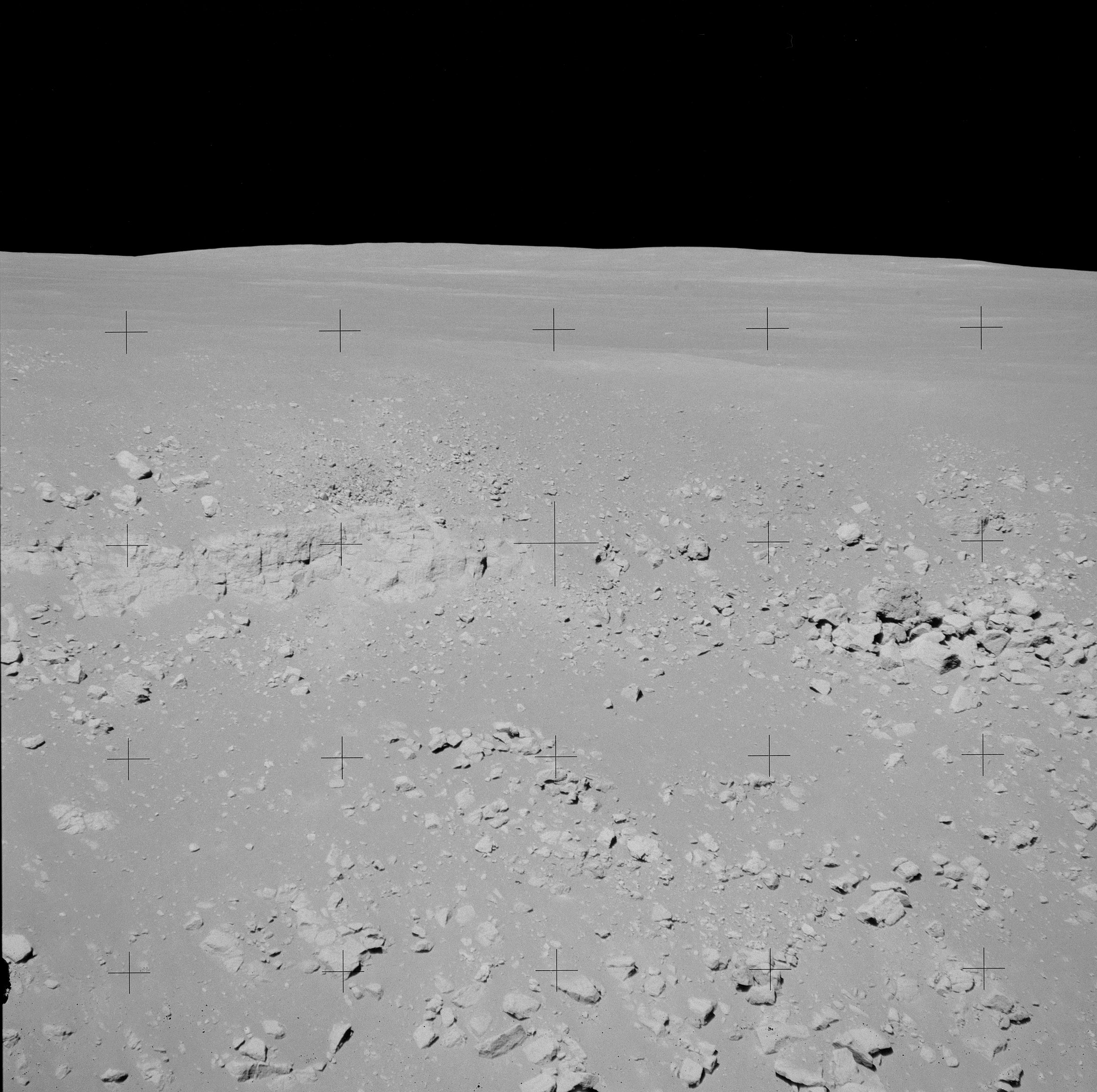 This picture was taken from the LM during CSM Rev 13 on the last pass over the landing site prior to the descent. A labeled version shows some of the prominent landmarks.Rev 16 Mapping (Metric) Camera Frame 0414 ( 13 Mb )