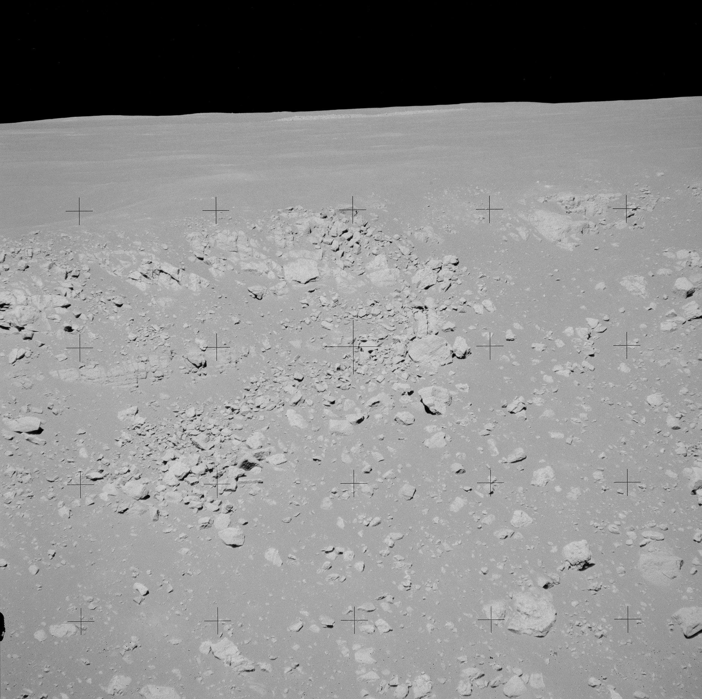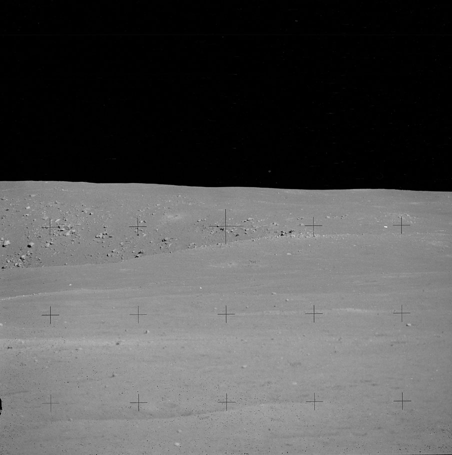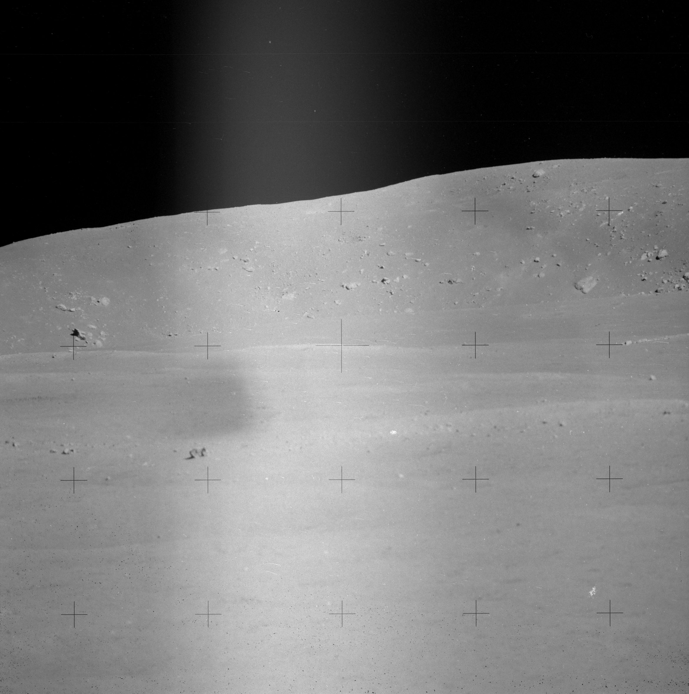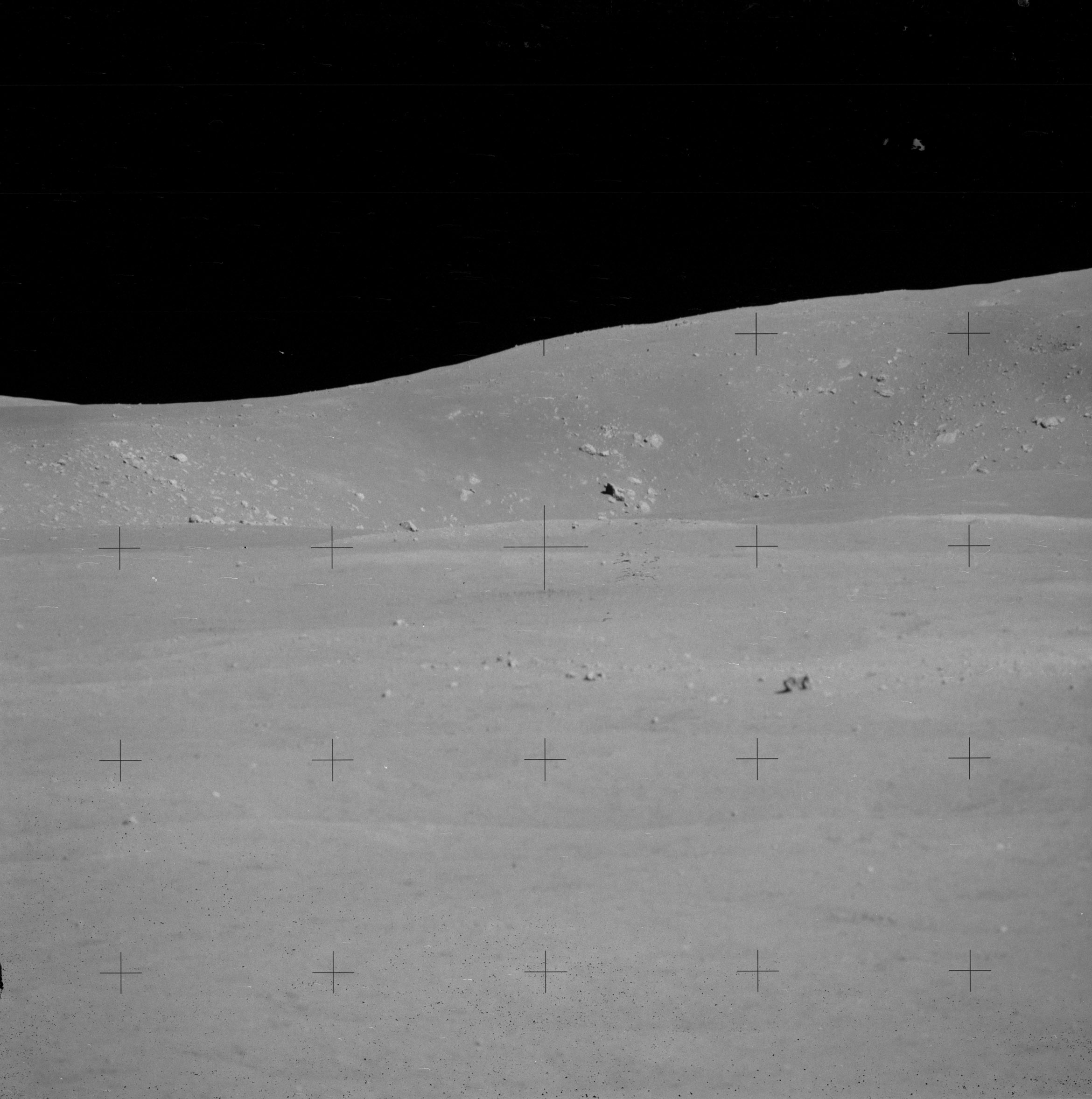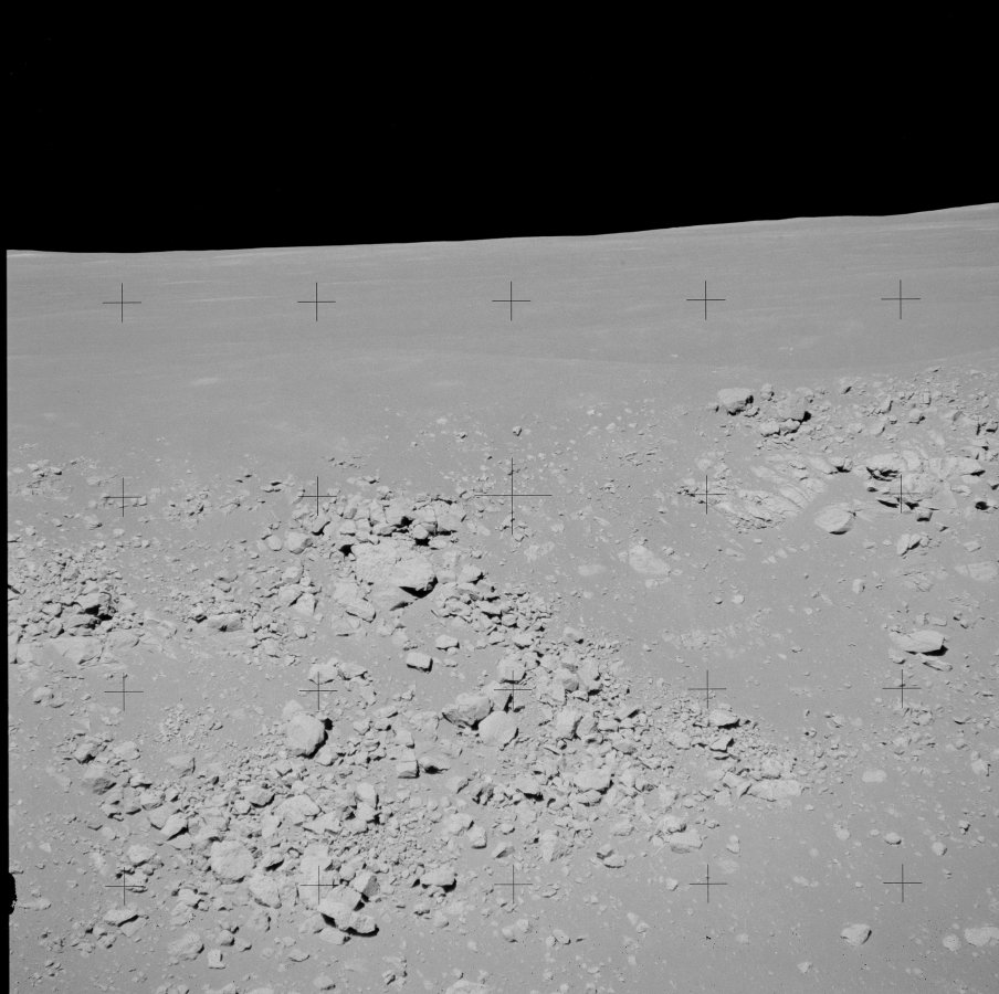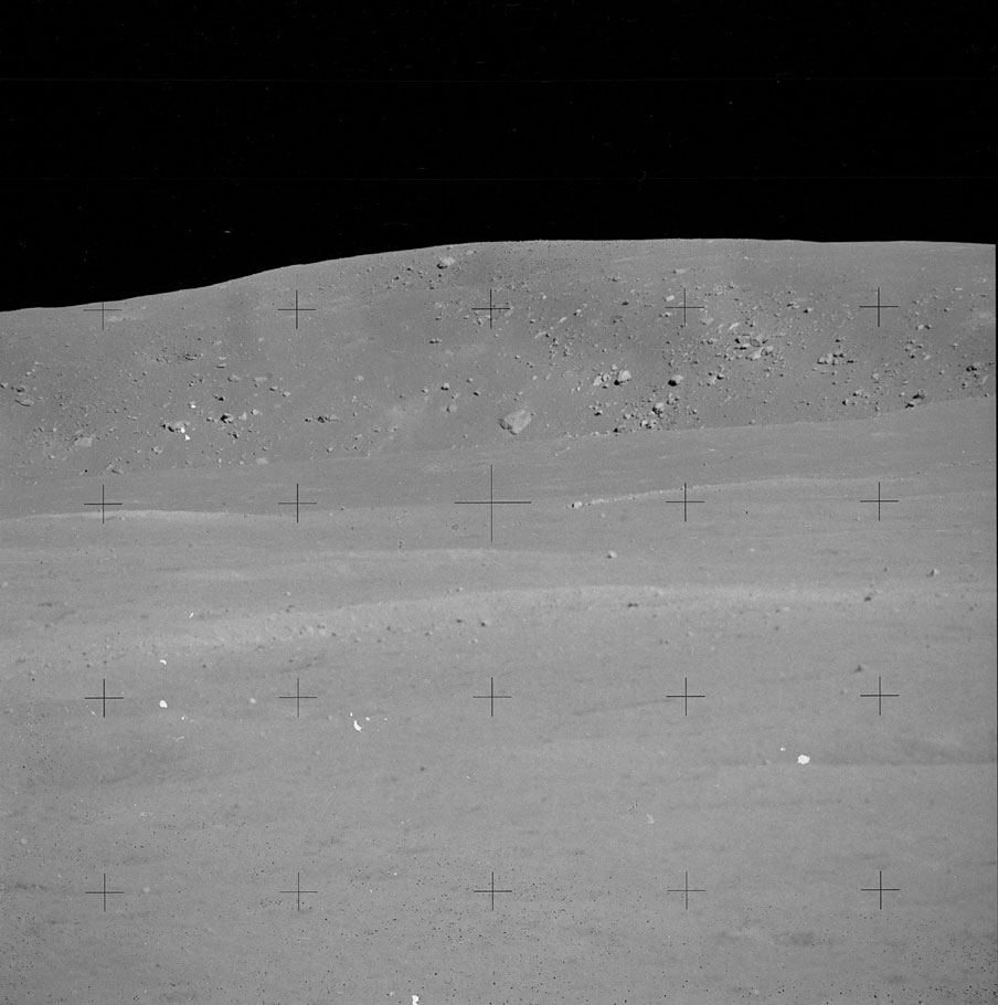 This picture was taken from the LM during CSM Rev 13 on the last pass over the landing site prior to the descent. A labeled version shows some of the prominent landmarks.Rev 16 Mapping (Metric) Camera Frame 0414 ( 13 Mb )