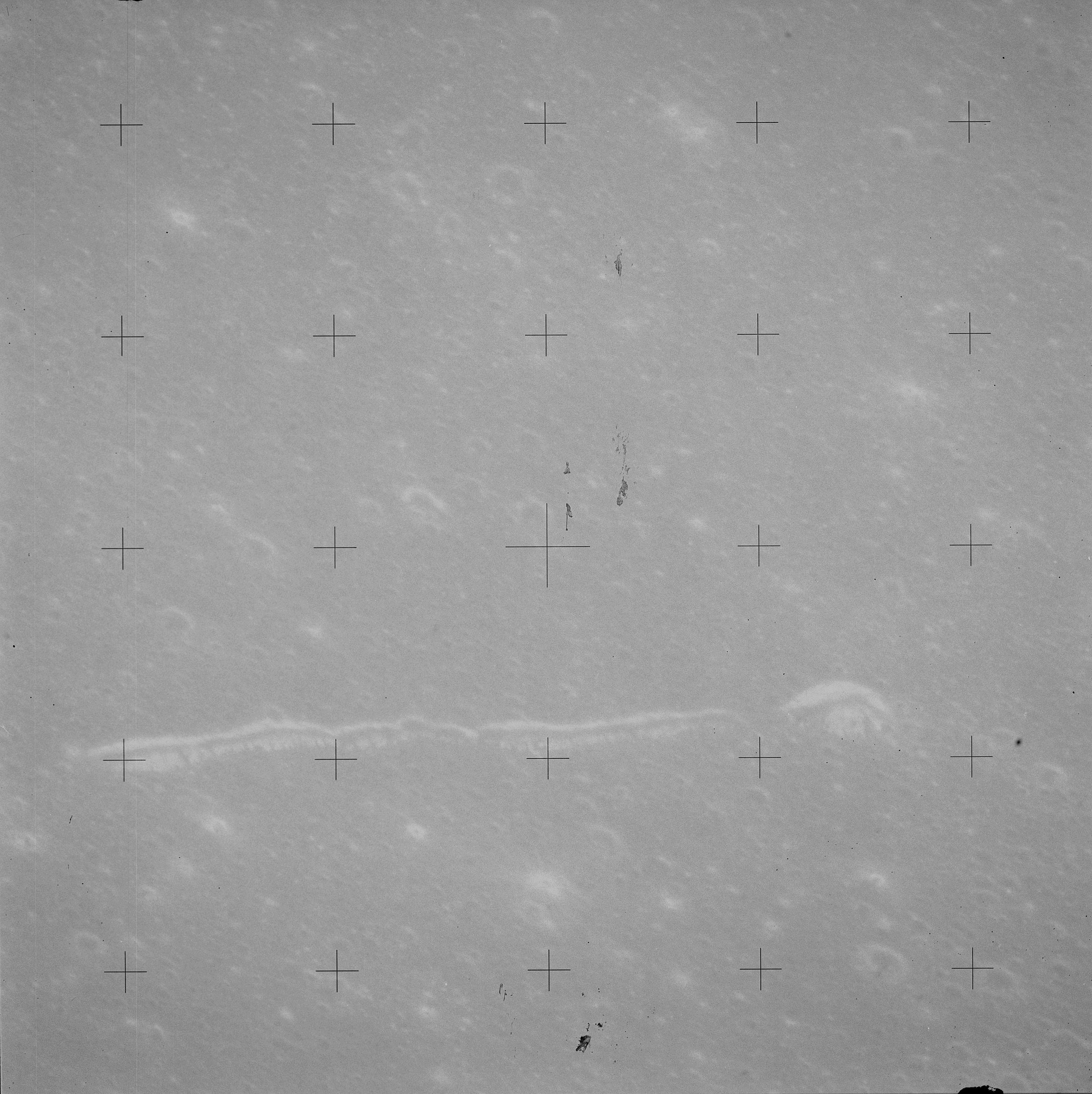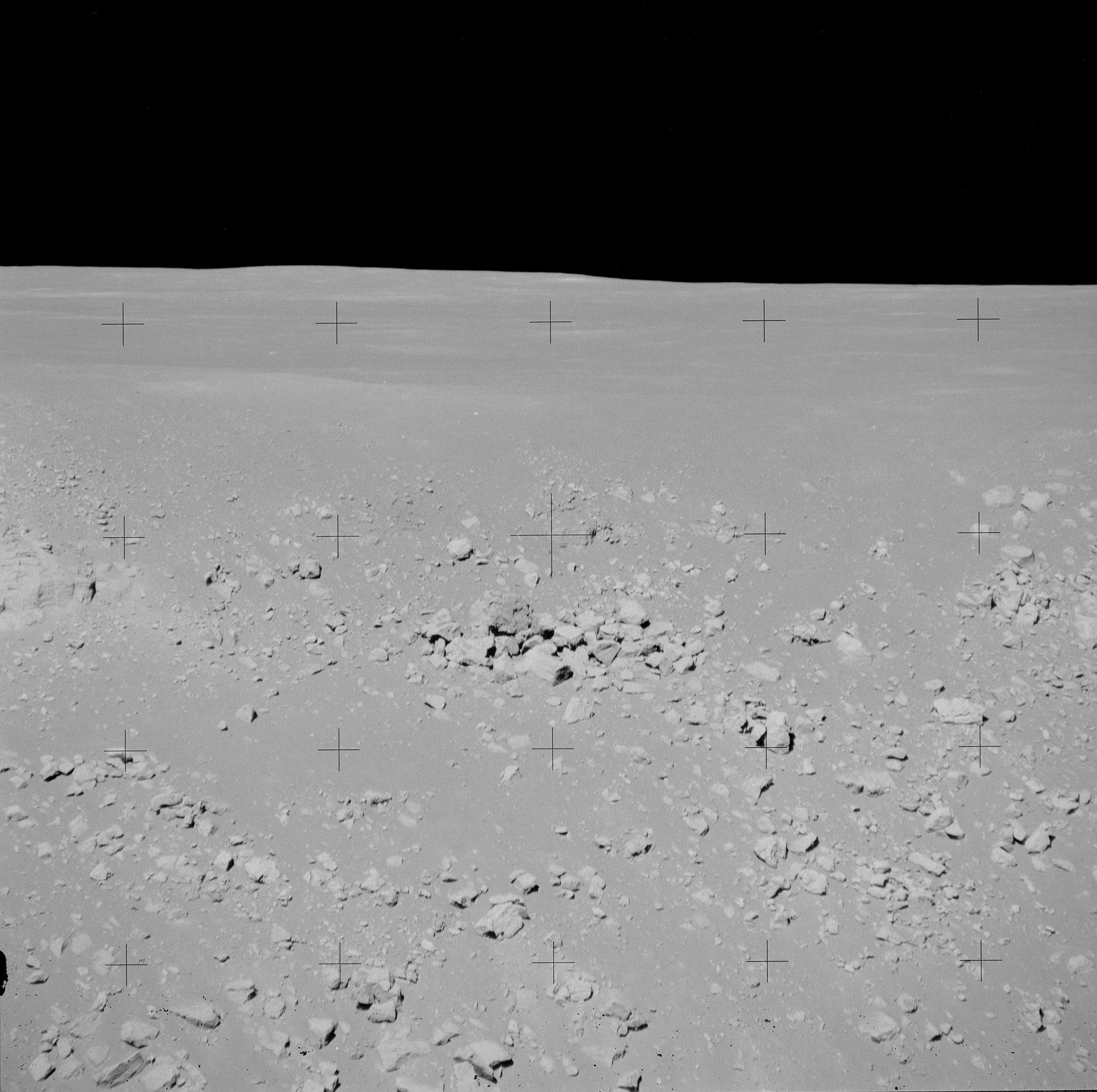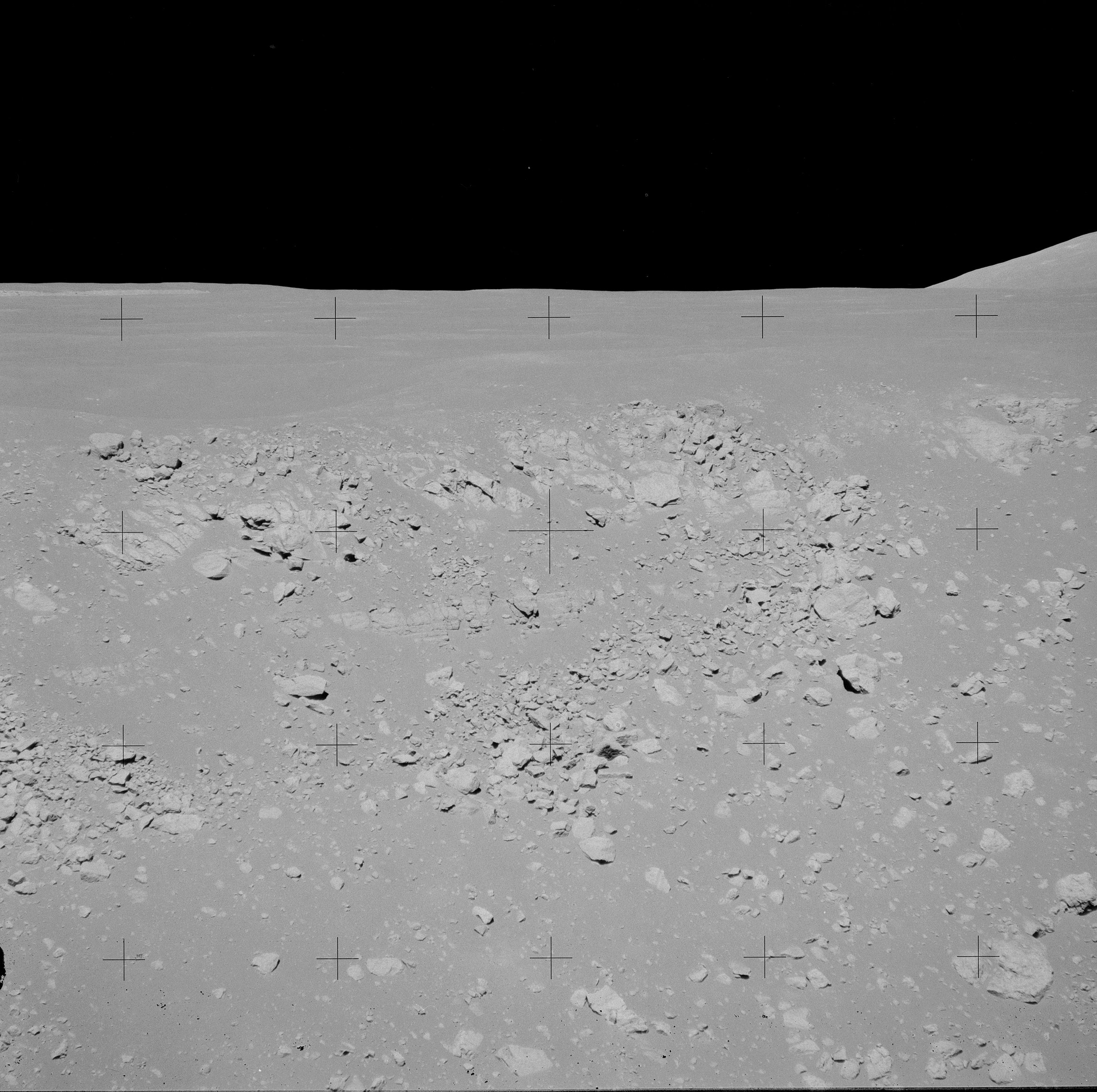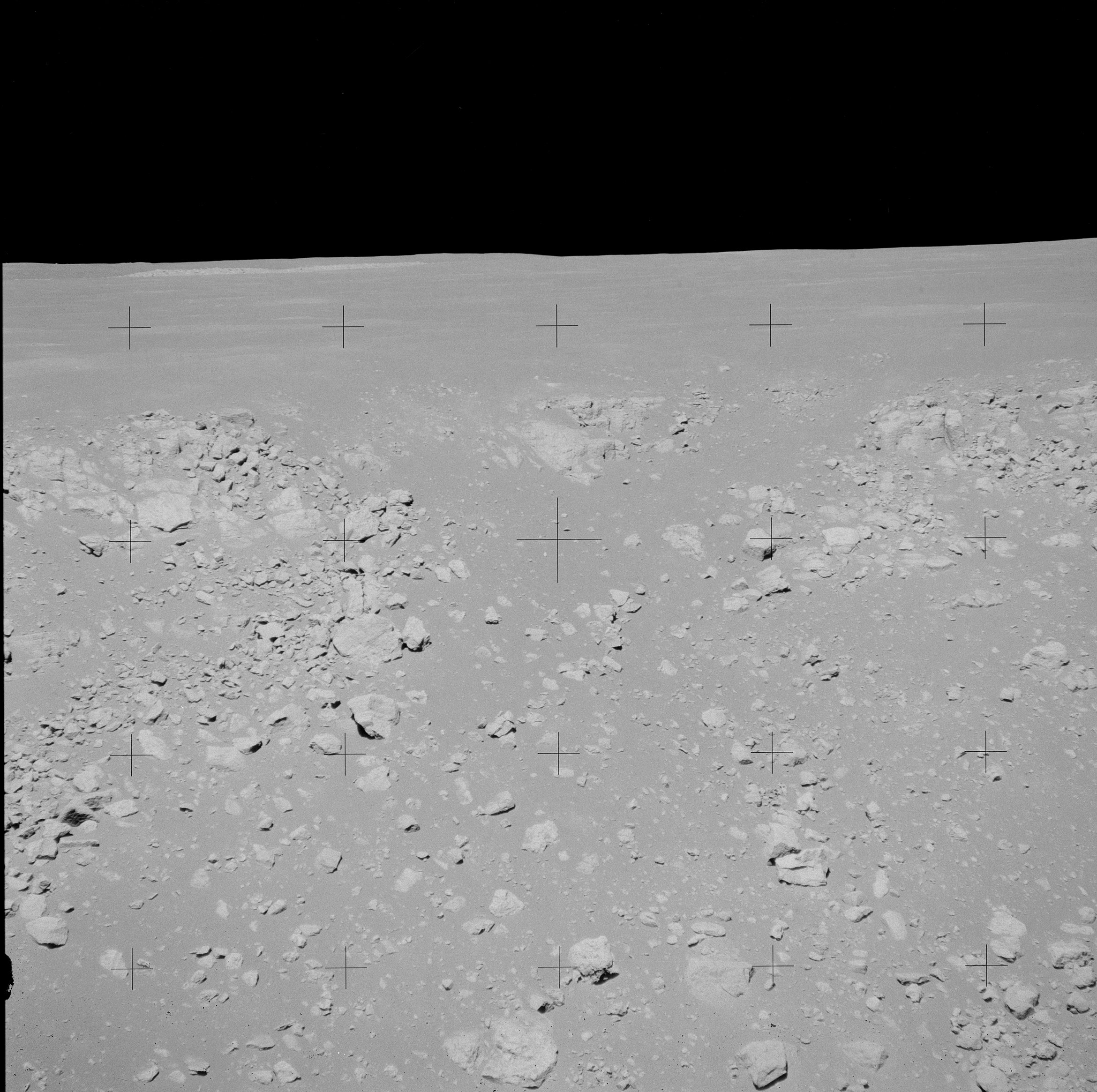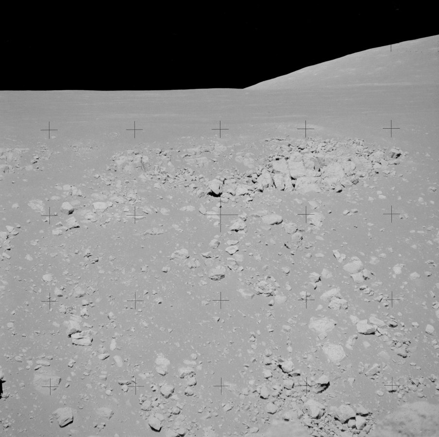 This picture was taken from the LM during CSM Rev 13 on the last pass over the landing site prior to the descent. A labeled version shows some of the prominent landmarks.Rev 16 Mapping (Metric) Camera Frame 0414 ( 13 Mb )