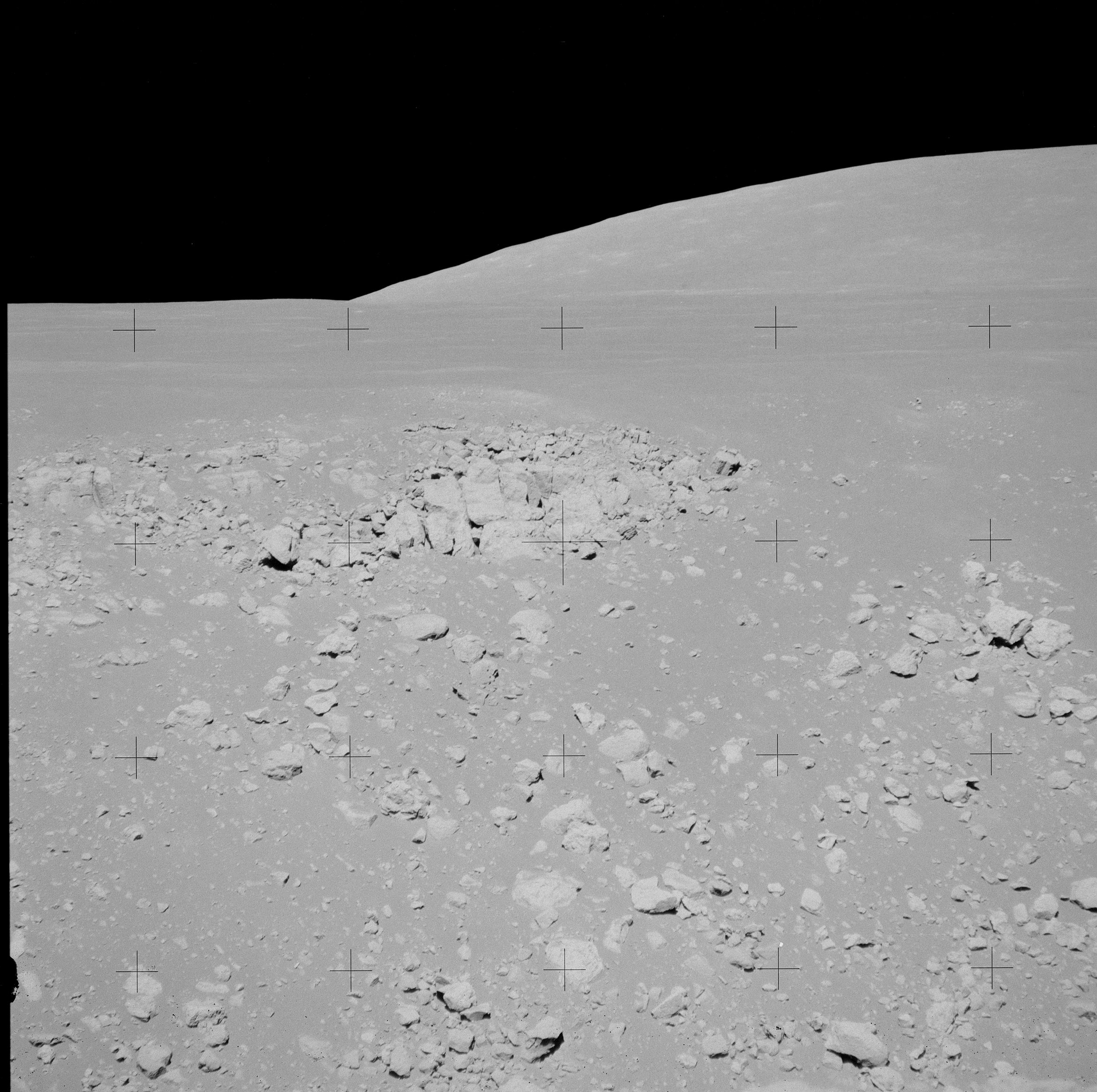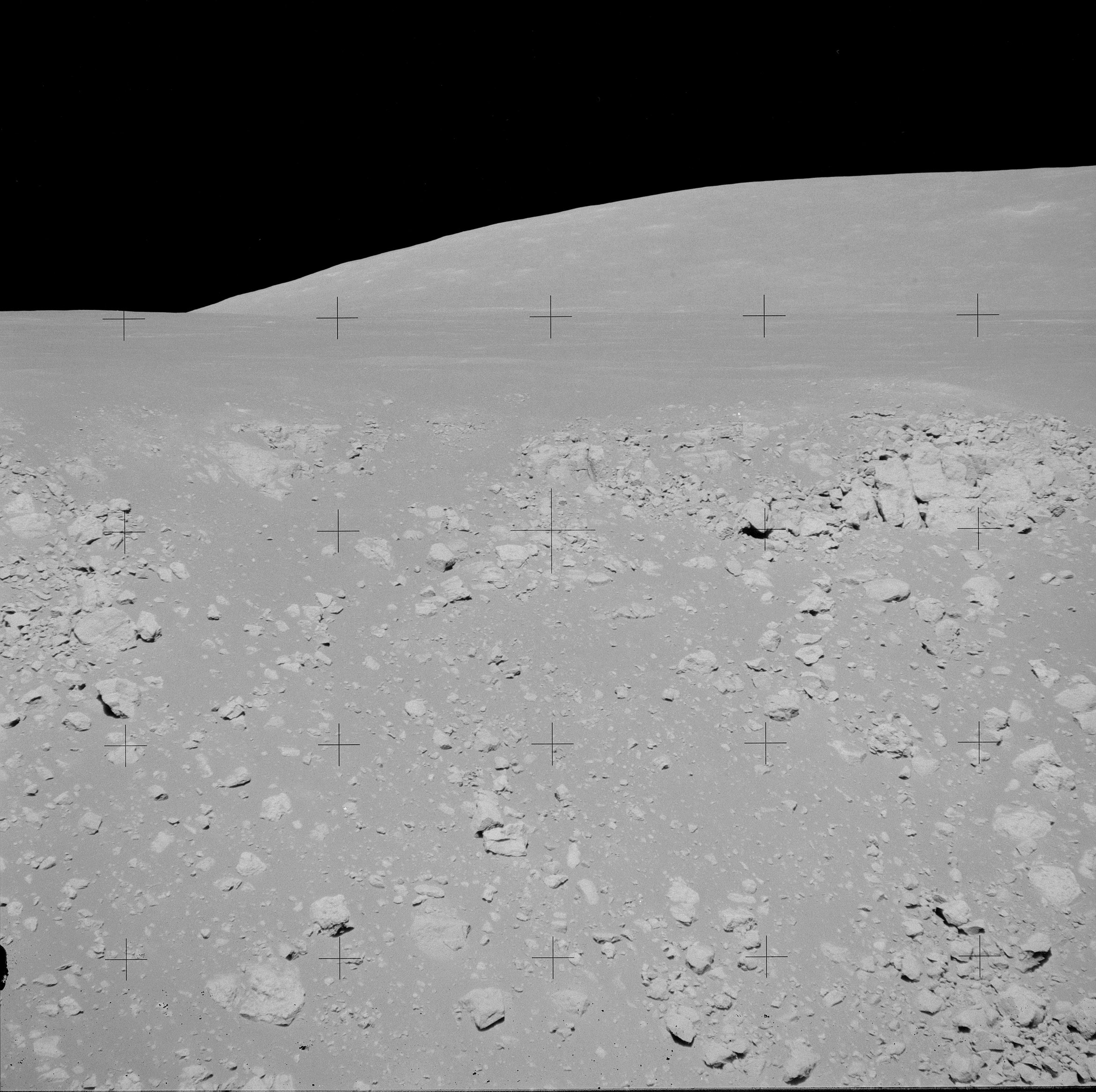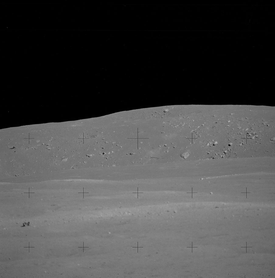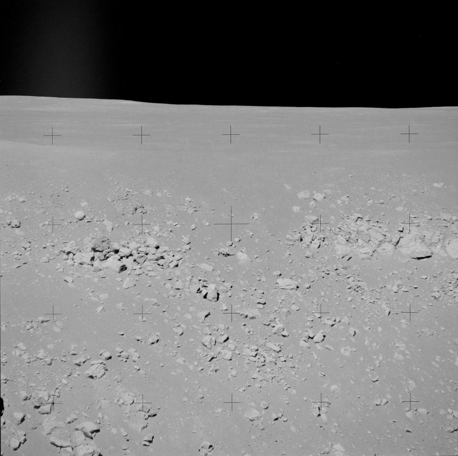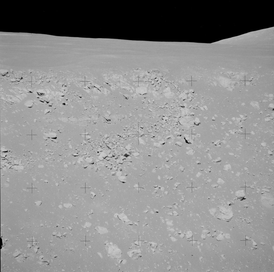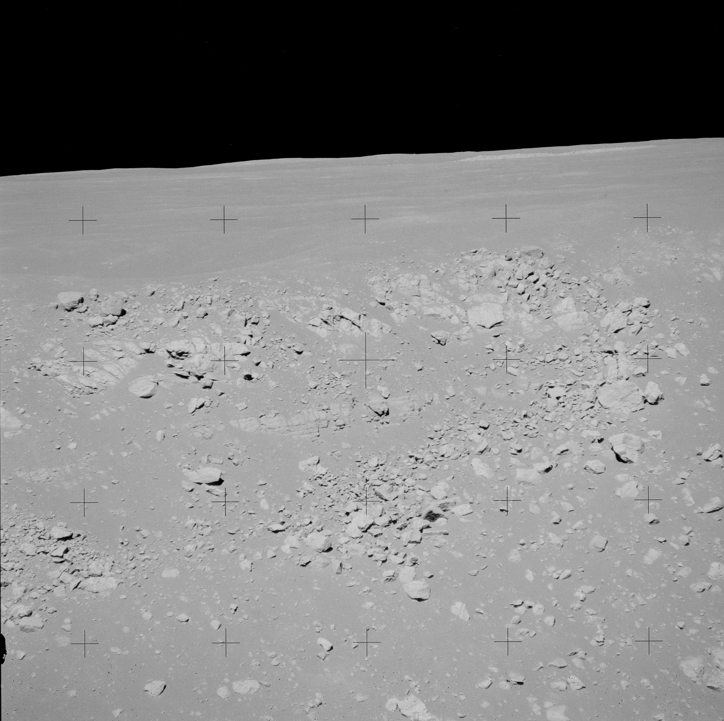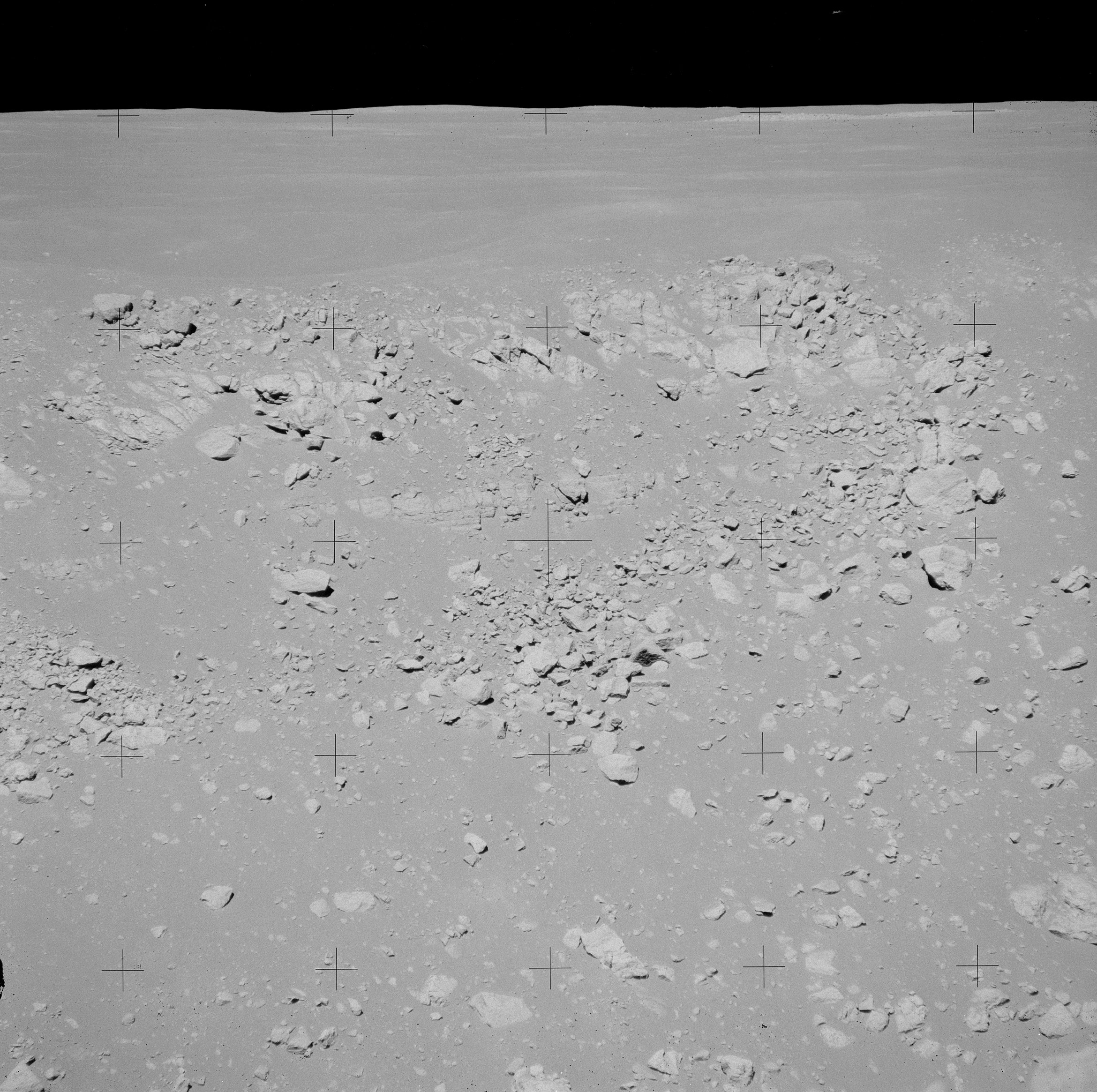 This picture was taken from the LM during CSM Rev 13 on the last pass over the landing site prior to the descent. A labeled version shows some of the prominent landmarks.Rev 16 Mapping (Metric) Camera Frame 0414 ( 13 Mb )