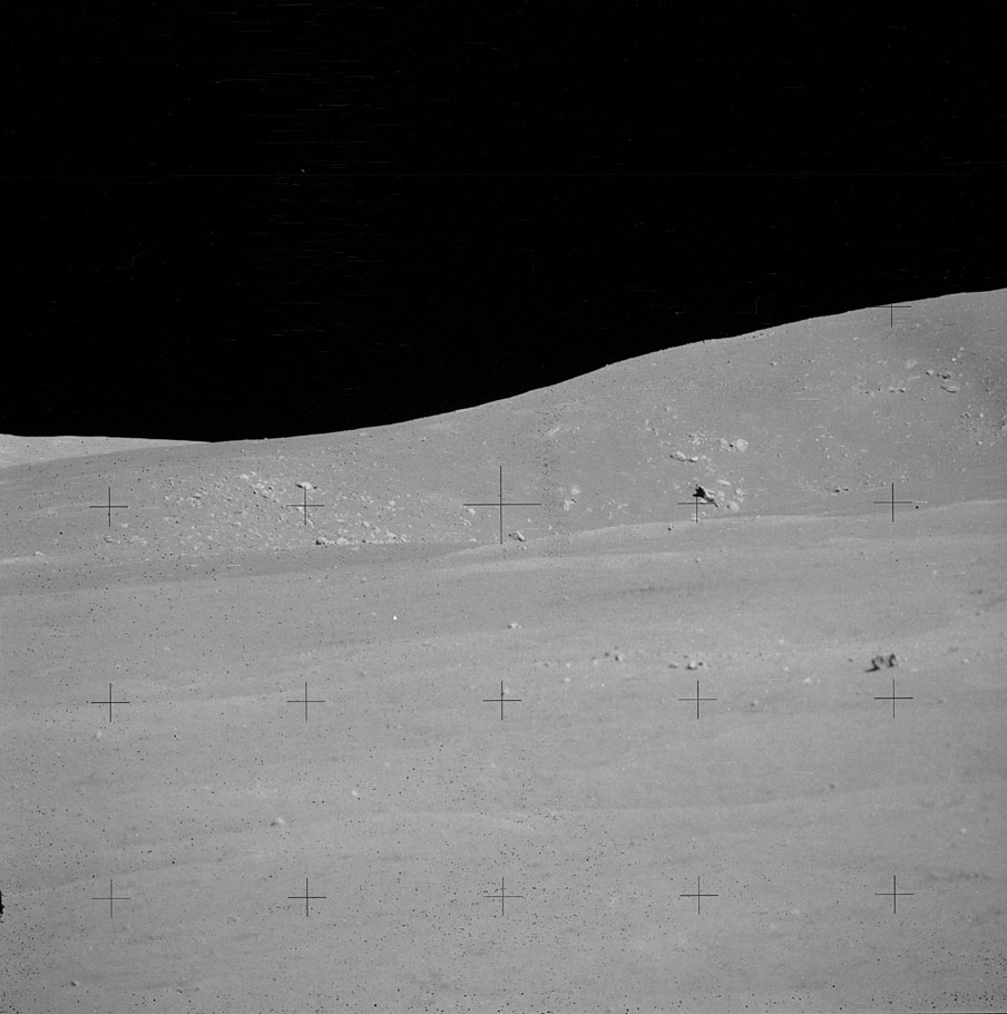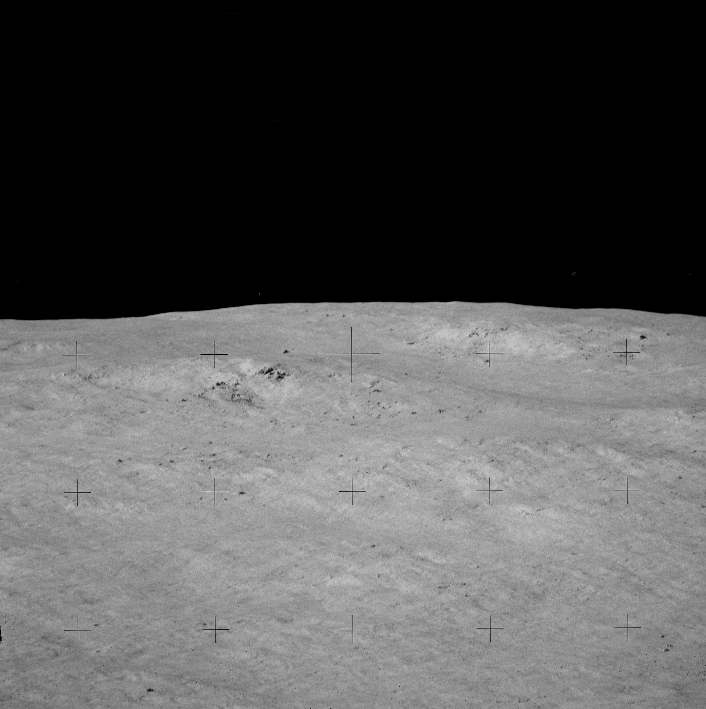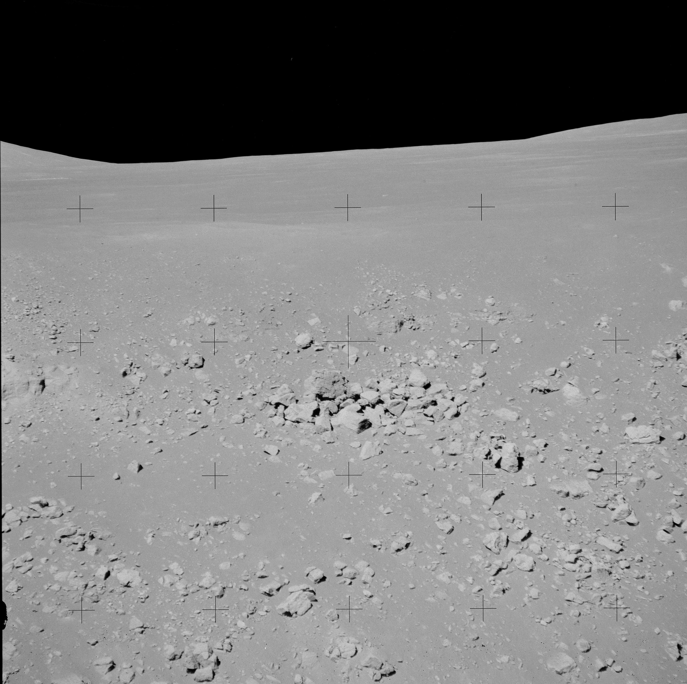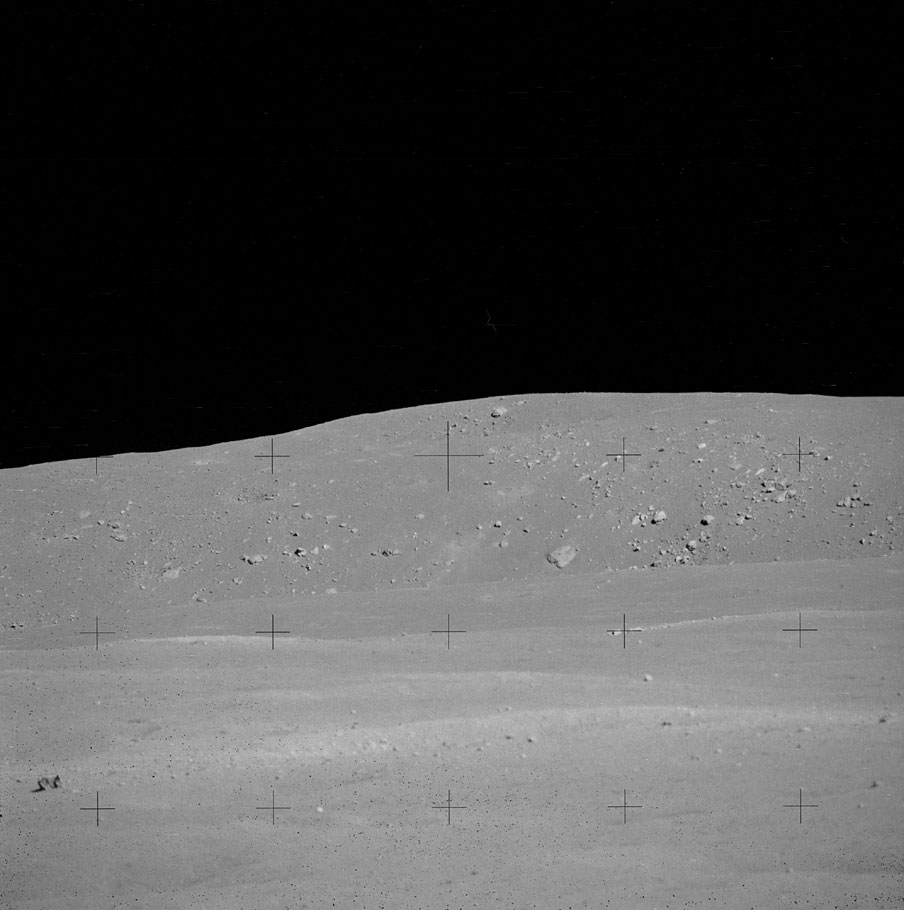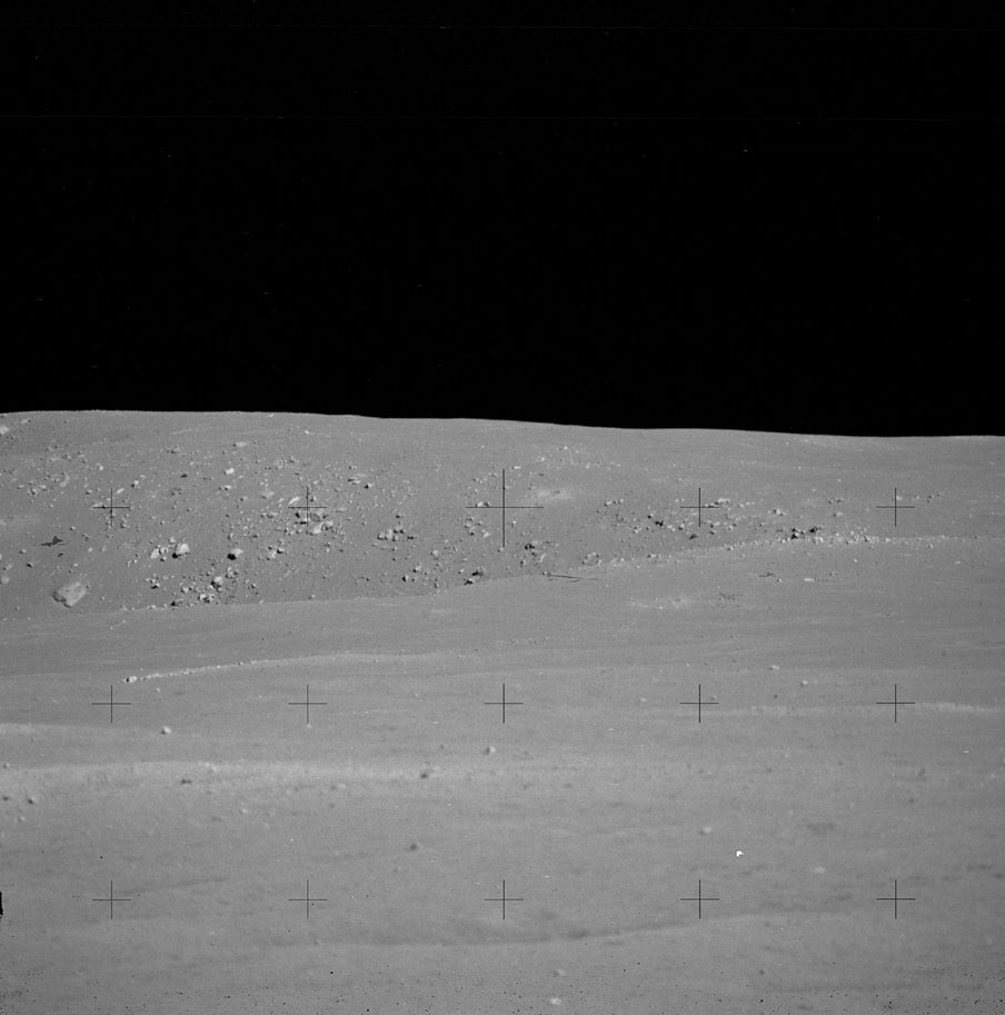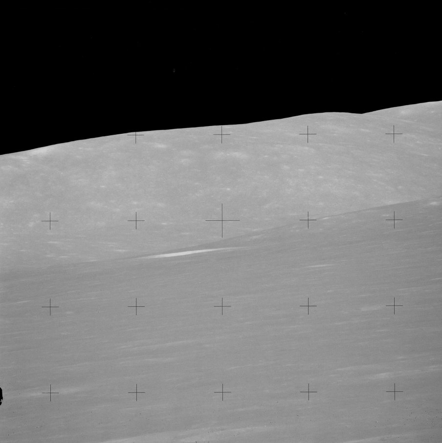 This picture was taken from the LM during CSM Rev 13 on the last pass over the landing site prior to the descent. A labeled version shows some of the prominent landmarks.Rev 16 Mapping (Metric) Camera Frame 0414 ( 13 Mb )