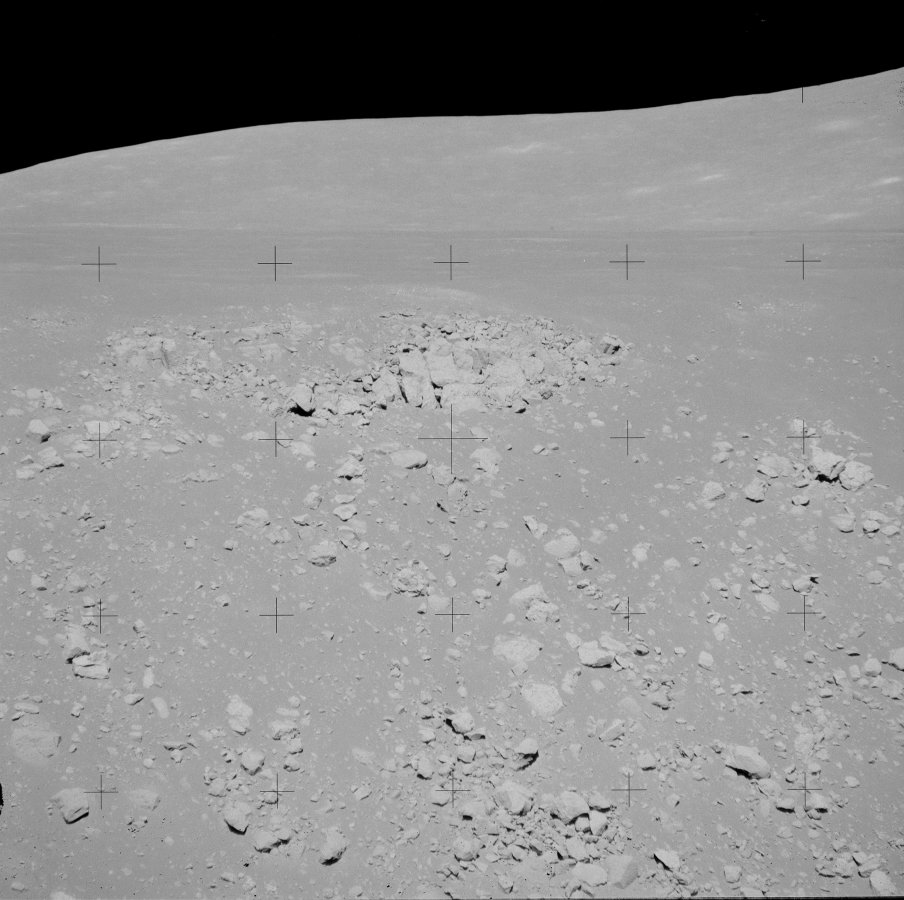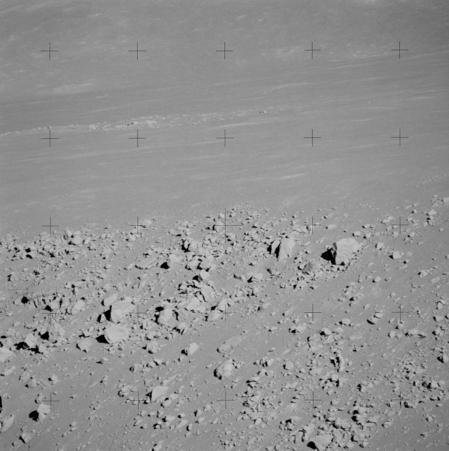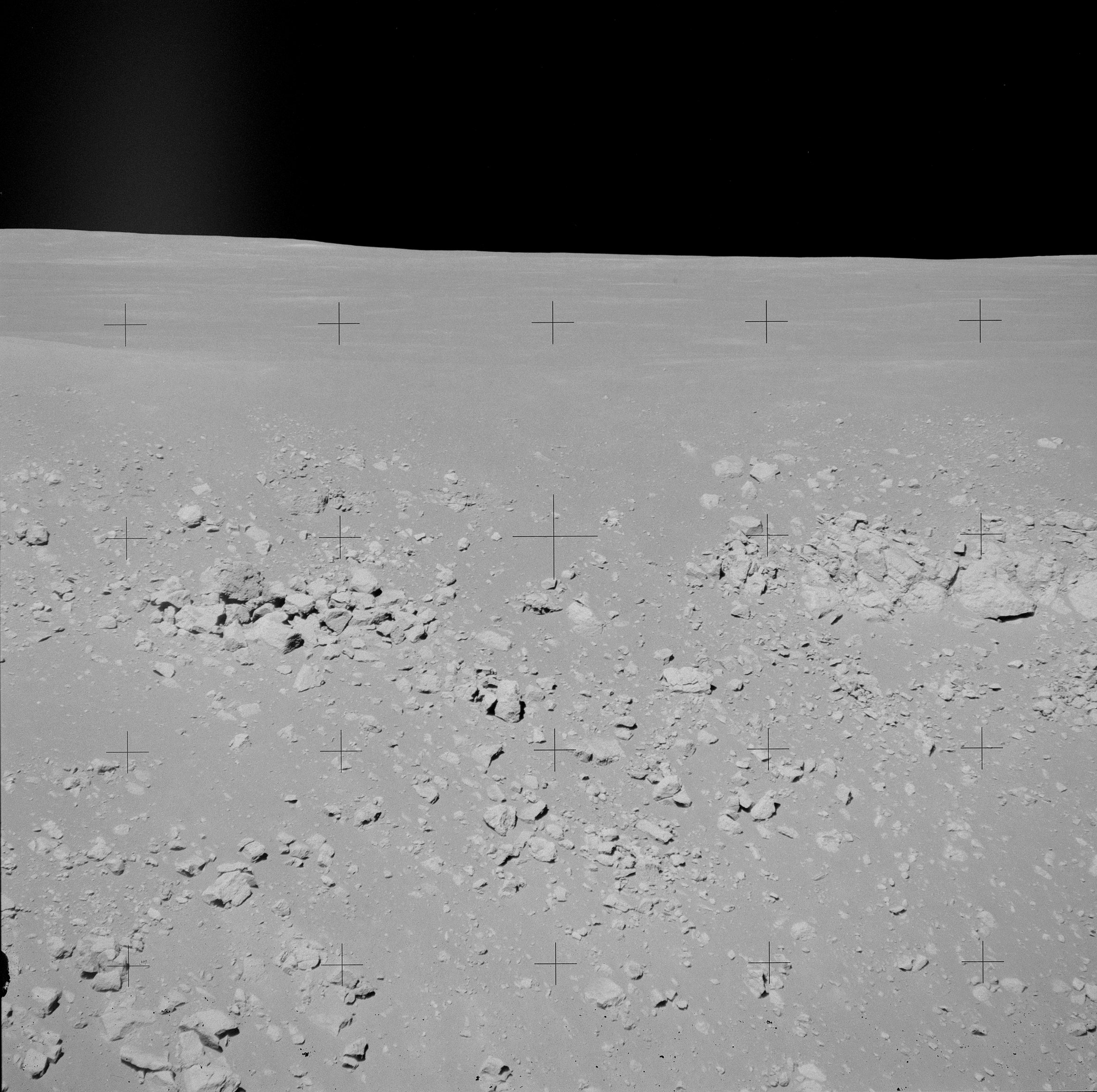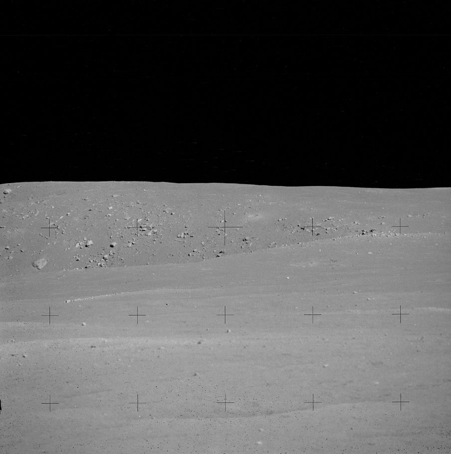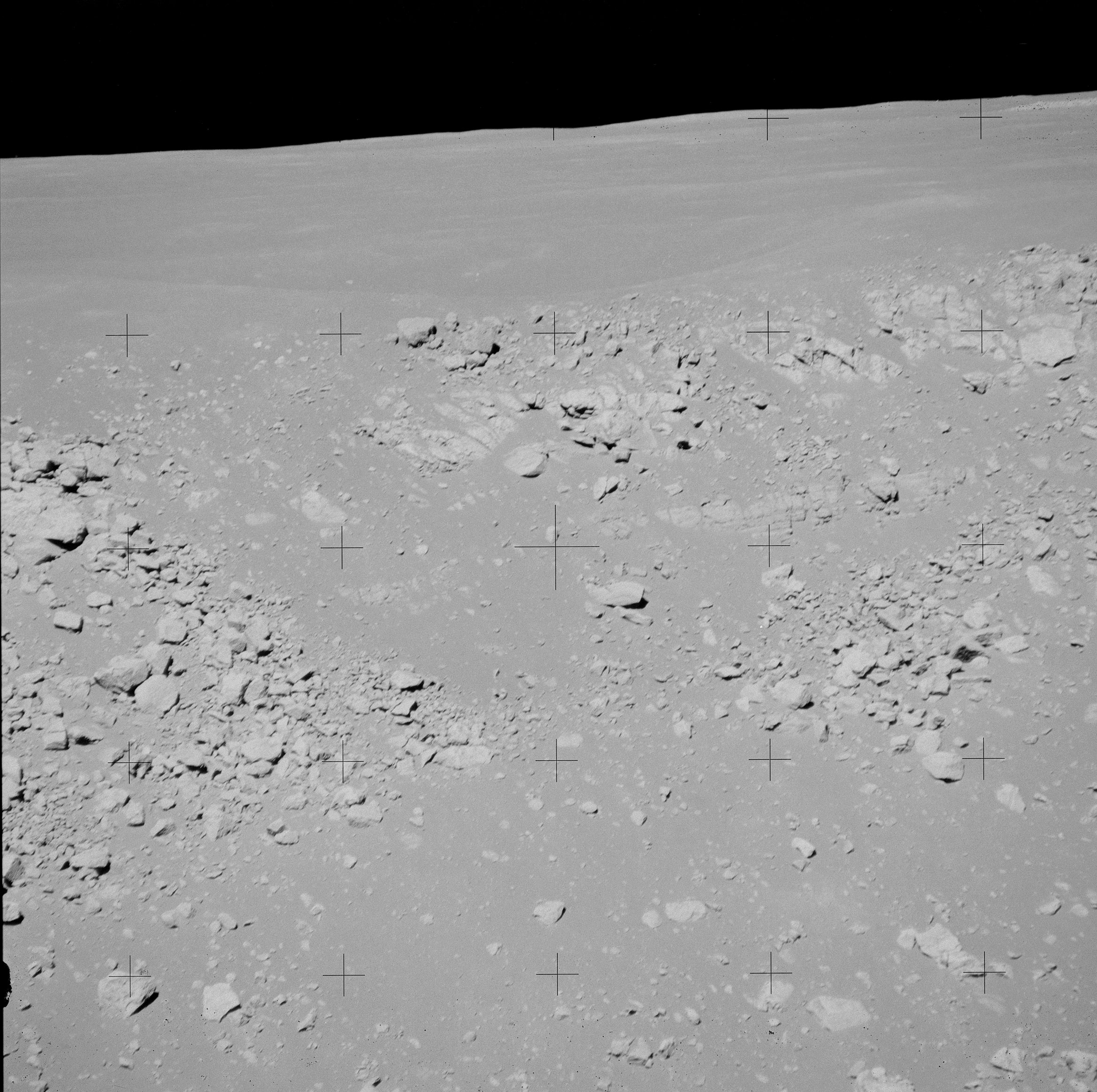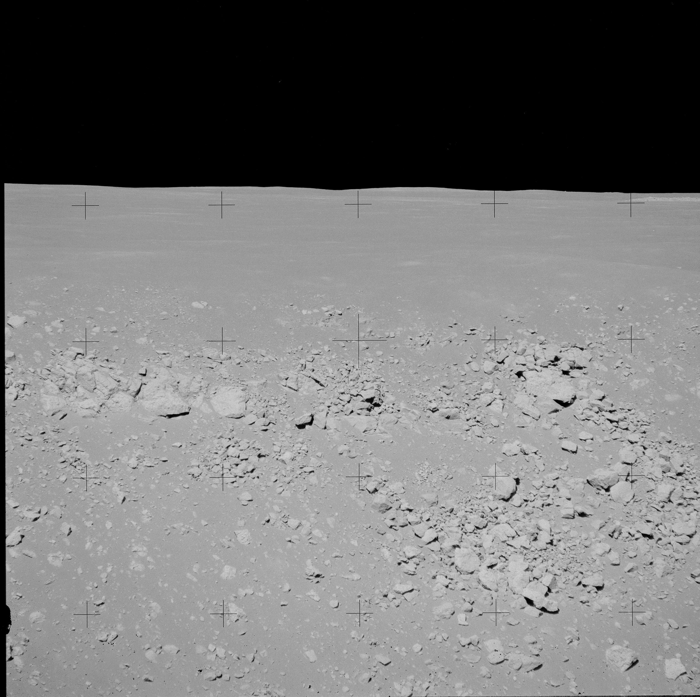 This picture was taken from the LM during CSM Rev 13 on the last pass over the landing site prior to the descent. A labeled version shows some of the prominent landmarks.Rev 16 Mapping (Metric) Camera Frame 0414 ( 13 Mb )