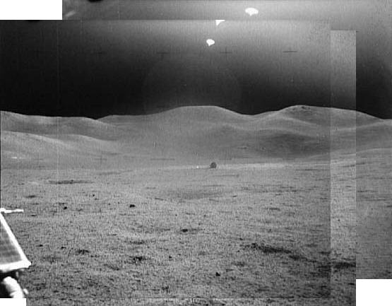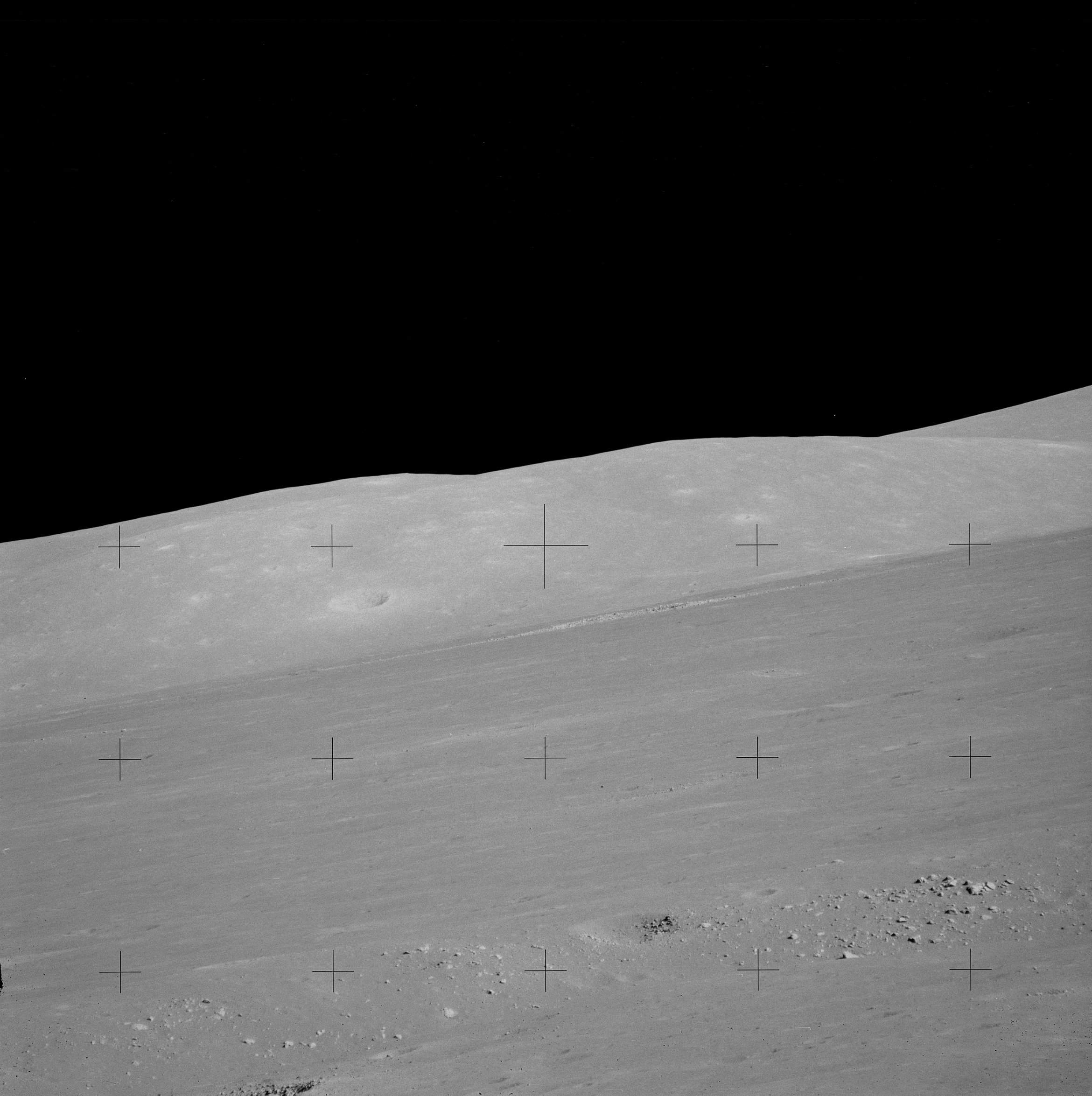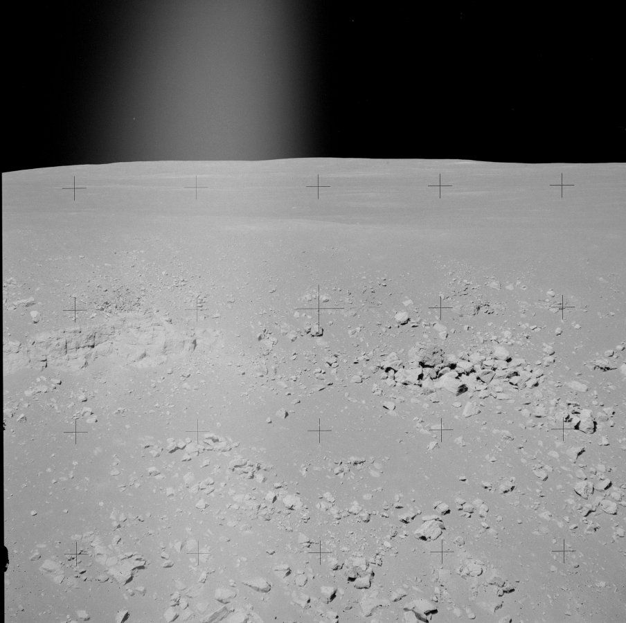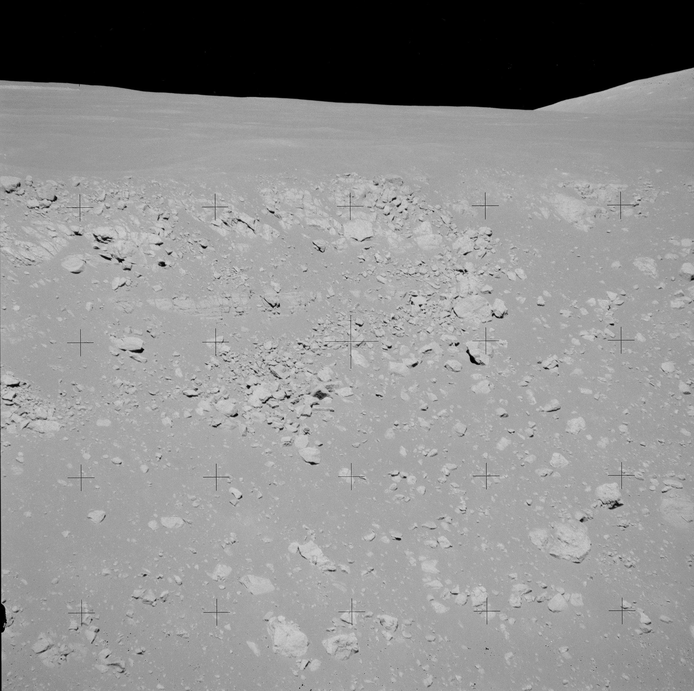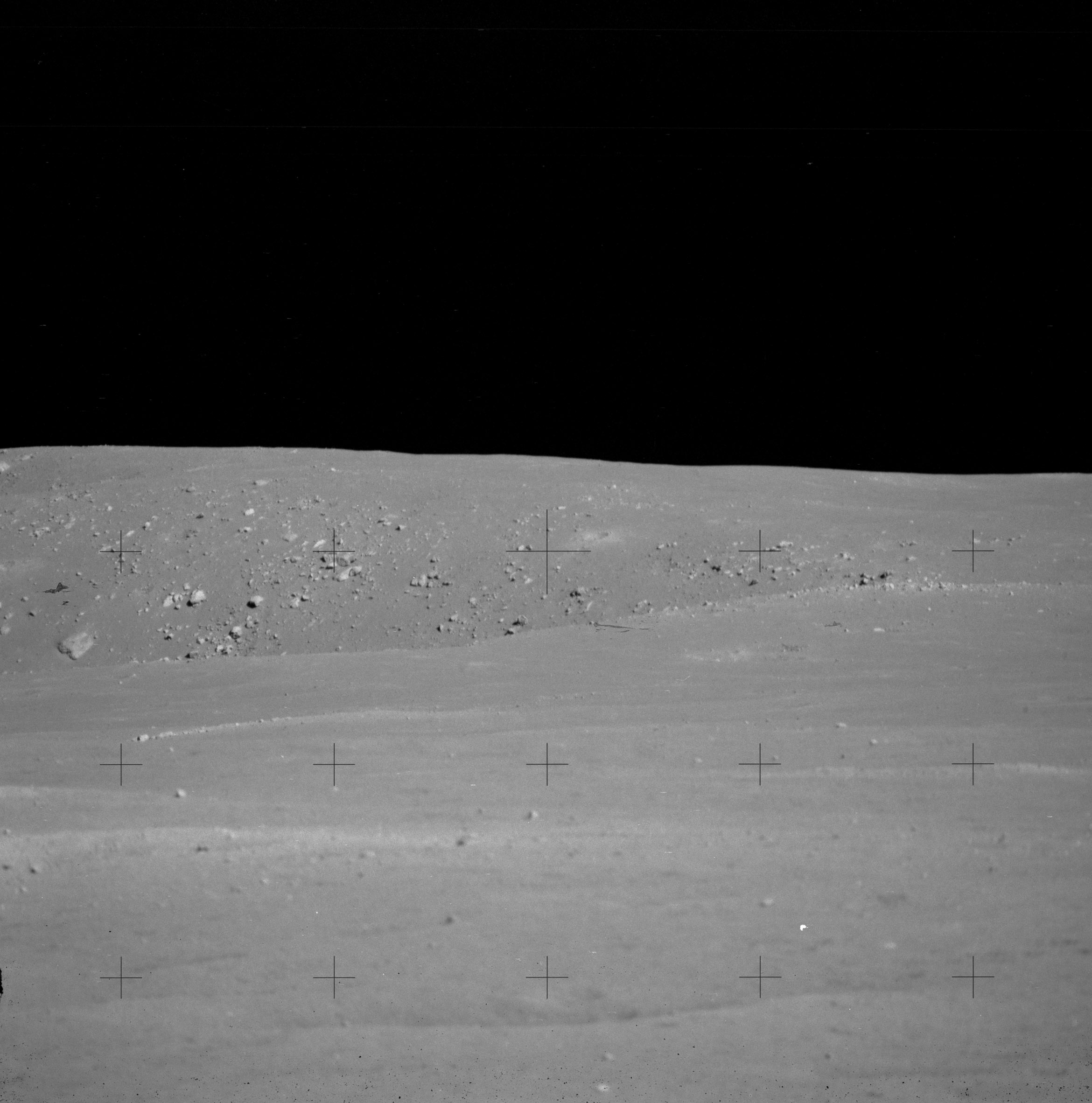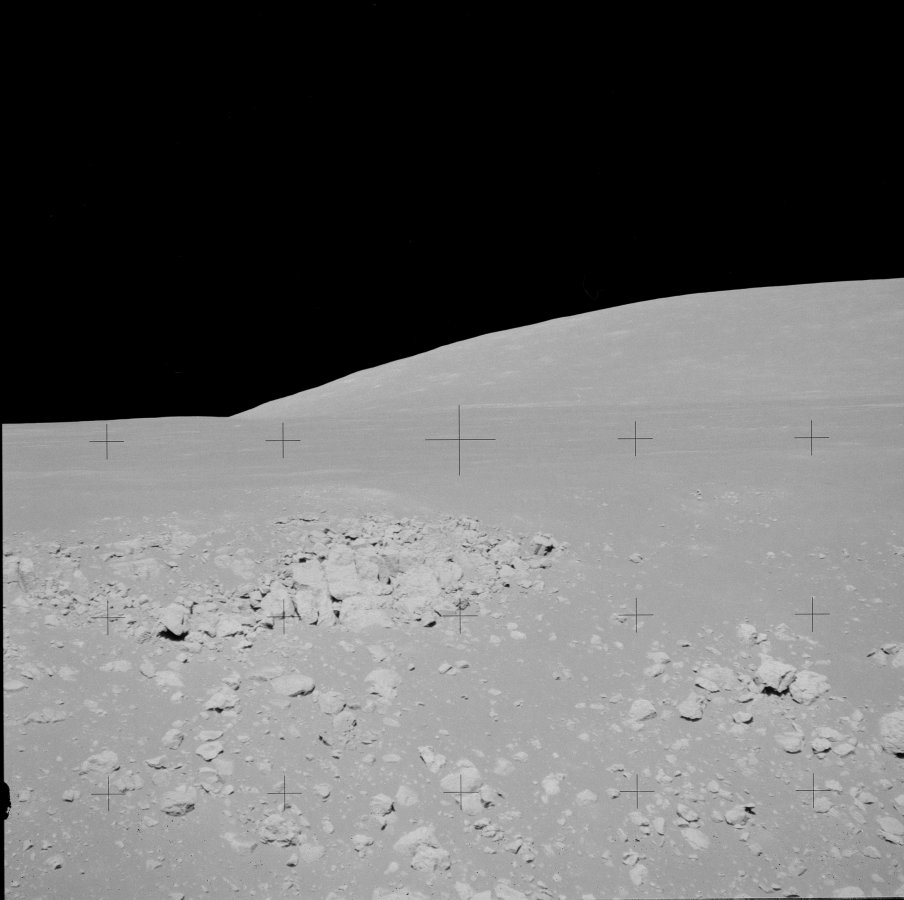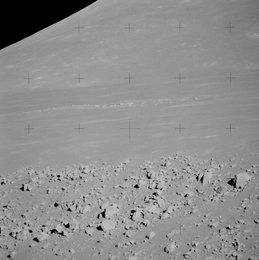 This picture was taken from the LM during CSM Rev 13 on the last pass over the landing site prior to the descent. A labeled version shows some of the prominent landmarks.Rev 16 Mapping (Metric) Camera Frame 0414 ( 13 Mb )