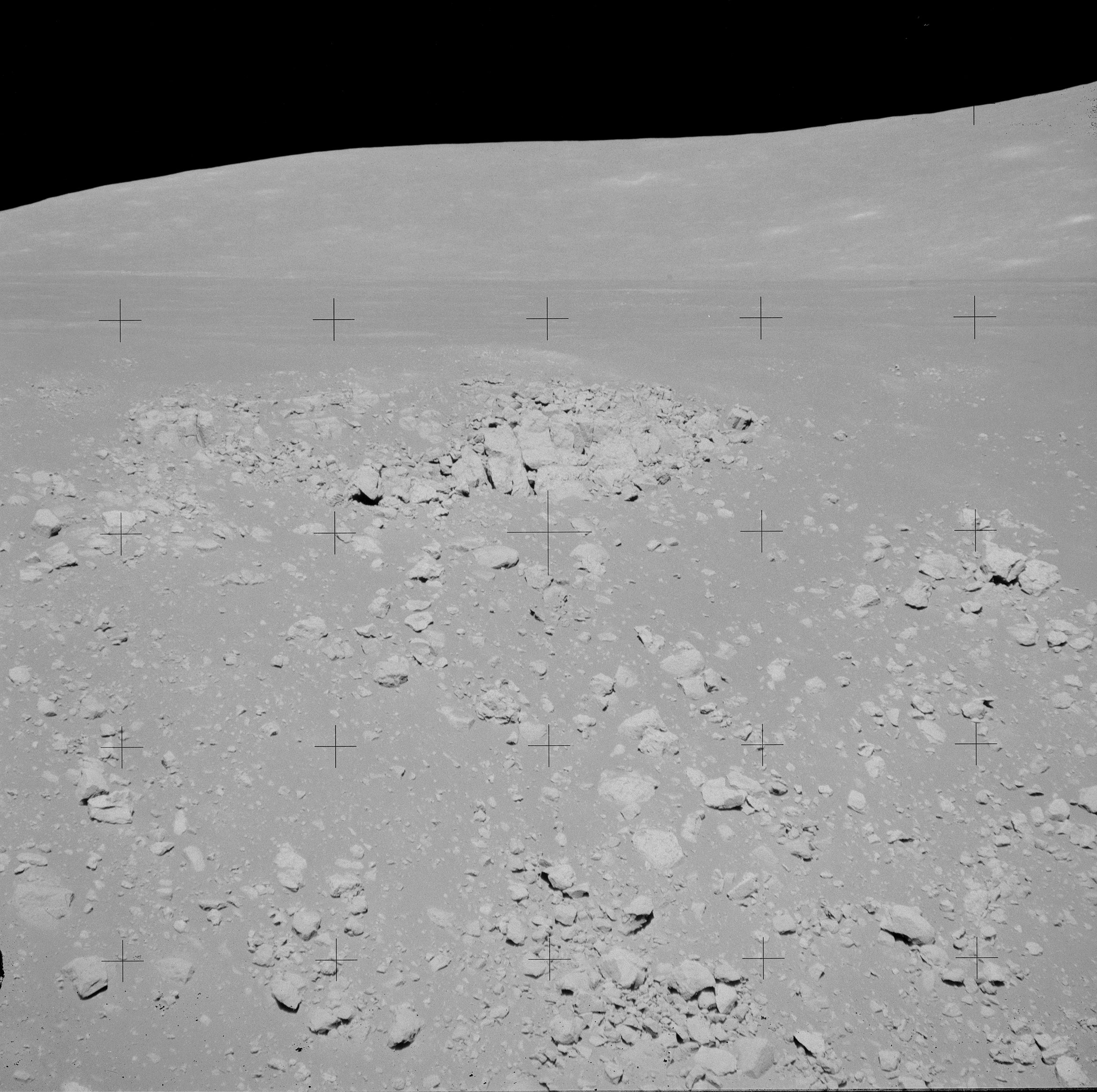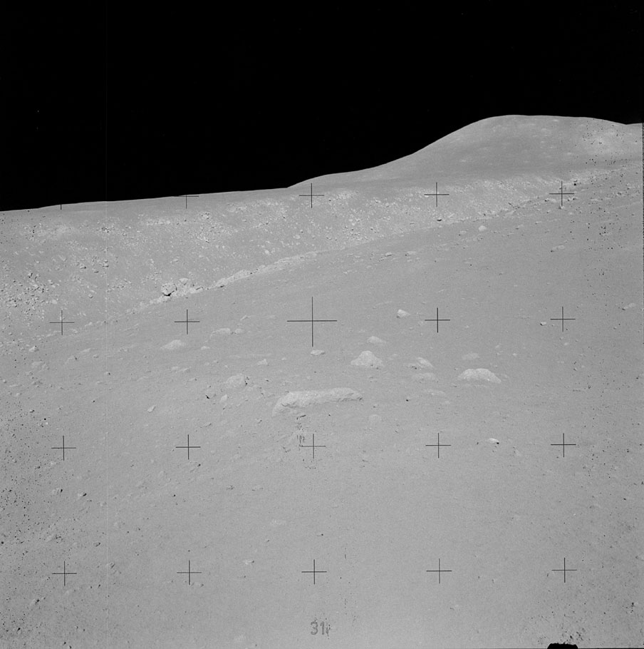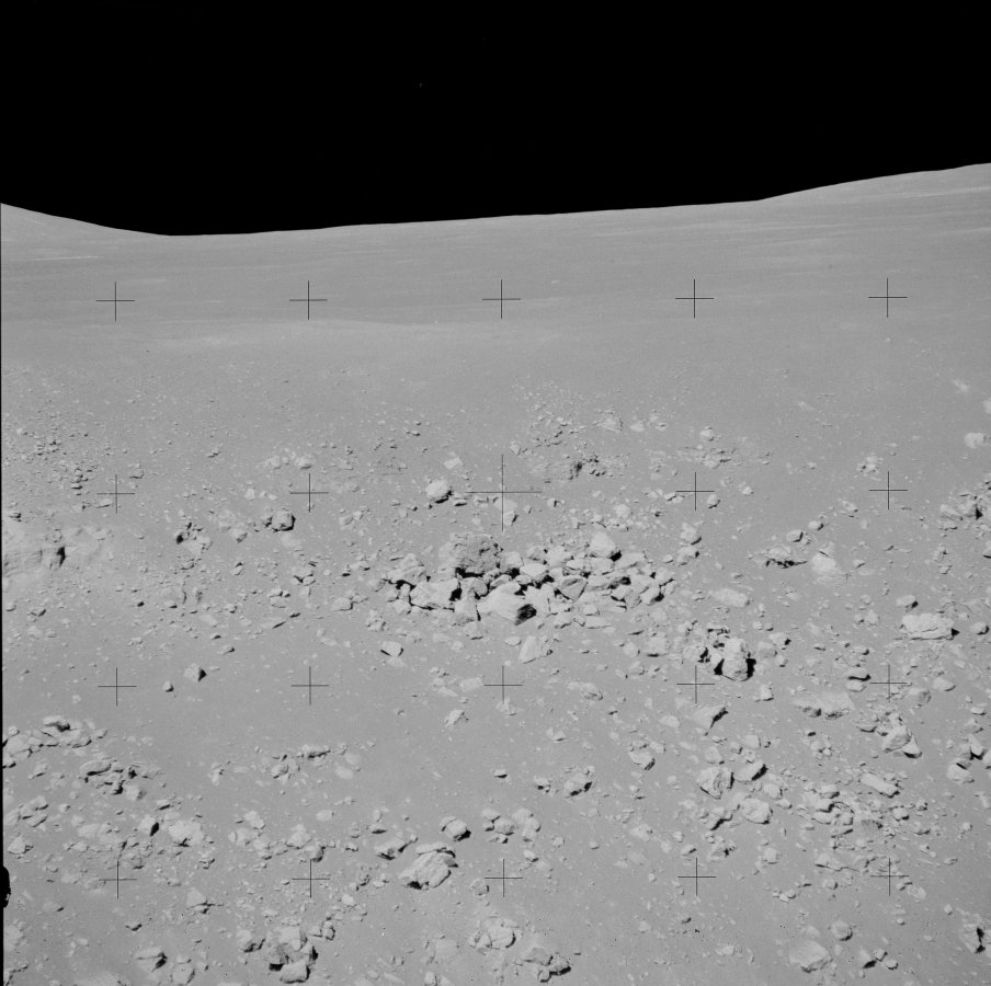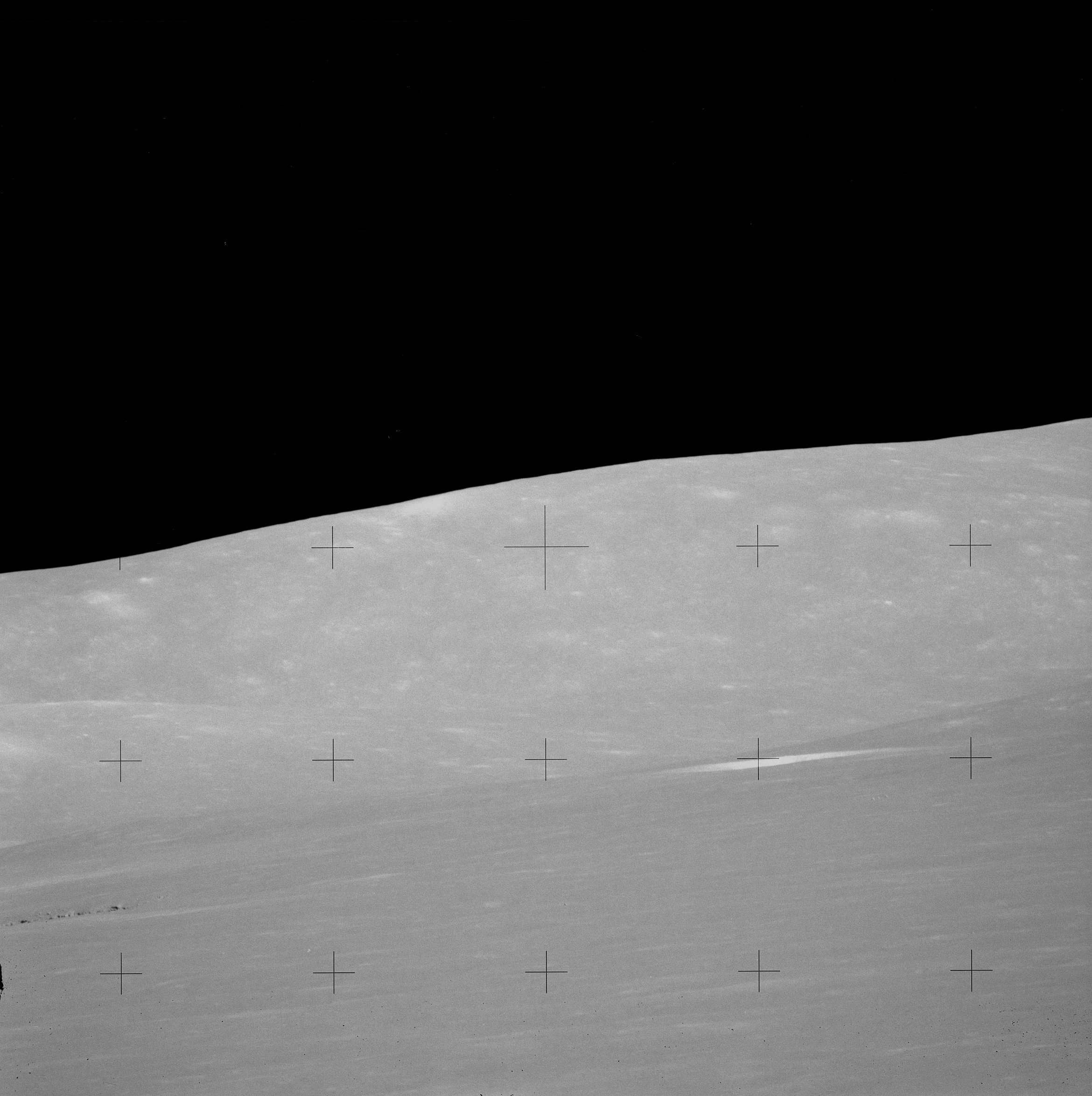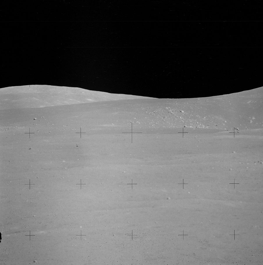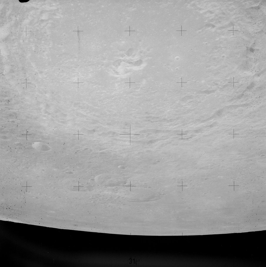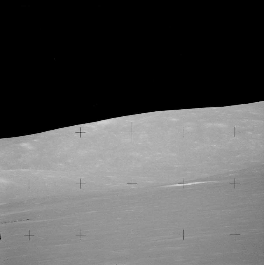 This picture was taken from the LM during CSM Rev 13 on the last pass over the landing site prior to the descent. A labeled version shows some of the prominent landmarks.Rev 16 Mapping (Metric) Camera Frame 0414 ( 13 Mb )