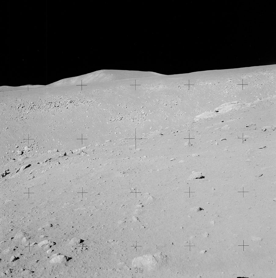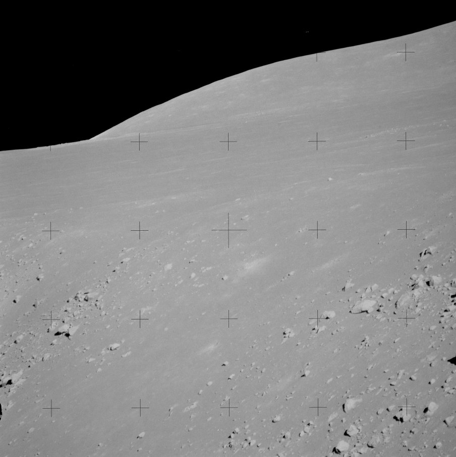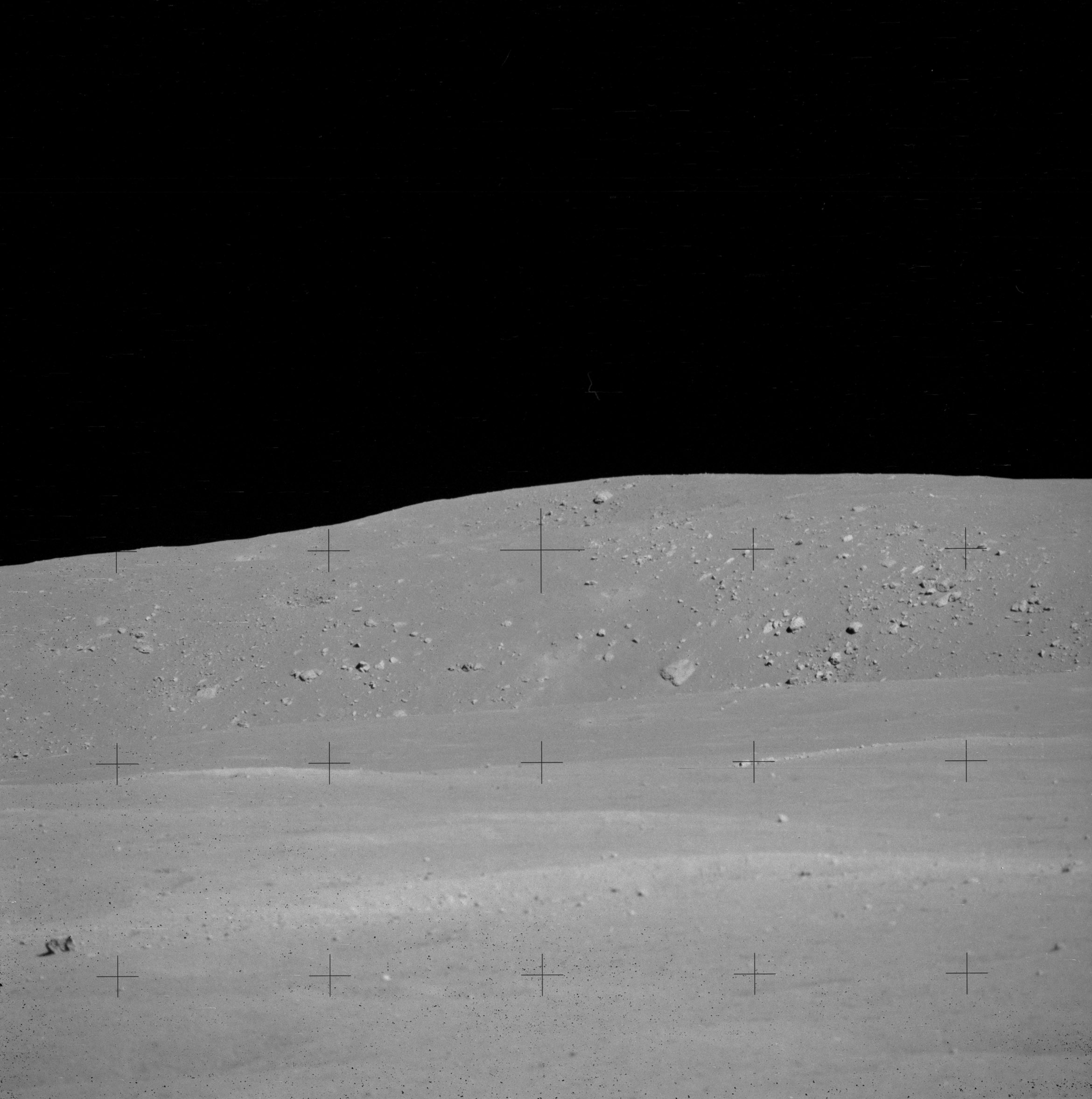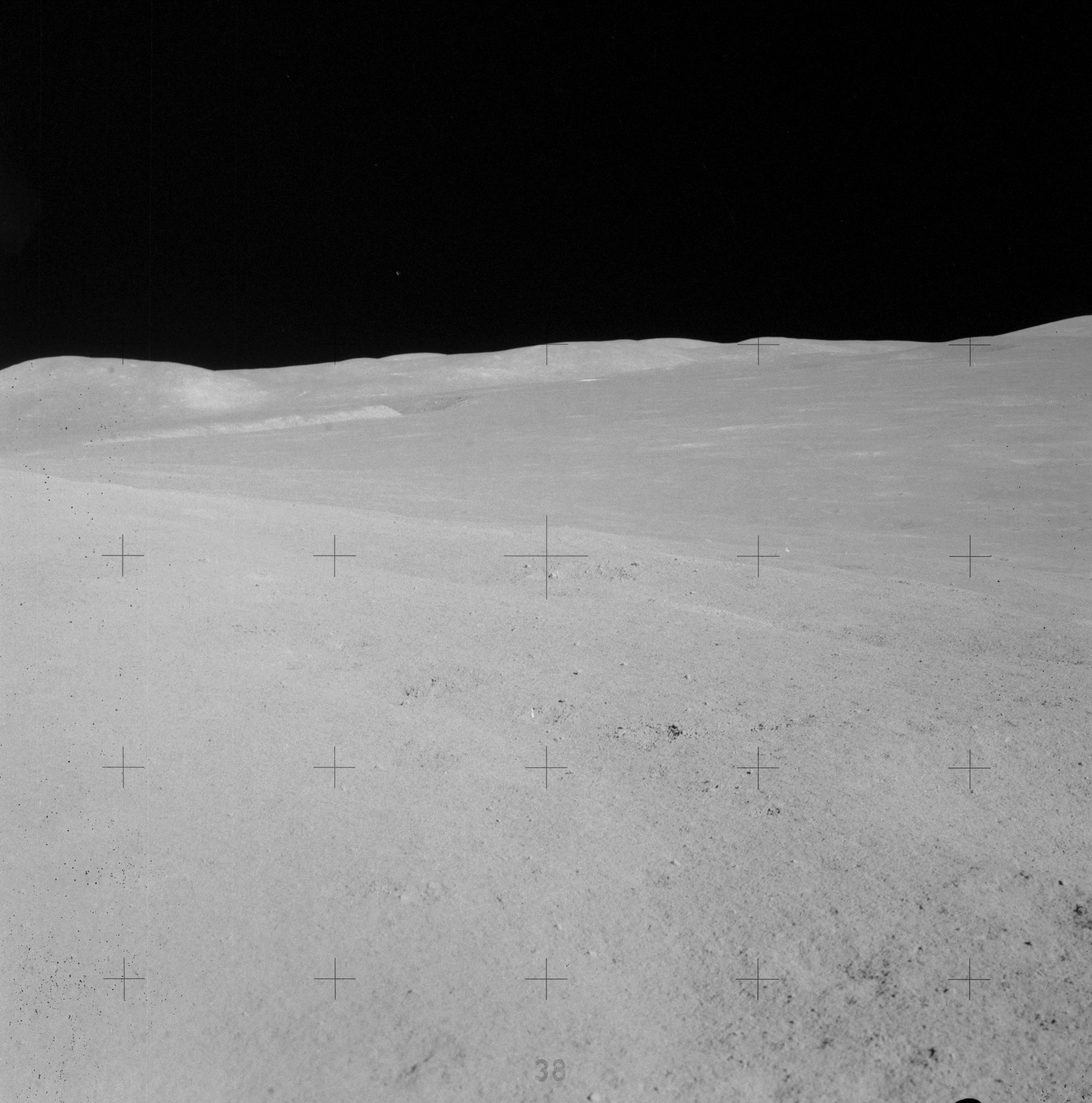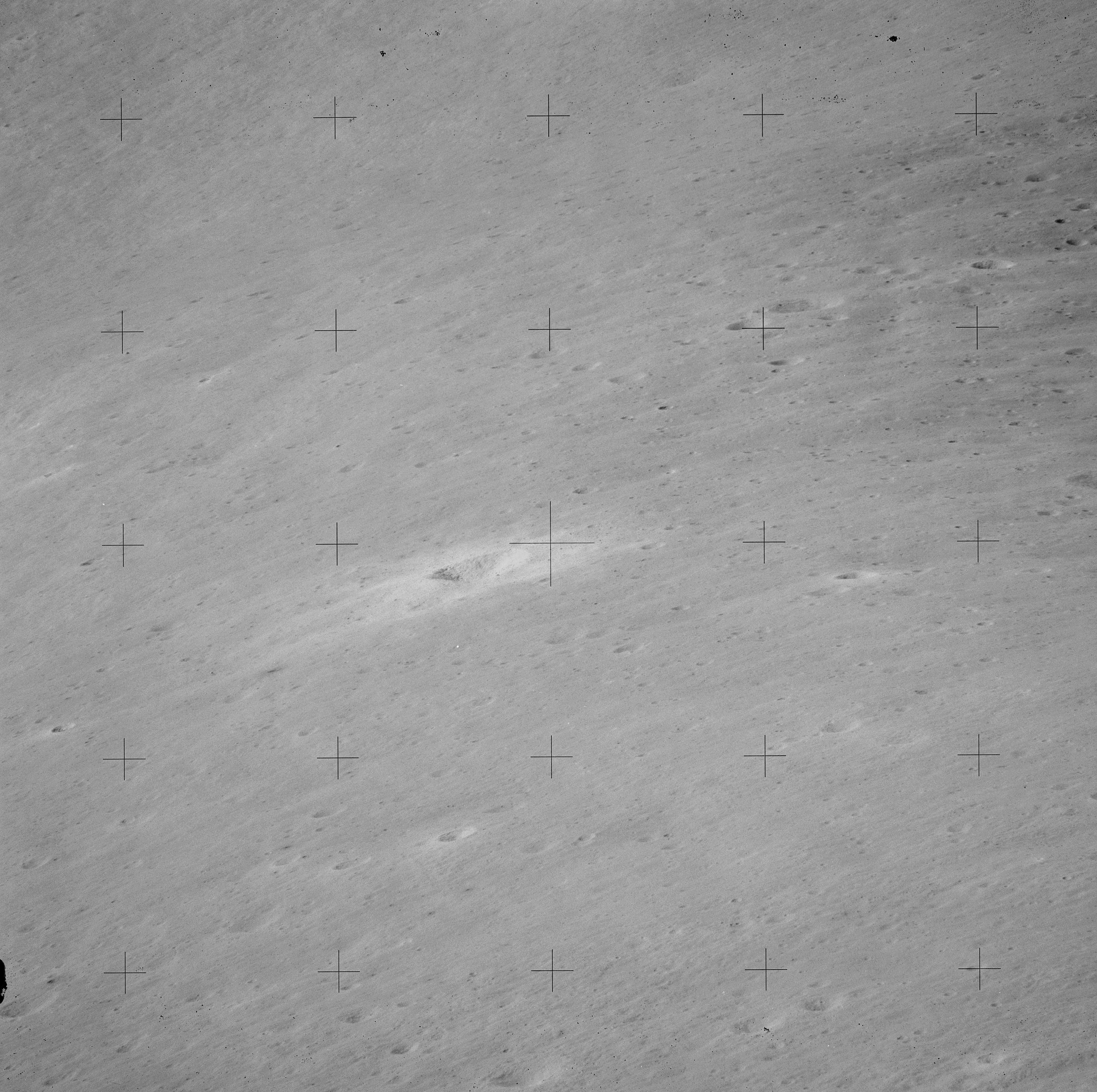 This picture was taken from the LM during CSM Rev 13 on the last pass over the landing site prior to the descent. A labeled version shows some of the prominent landmarks.Rev 16 Mapping (Metric) Camera Frame 0414 ( 13 Mb )