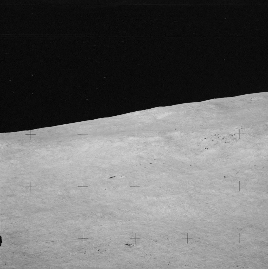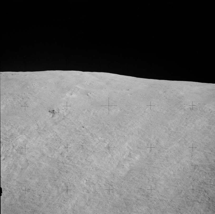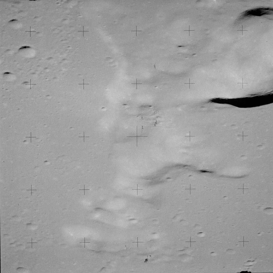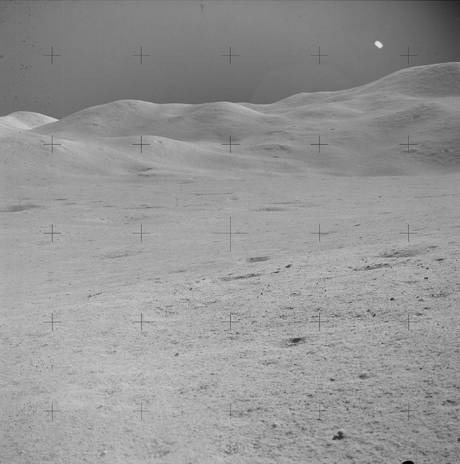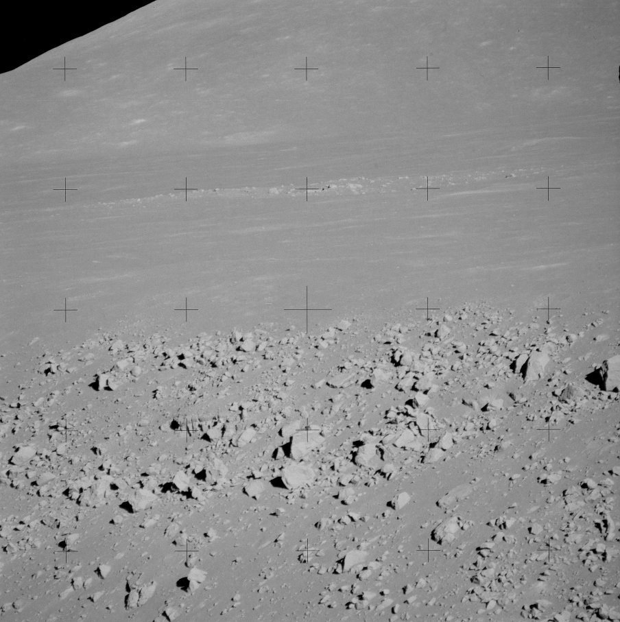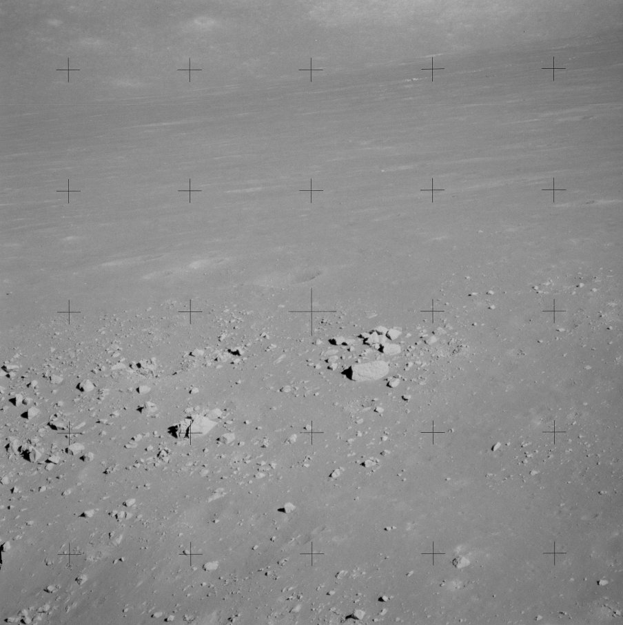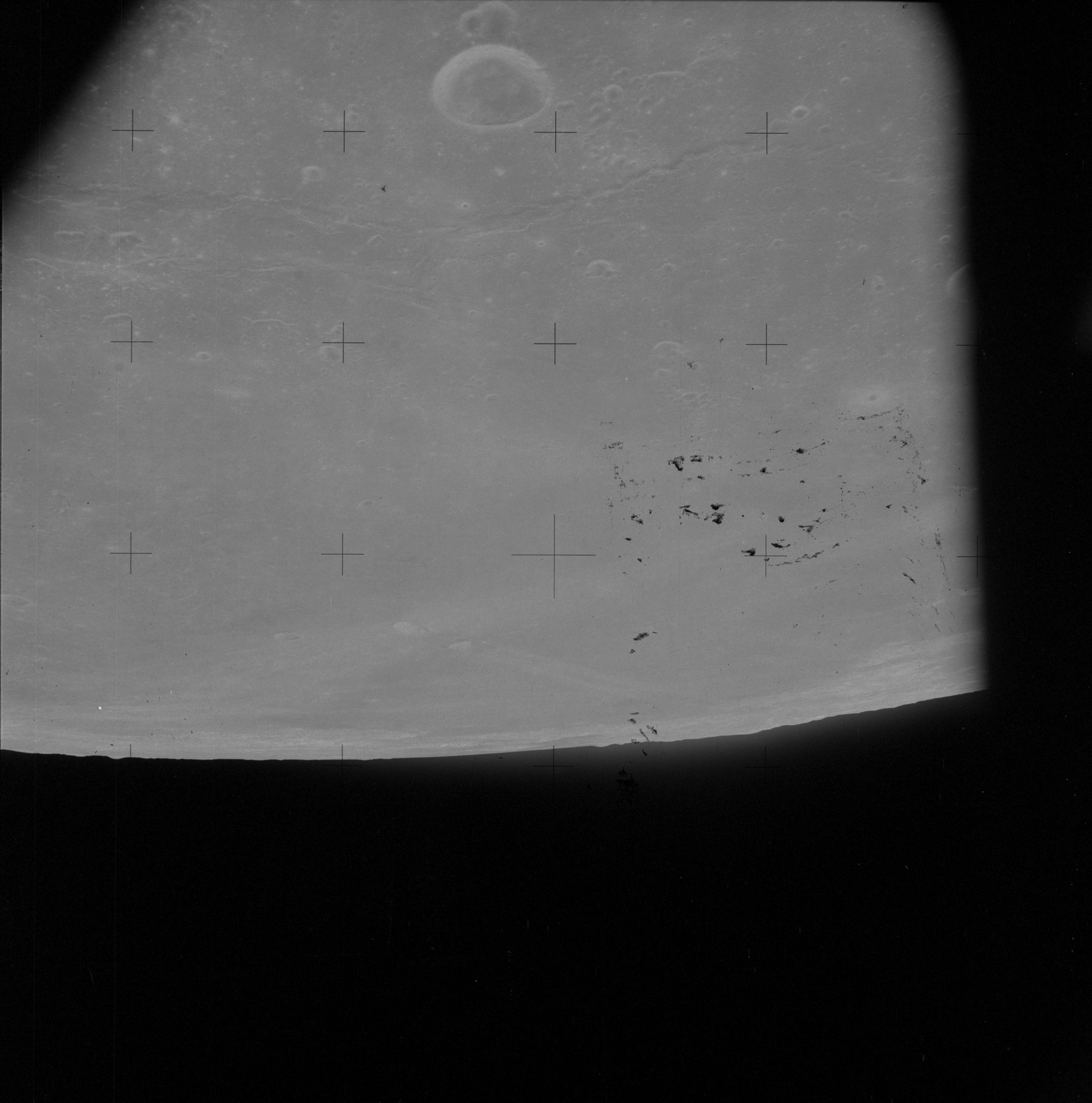 This picture was taken from the LM during CSM Rev 13 on the last pass over the landing site prior to the descent. A labeled version shows some of the prominent landmarks.Rev 16 Mapping (Metric) Camera Frame 0414 ( 13 Mb )