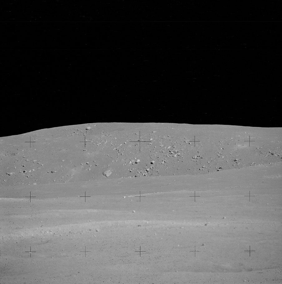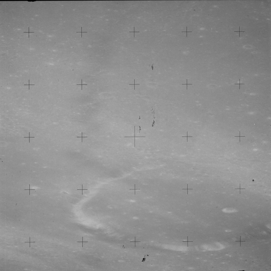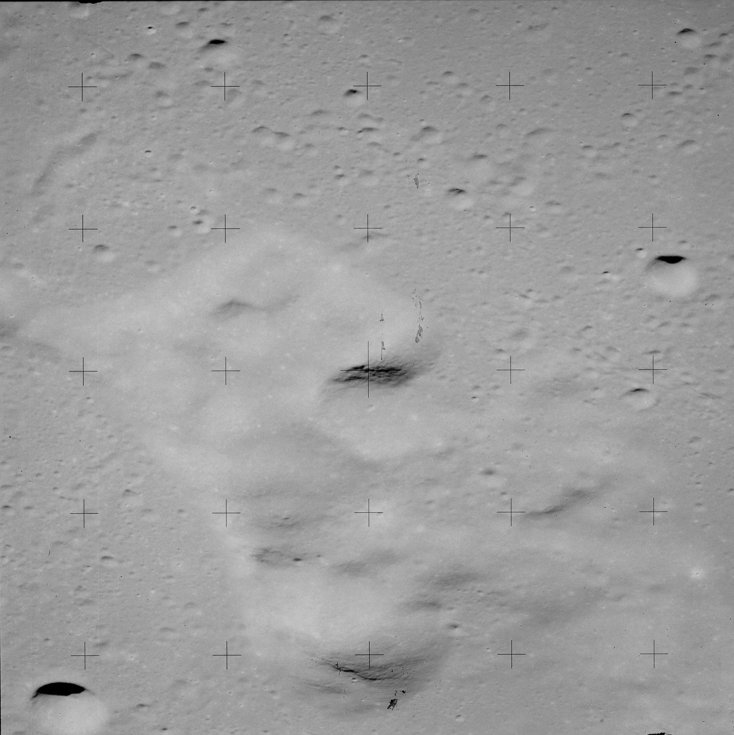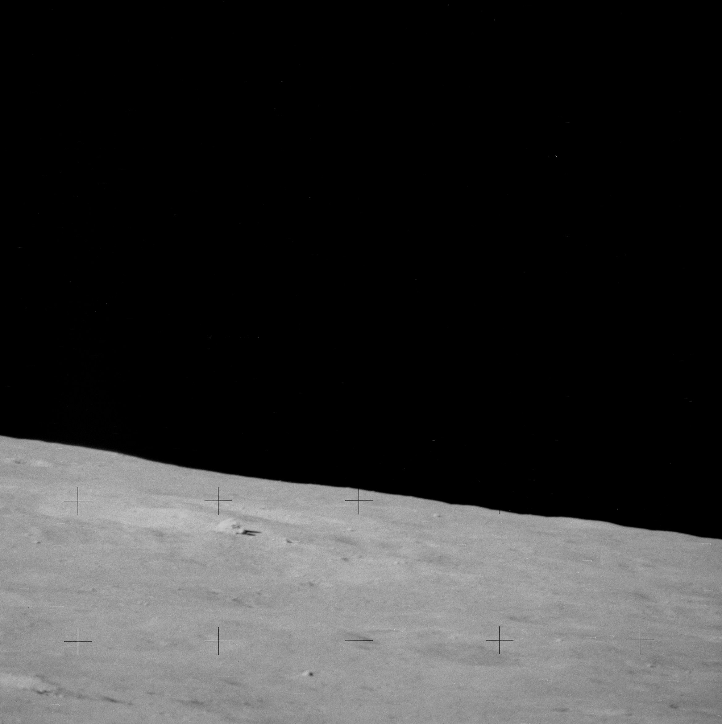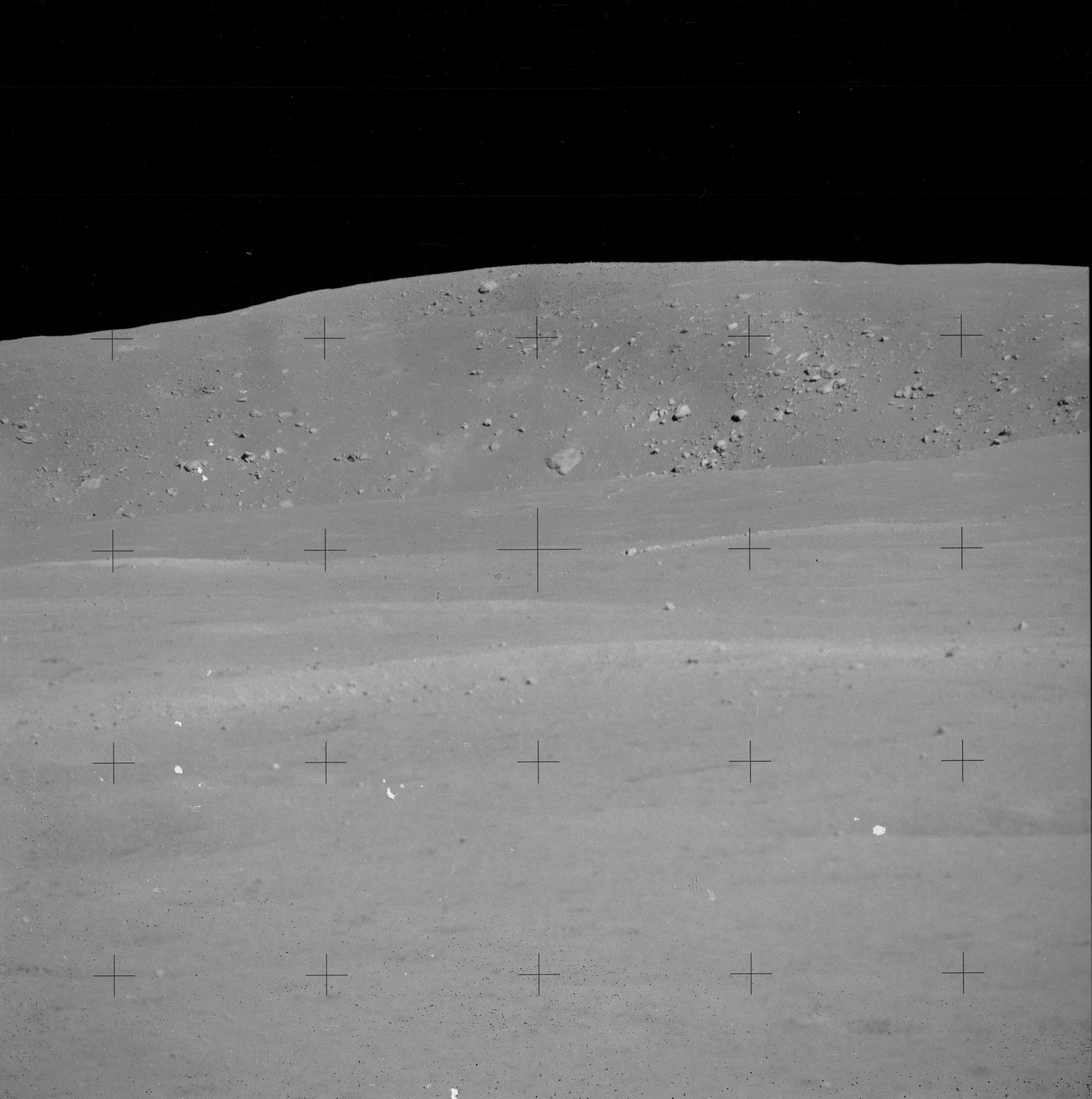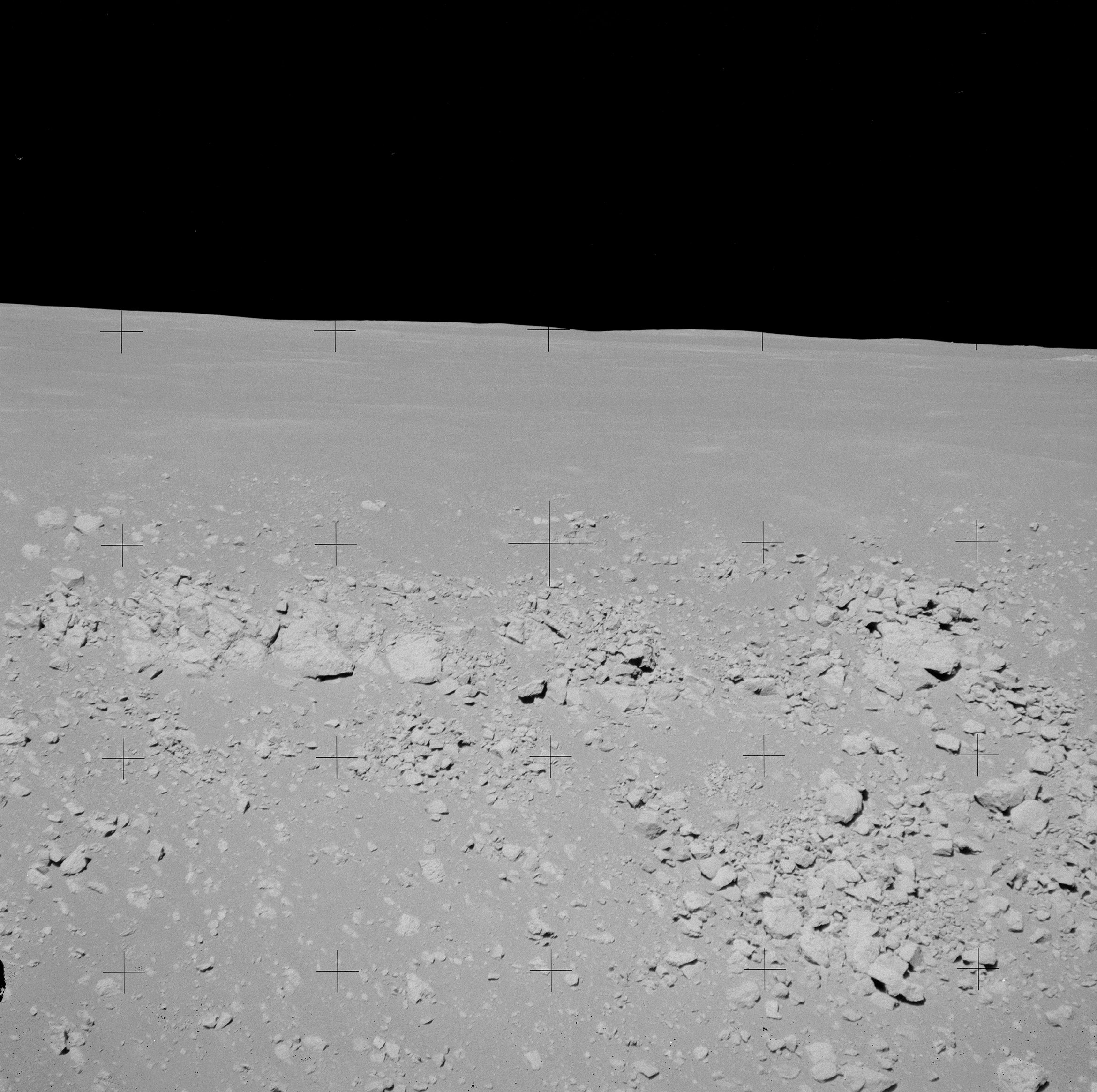 This picture was taken from the LM during CSM Rev 13 on the last pass over the landing site prior to the descent. A labeled version shows some of the prominent landmarks.Rev 16 Mapping (Metric) Camera Frame 0414 ( 13 Mb )