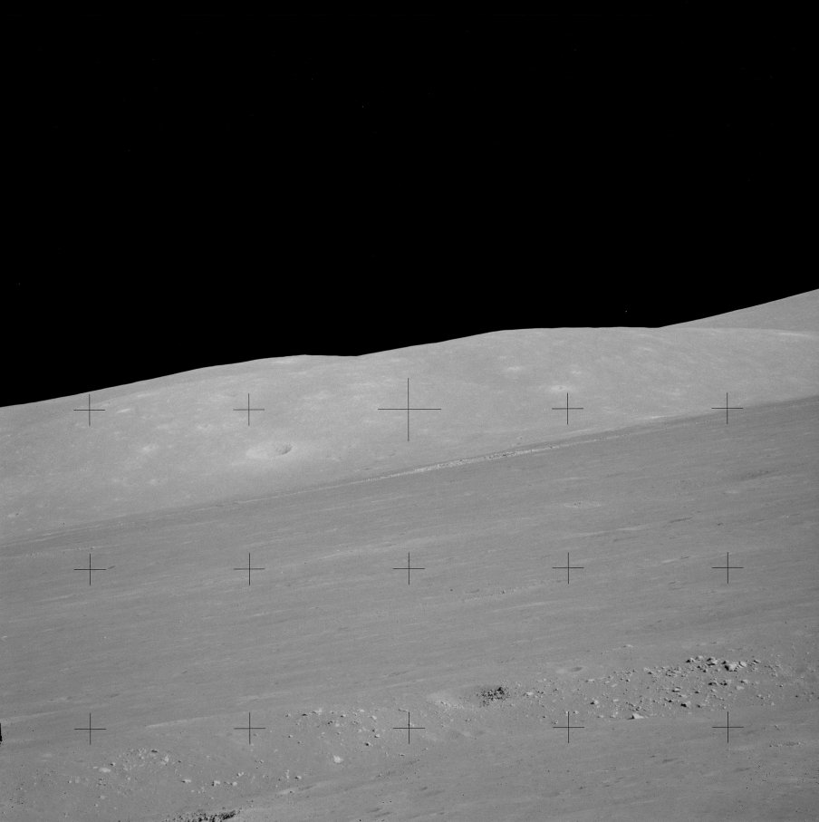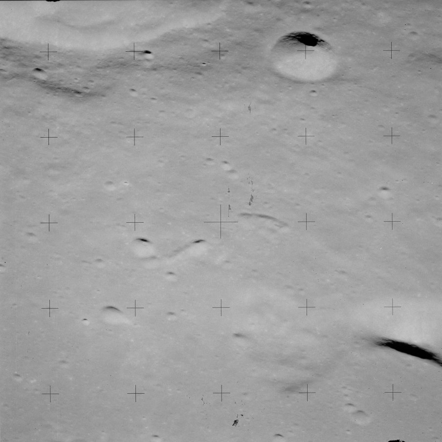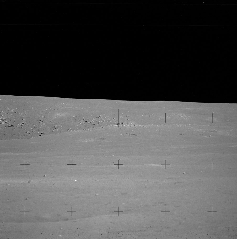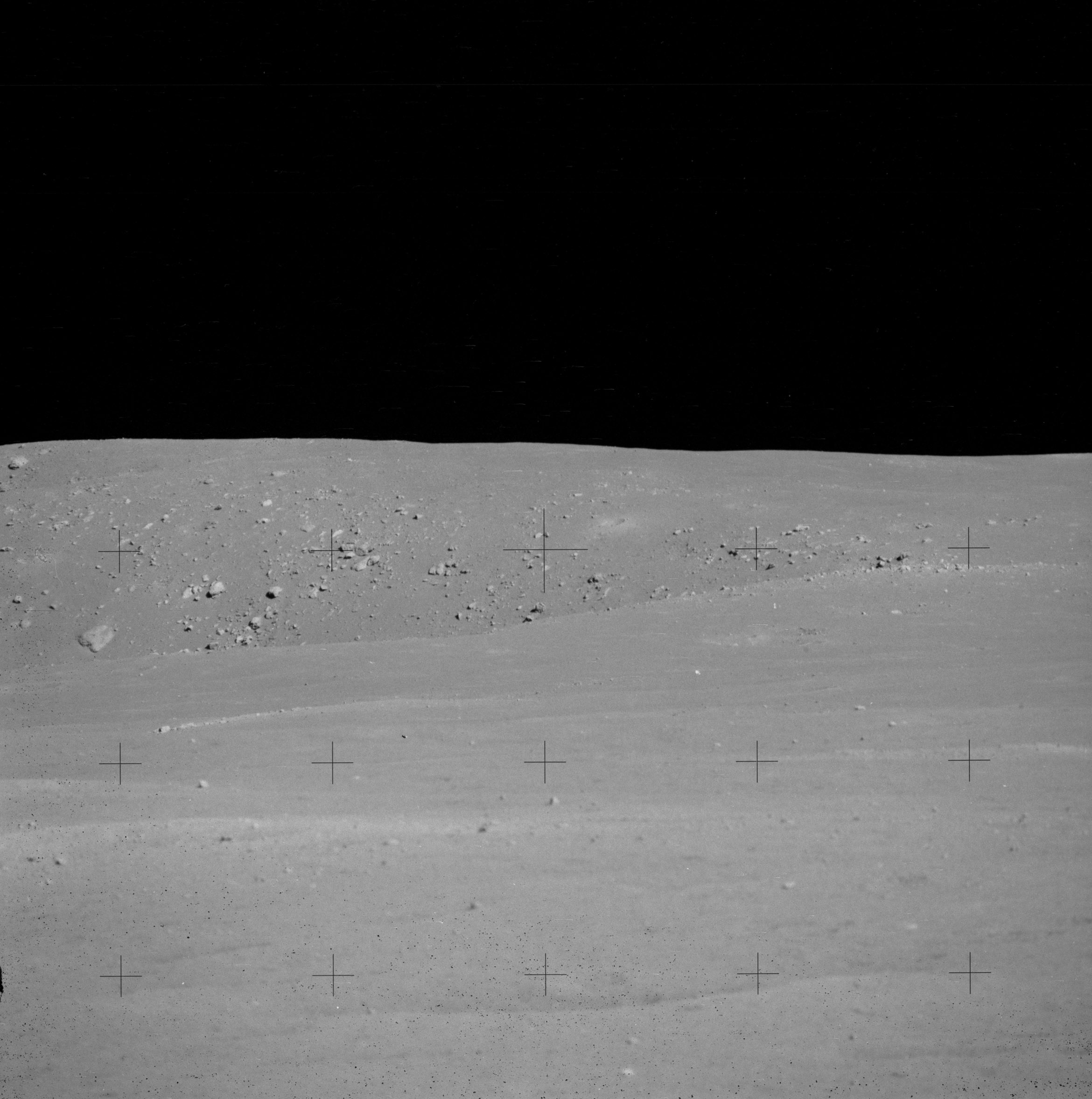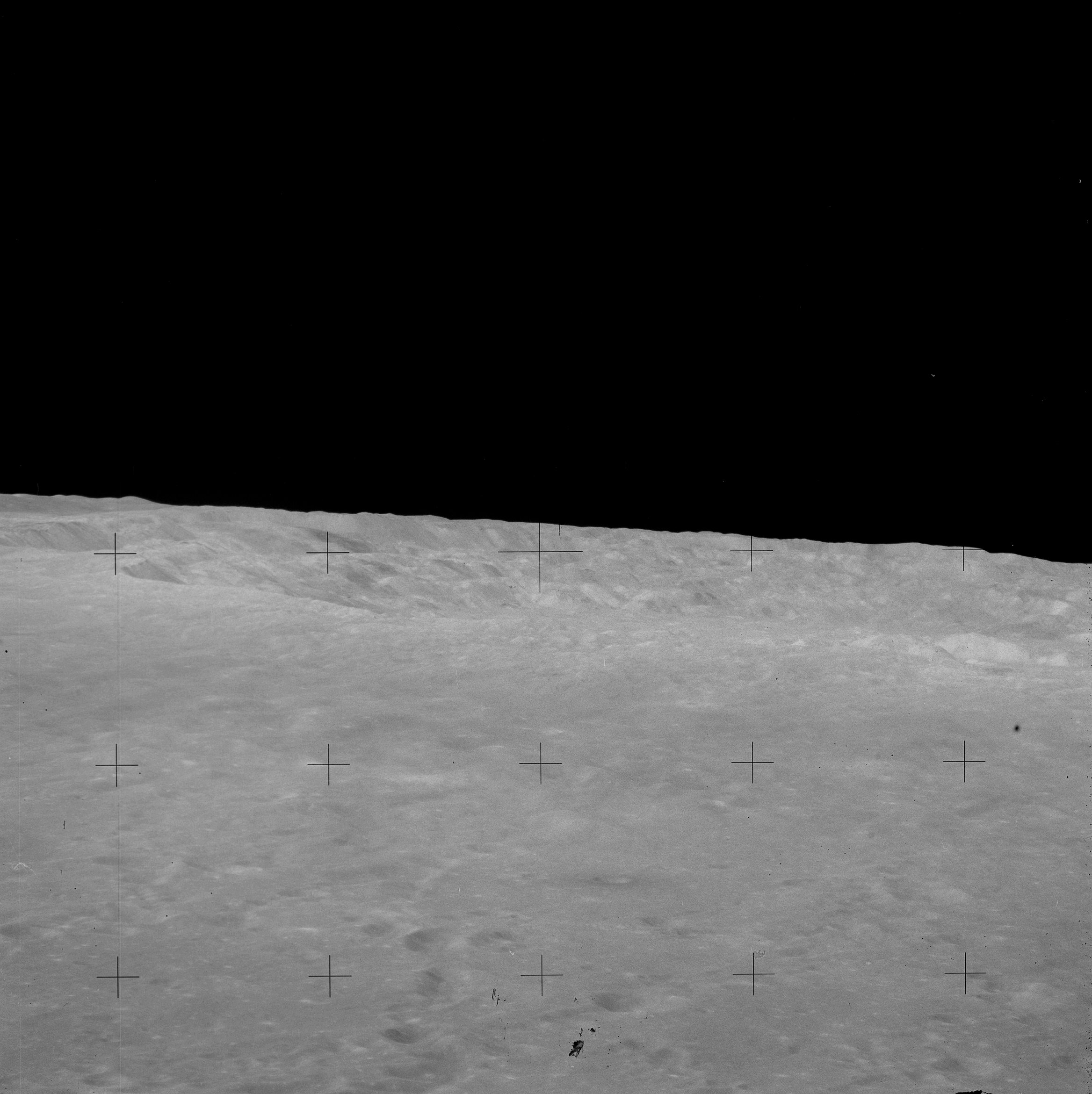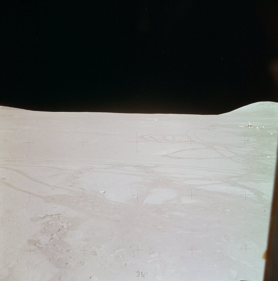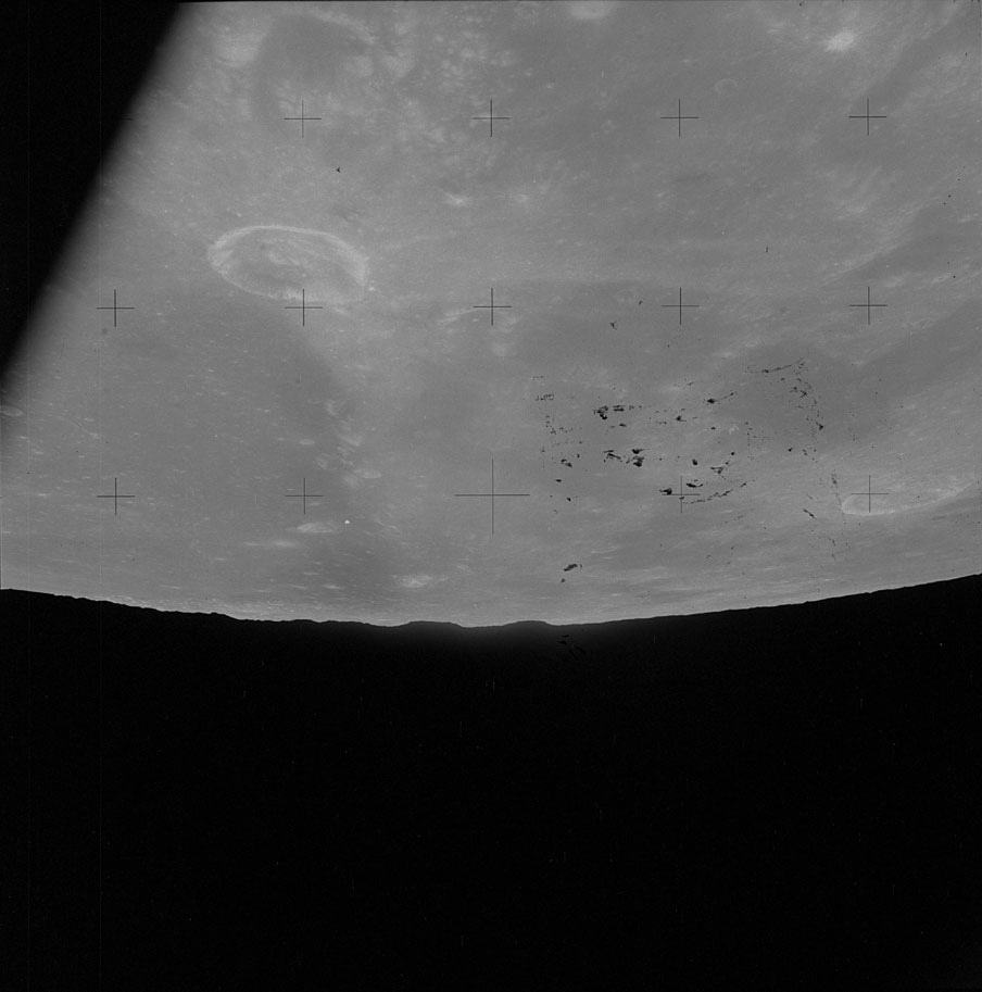 This picture was taken from the LM during CSM Rev 13 on the last pass over the landing site prior to the descent. A labeled version shows some of the prominent landmarks.Rev 16 Mapping (Metric) Camera Frame 0414 ( 13 Mb )