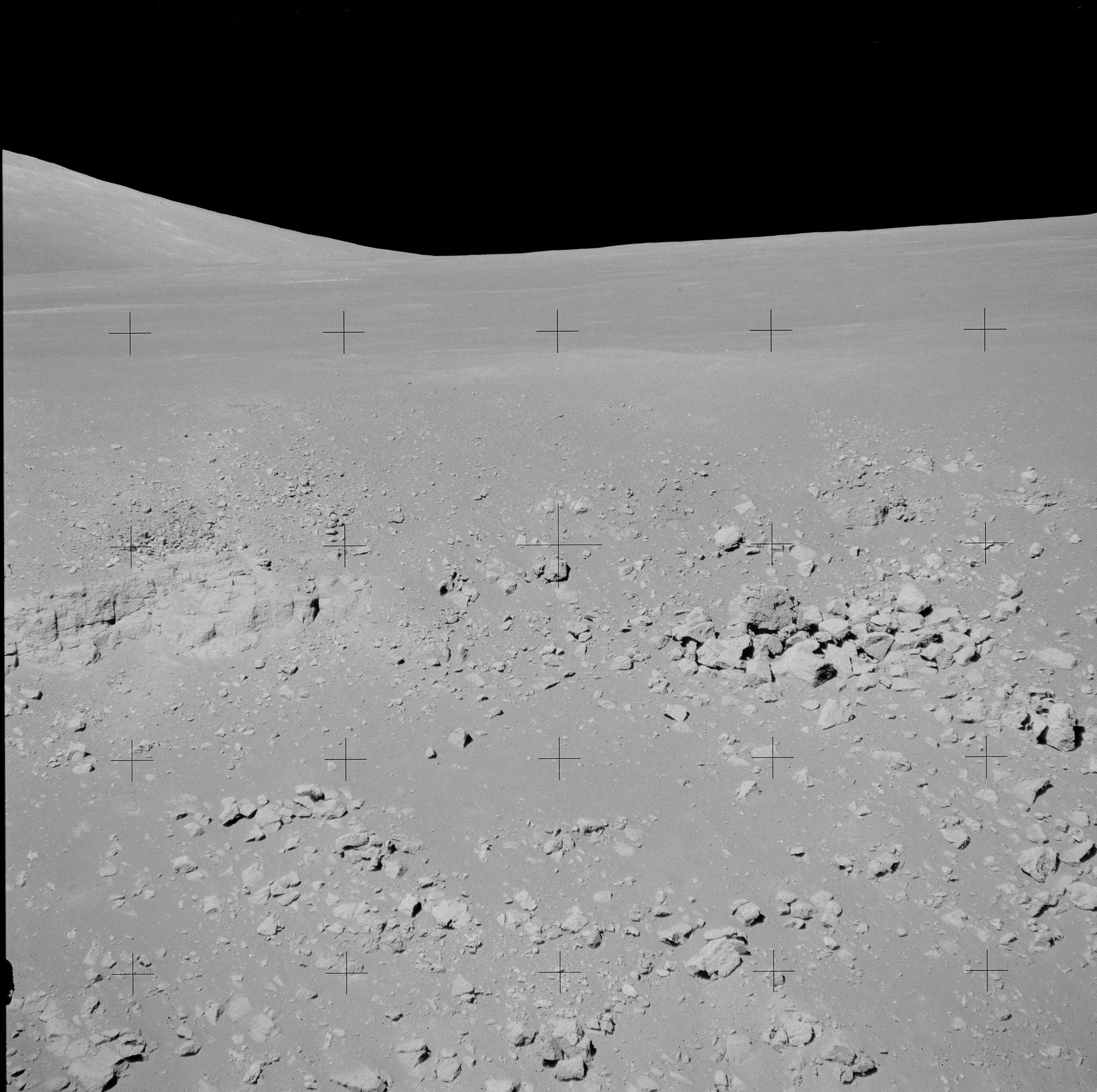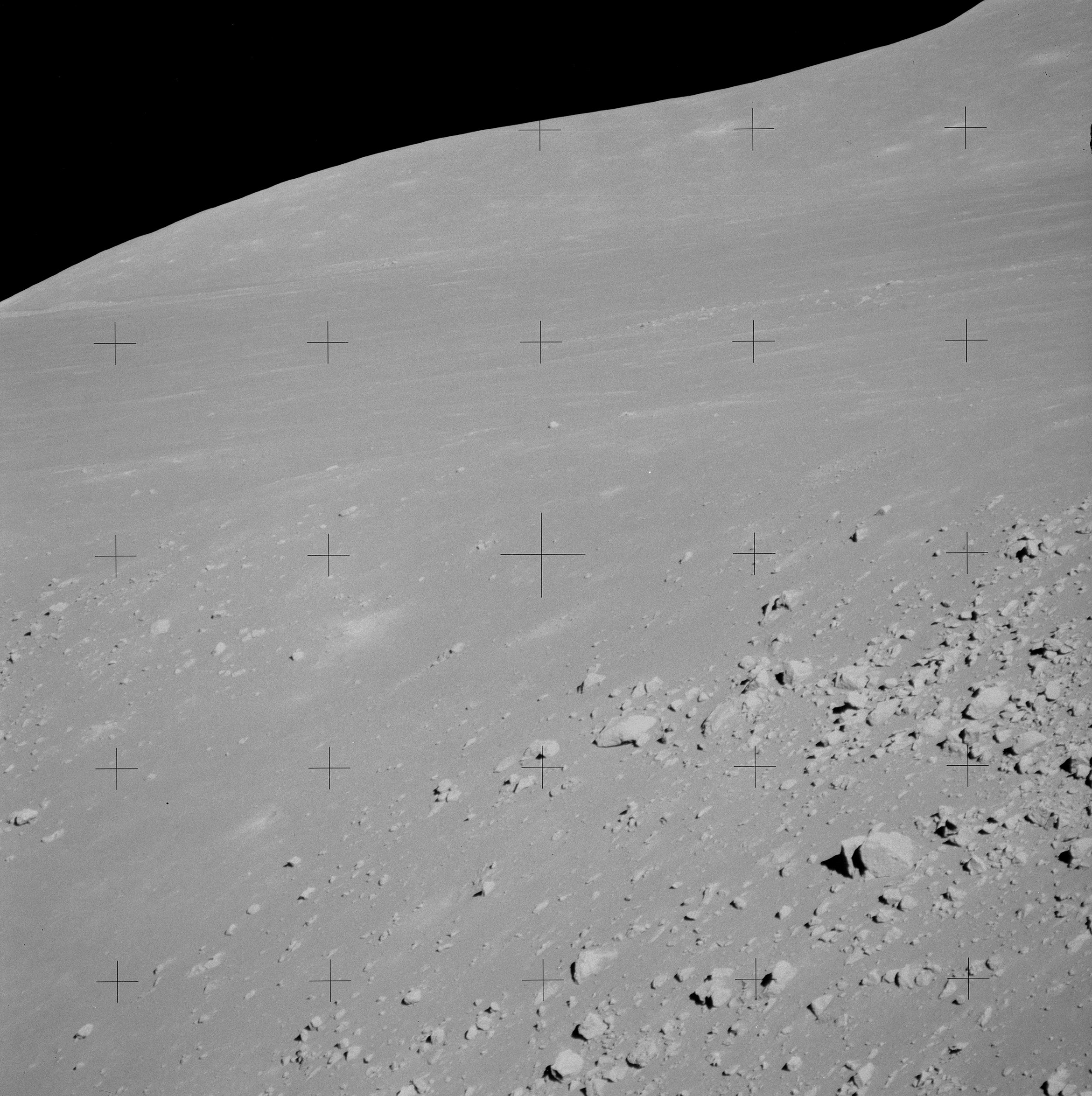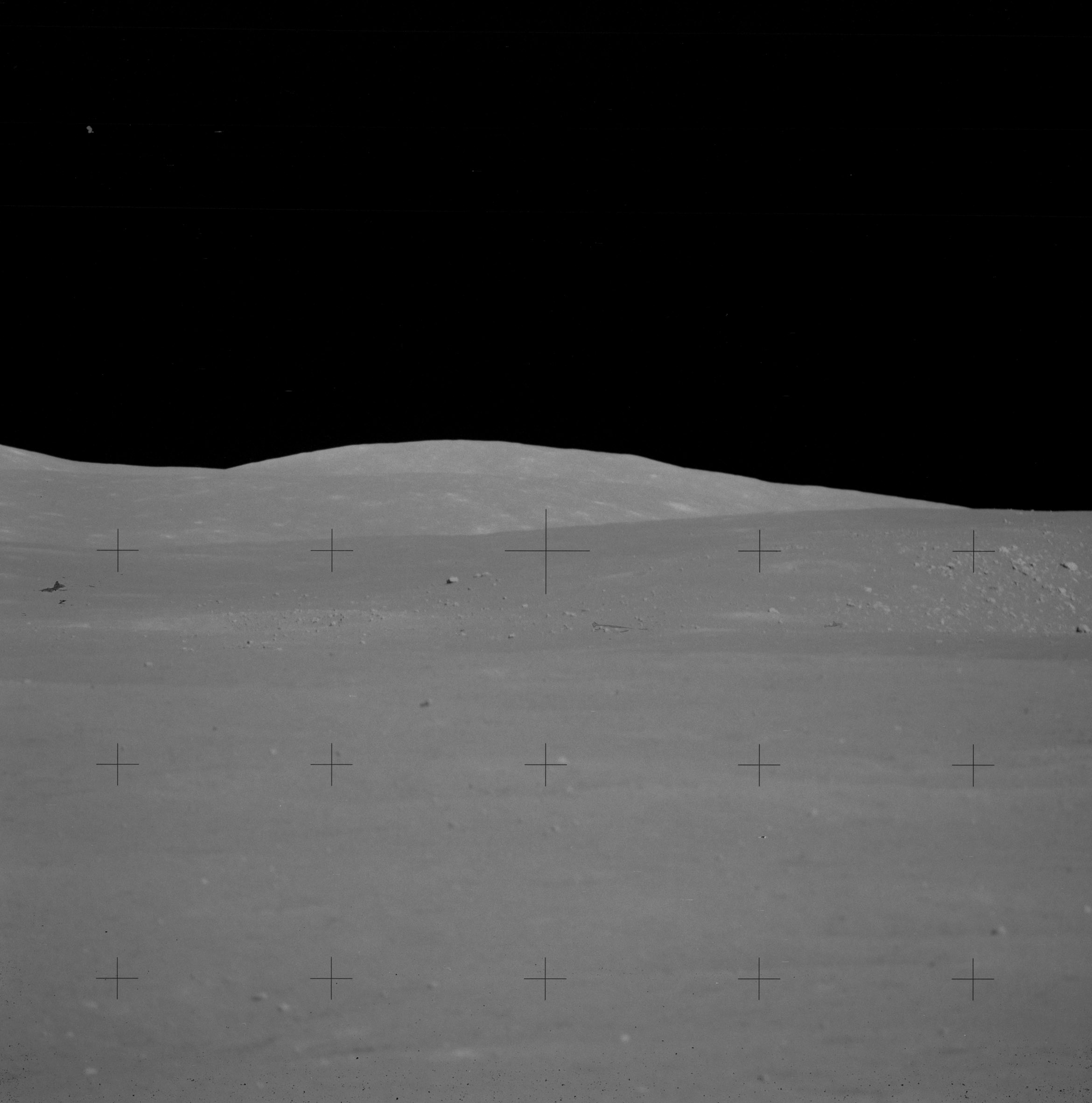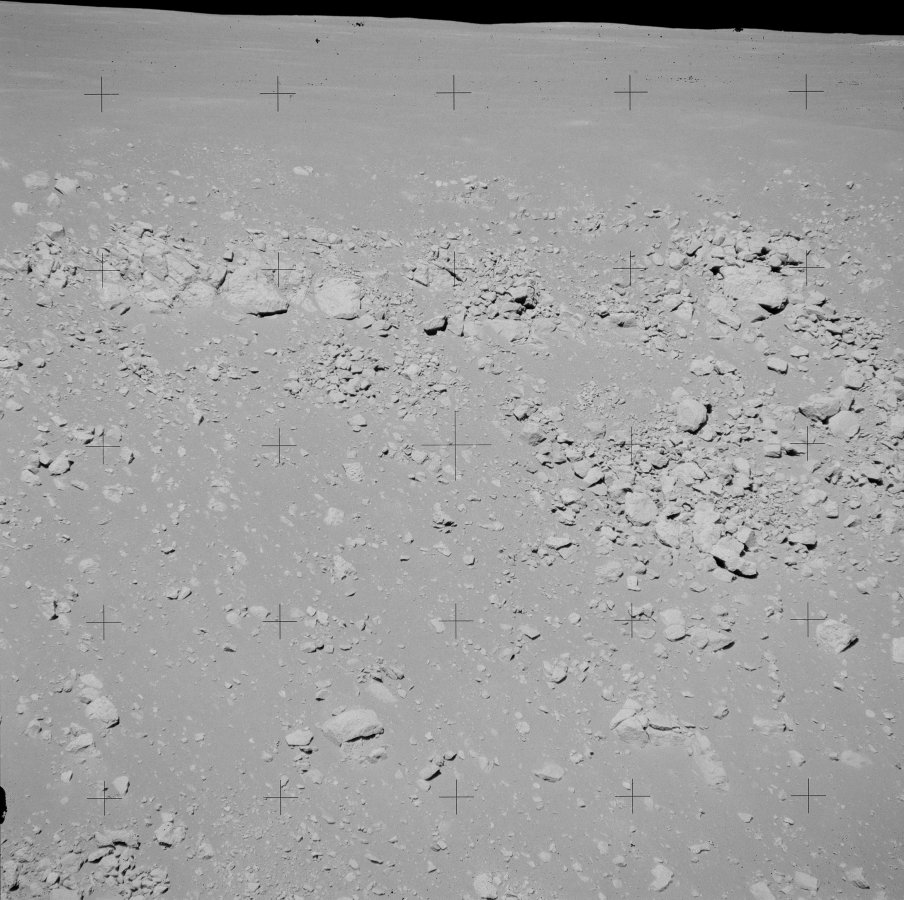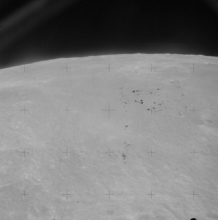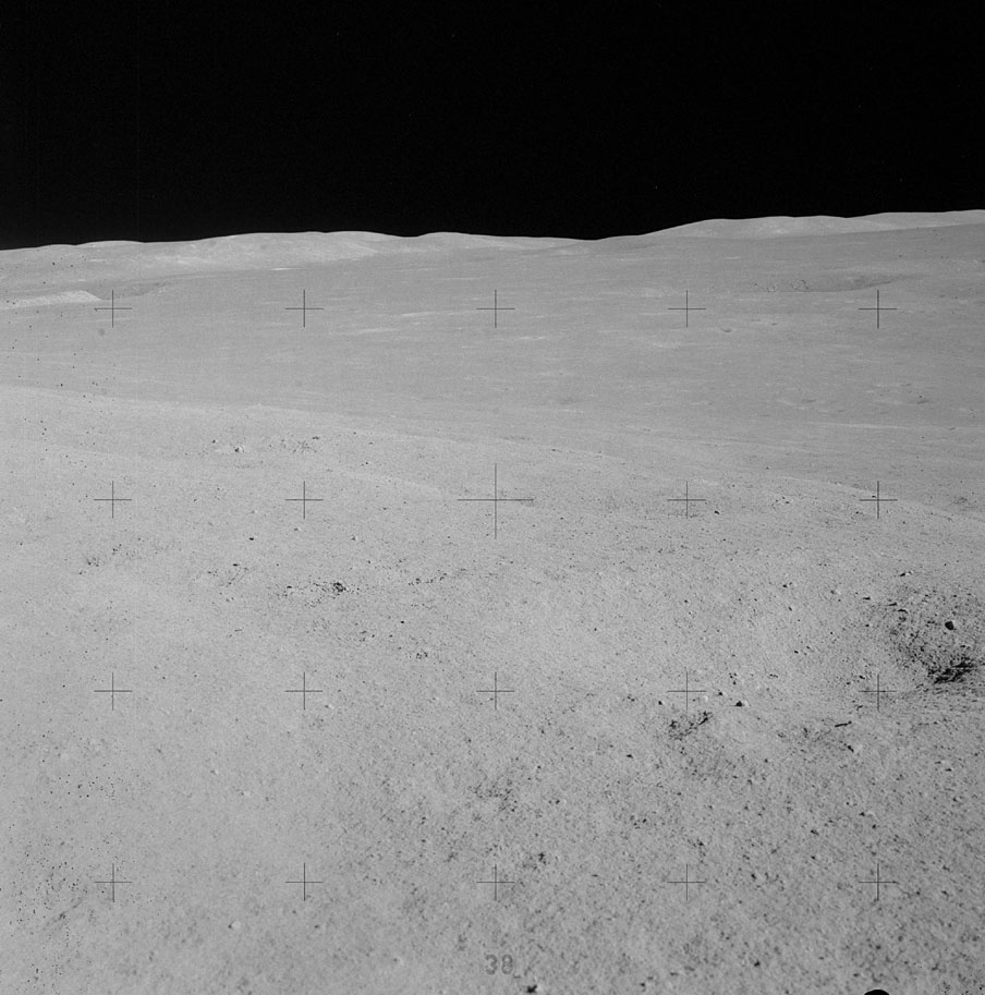 This picture was taken from the LM during CSM Rev 13 on the last pass over the landing site prior to the descent. A labeled version shows some of the prominent landmarks.Rev 16 Mapping (Metric) Camera Frame 0414 ( 13 Mb )