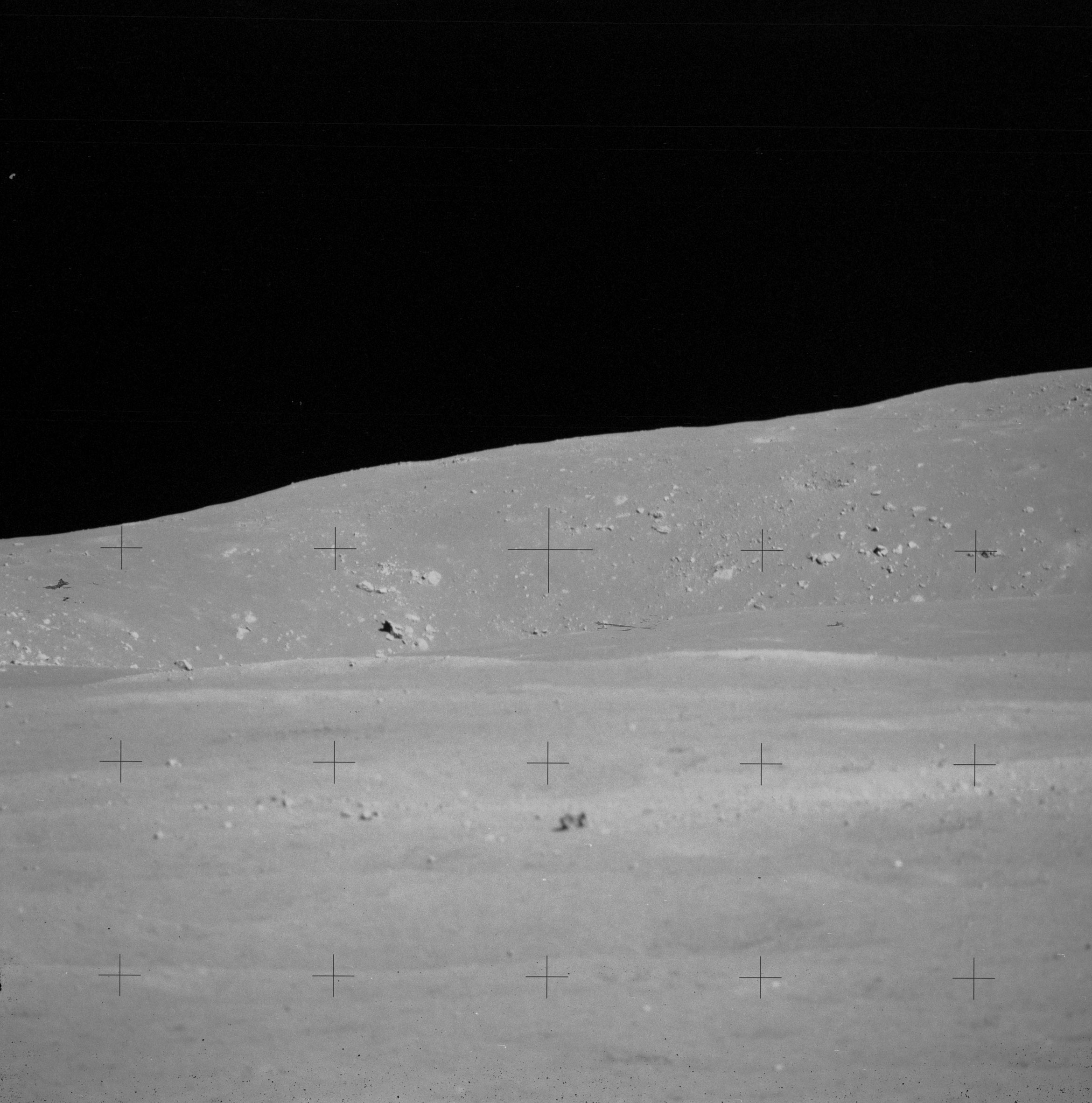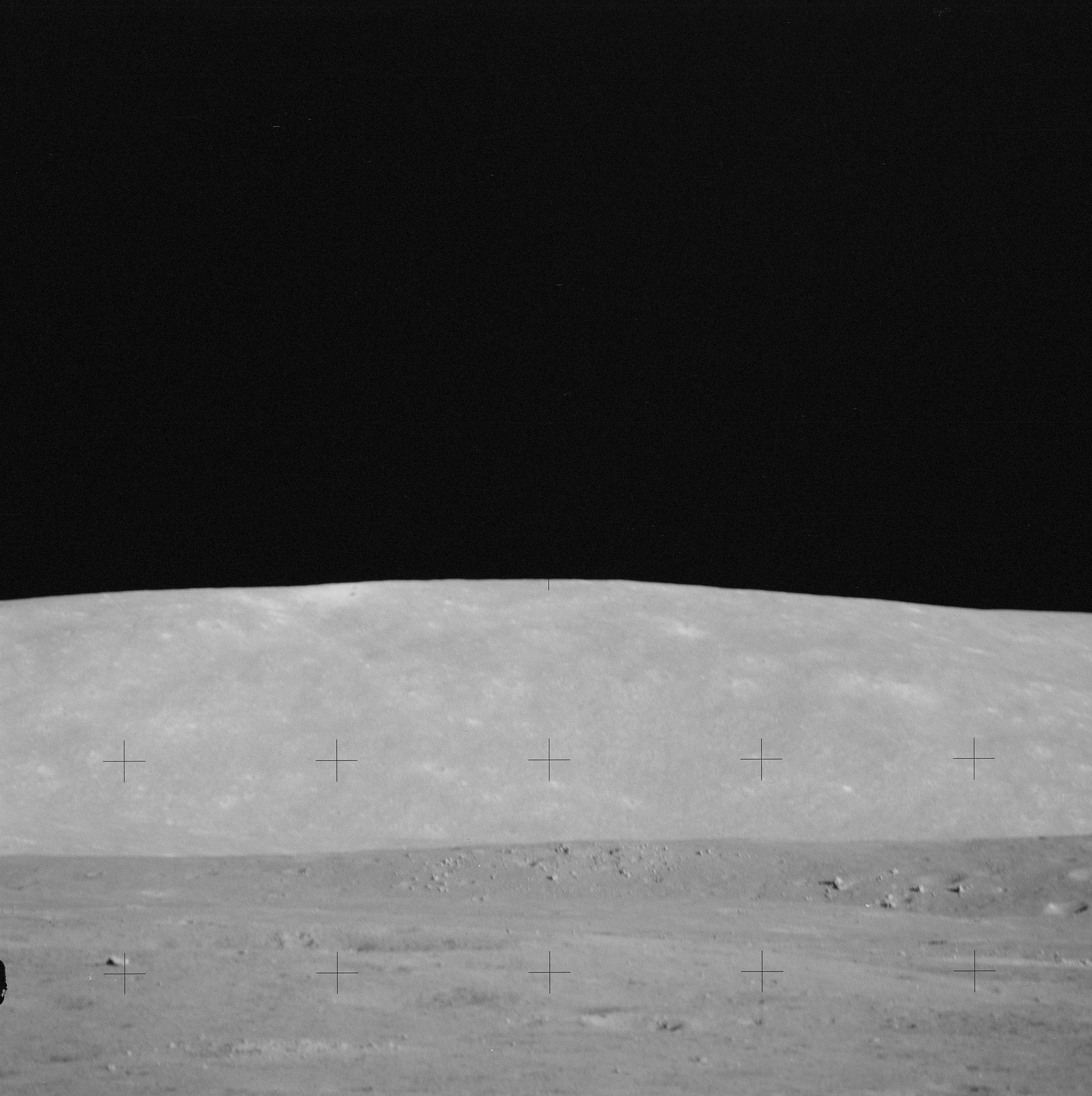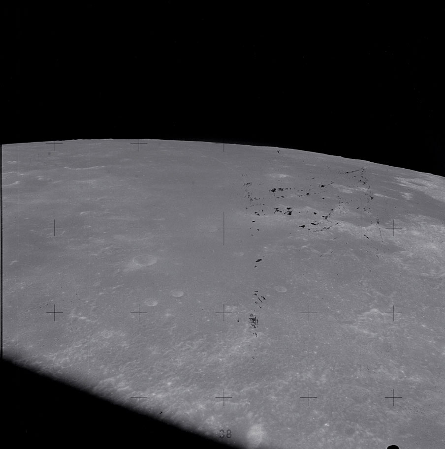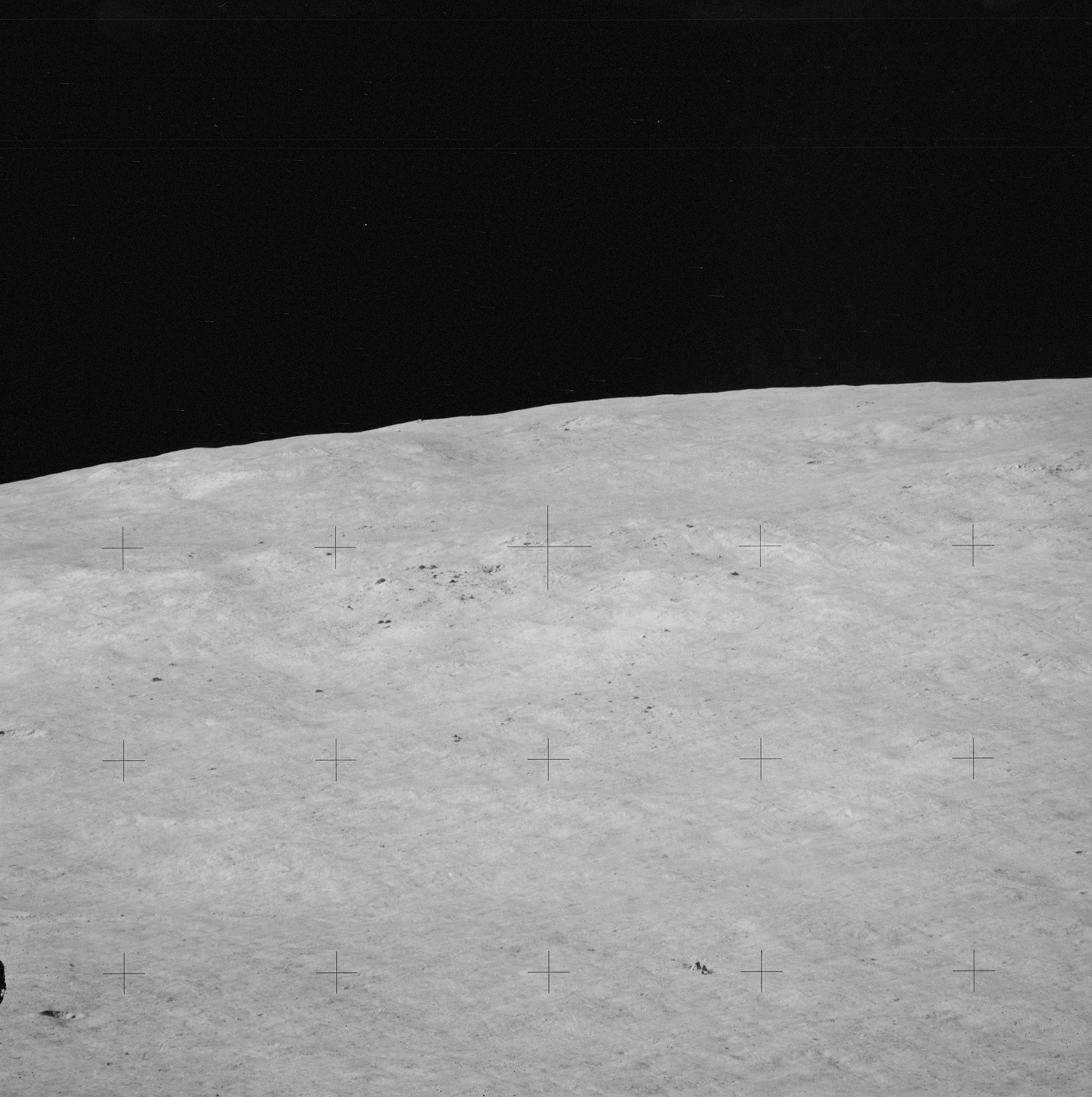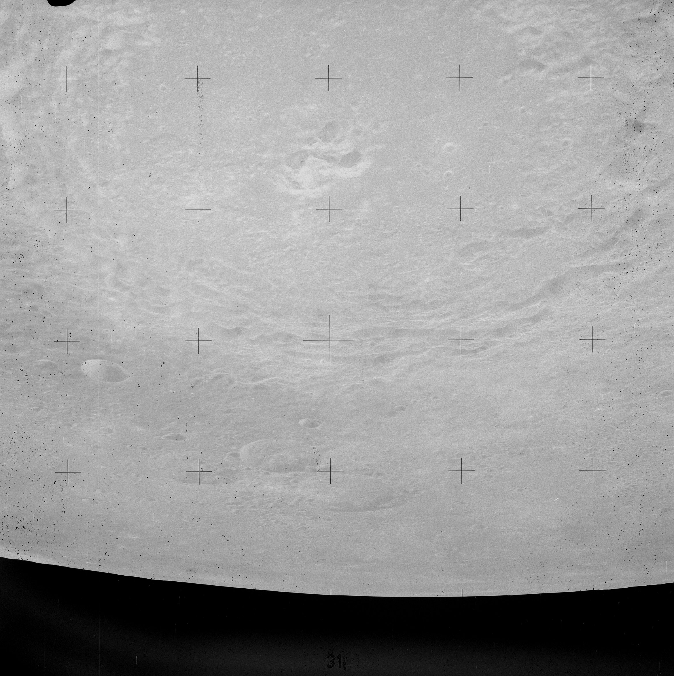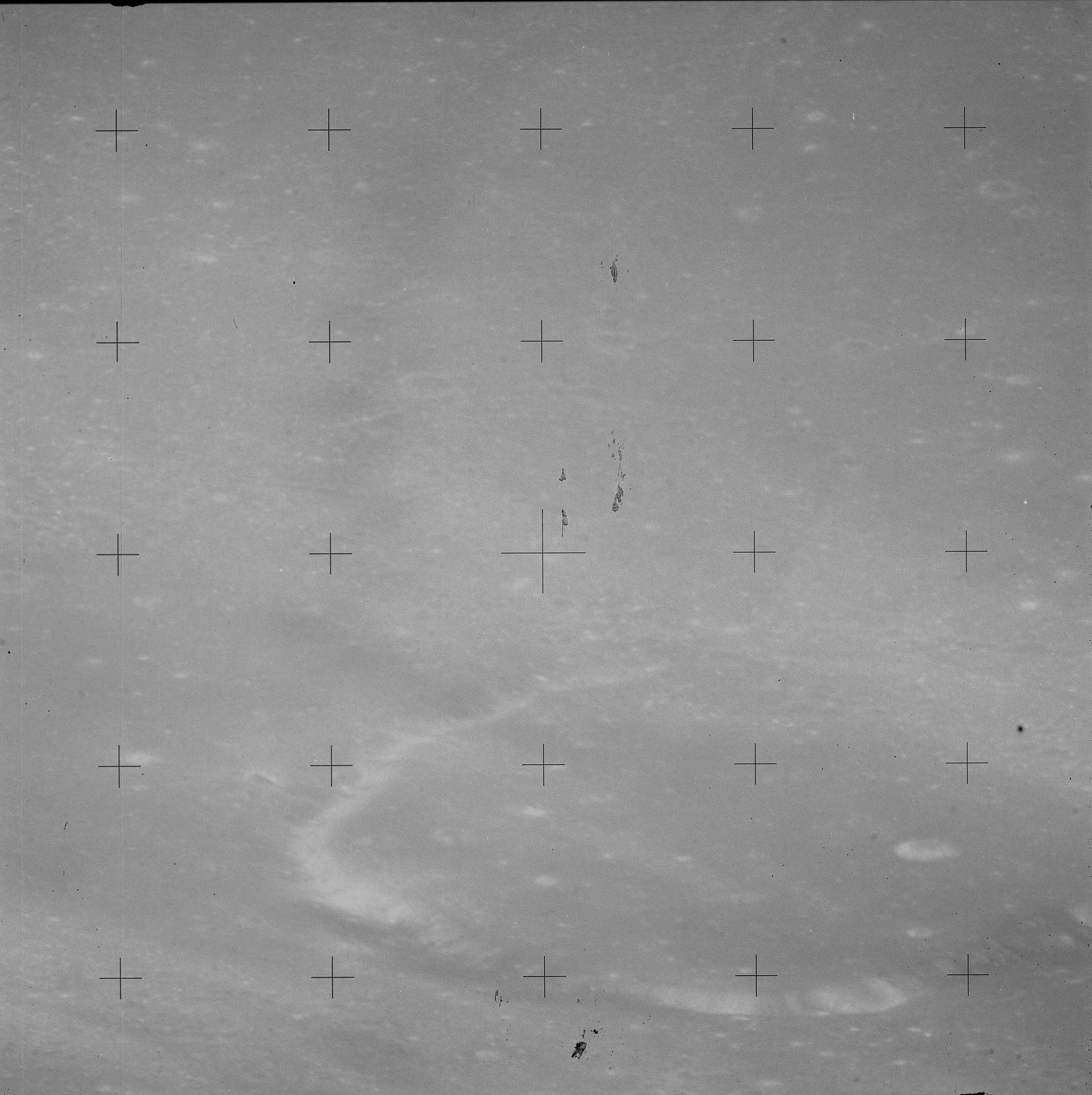 This picture was taken from the LM during CSM Rev 13 on the last pass over the landing site prior to the descent. A labeled version shows some of the prominent landmarks.Rev 16 Mapping (Metric) Camera Frame 0414 ( 13 Mb )