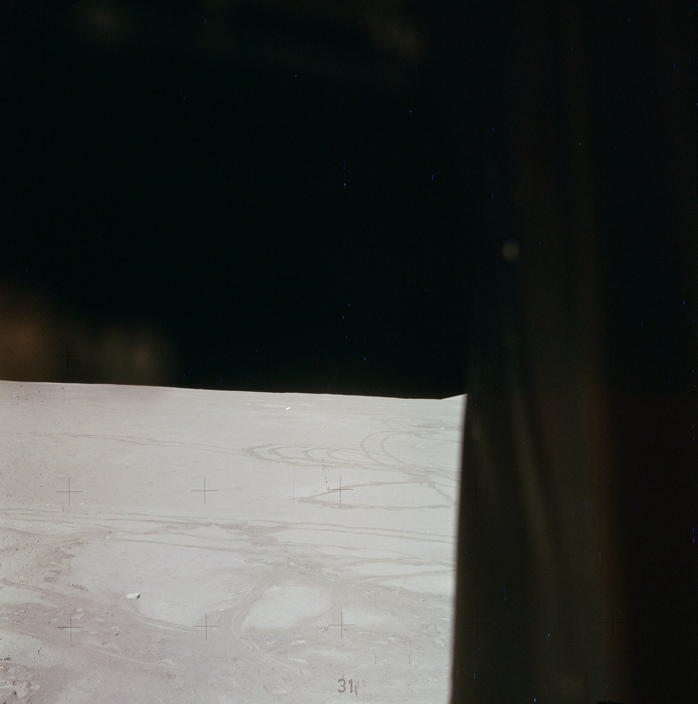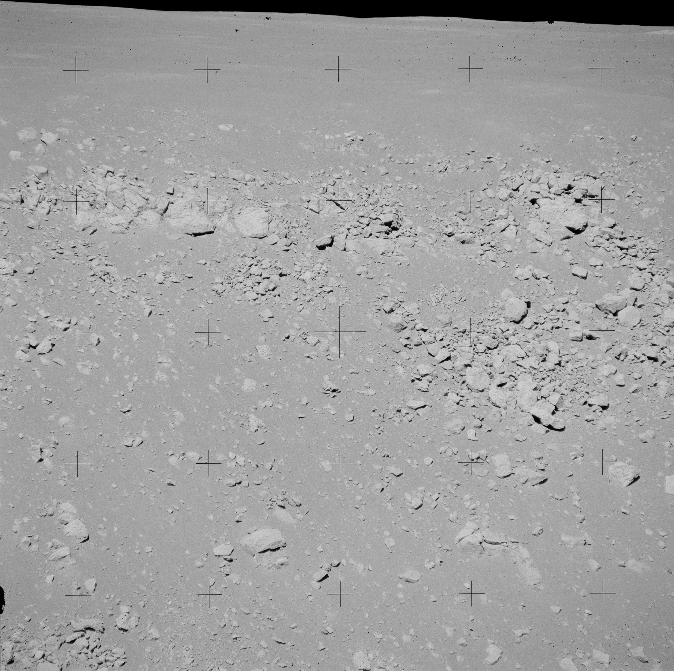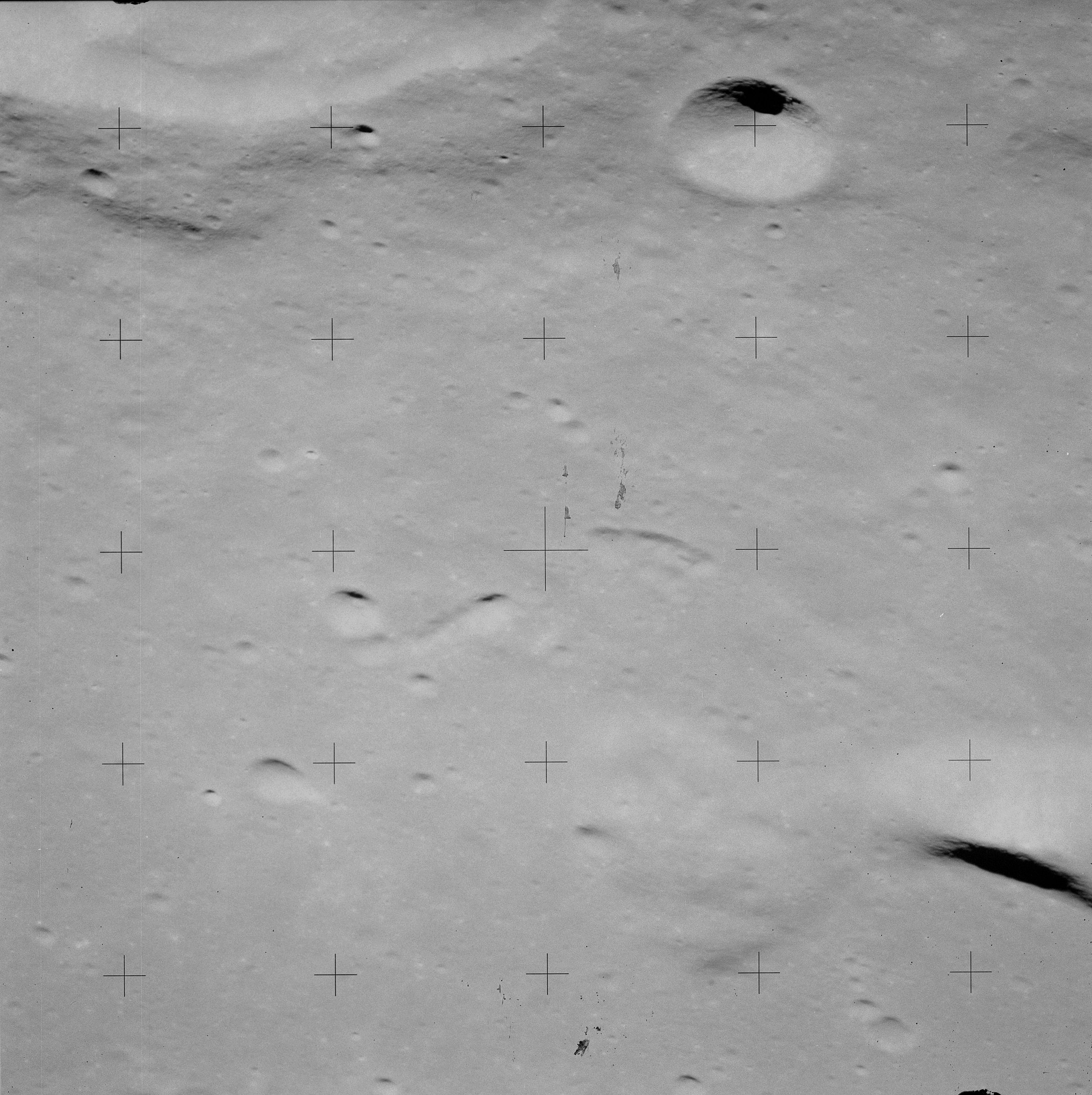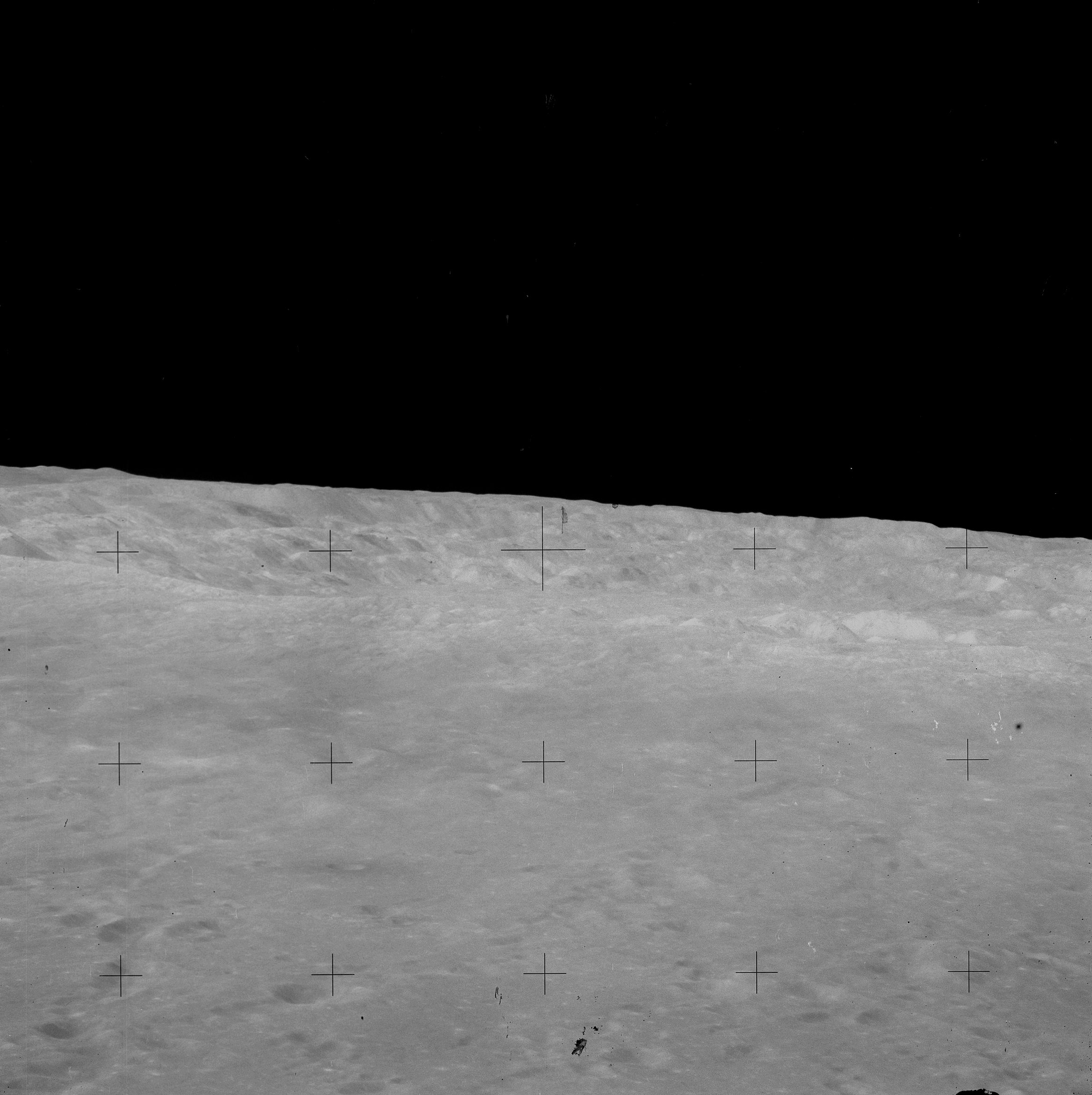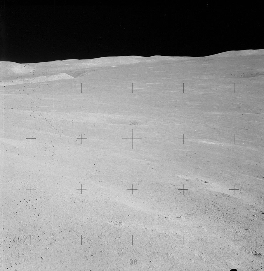 This picture was taken from the LM during CSM Rev 13 on the last pass over the landing site prior to the descent. A labeled version shows some of the prominent landmarks.Rev 16 Mapping (Metric) Camera Frame 0414 ( 13 Mb )