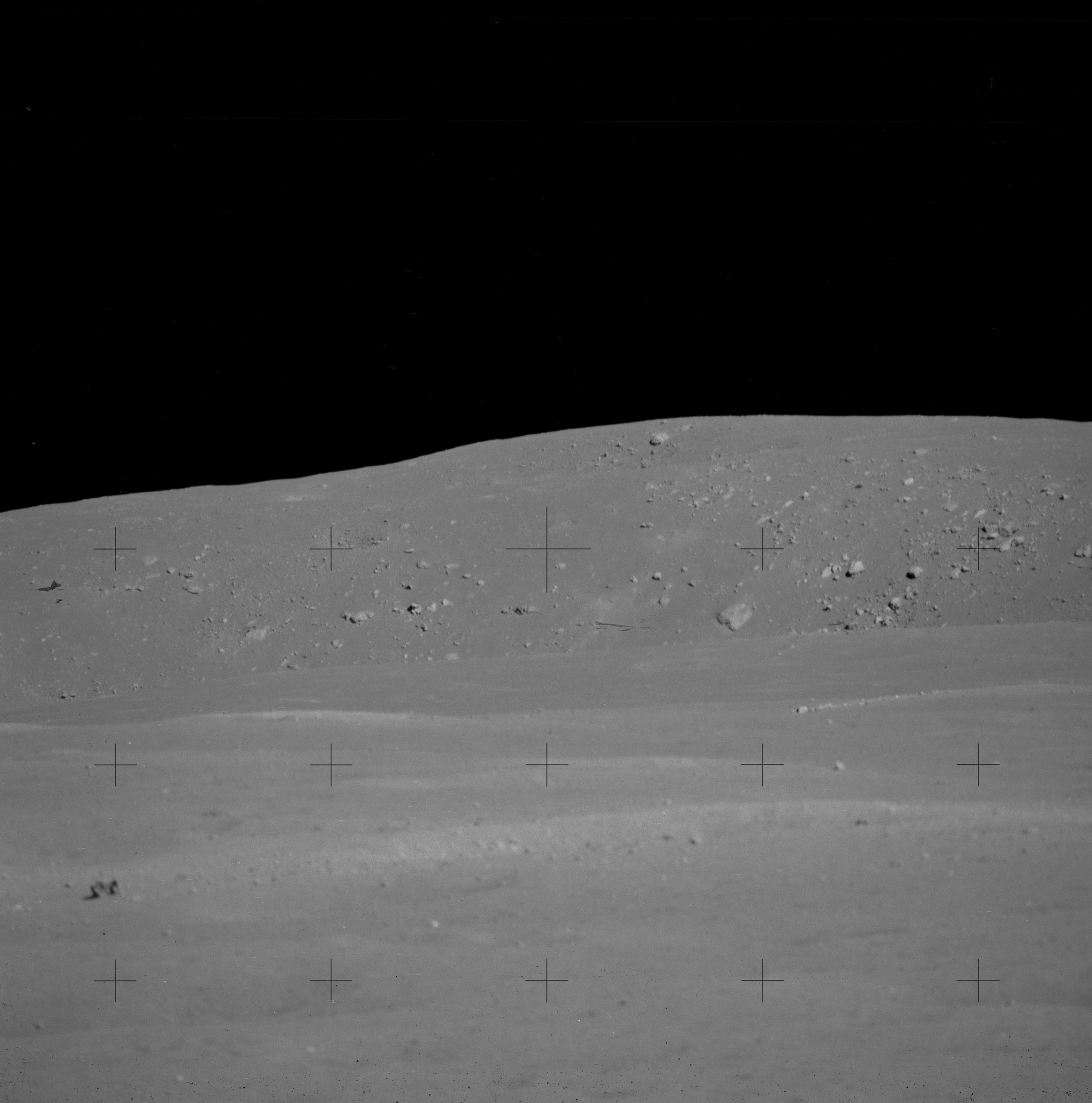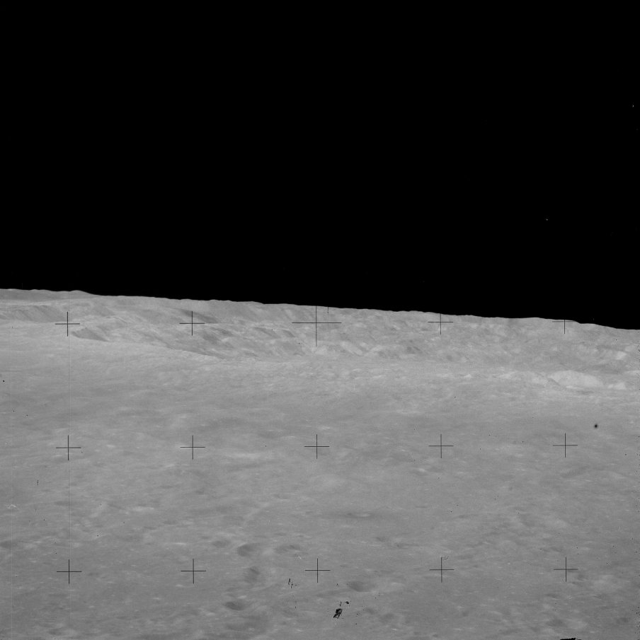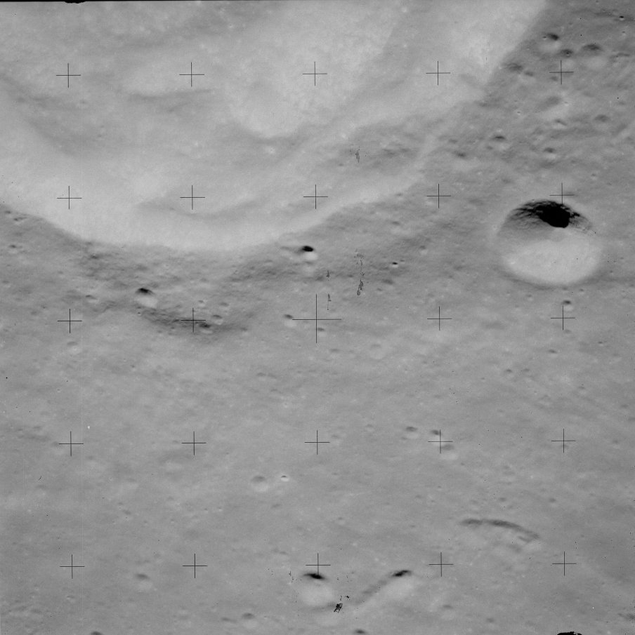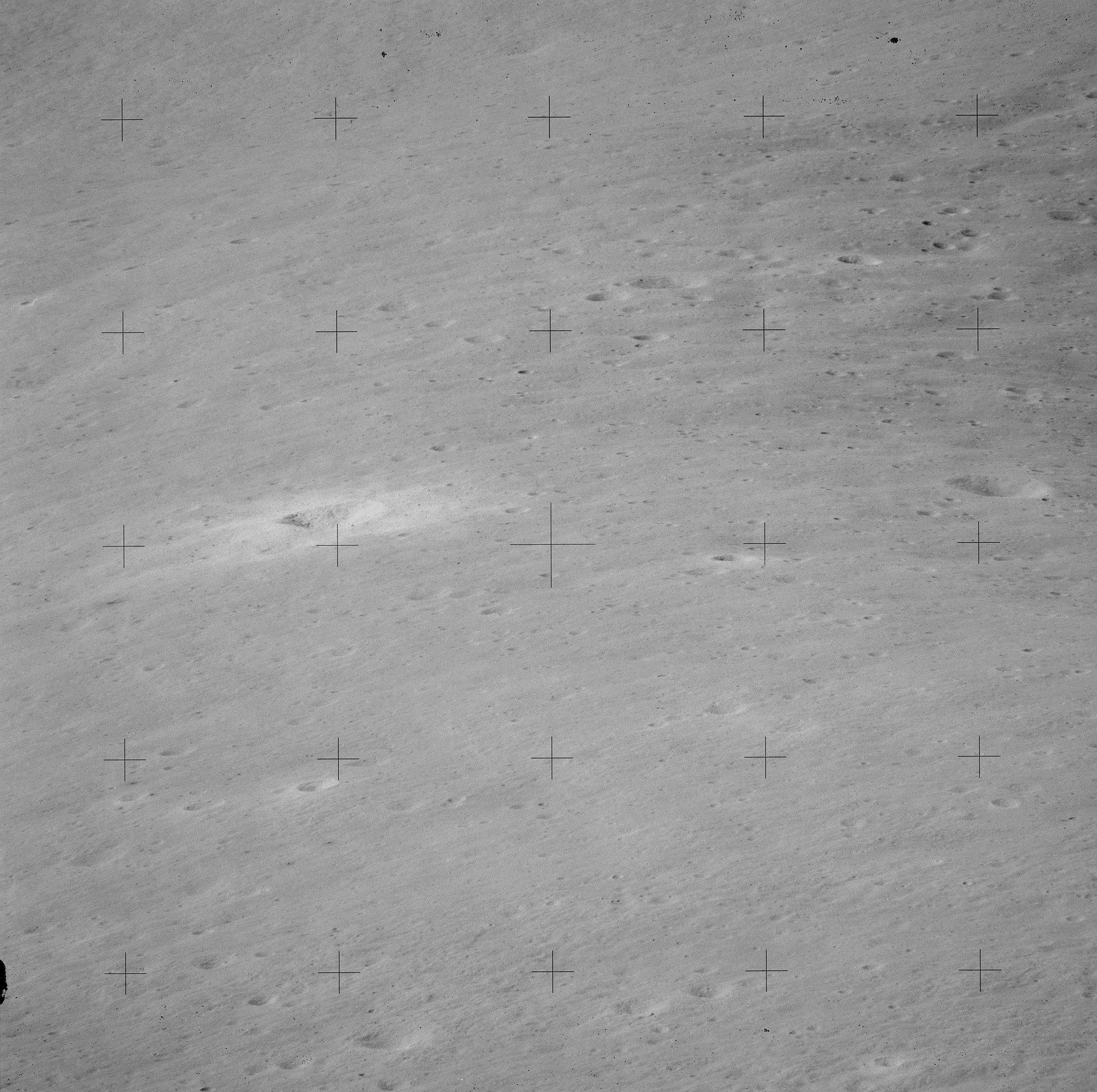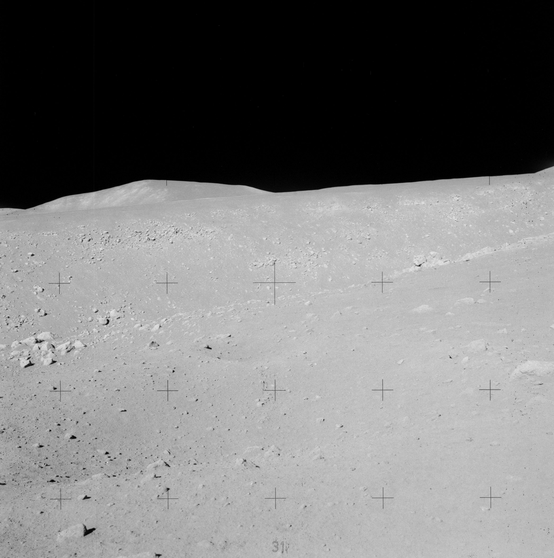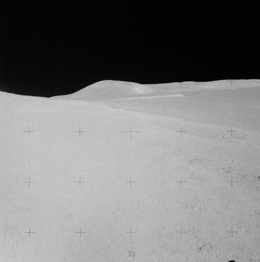 This picture was taken from the LM during CSM Rev 13 on the last pass over the landing site prior to the descent. A labeled version shows some of the prominent landmarks.Rev 16 Mapping (Metric) Camera Frame 0414 ( 13 Mb )