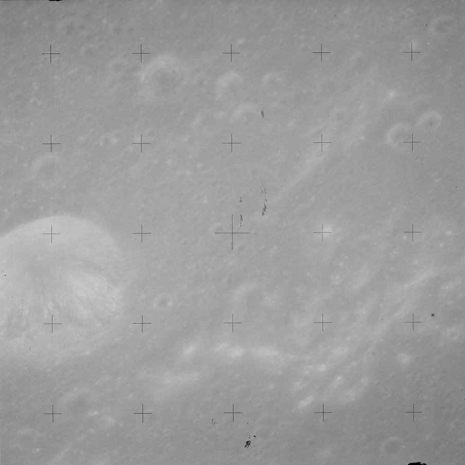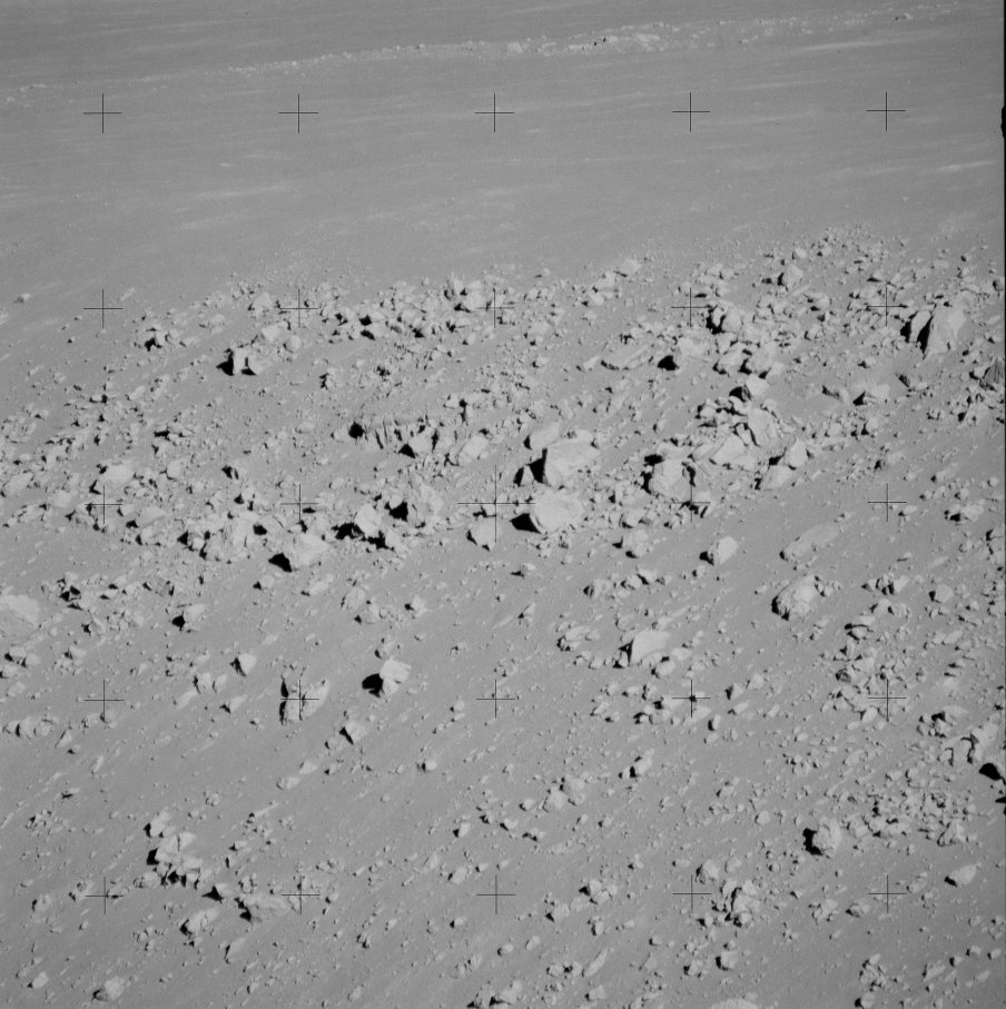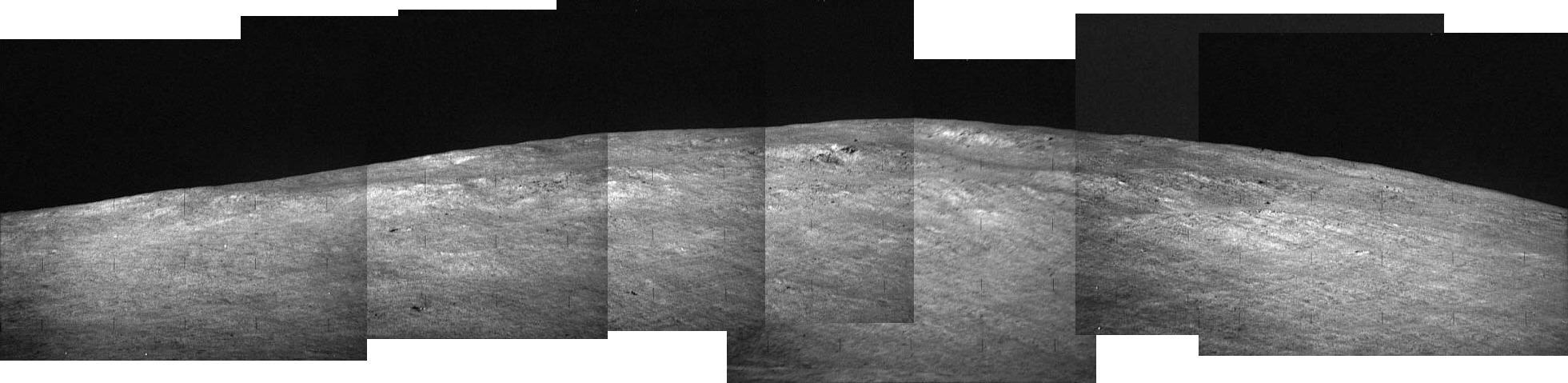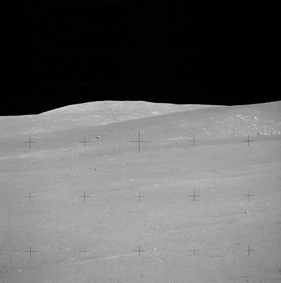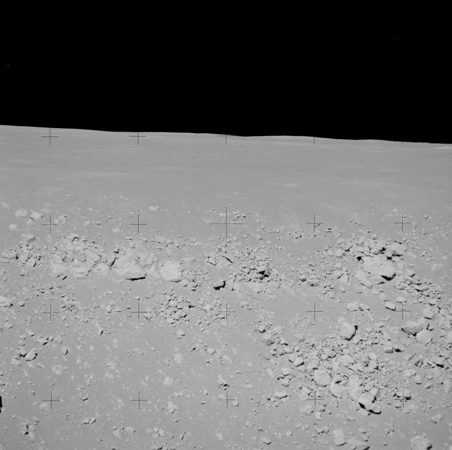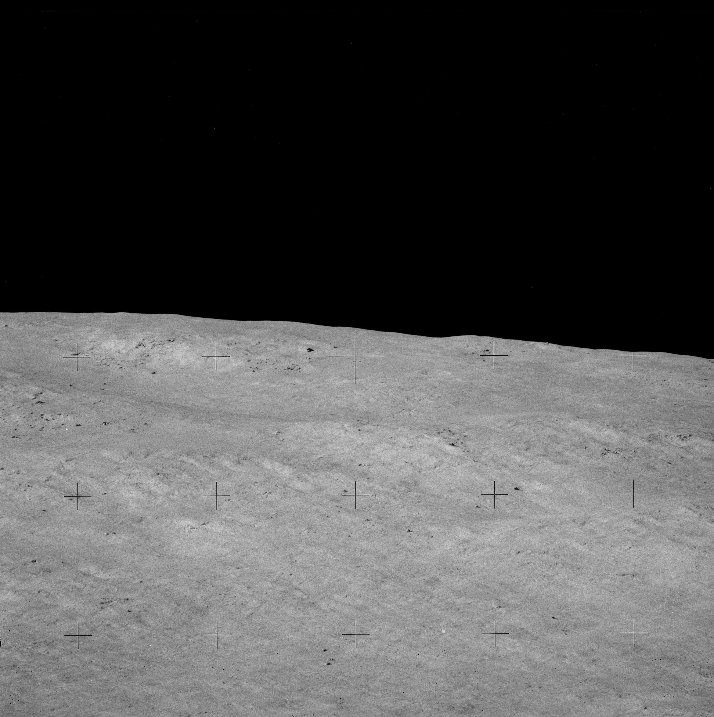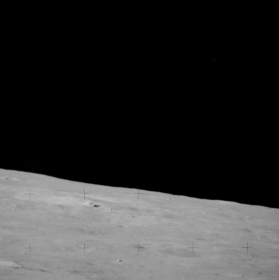 This picture was taken from the LM during CSM Rev 13 on the last pass over the landing site prior to the descent. A labeled version shows some of the prominent landmarks.Rev 16 Mapping (Metric) Camera Frame 0414 ( 13 Mb )