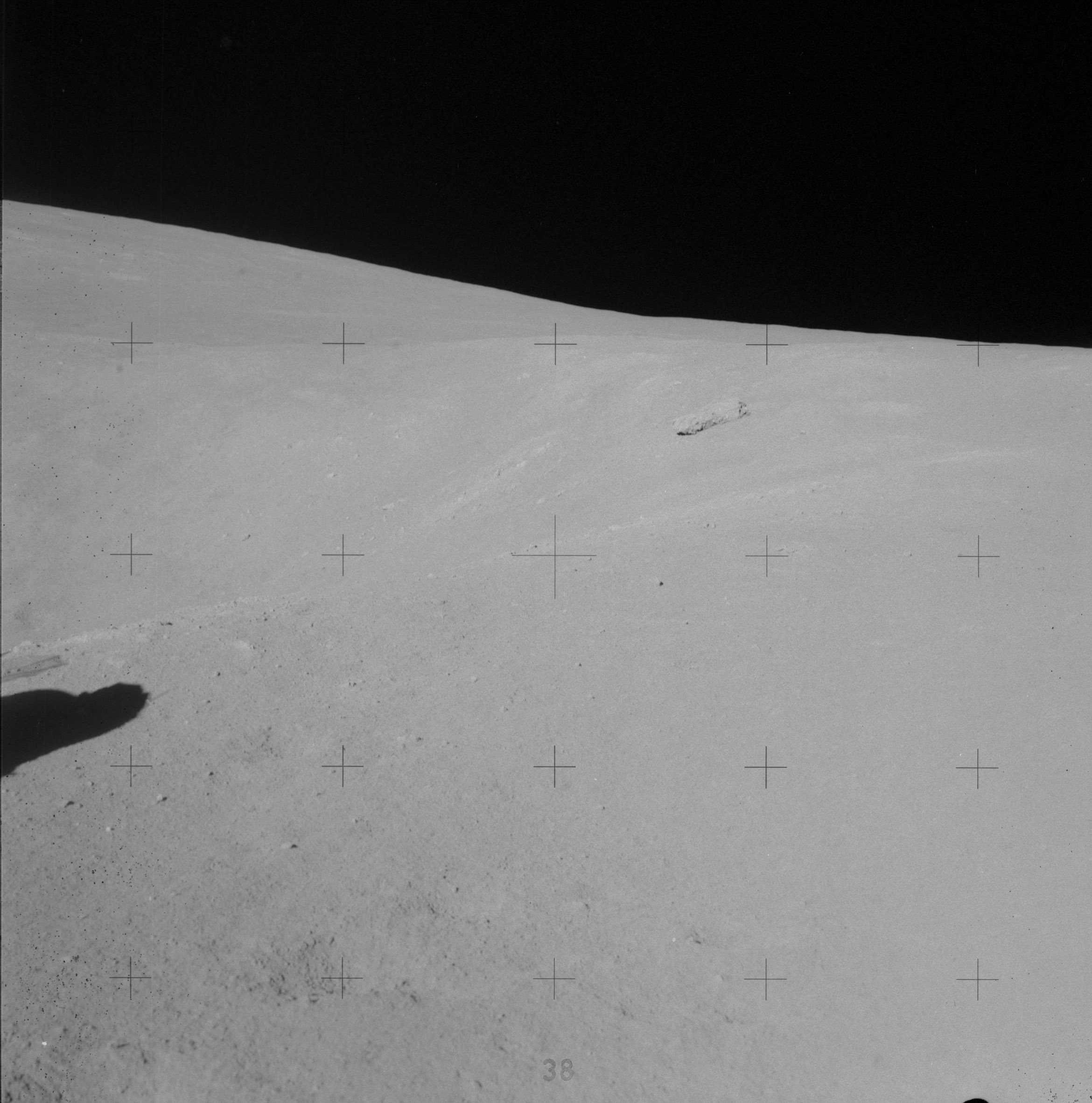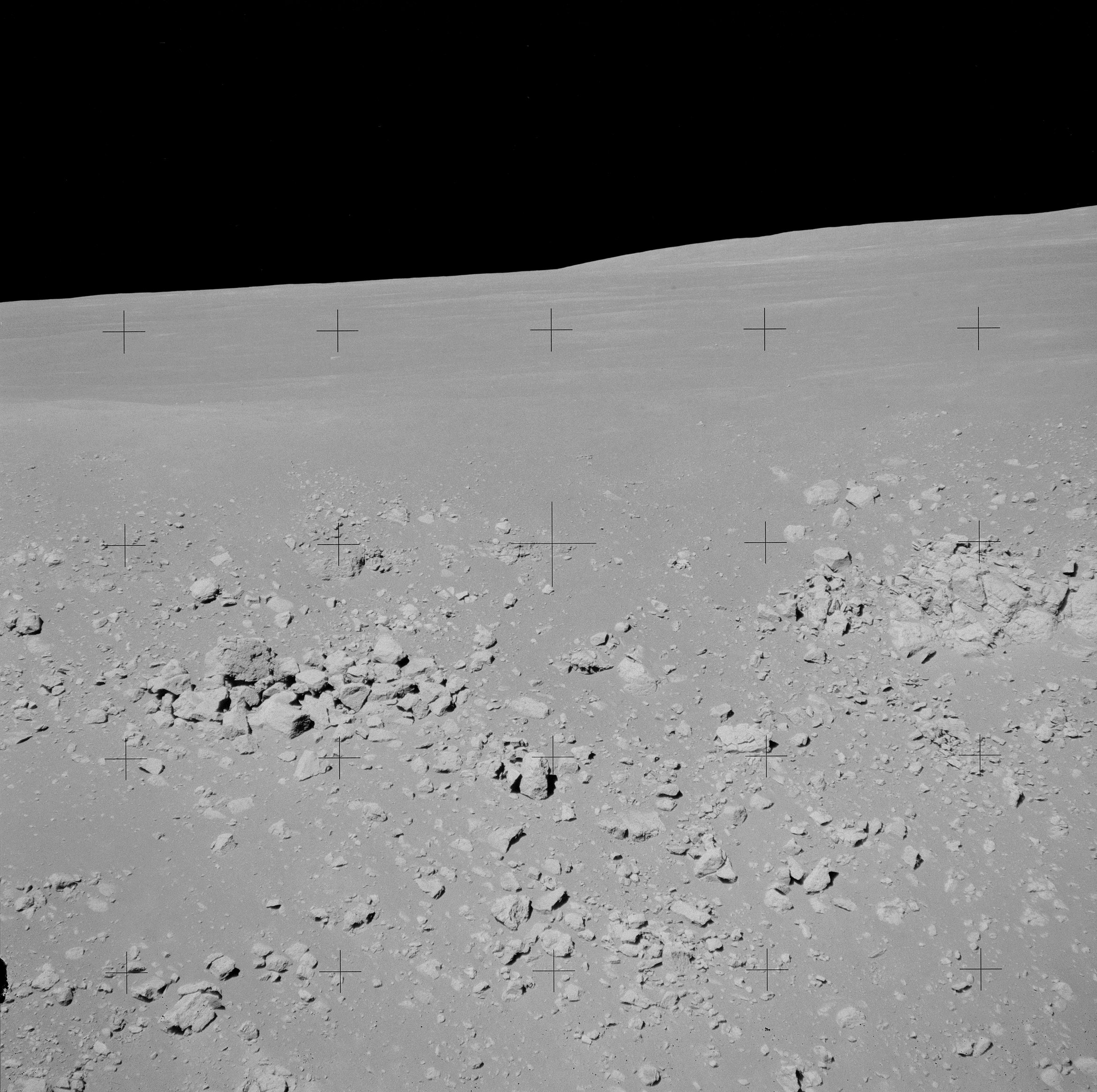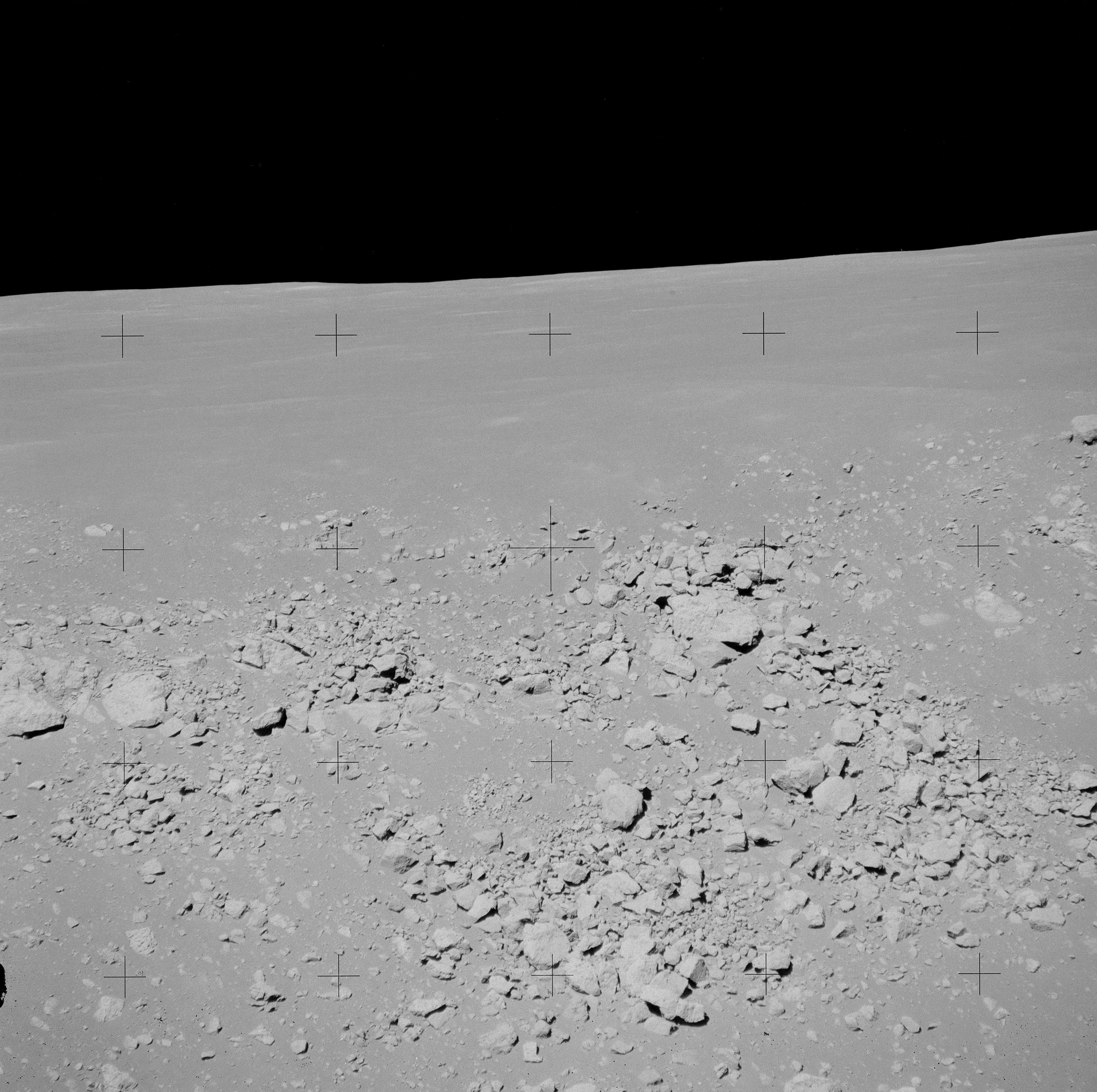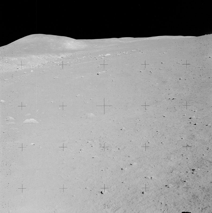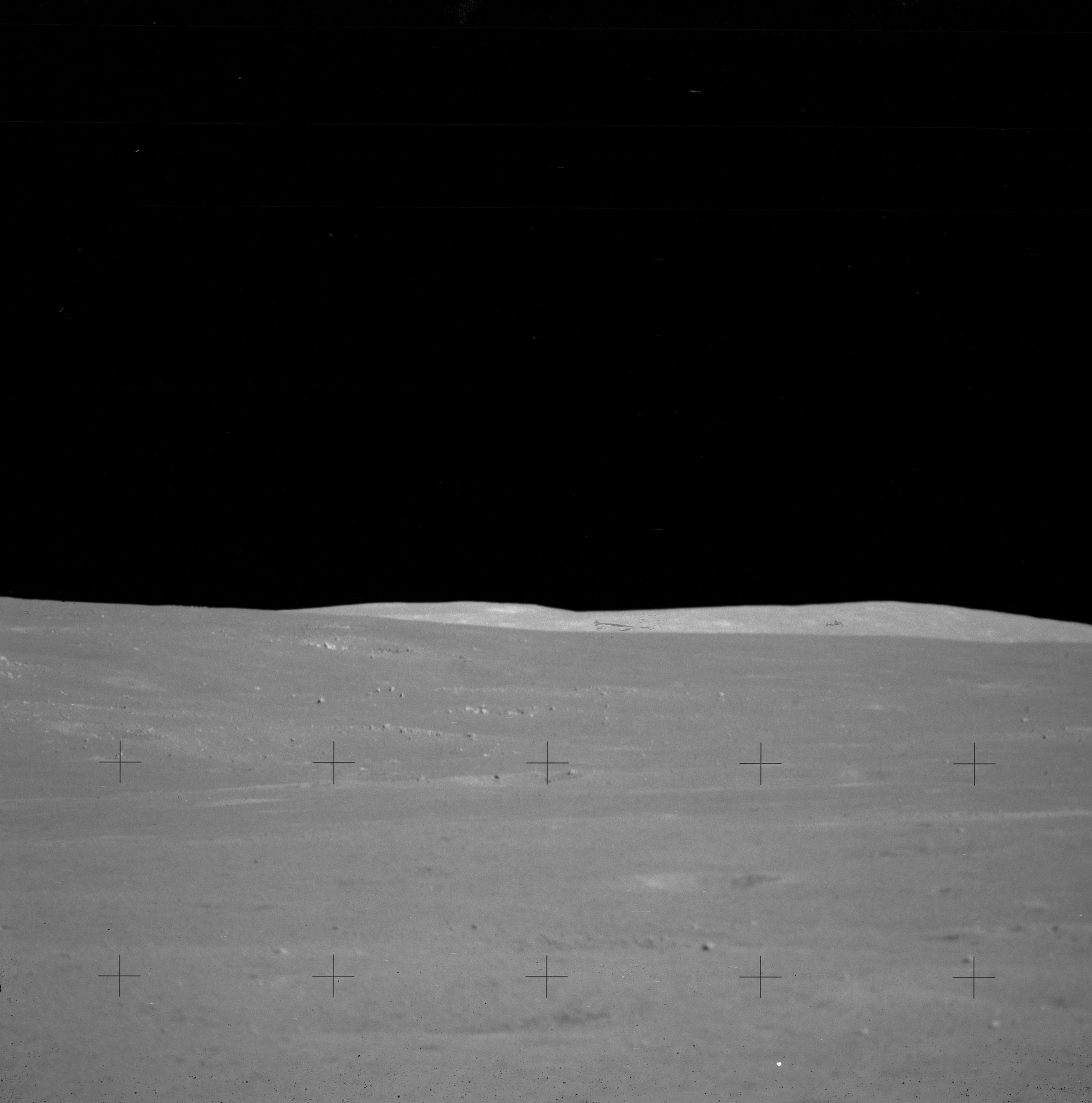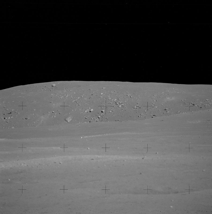 This picture was taken from the LM during CSM Rev 13 on the last pass over the landing site prior to the descent. A labeled version shows some of the prominent landmarks.Rev 16 Mapping (Metric) Camera Frame 0414 ( 13 Mb )