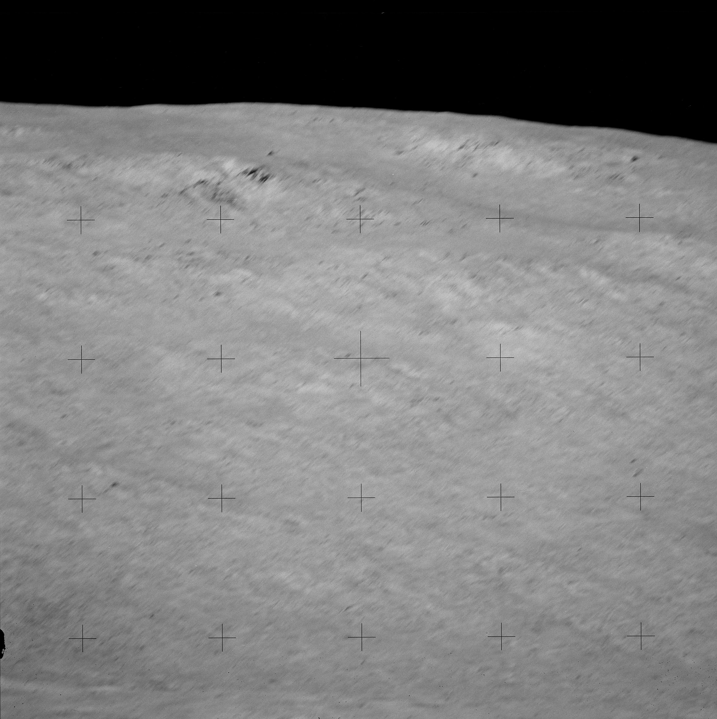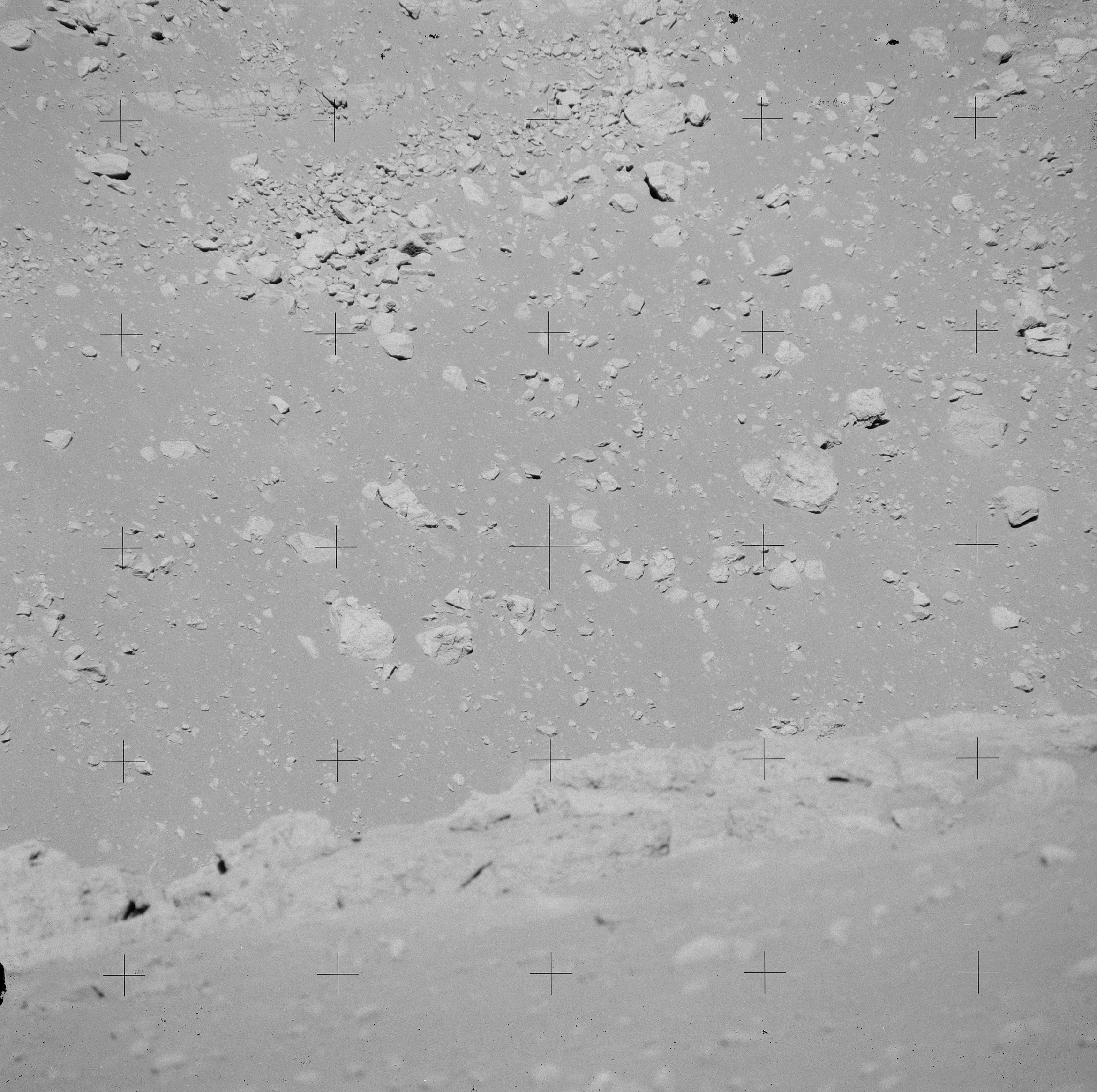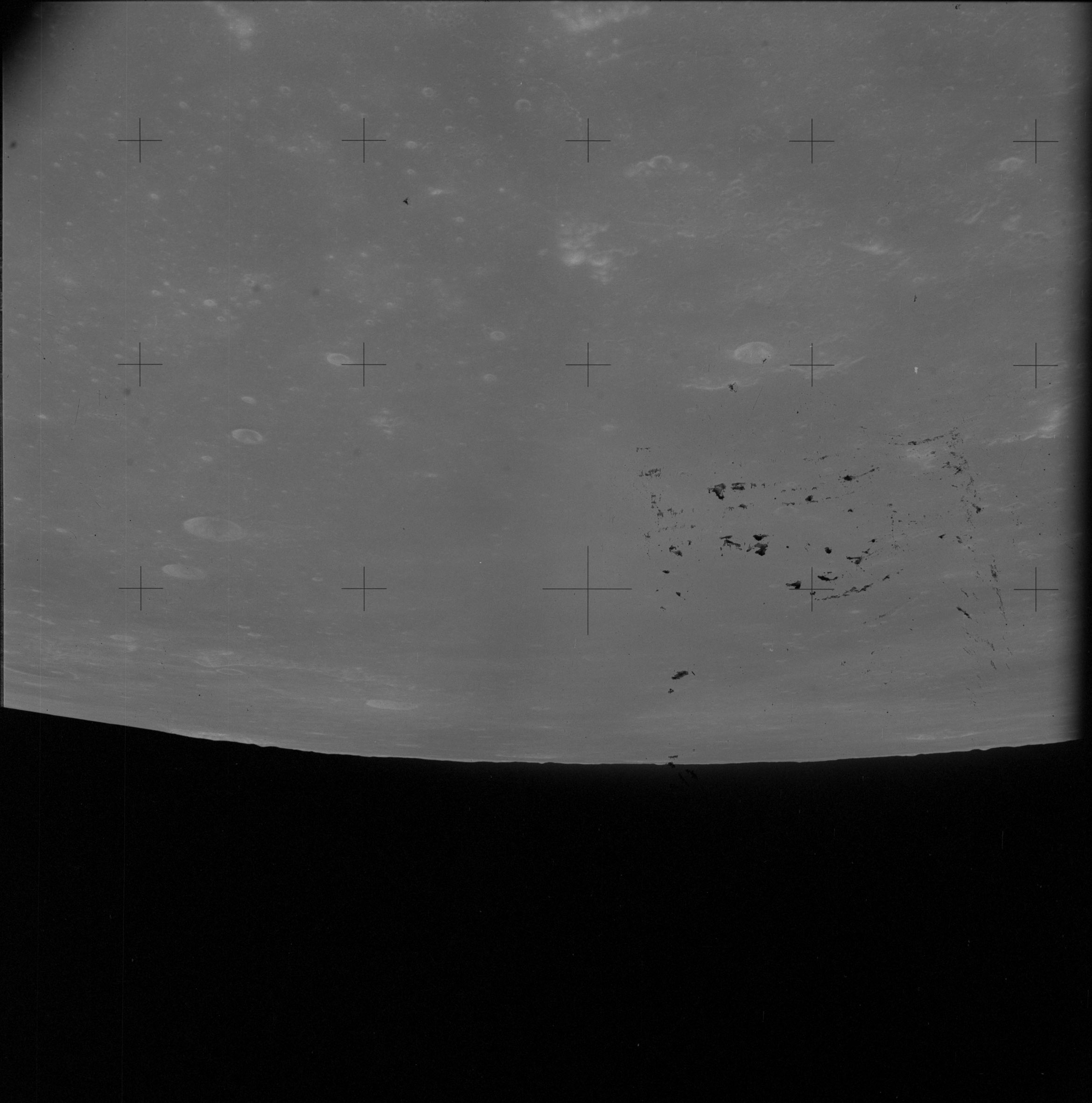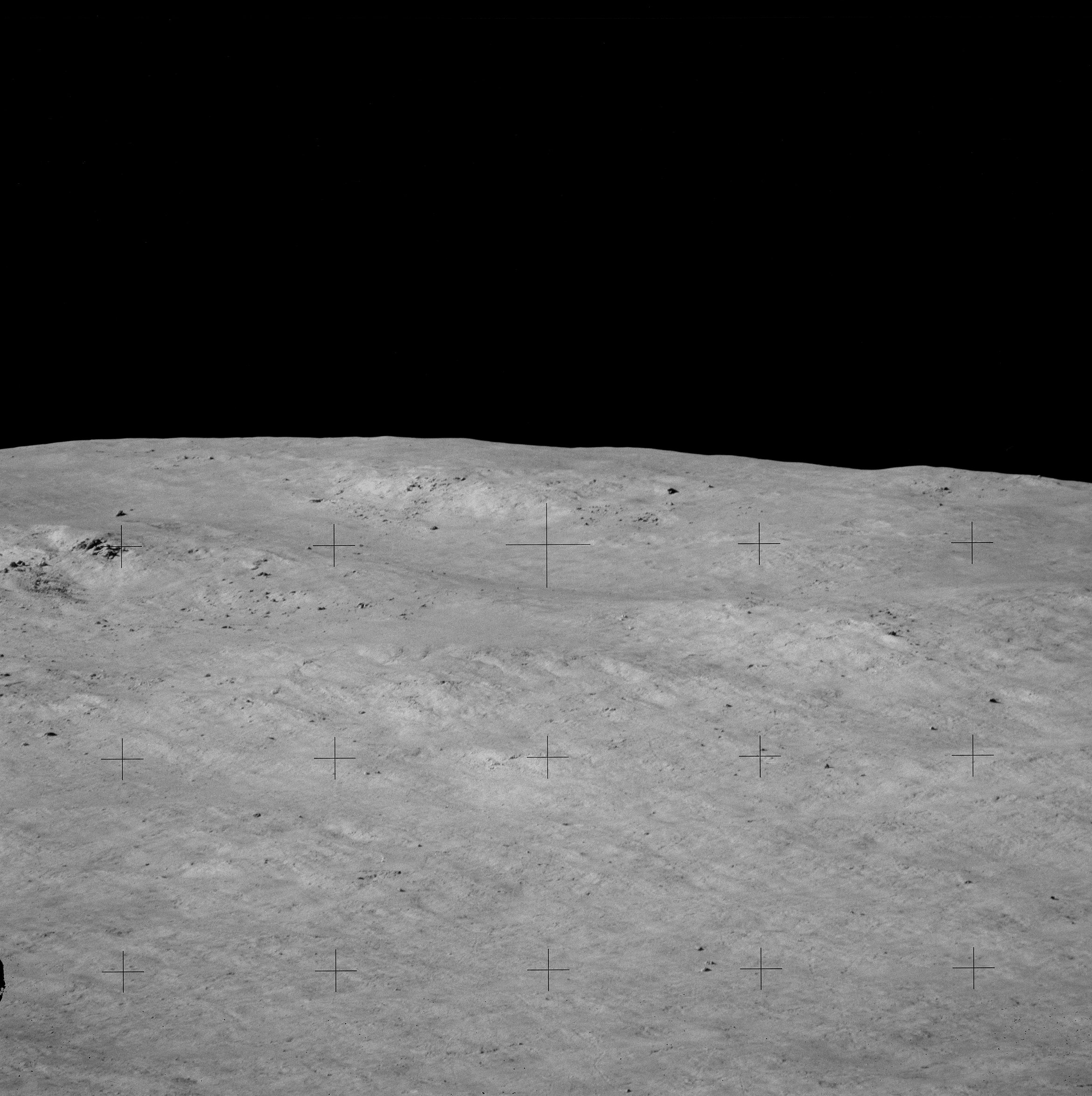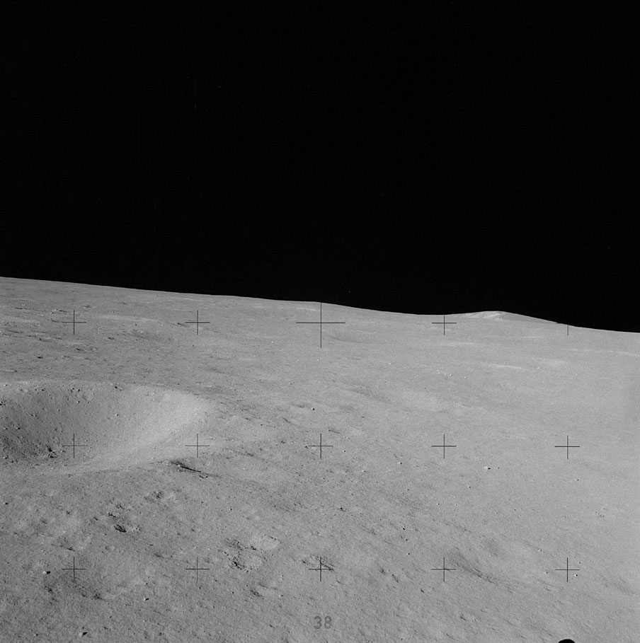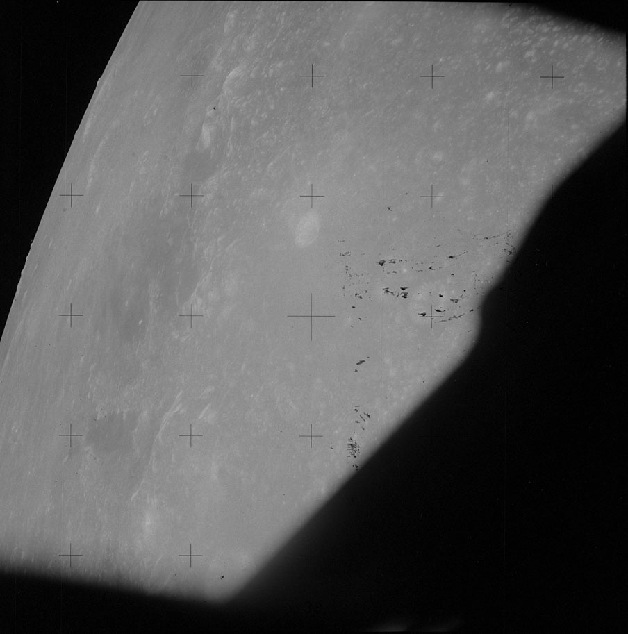 This picture was taken from the LM during CSM Rev 13 on the last pass over the landing site prior to the descent. A labeled version shows some of the prominent landmarks.Rev 16 Mapping (Metric) Camera Frame 0414 ( 13 Mb )