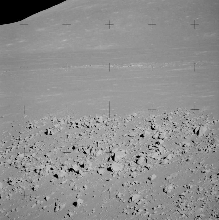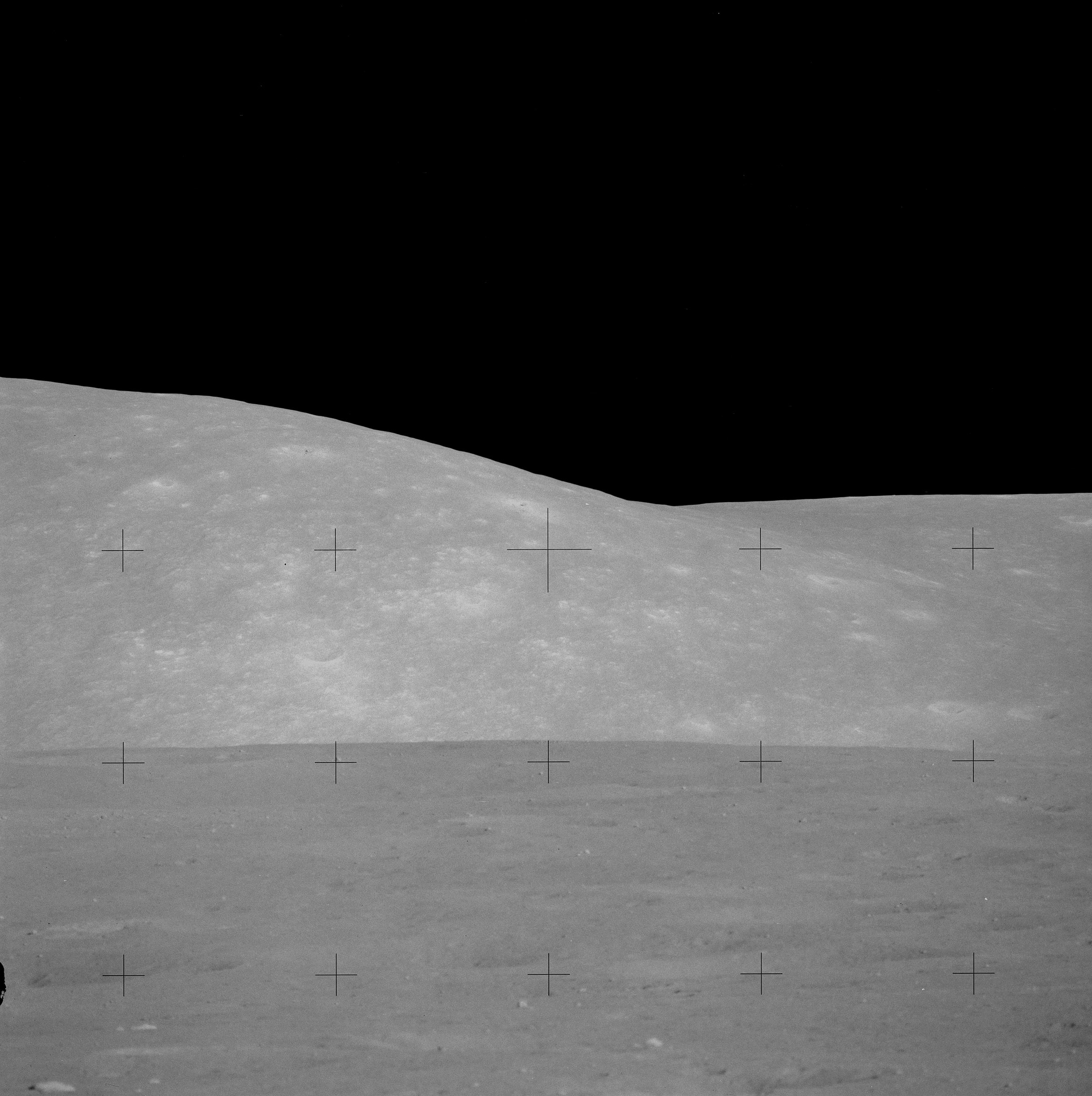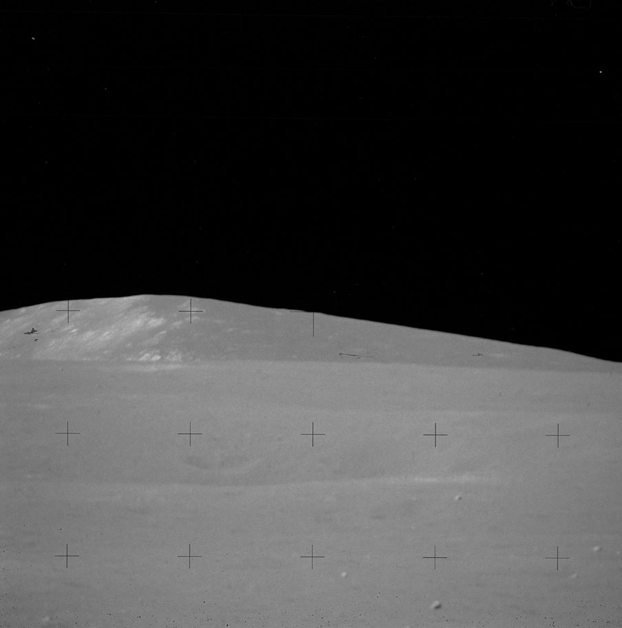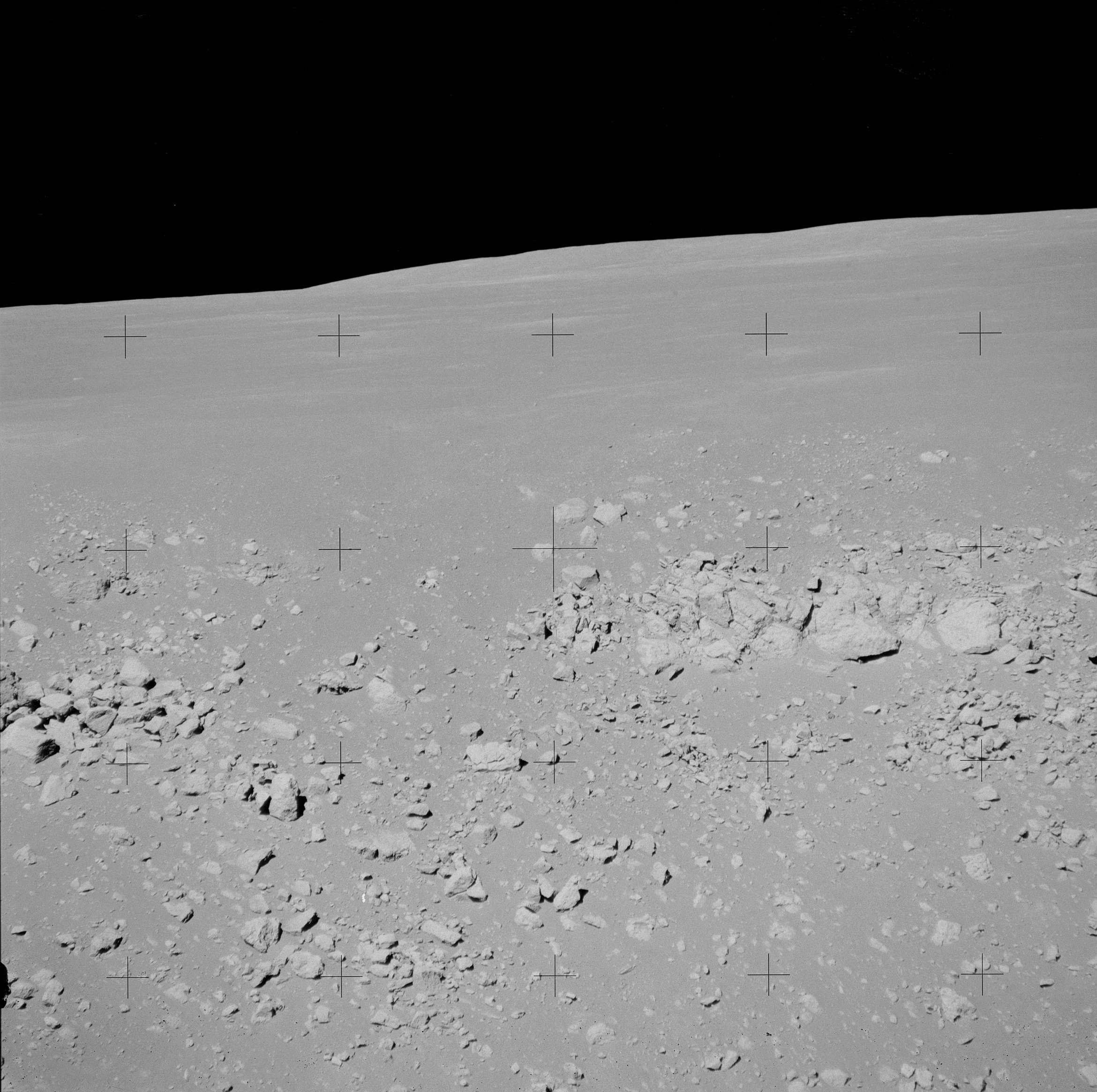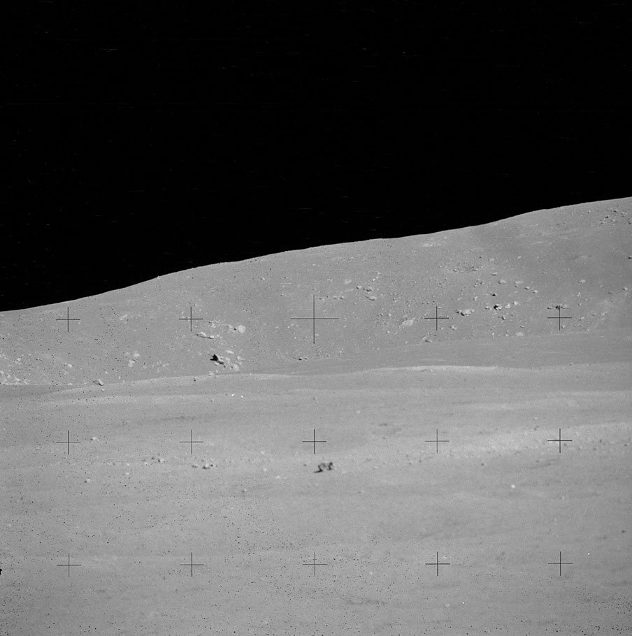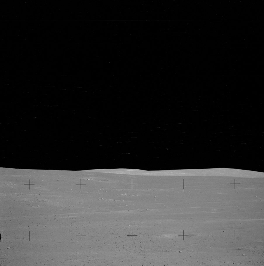 This picture was taken from the LM during CSM Rev 13 on the last pass over the landing site prior to the descent. A labeled version shows some of the prominent landmarks.Rev 16 Mapping (Metric) Camera Frame 0414 ( 13 Mb )