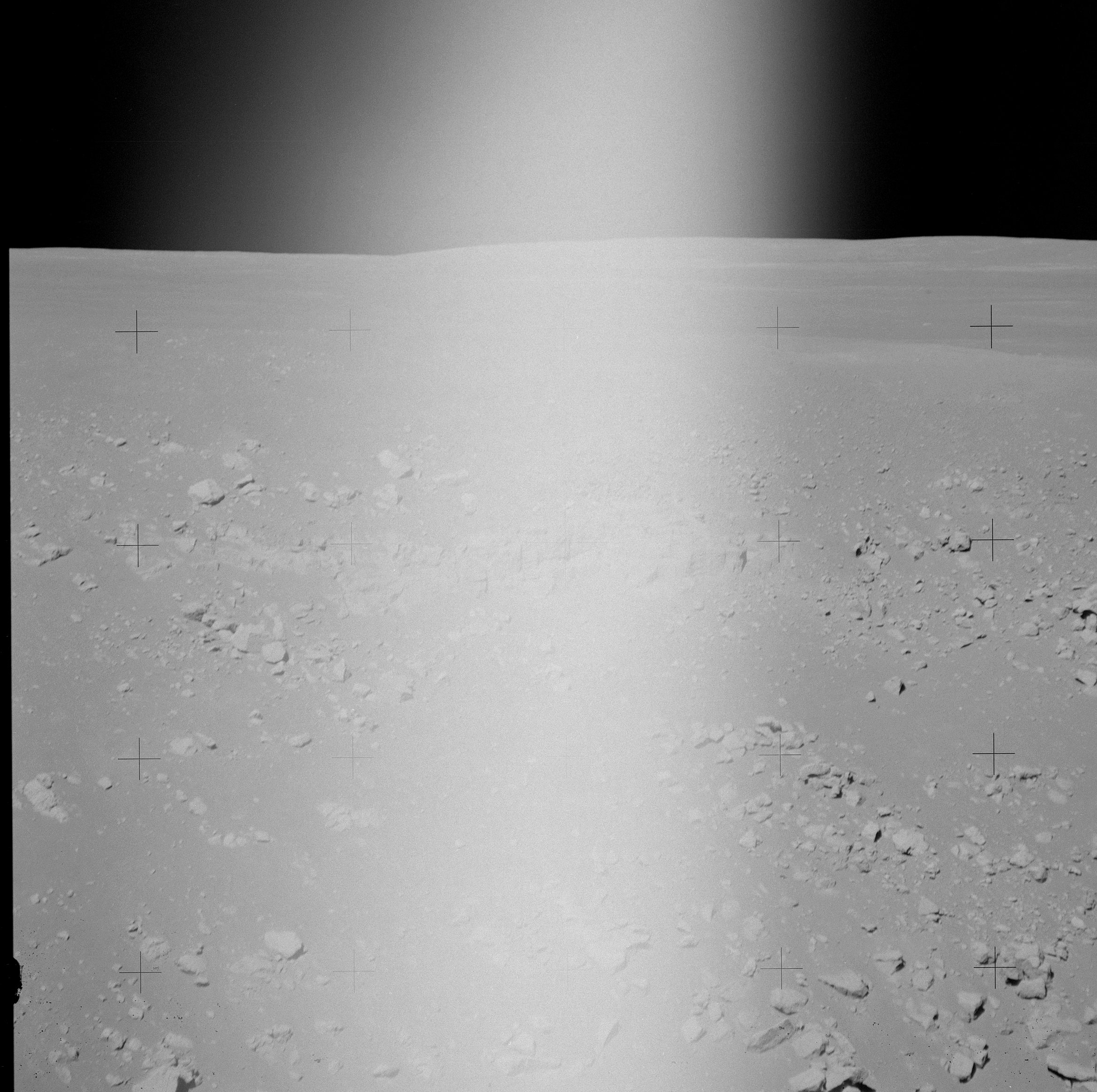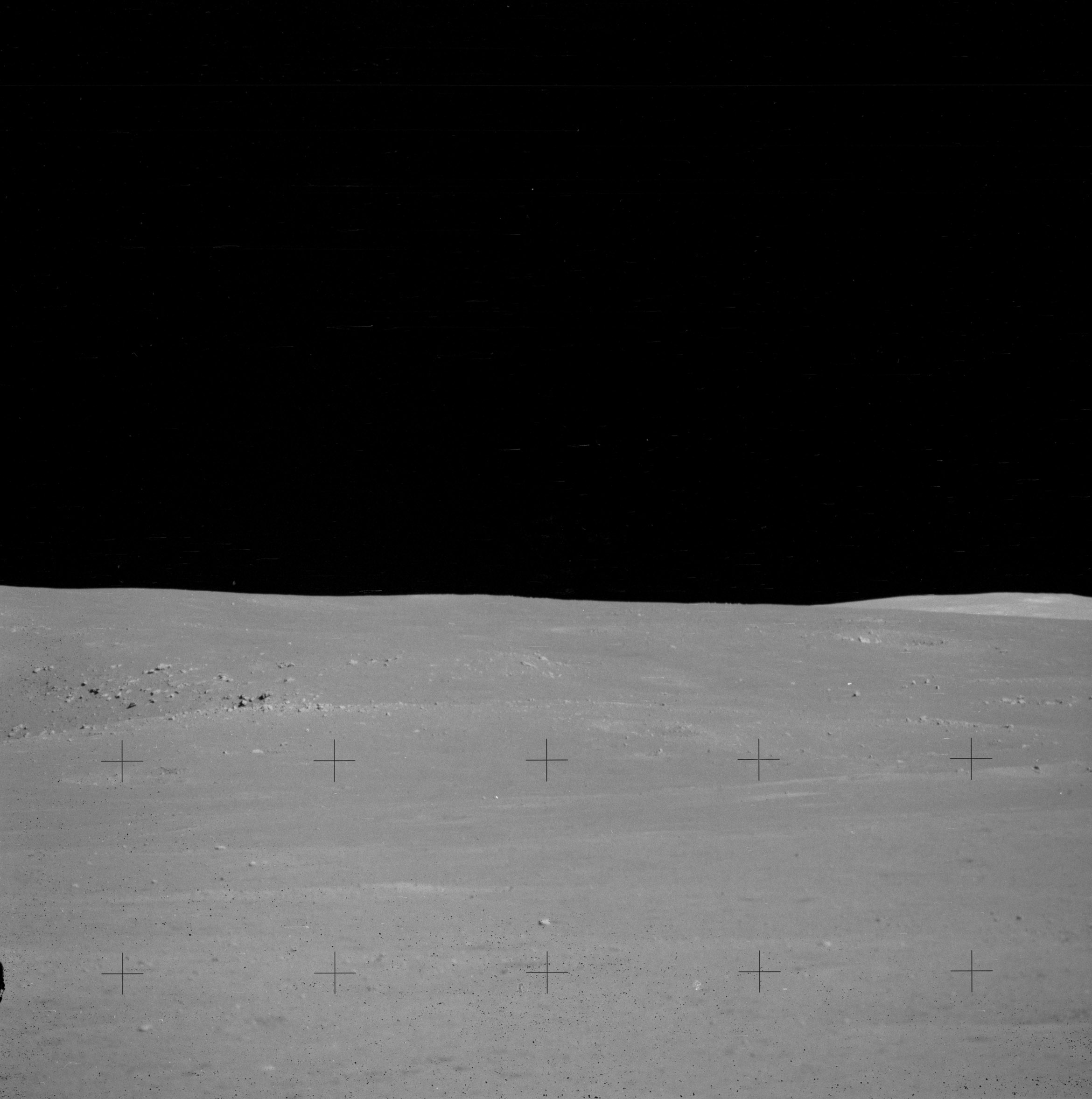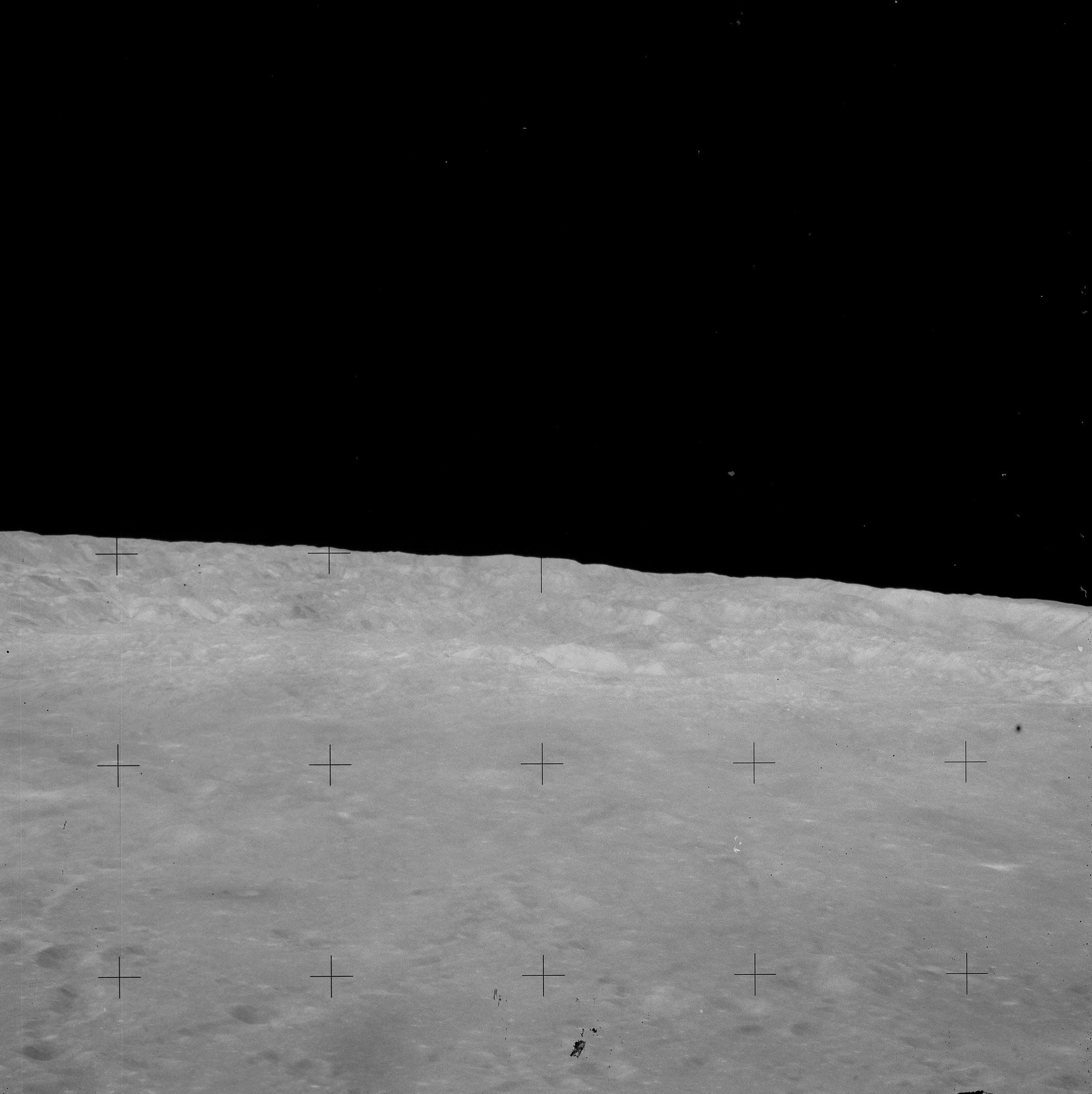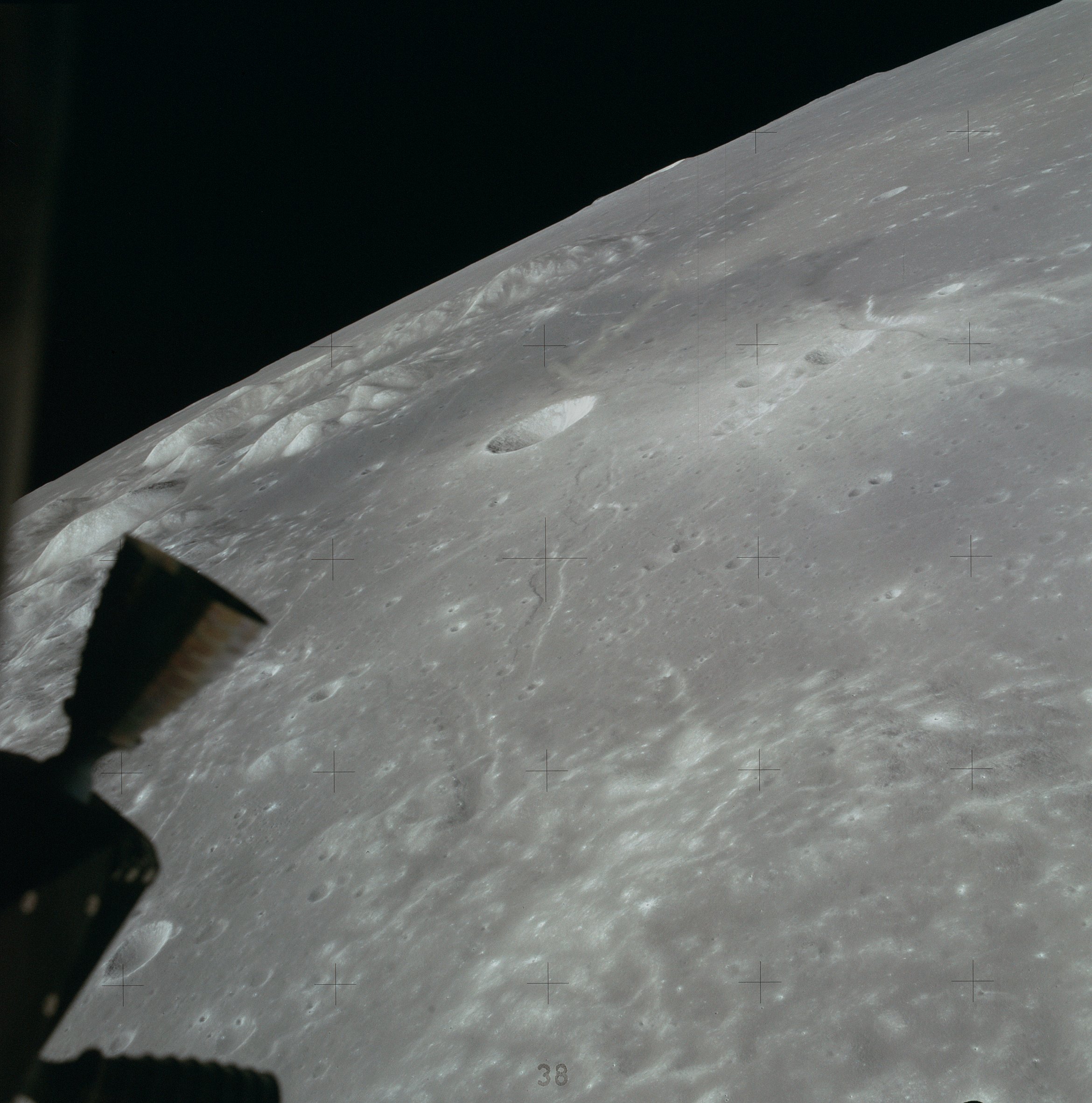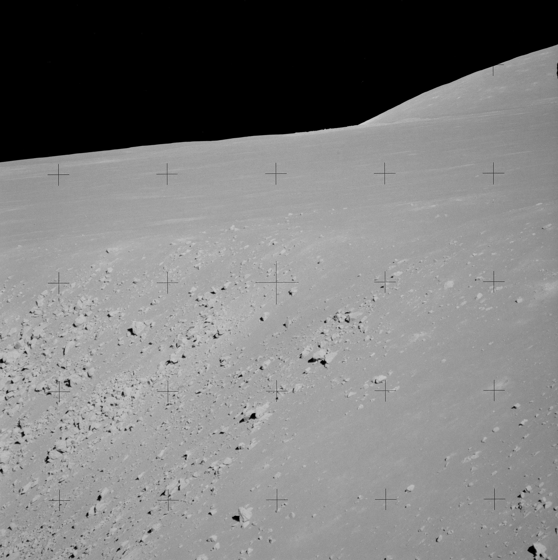 This picture was taken from the LM during CSM Rev 13 on the last pass over the landing site prior to the descent. A labeled version shows some of the prominent landmarks.Rev 16 Mapping (Metric) Camera Frame 0414 ( 13 Mb )