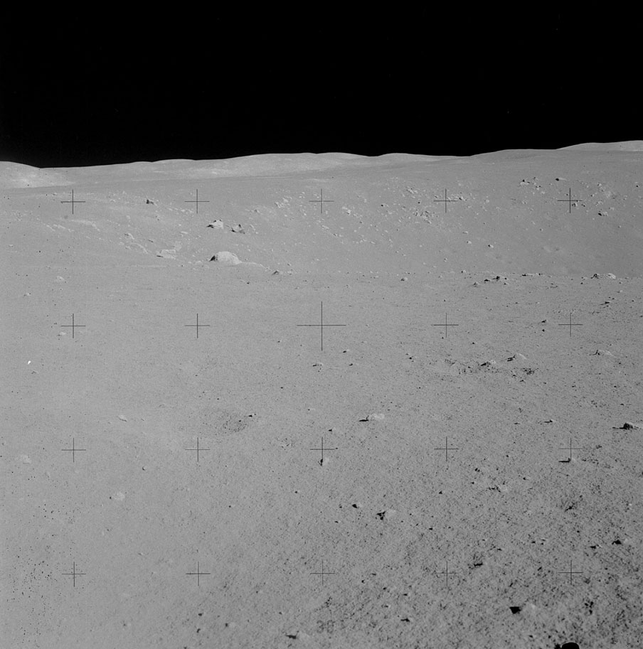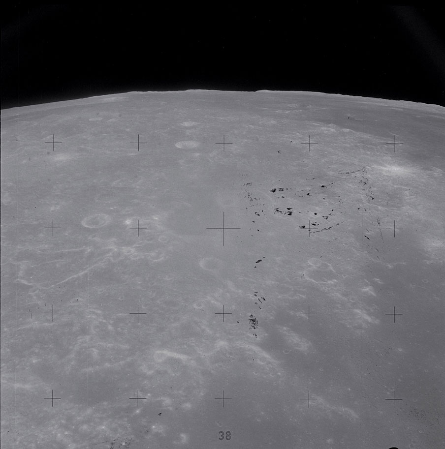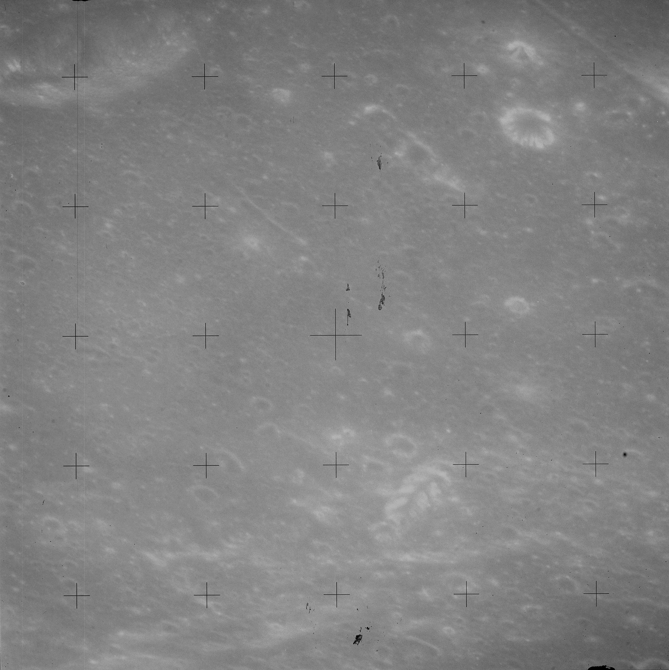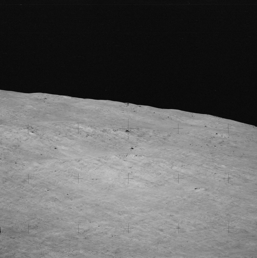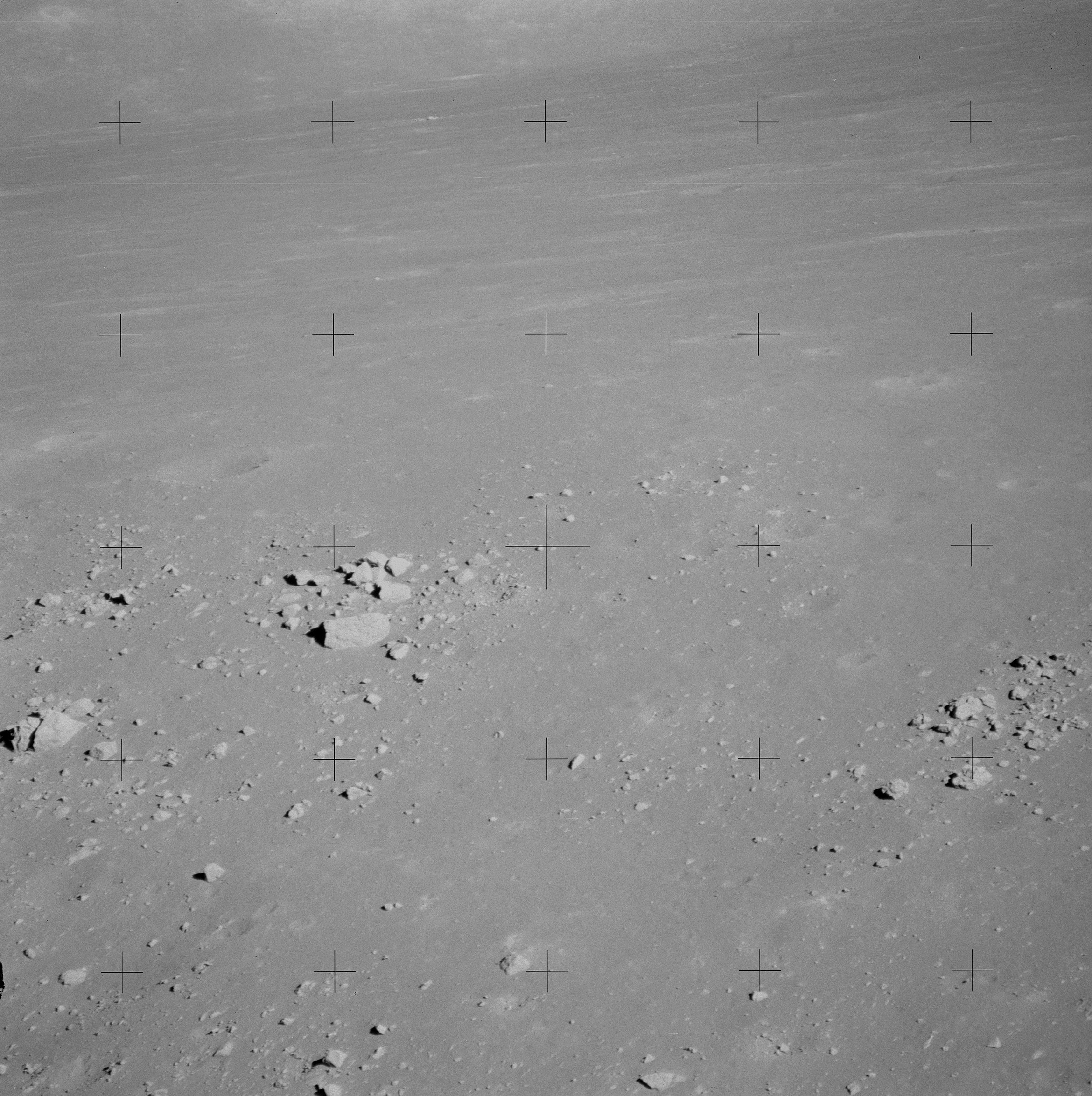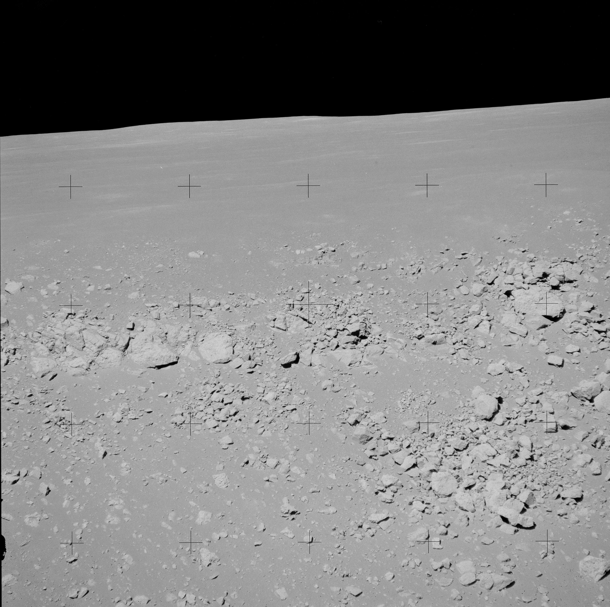 This picture was taken from the LM during CSM Rev 13 on the last pass over the landing site prior to the descent. A labeled version shows some of the prominent landmarks.Rev 16 Mapping (Metric) Camera Frame 0414 ( 13 Mb )