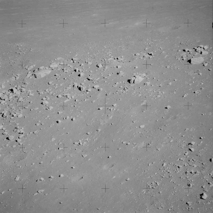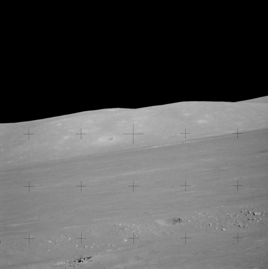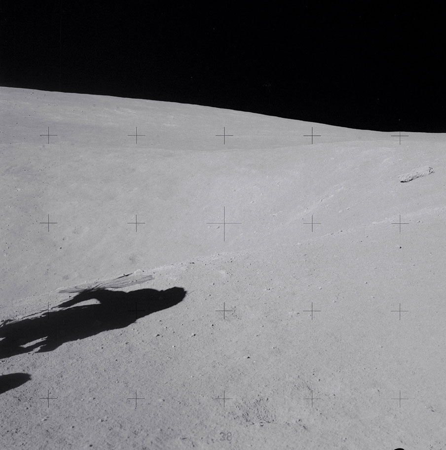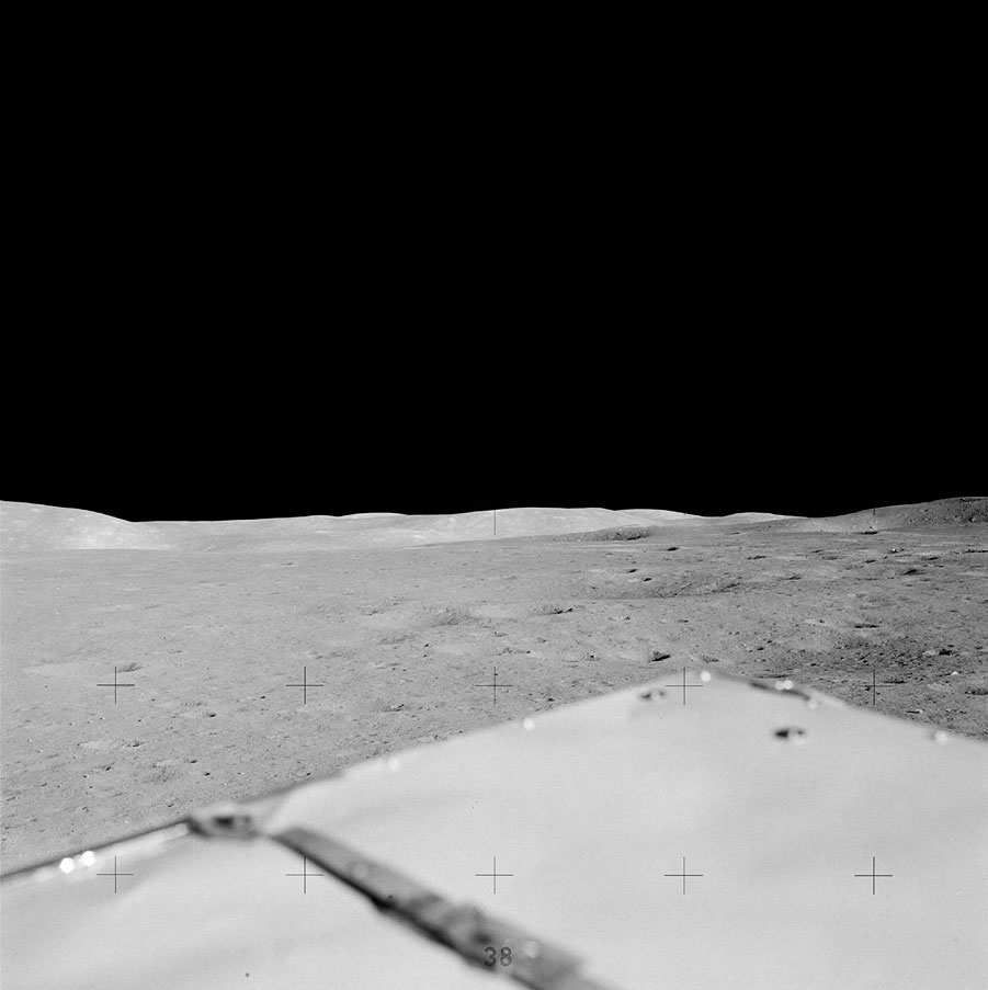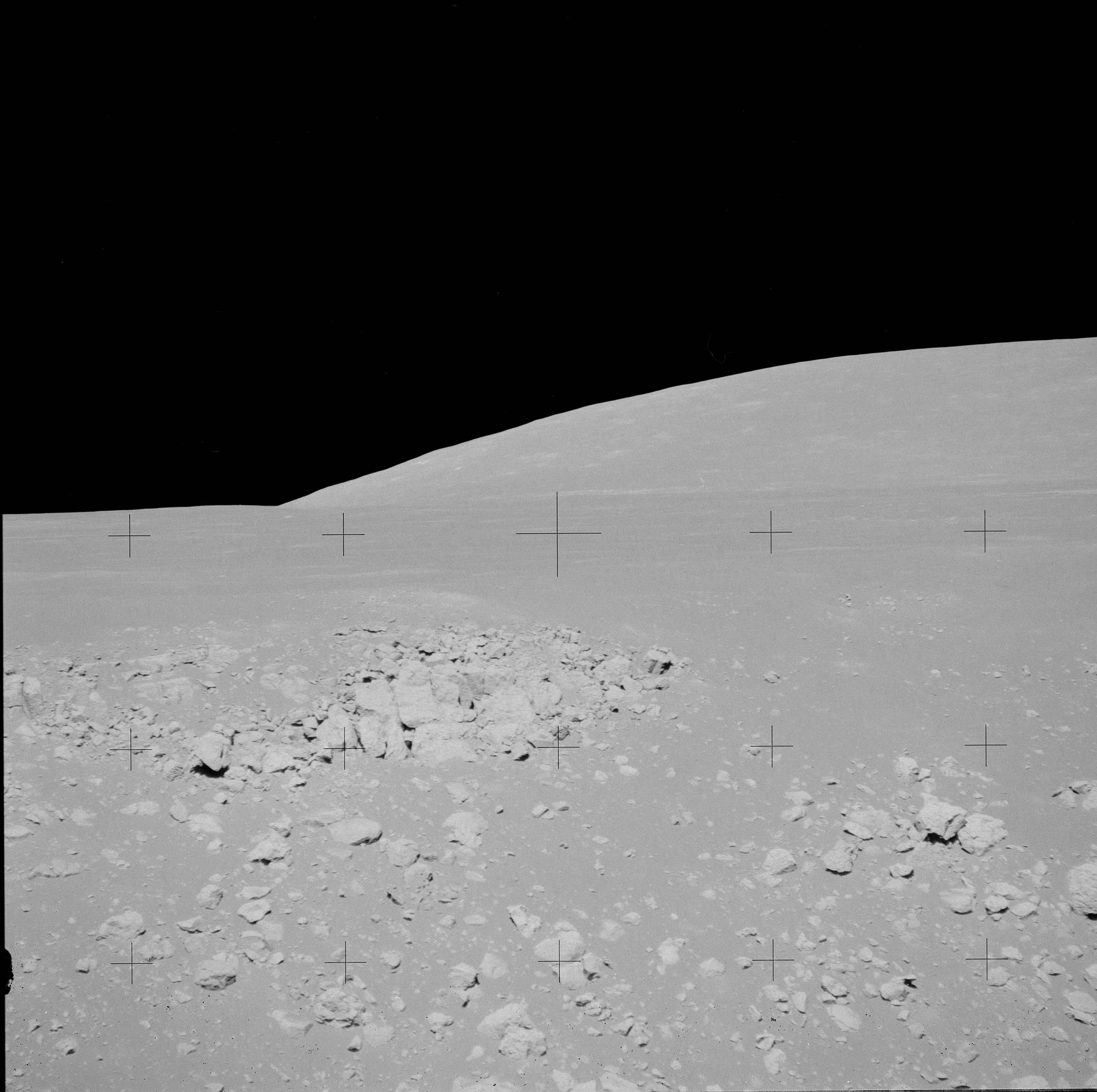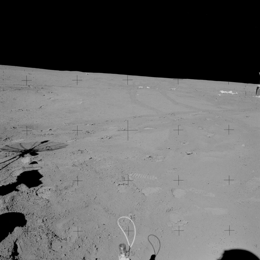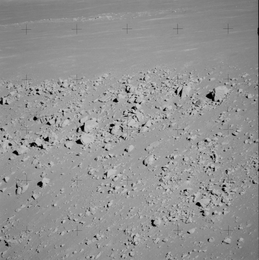 This picture was taken from the LM during CSM Rev 13 on the last pass over the landing site prior to the descent. A labeled version shows some of the prominent landmarks.Rev 16 Mapping (Metric) Camera Frame 0414 ( 13 Mb )