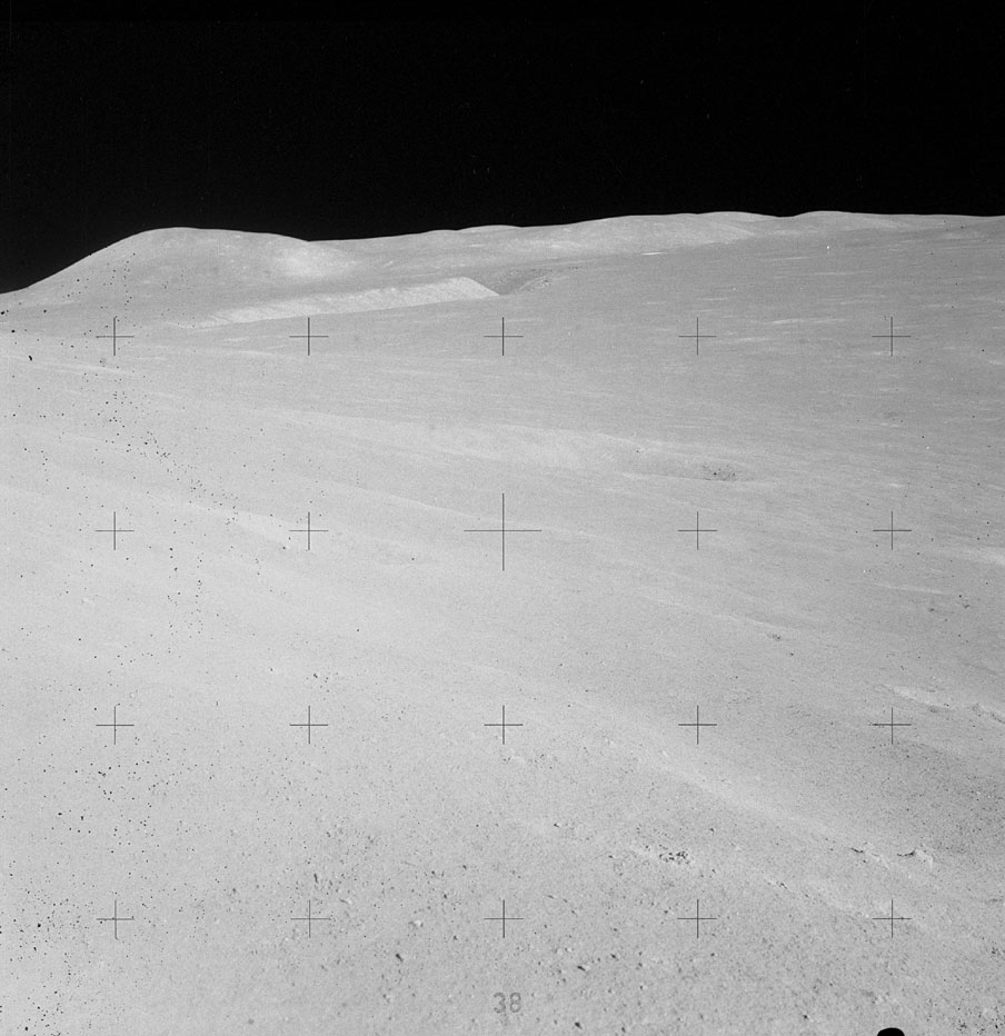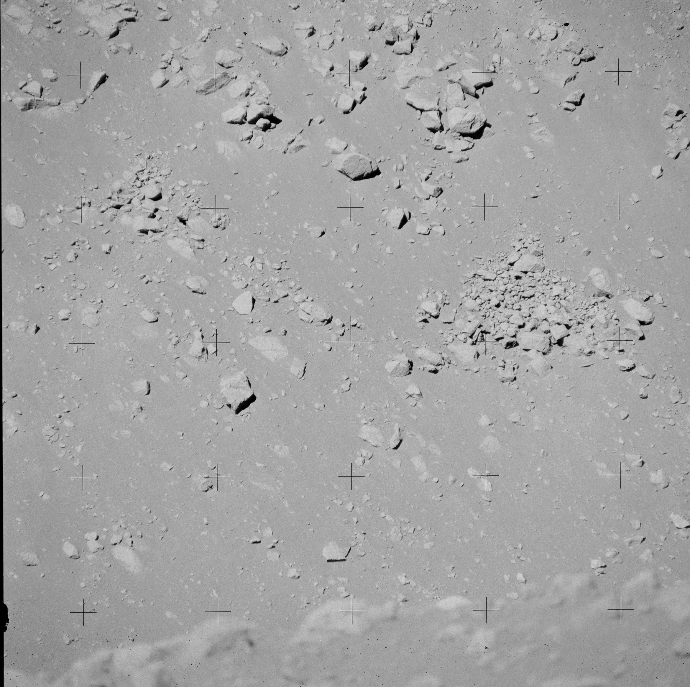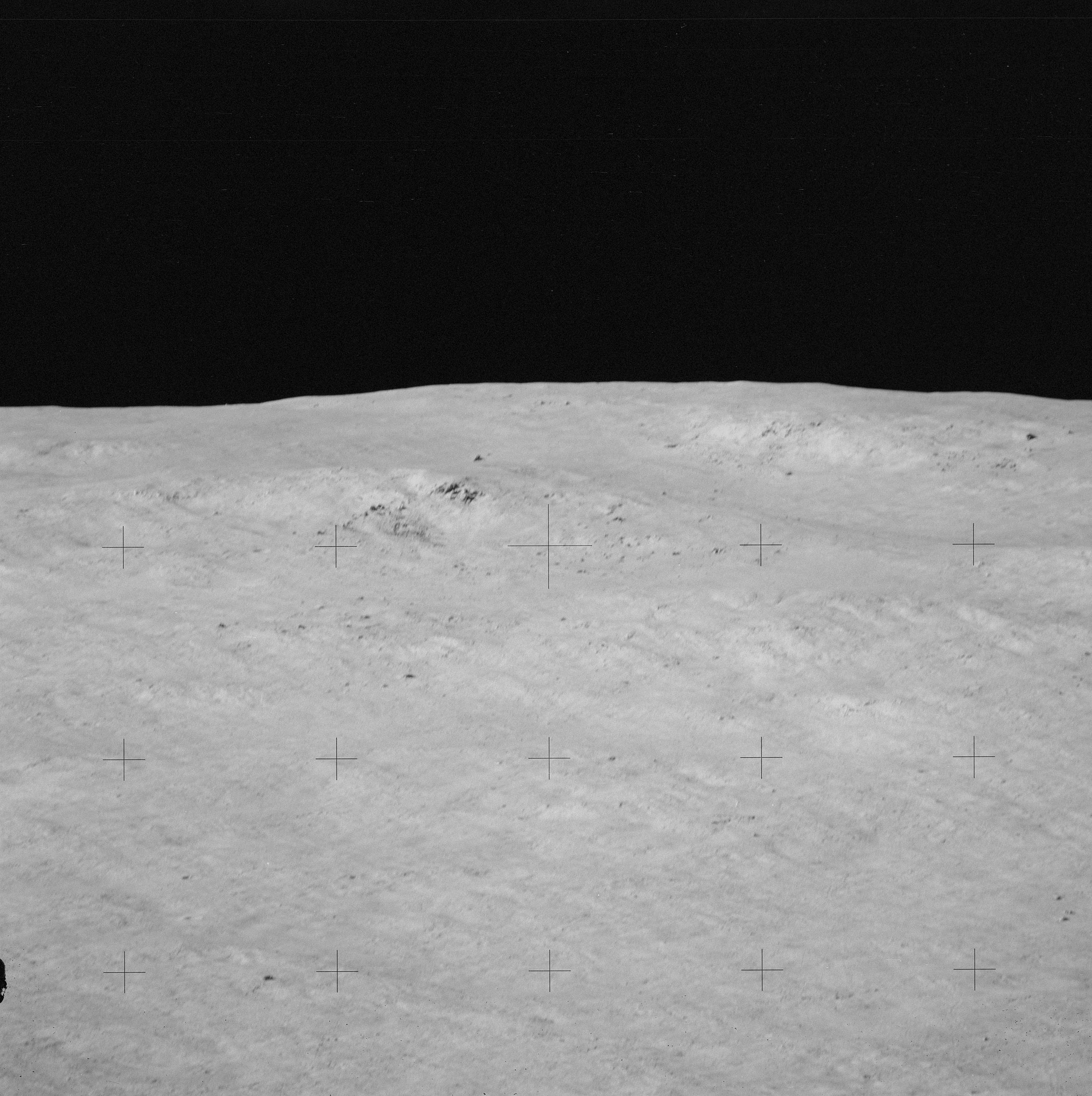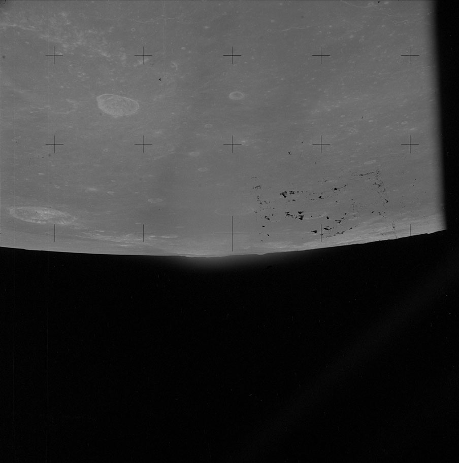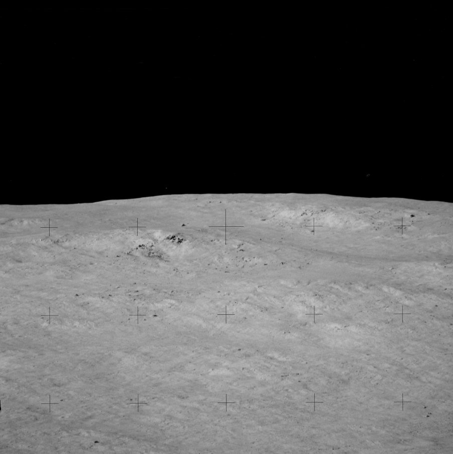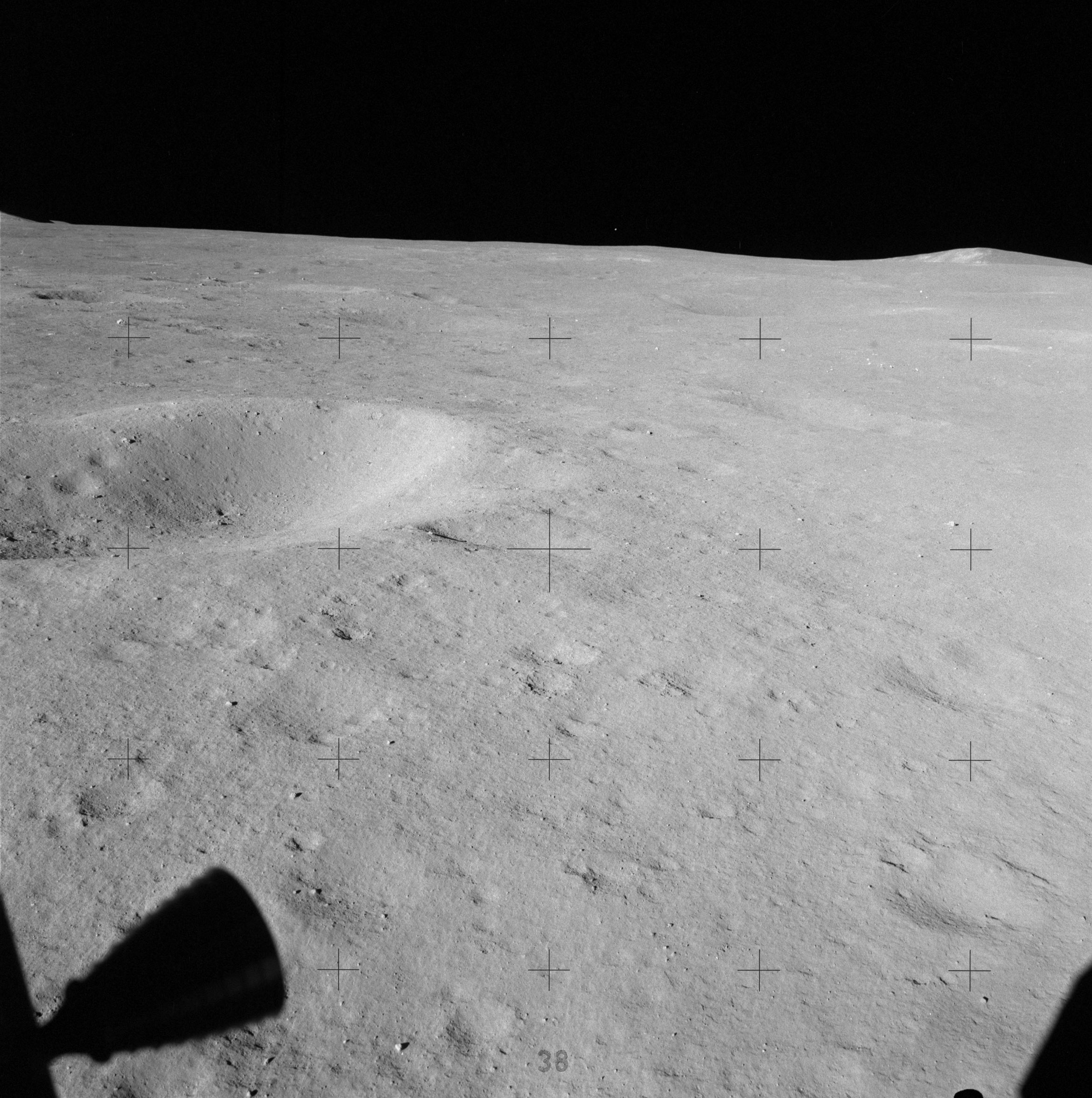 This picture was taken from the LM during CSM Rev 13 on the last pass over the landing site prior to the descent. A labeled version shows some of the prominent landmarks.Rev 16 Mapping (Metric) Camera Frame 0414 ( 13 Mb )
