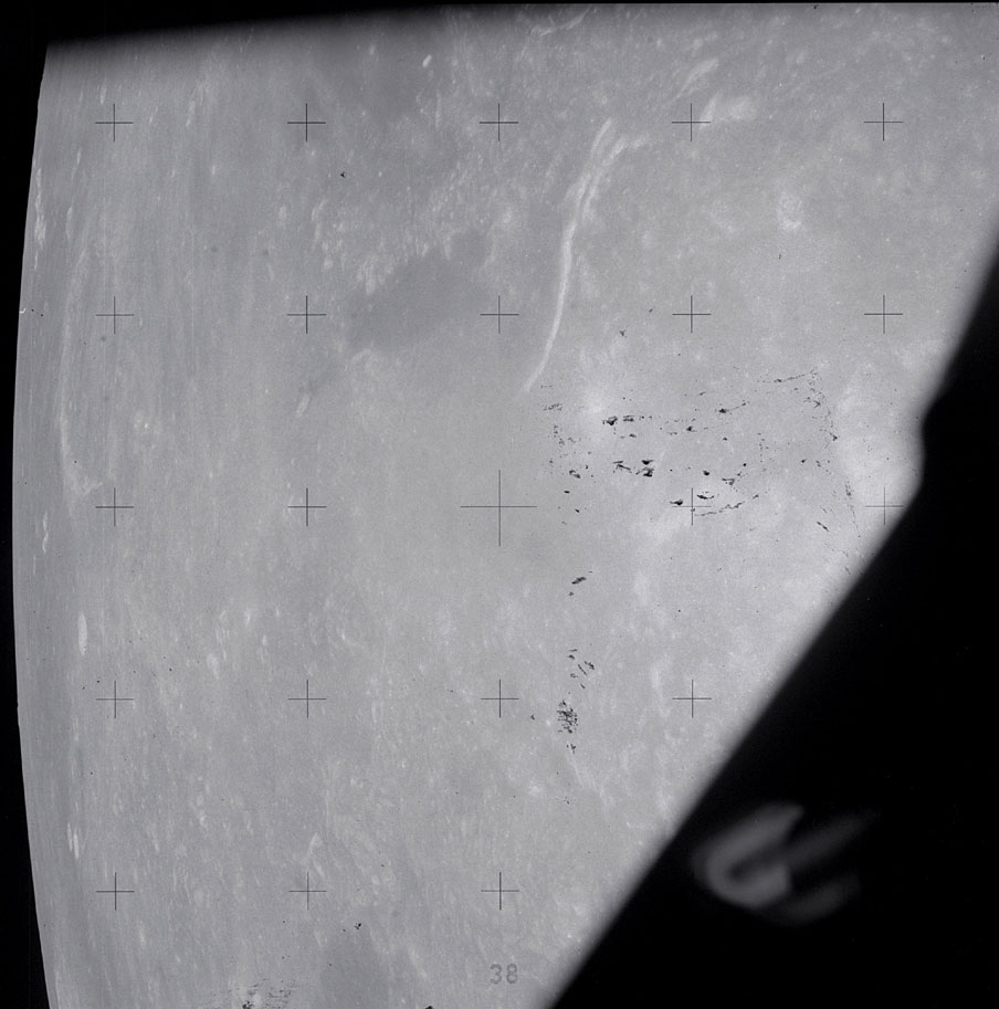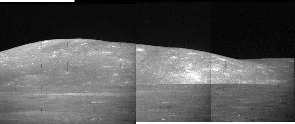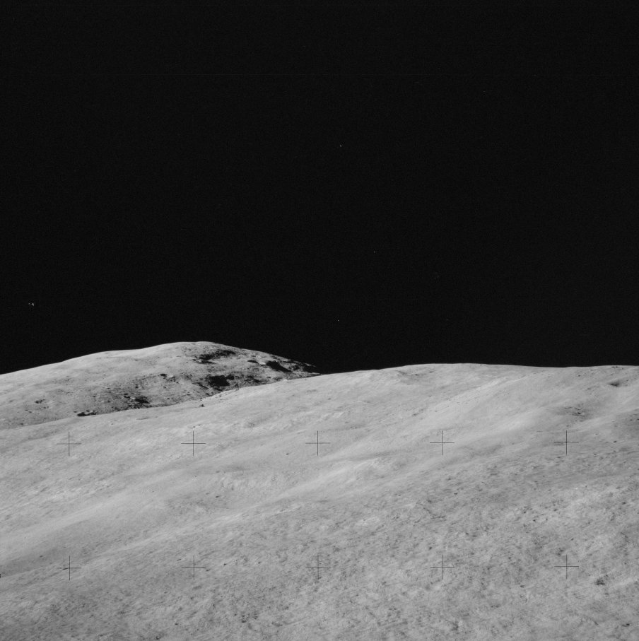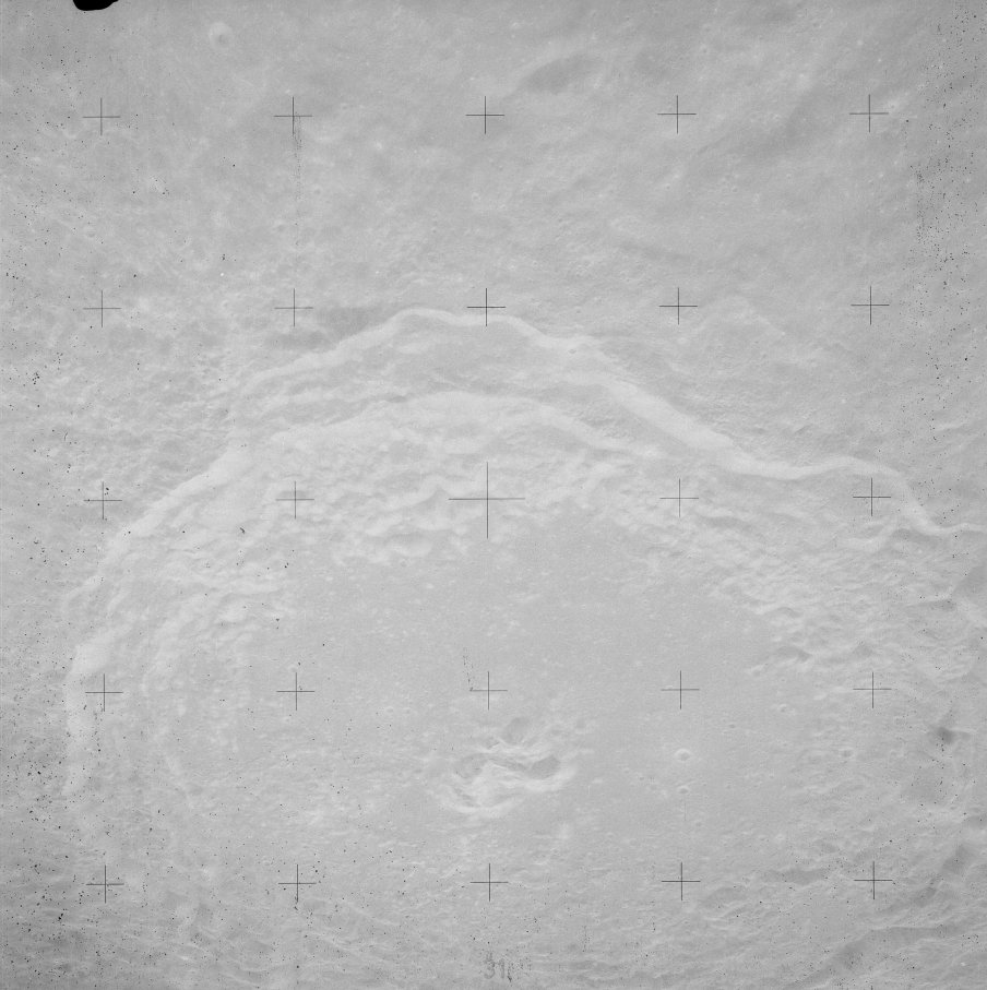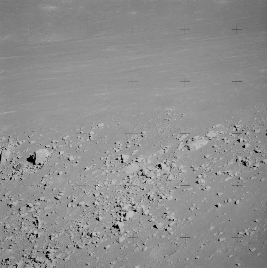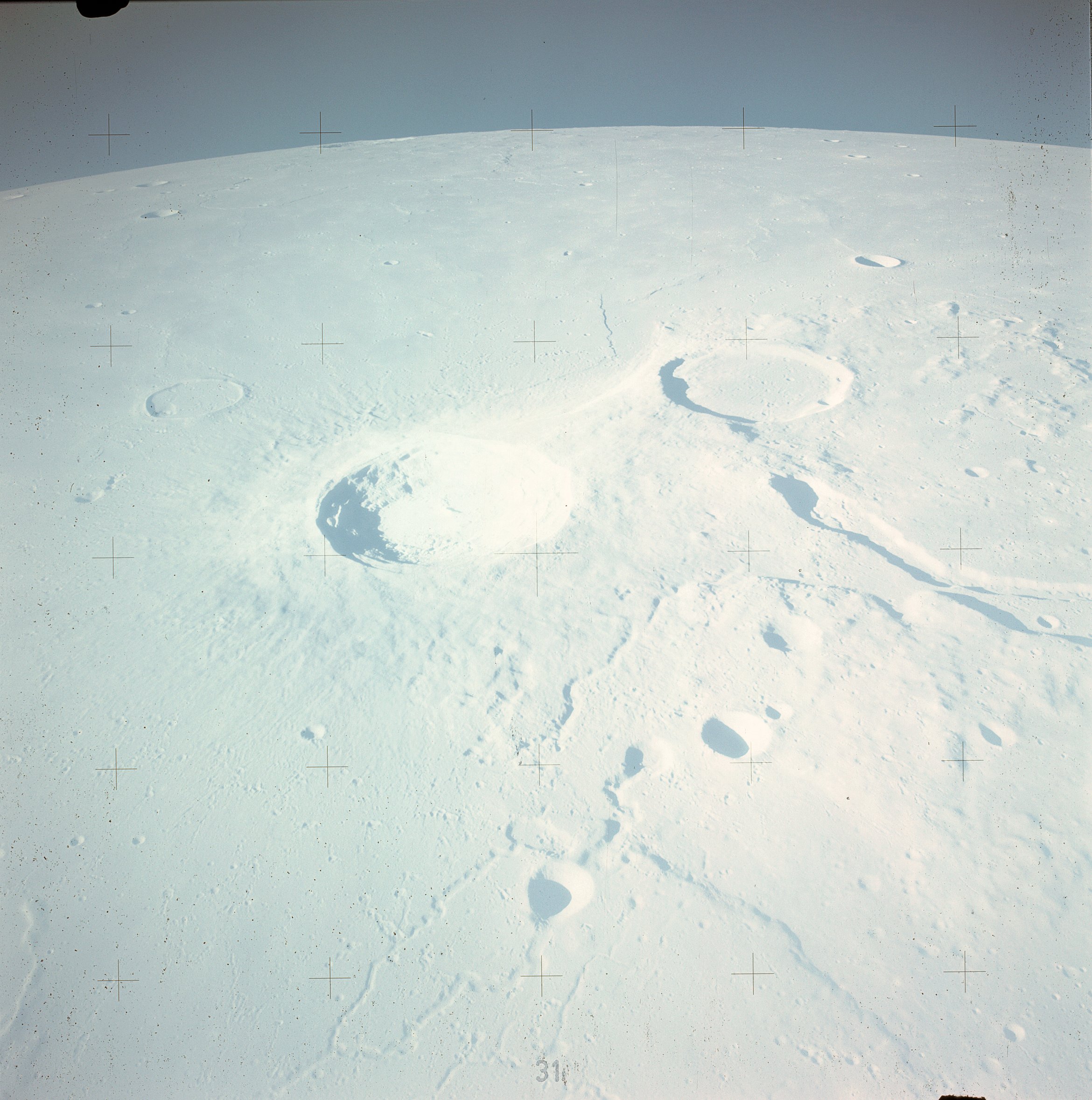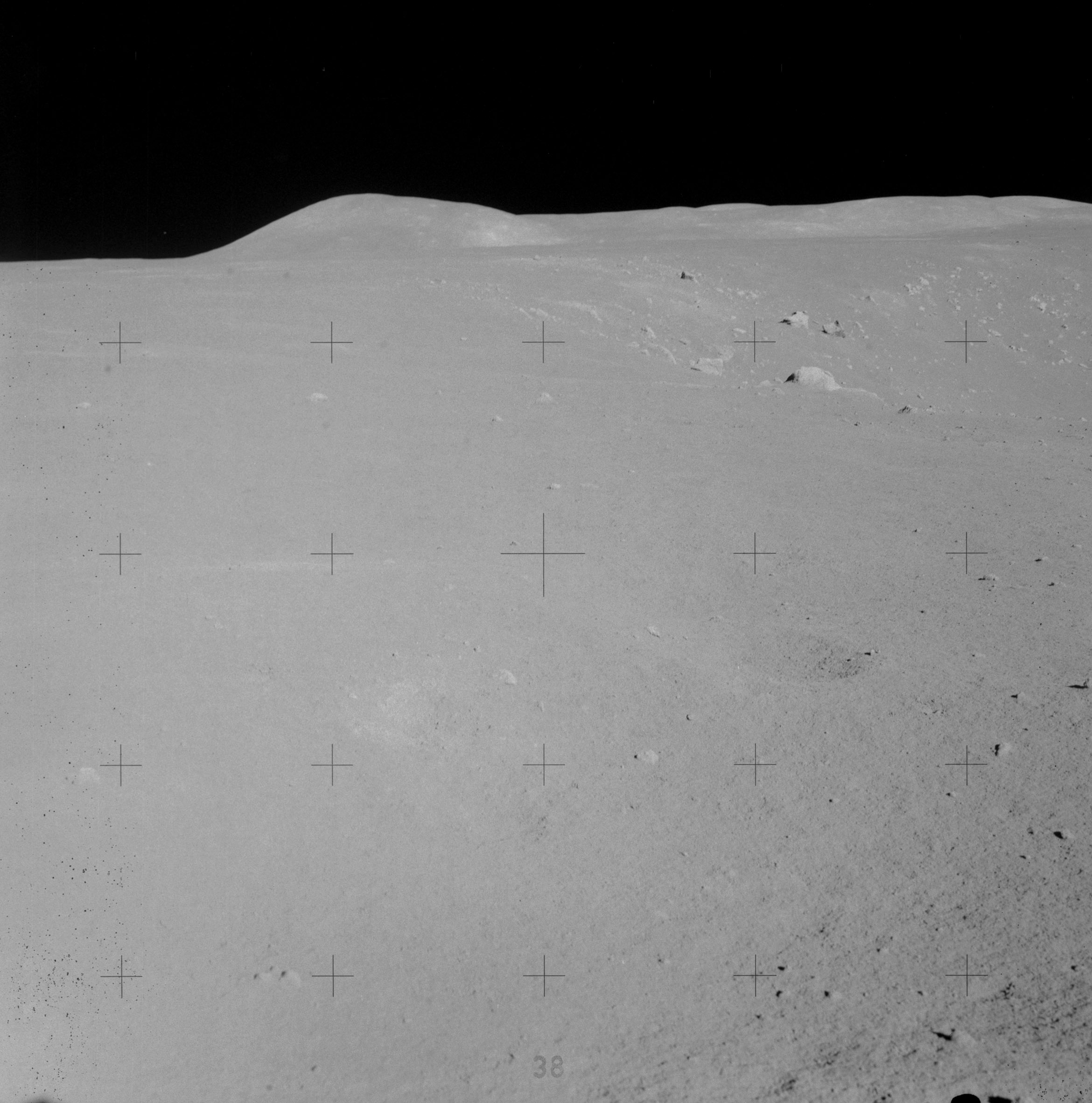 This picture was taken from the LM during CSM Rev 13 on the last pass over the landing site prior to the descent. A labeled version shows some of the prominent landmarks.Rev 16 Mapping (Metric) Camera Frame 0414 ( 13 Mb )