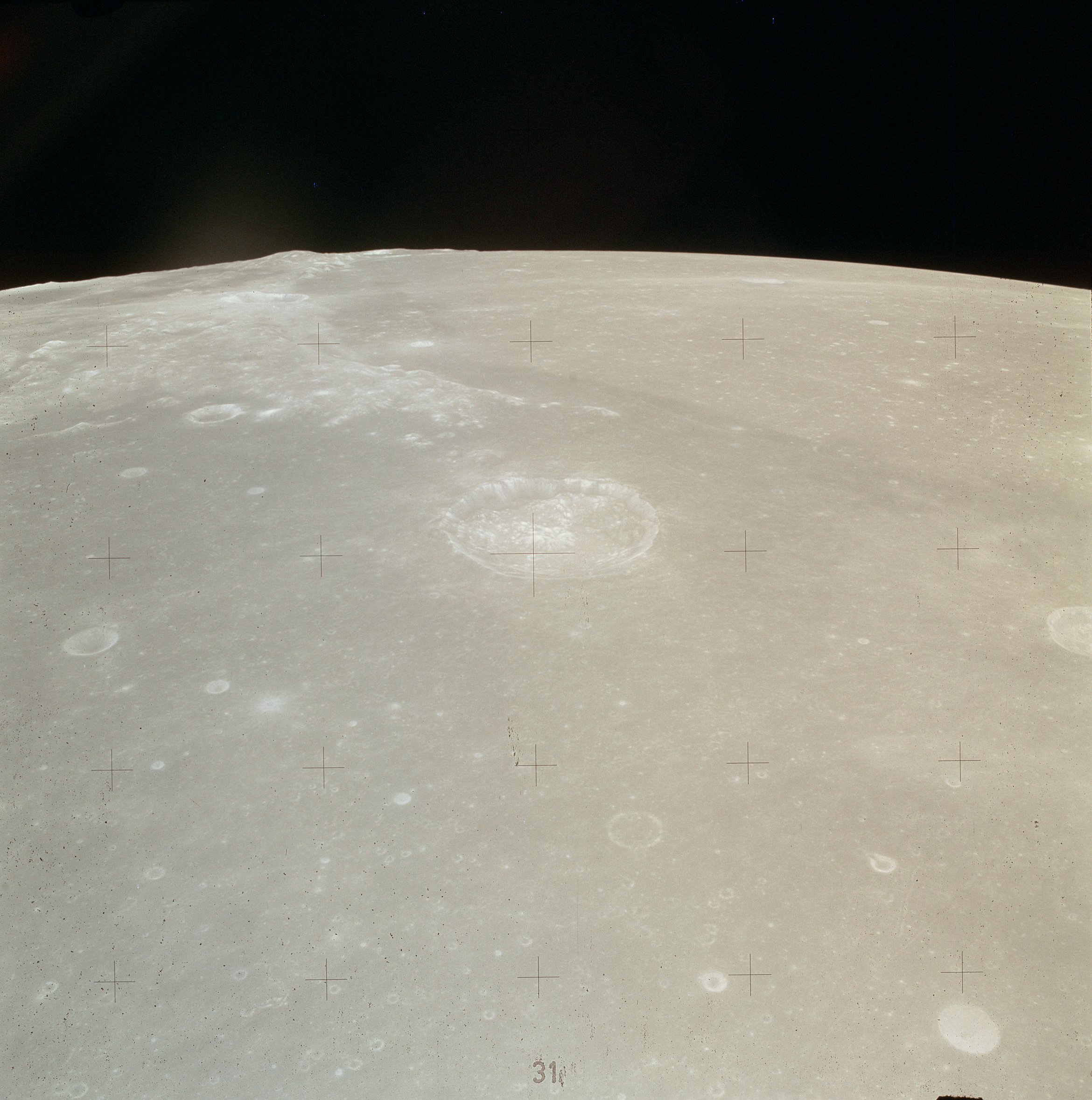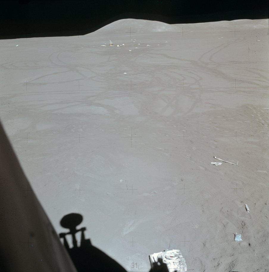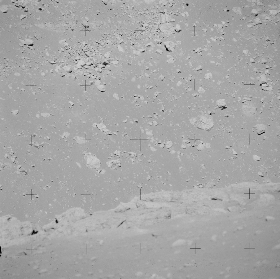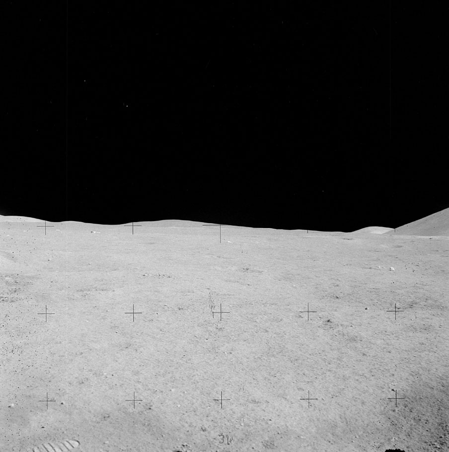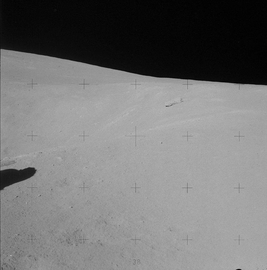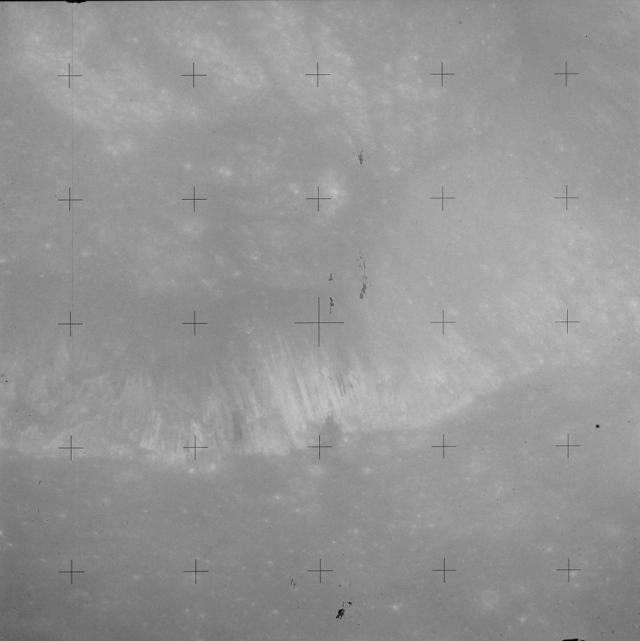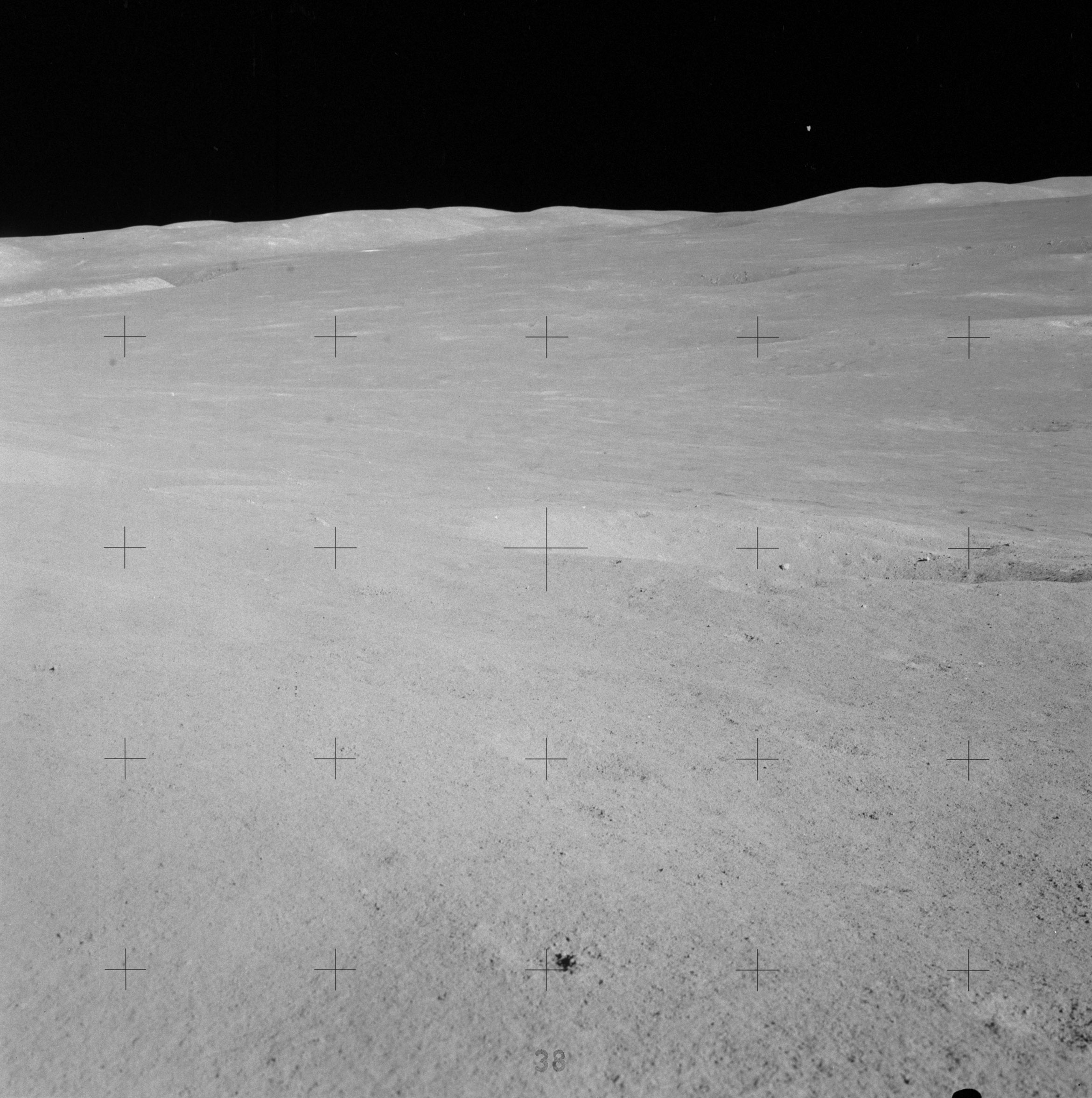 This picture was taken from the LM during CSM Rev 13 on the last pass over the landing site prior to the descent. A labeled version shows some of the prominent landmarks.Rev 16 Mapping (Metric) Camera Frame 0414 ( 13 Mb )
