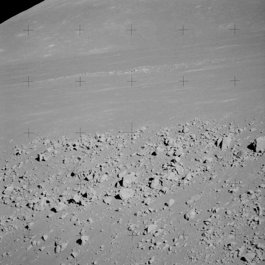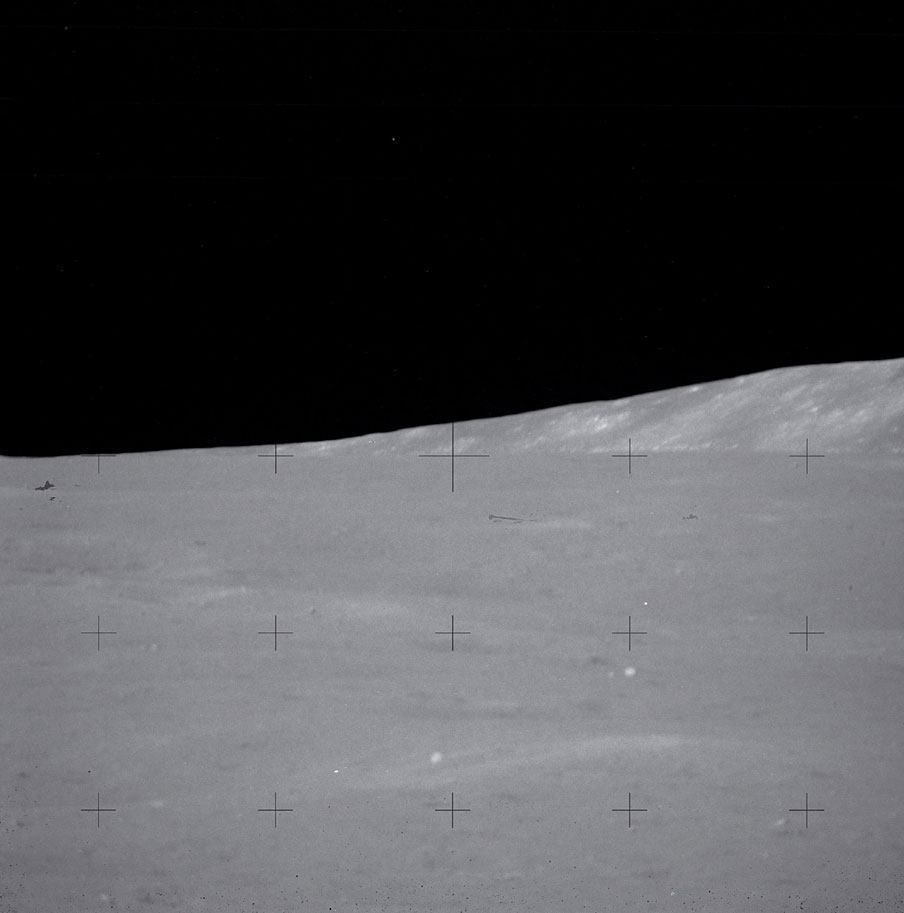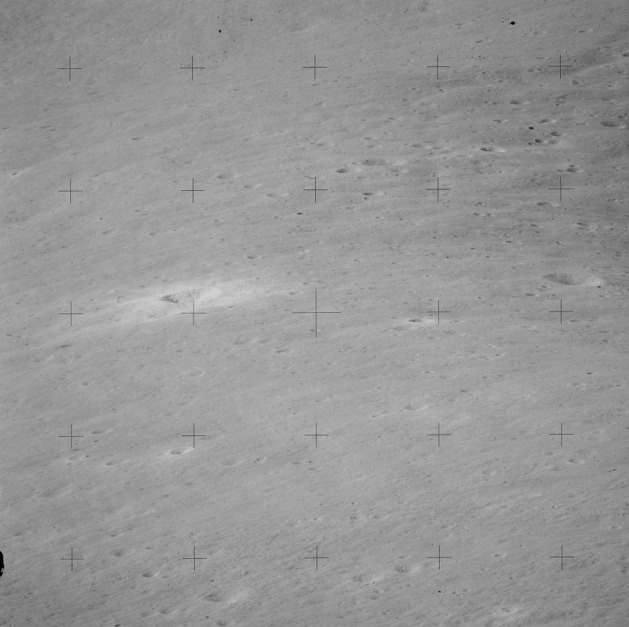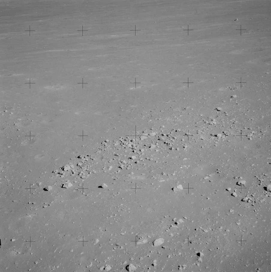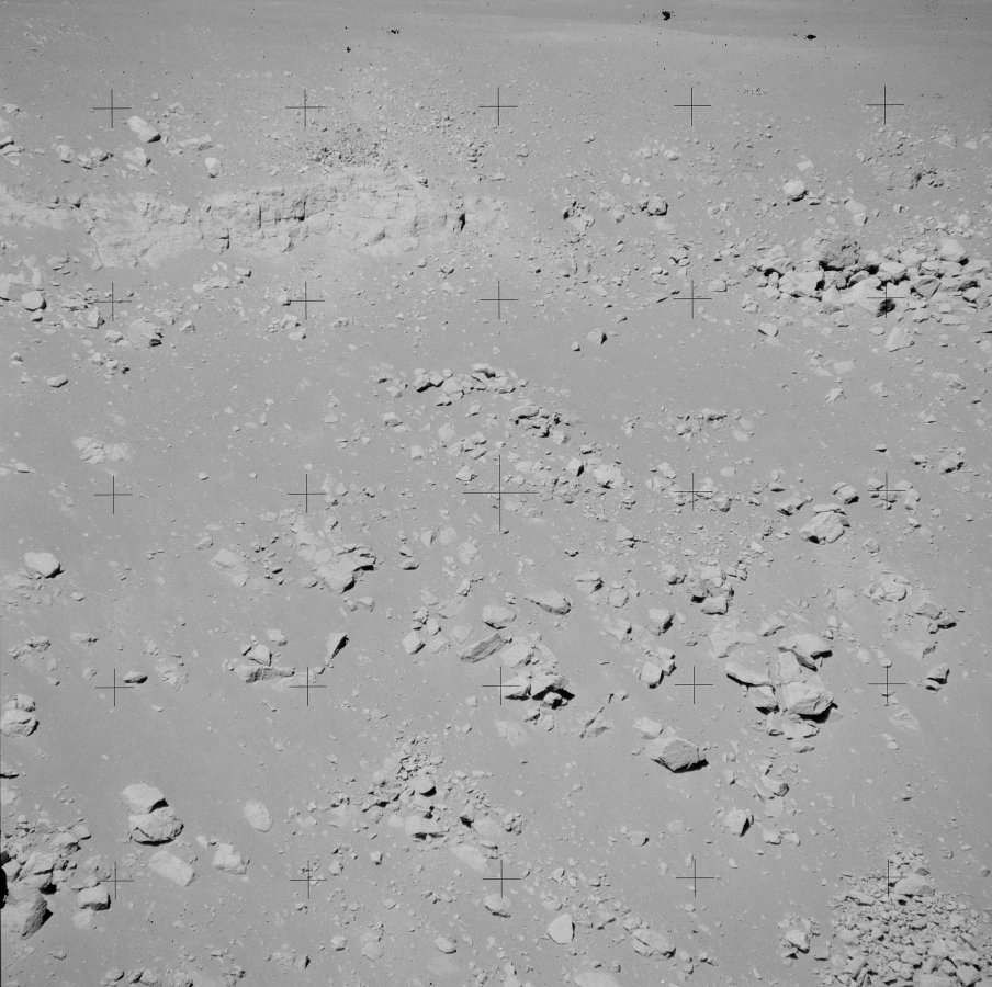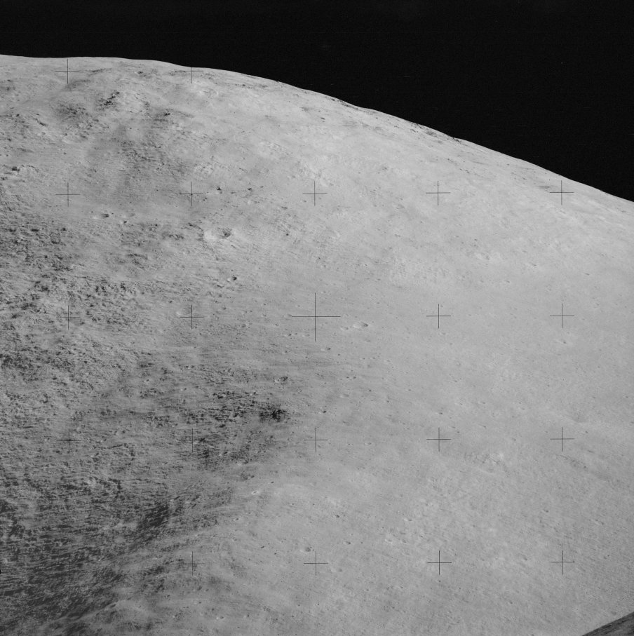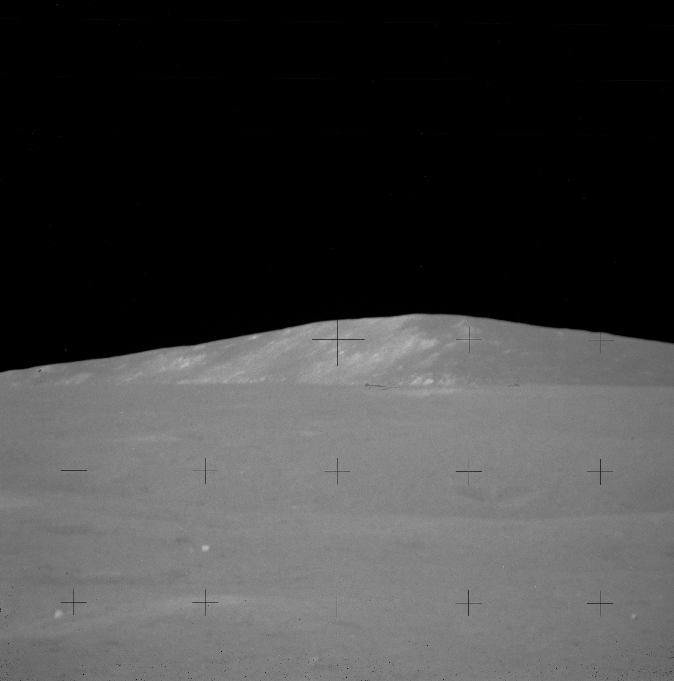 This picture was taken from the LM during CSM Rev 13 on the last pass over the landing site prior to the descent. A labeled version shows some of the prominent landmarks.Rev 16 Mapping (Metric) Camera Frame 0414 ( 13 Mb )