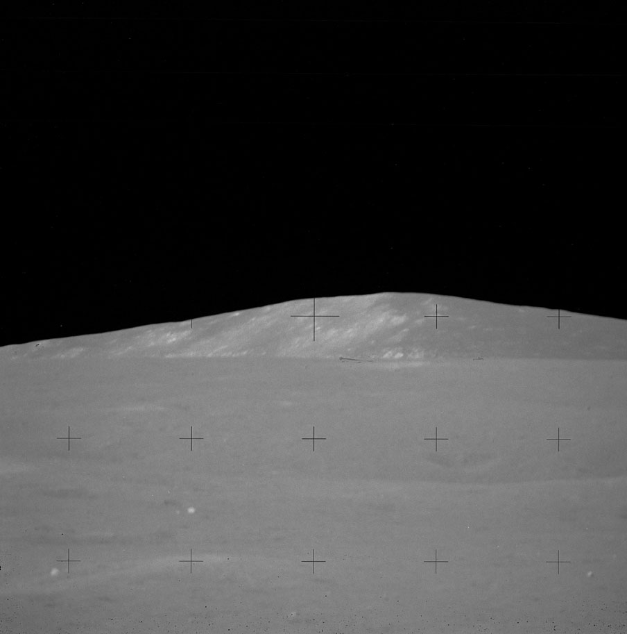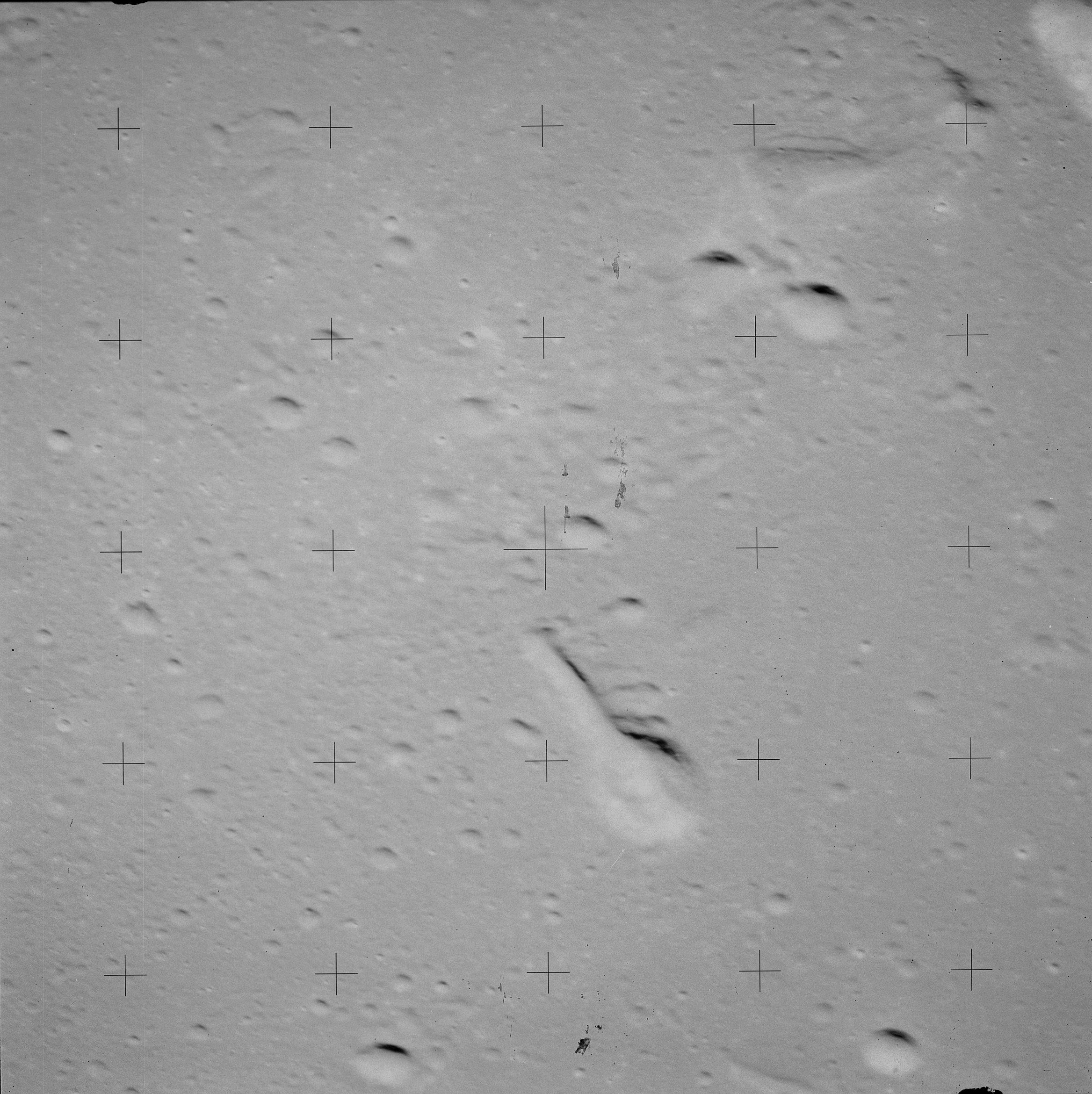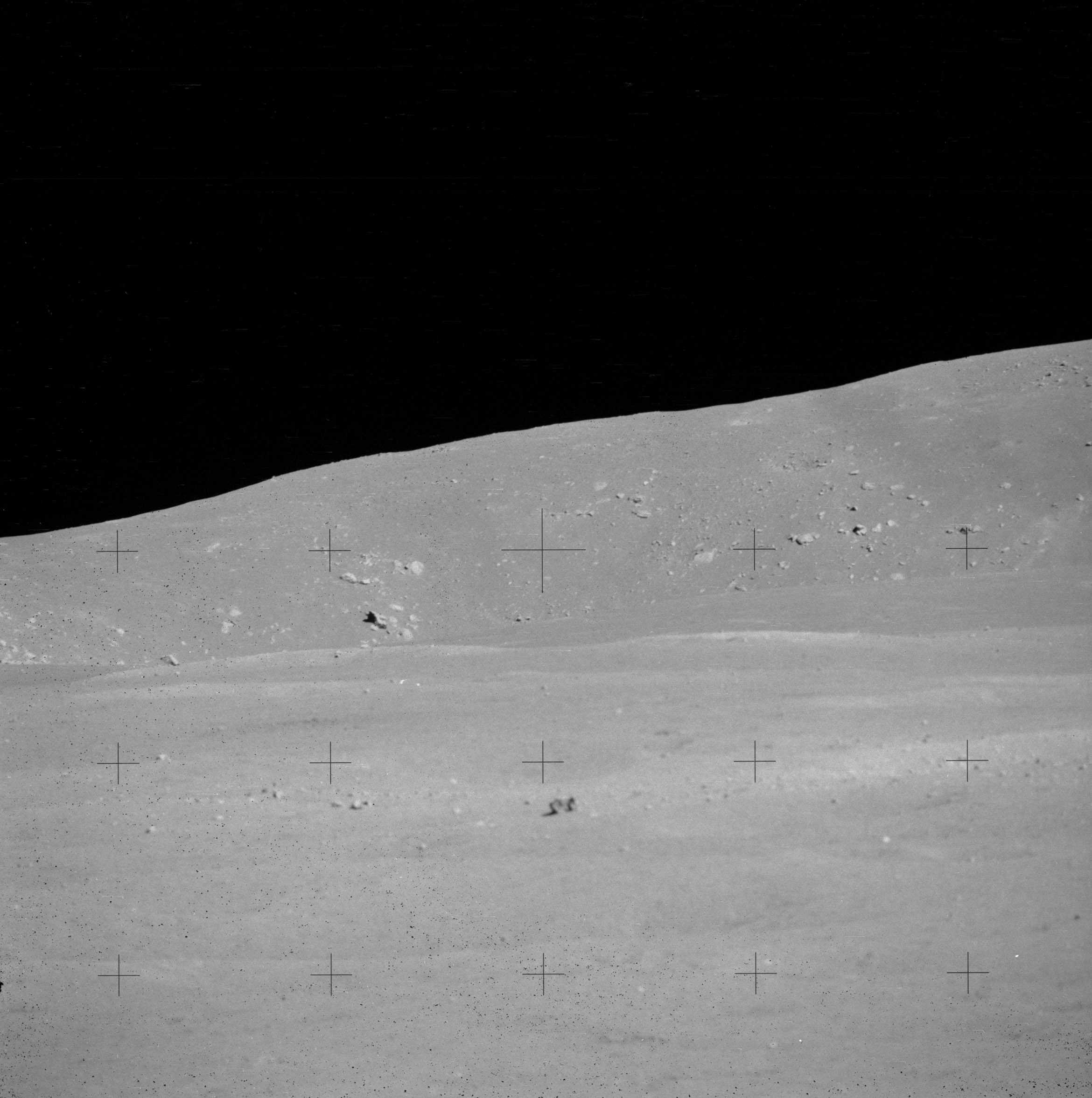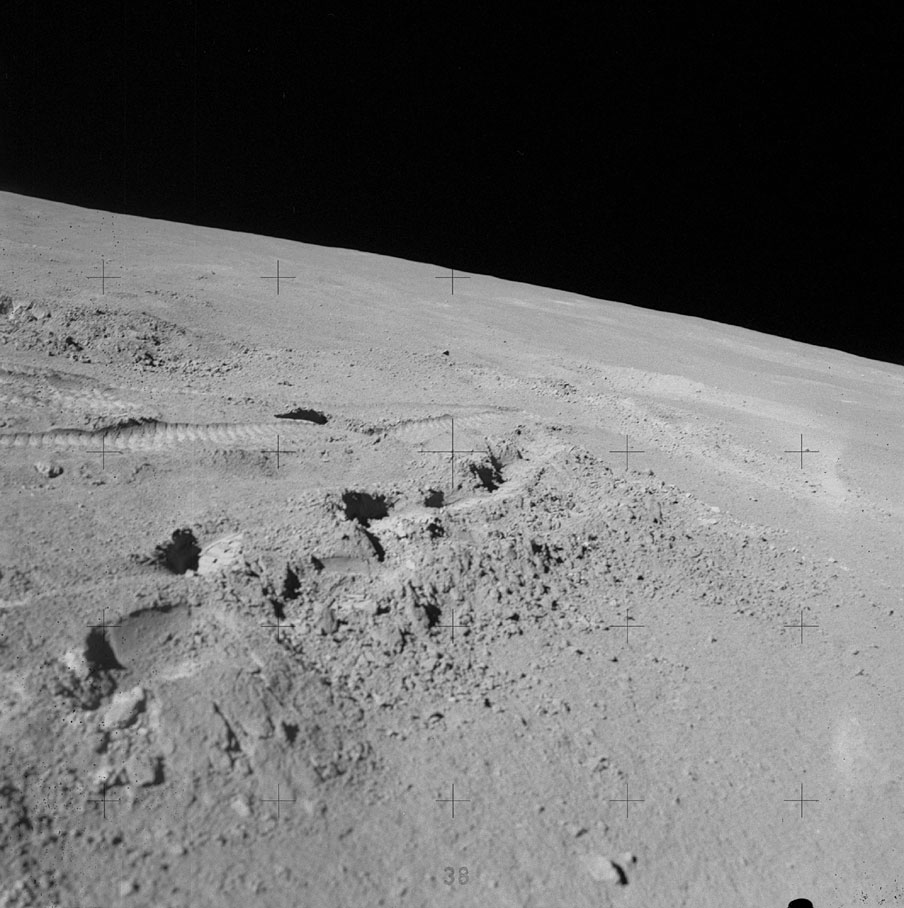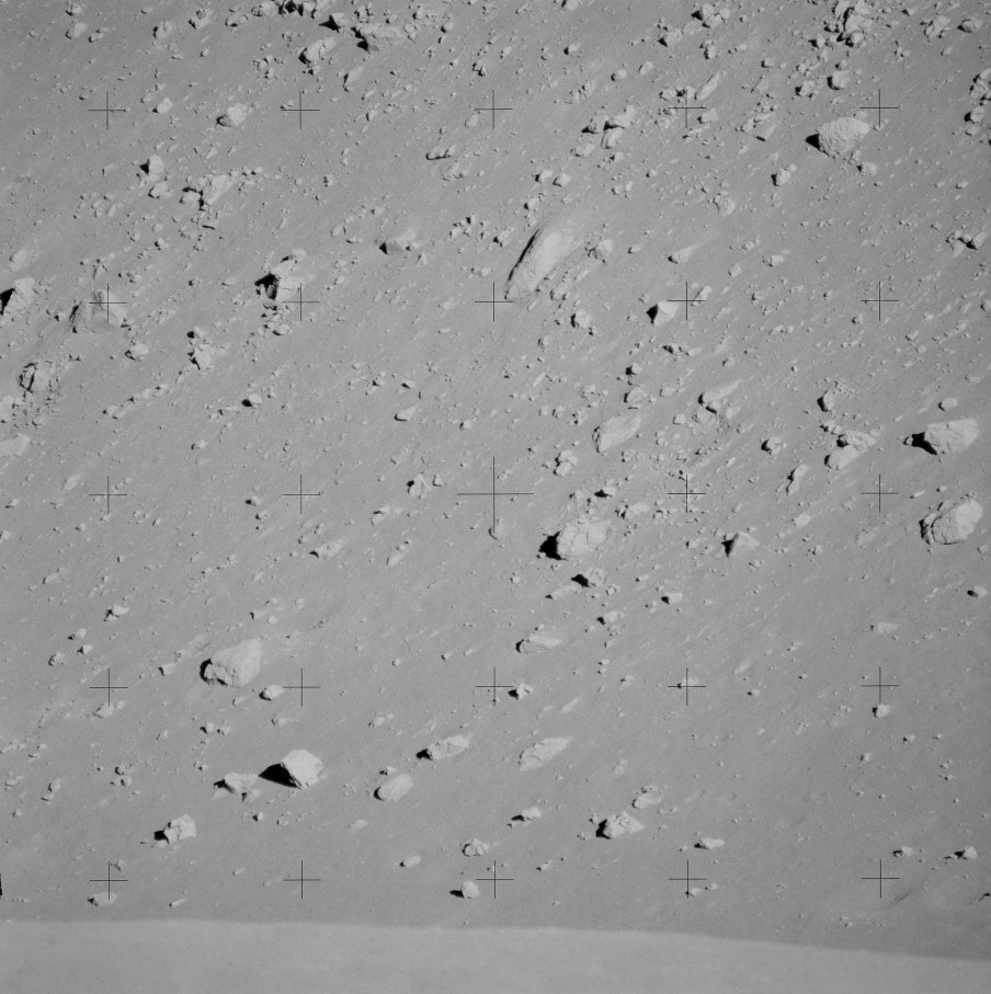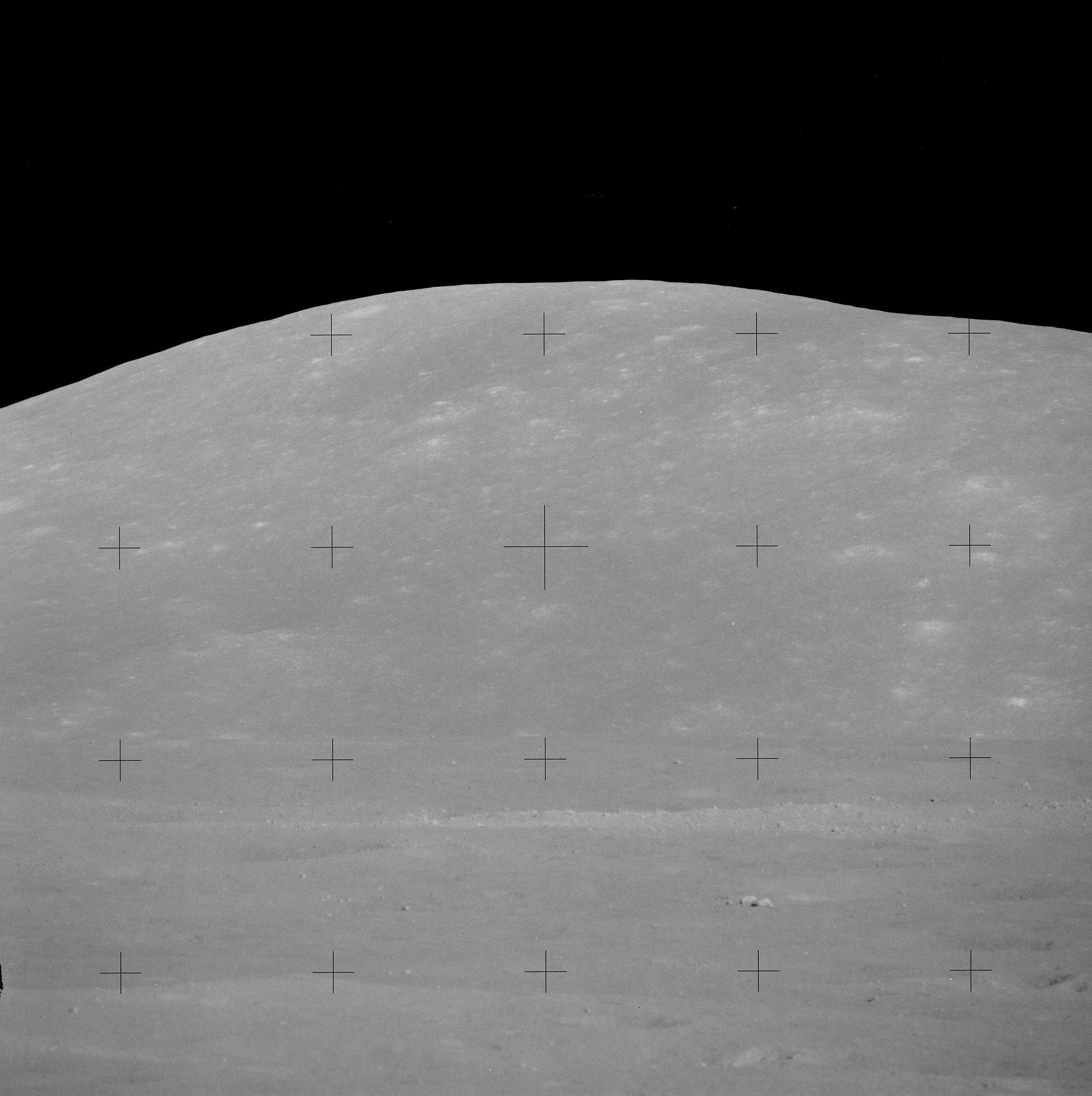 This picture was taken from the LM during CSM Rev 13 on the last pass over the landing site prior to the descent. A labeled version shows some of the prominent landmarks.Rev 16 Mapping (Metric) Camera Frame 0414 ( 13 Mb )