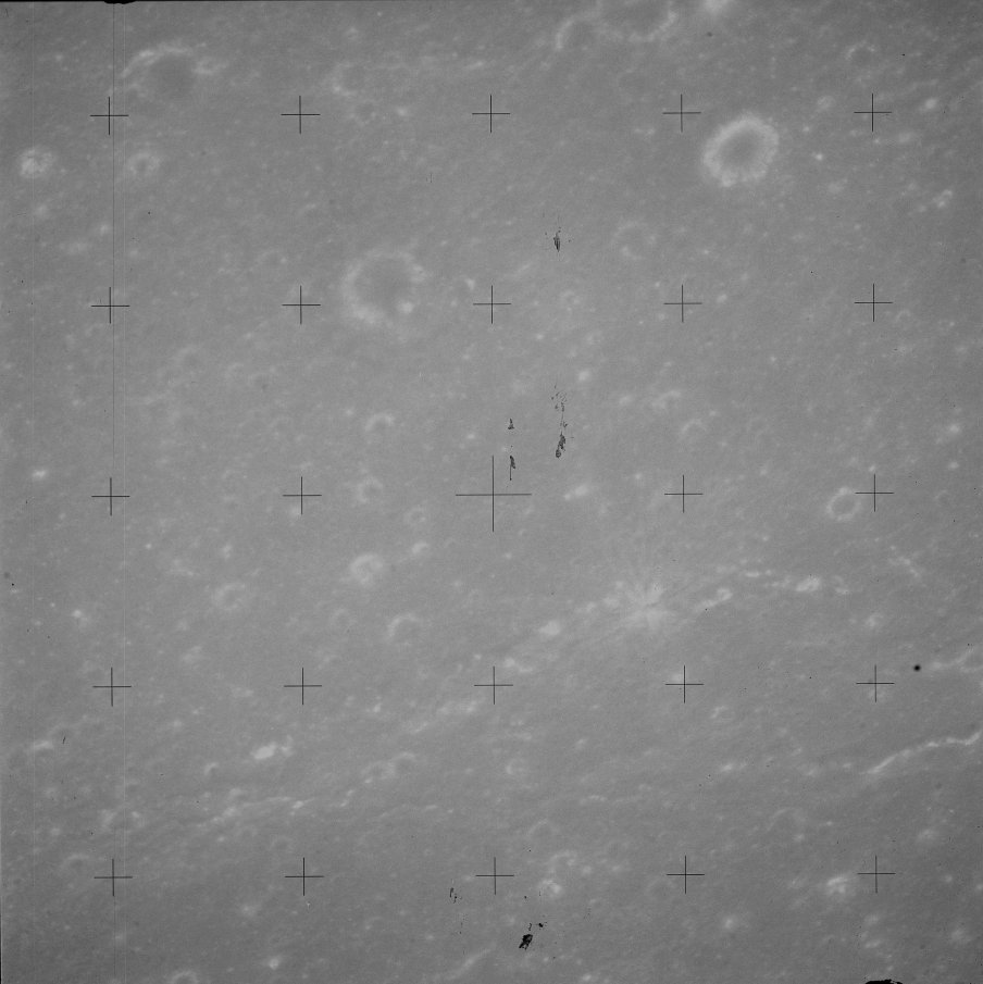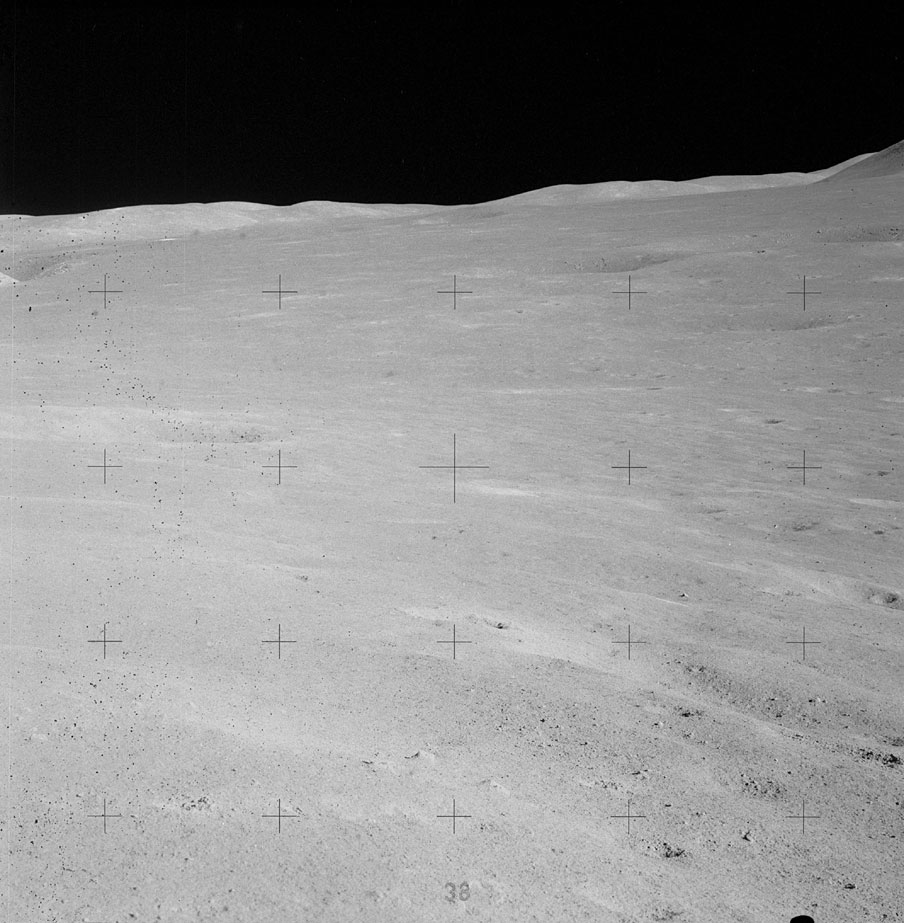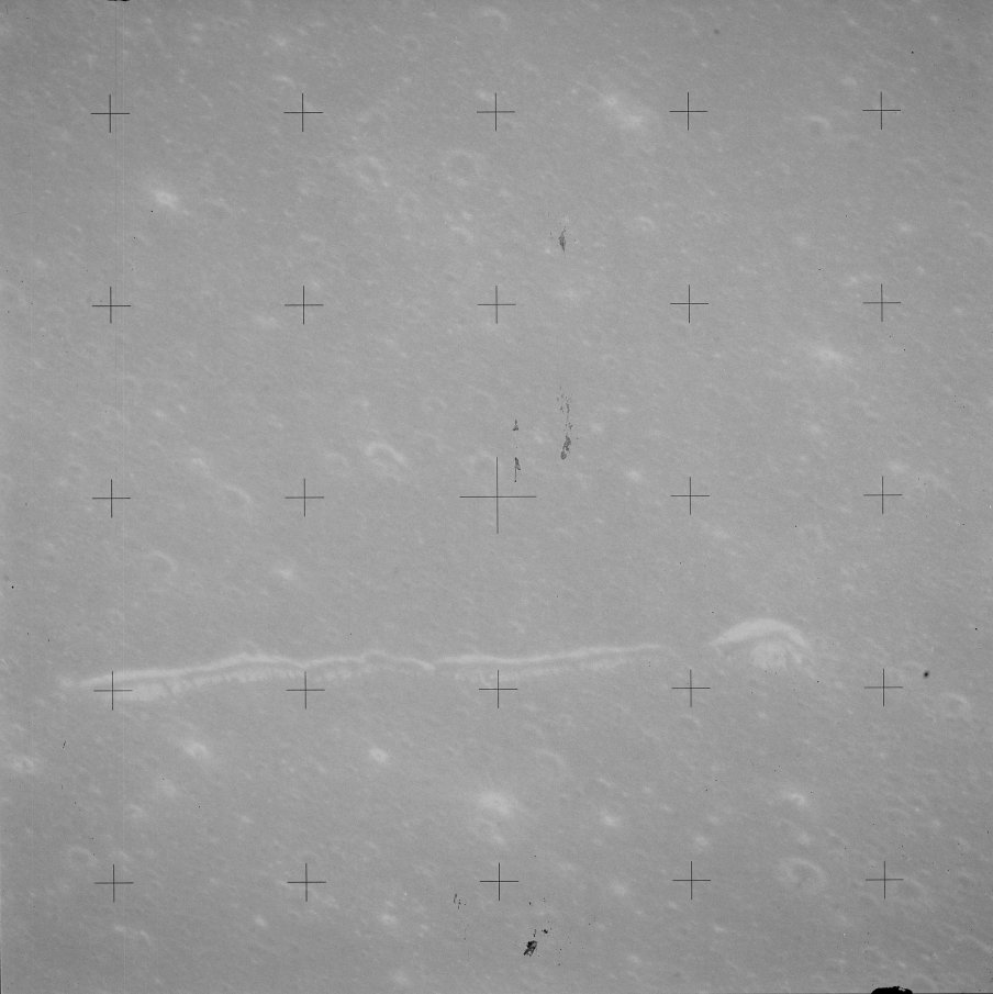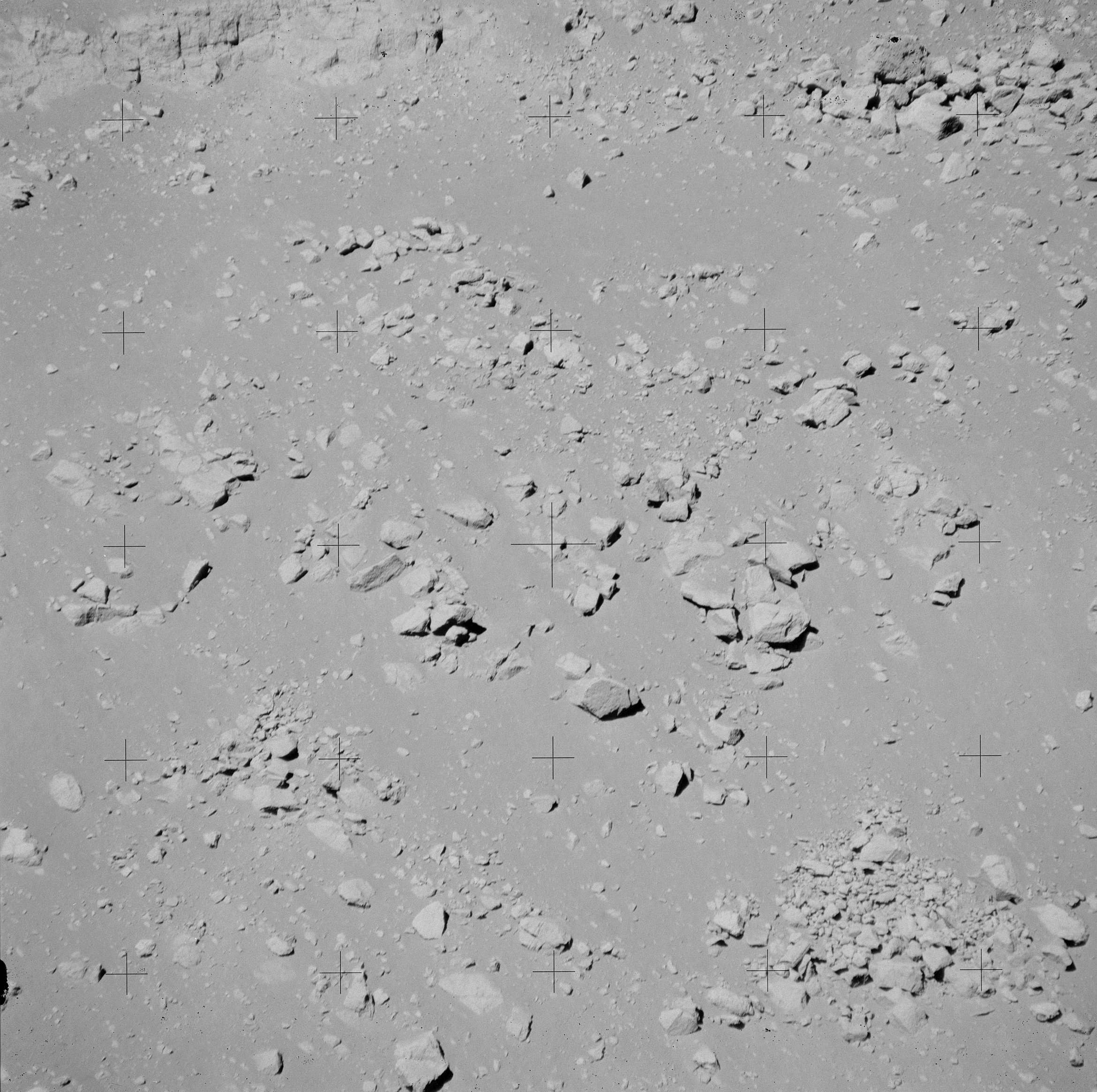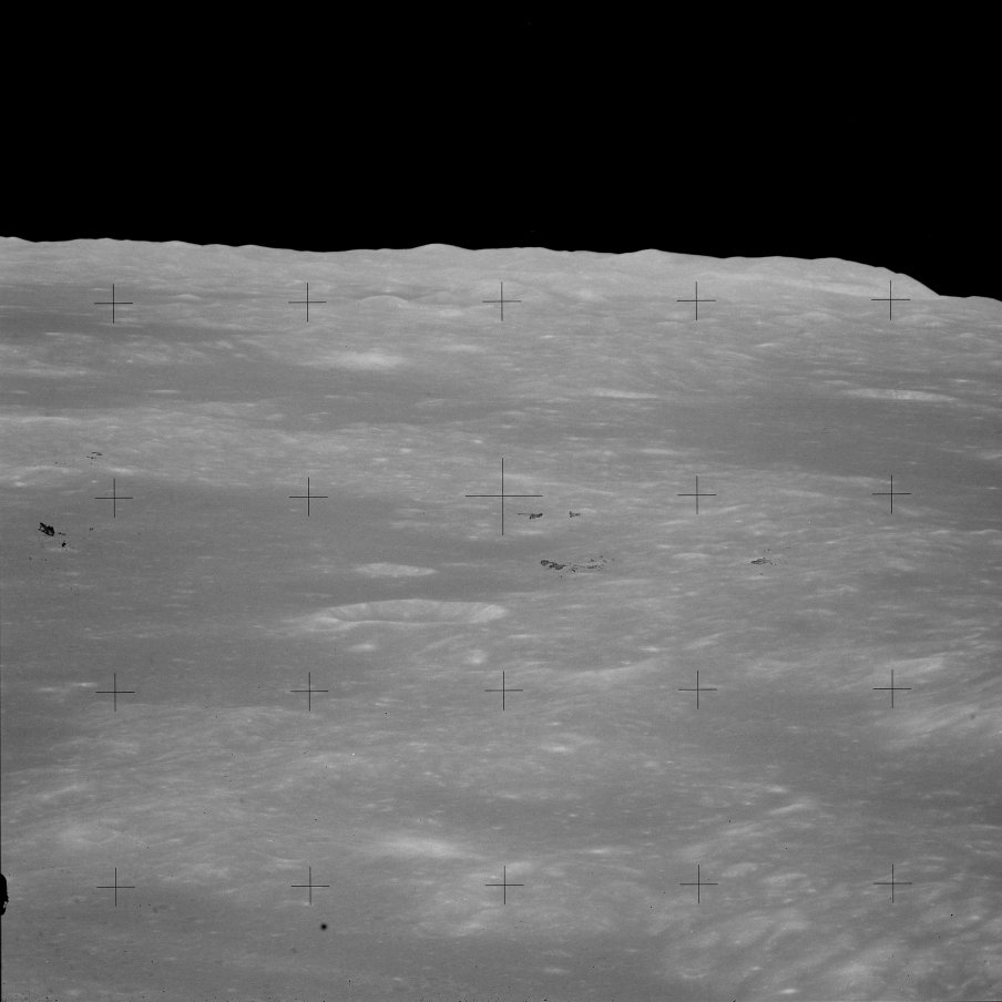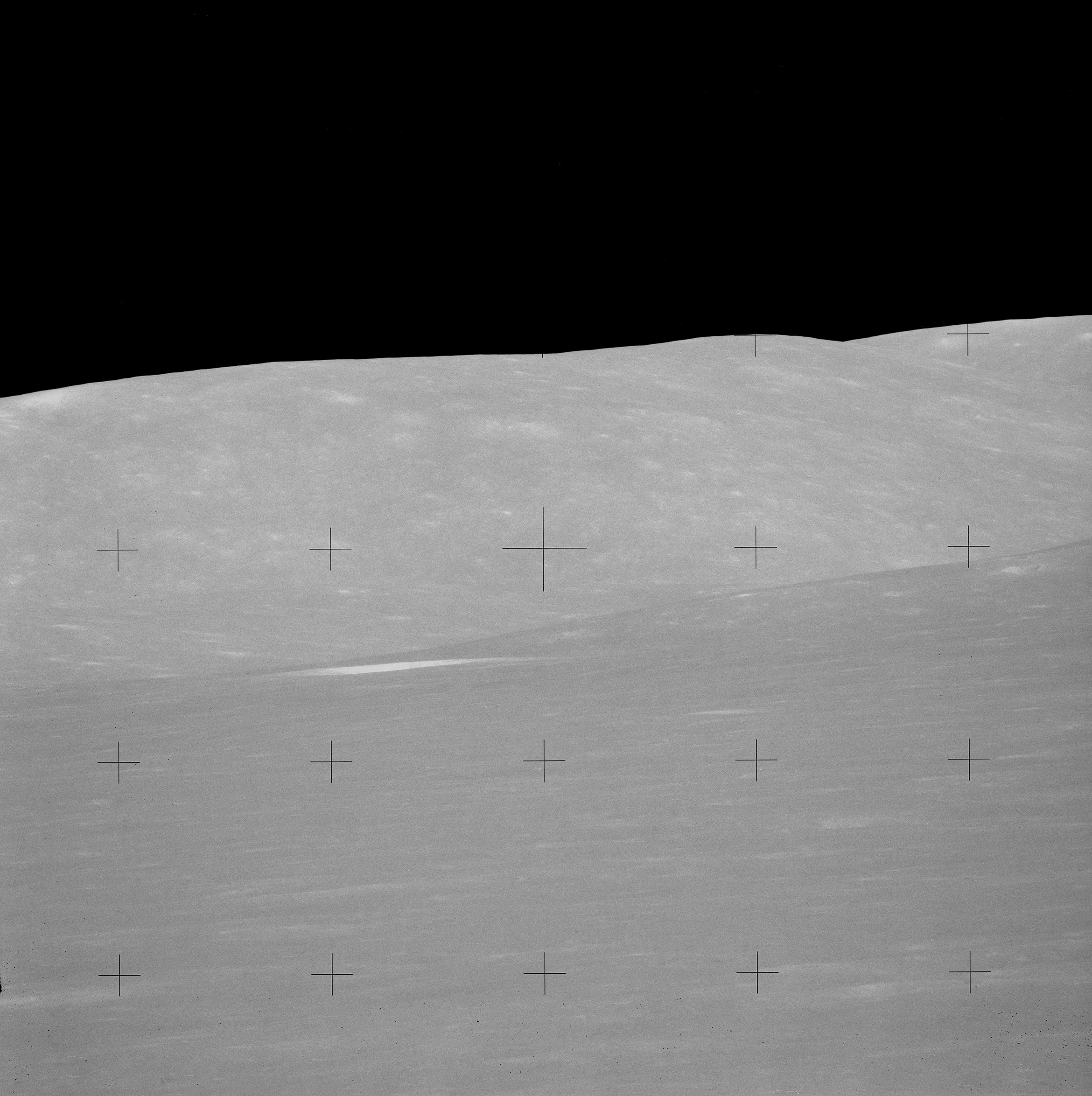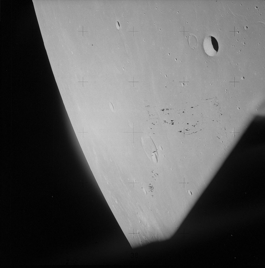 This picture was taken from the LM during CSM Rev 13 on the last pass over the landing site prior to the descent. A labeled version shows some of the prominent landmarks.Rev 16 Mapping (Metric) Camera Frame 0414 ( 13 Mb )