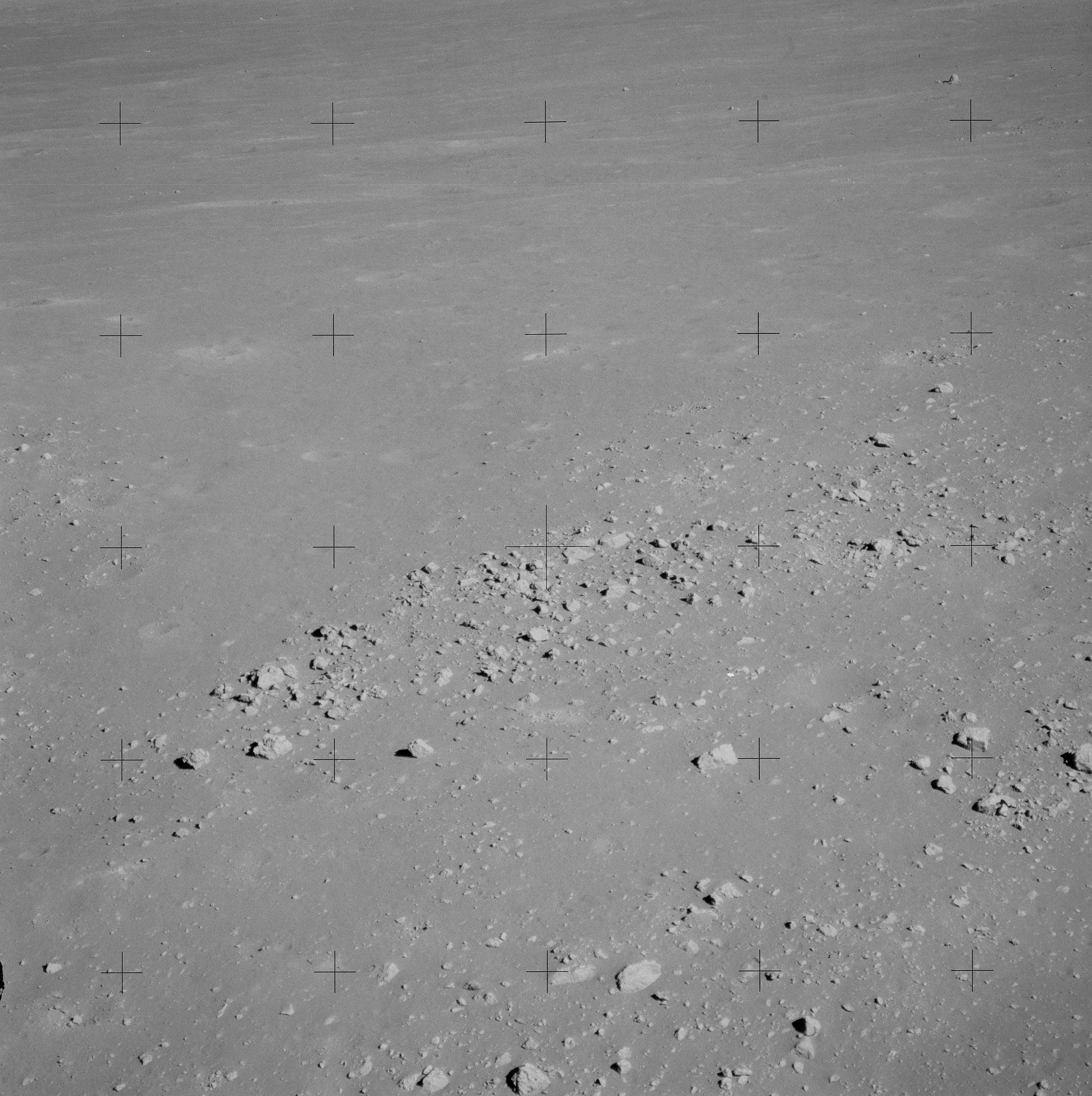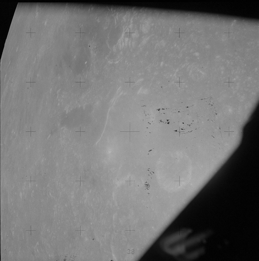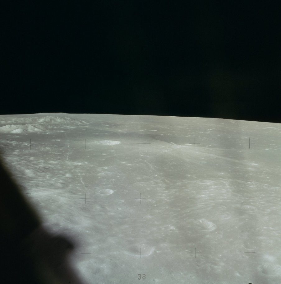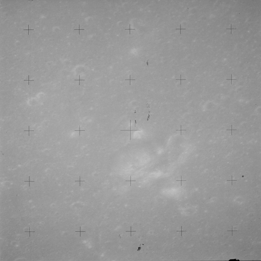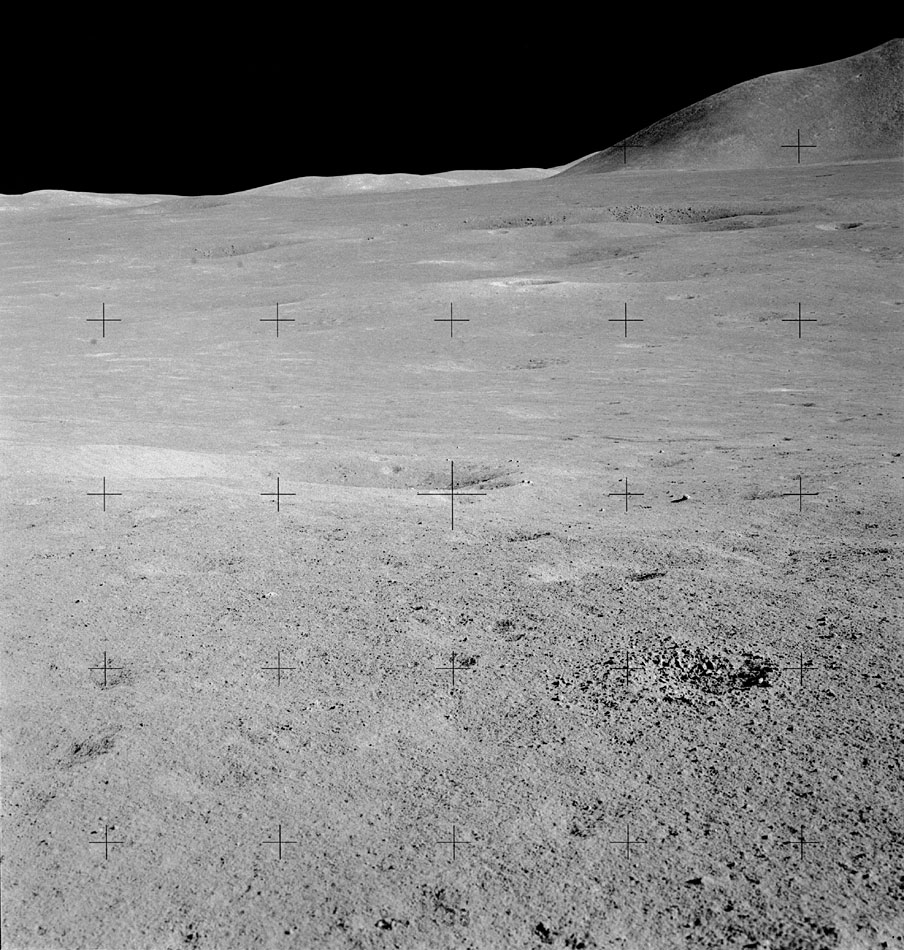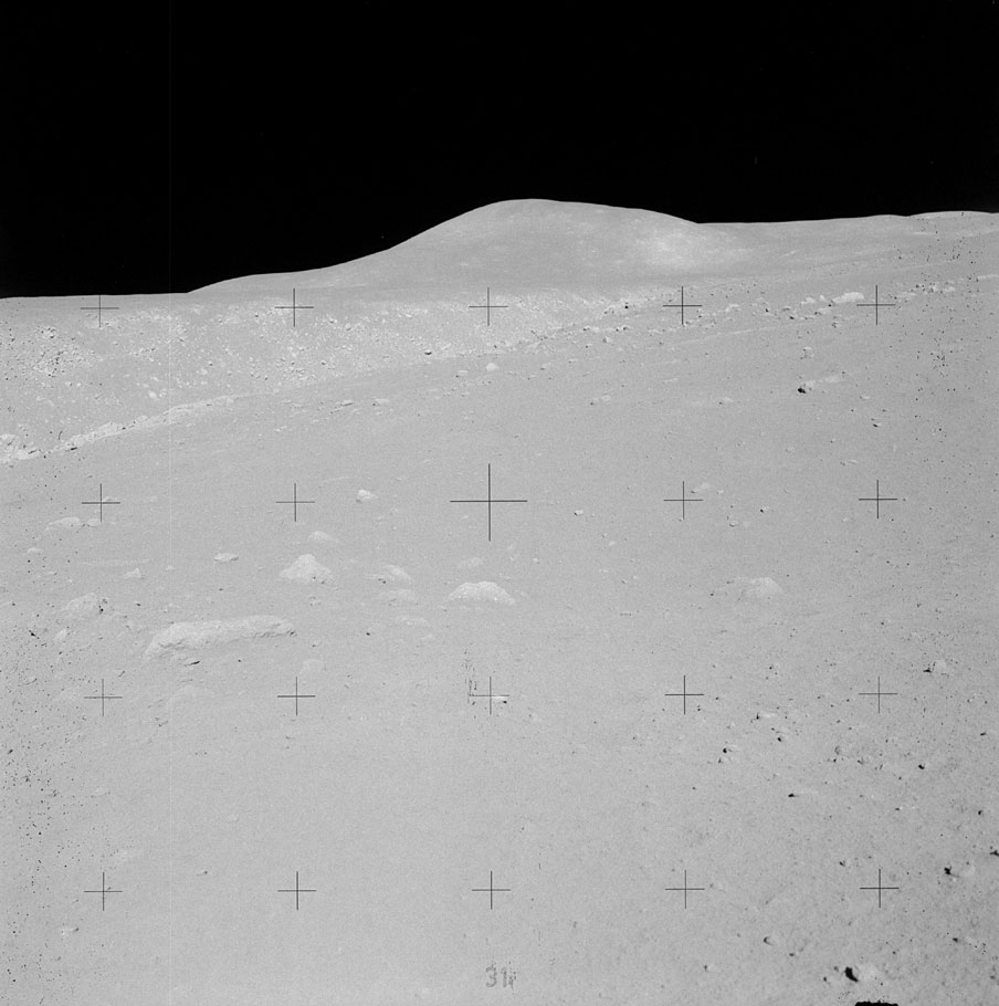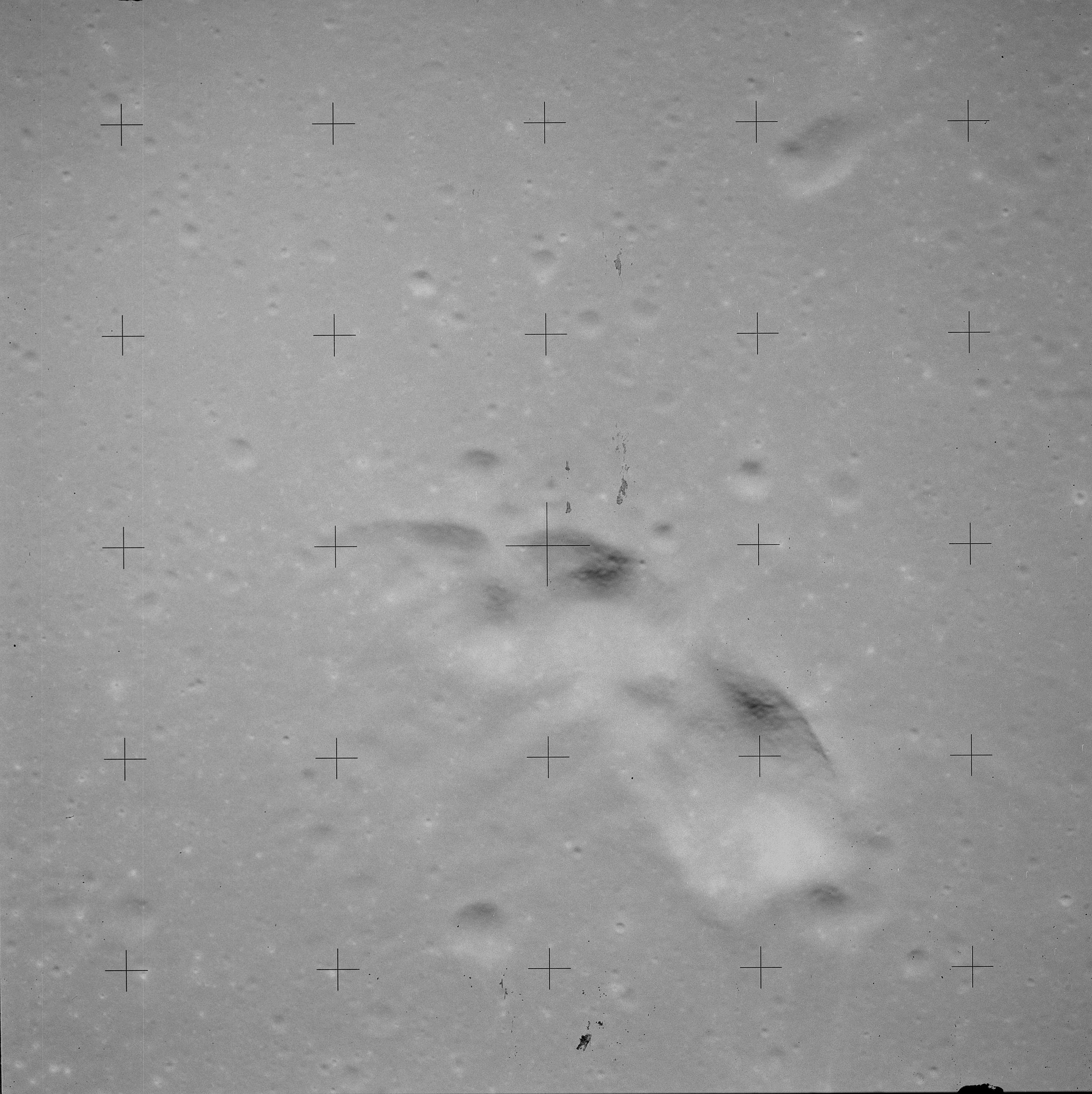 This picture was taken from the LM during CSM Rev 13 on the last pass over the landing site prior to the descent. A labeled version shows some of the prominent landmarks.Rev 16 Mapping (Metric) Camera Frame 0414 ( 13 Mb )